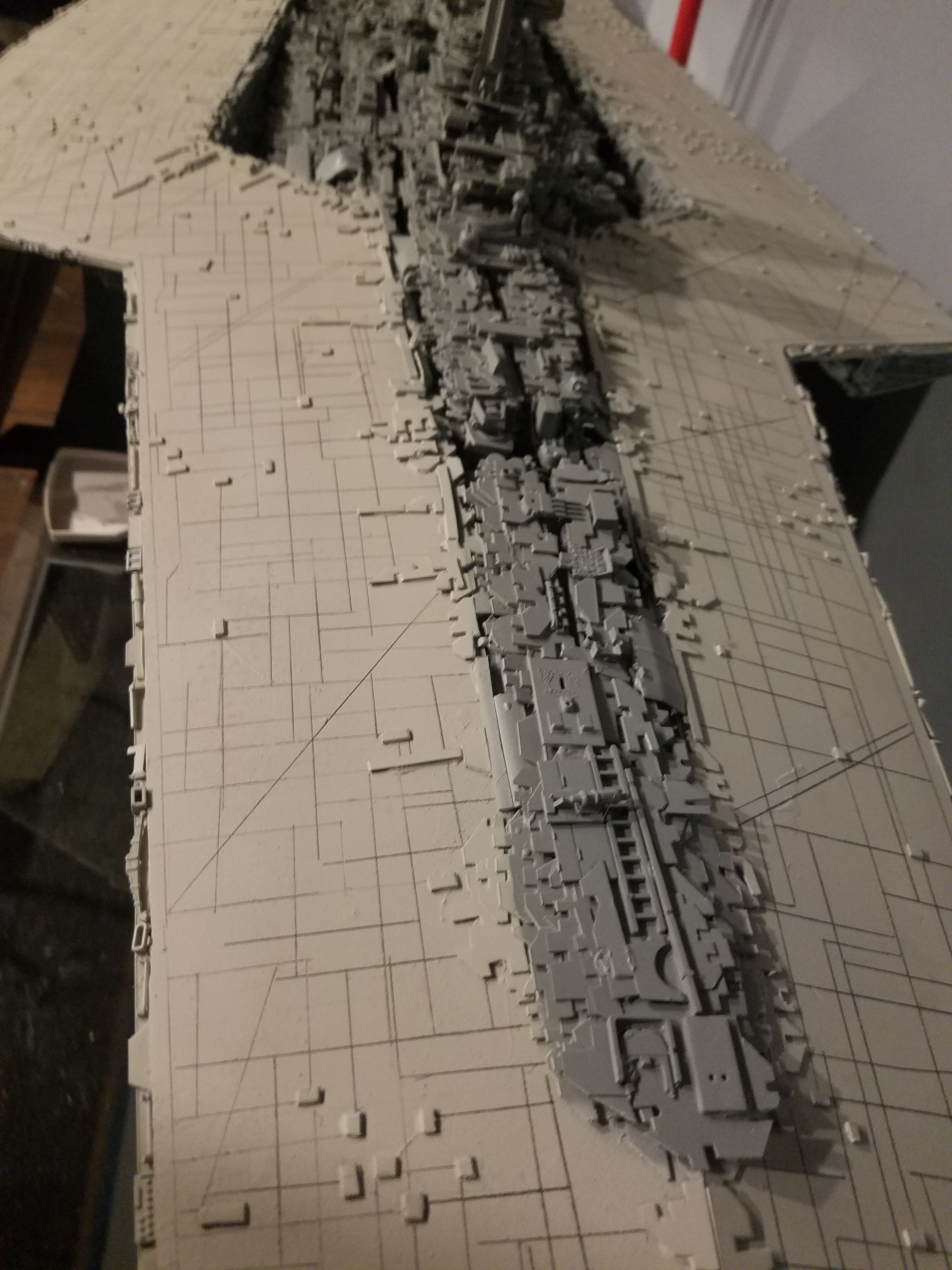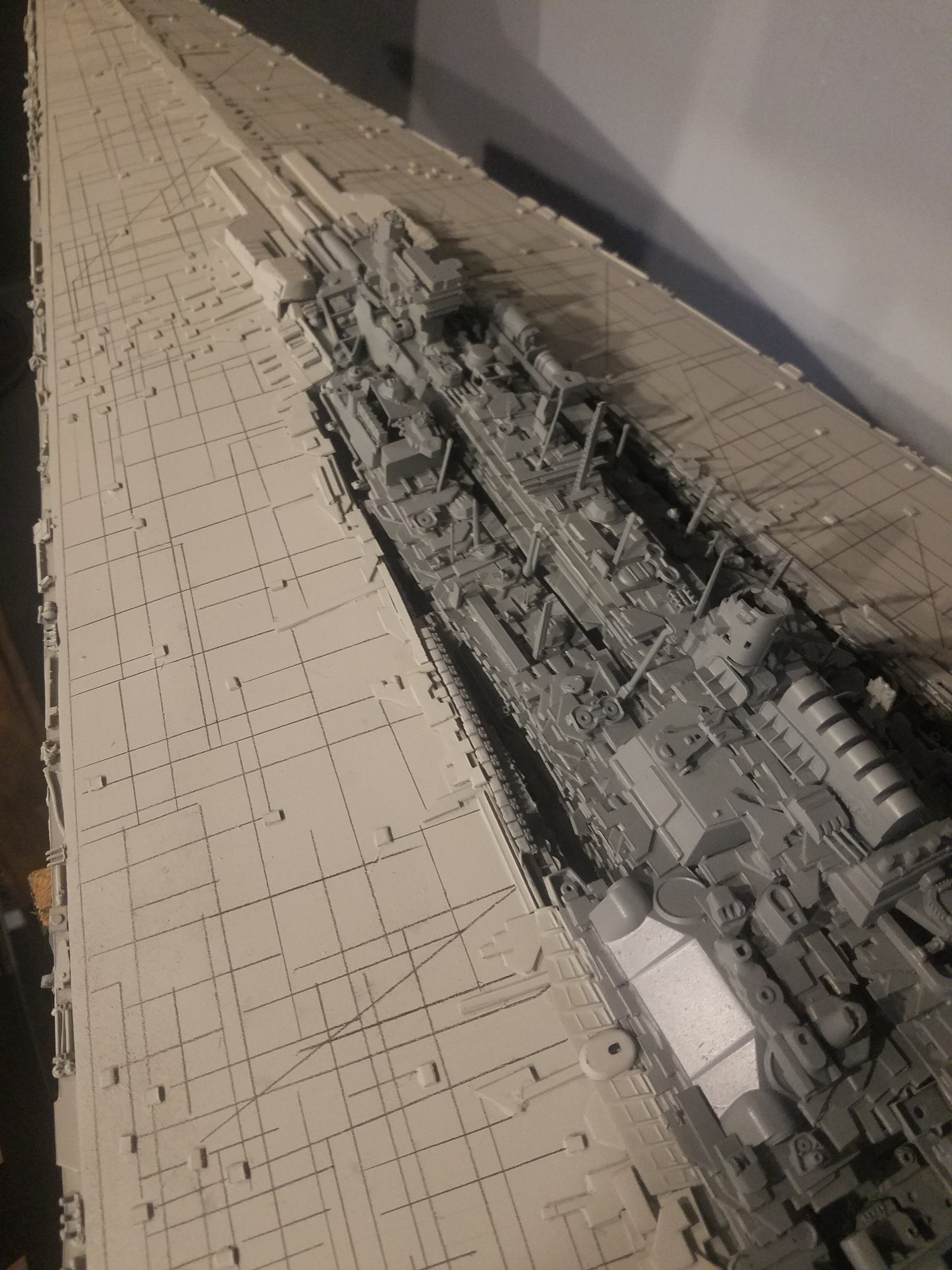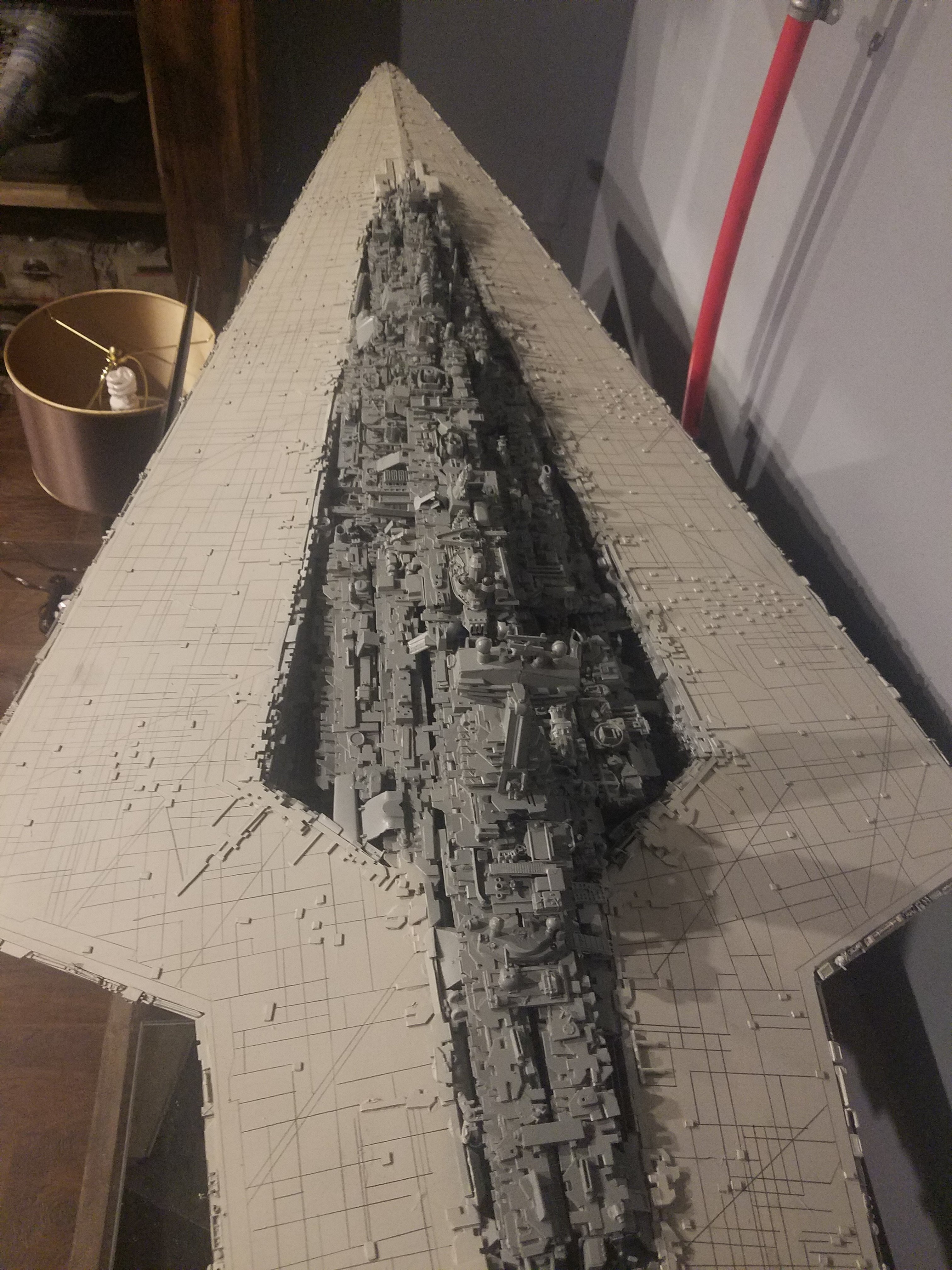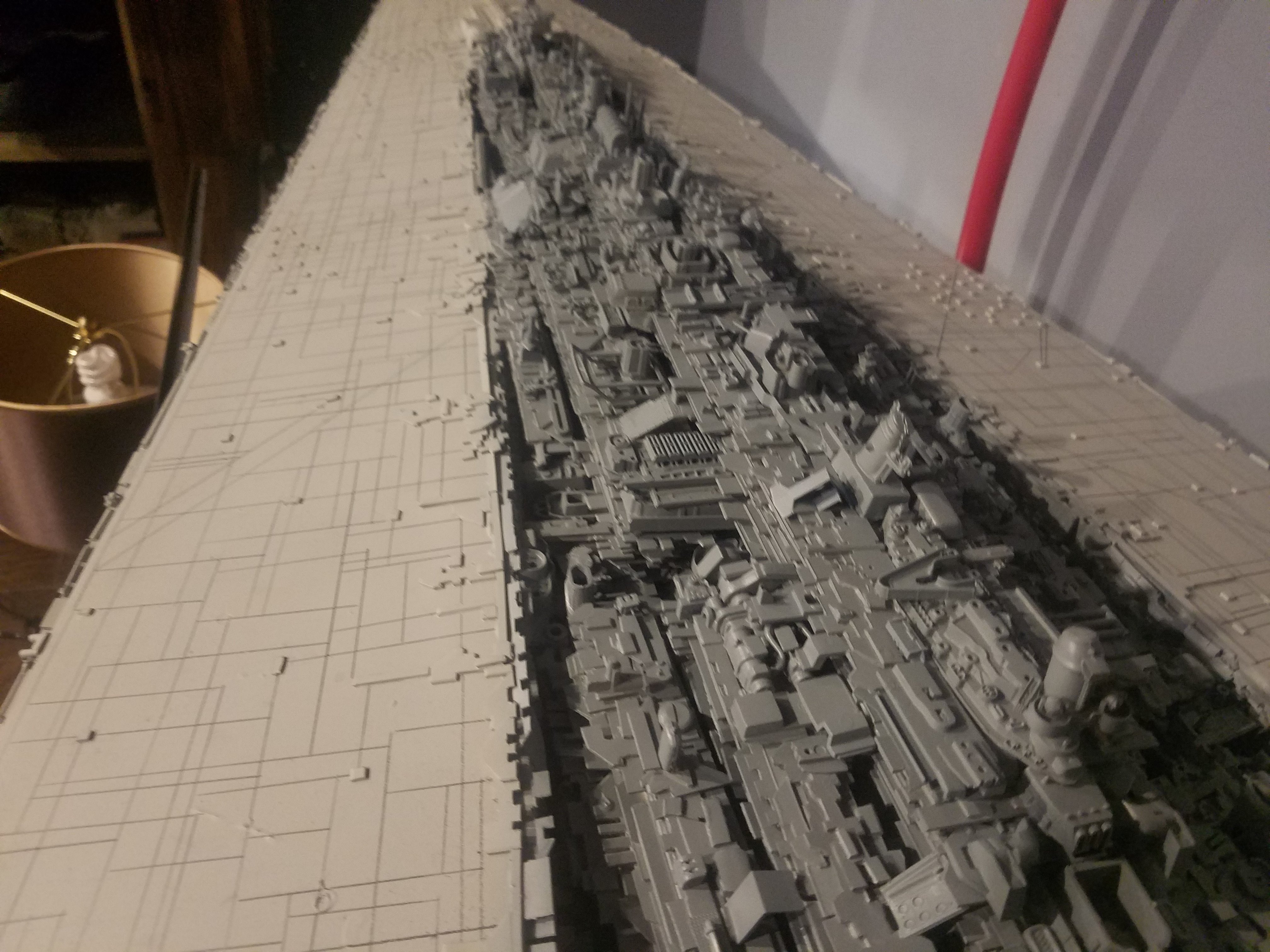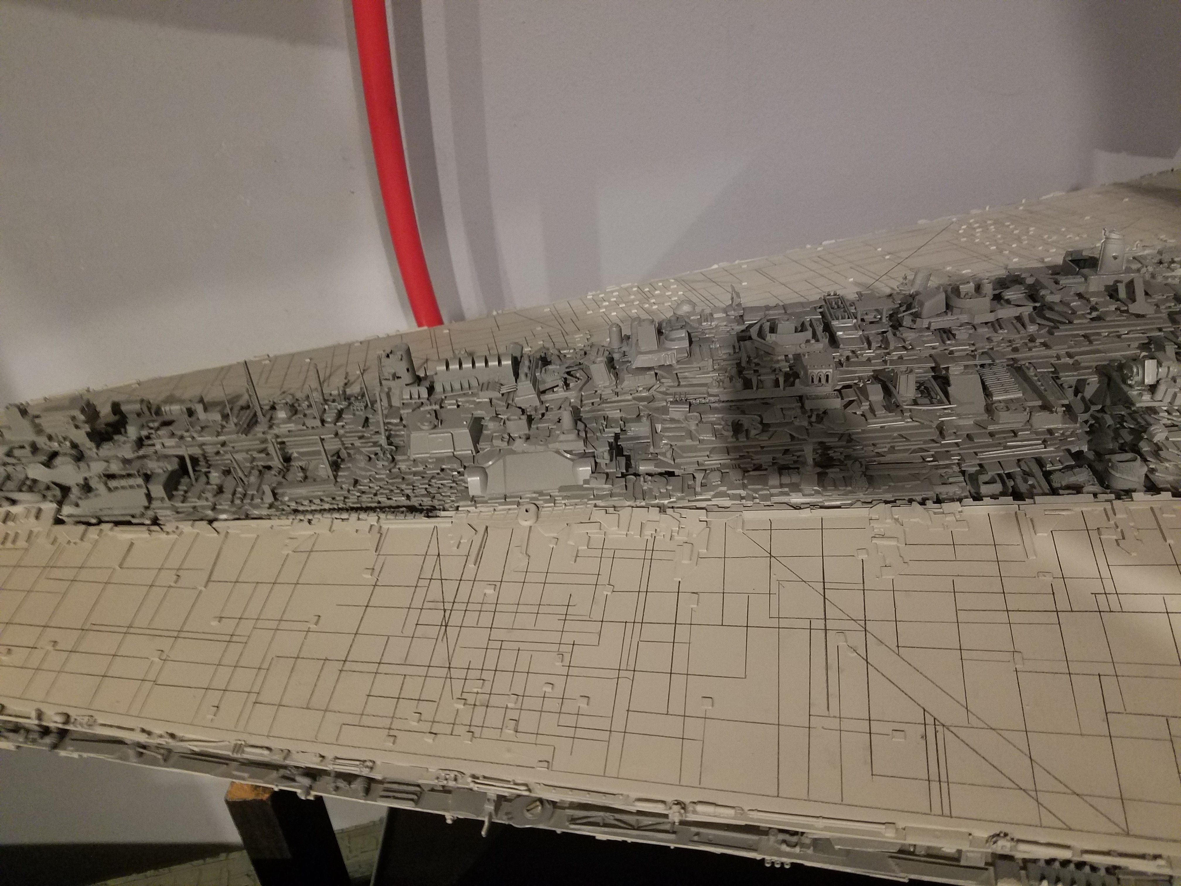 I finally completed my six foot long Empire Strikes Back Super Star Destroyer Build. It took just over a year to complete due to the exceedingly heavy detailing. Each piece of plastic I cut by hand and glued onto the model as well as parts from hundreds of various kits. Luckily I was able to find a seller on eBay selling boxes full of miscellaneous model parts for cheap. I had originally built this model a few years ago when I was just out of college and have been staring at it for years because I wasn’t quite happy with it. Being that this is my favorite ship of all time I had to do something about that so I ripped apart and started over. I saved the hulls but that was about it. Everything else was built up from scratch. The best part was trying to create the organized chaos look in the cityscape with all the structures kind of blending together yet looking like separate pieces still. I think overall I achieved the look I was going for and am pleased with the final result after all these years.