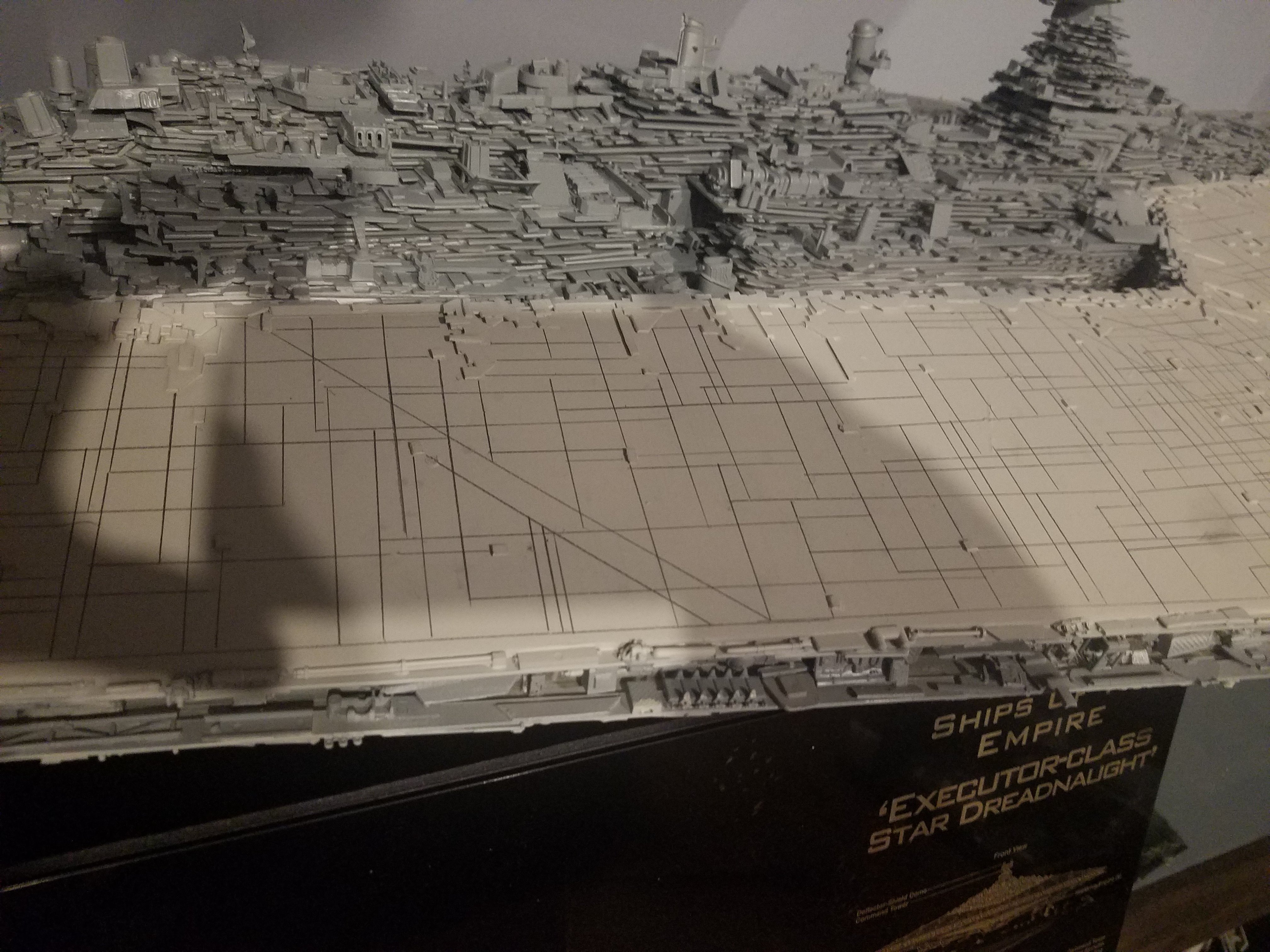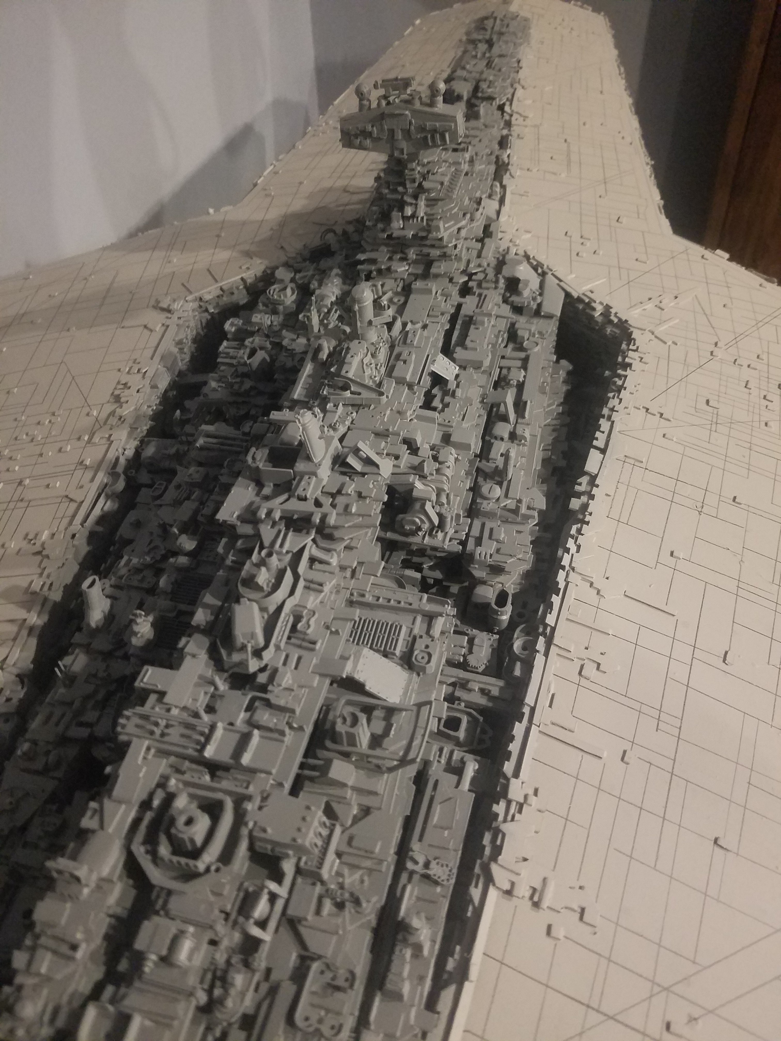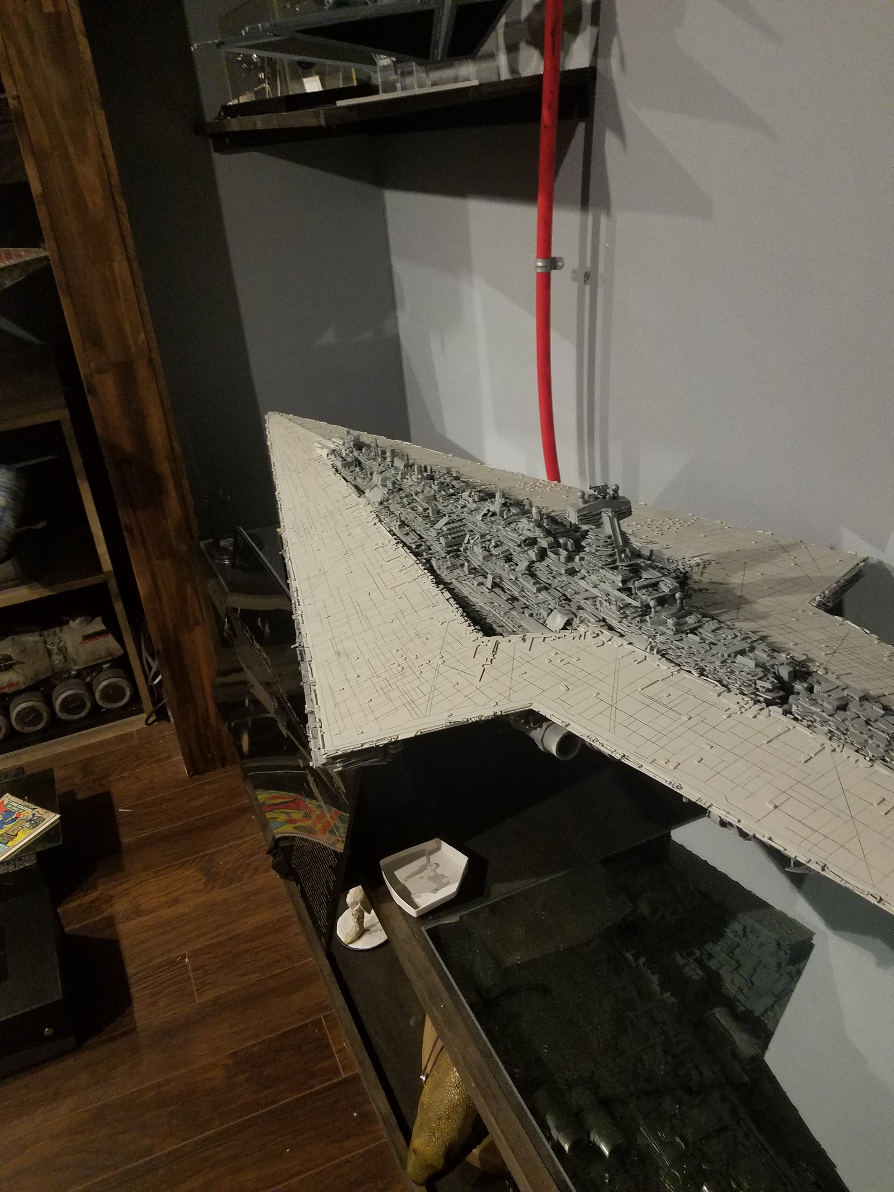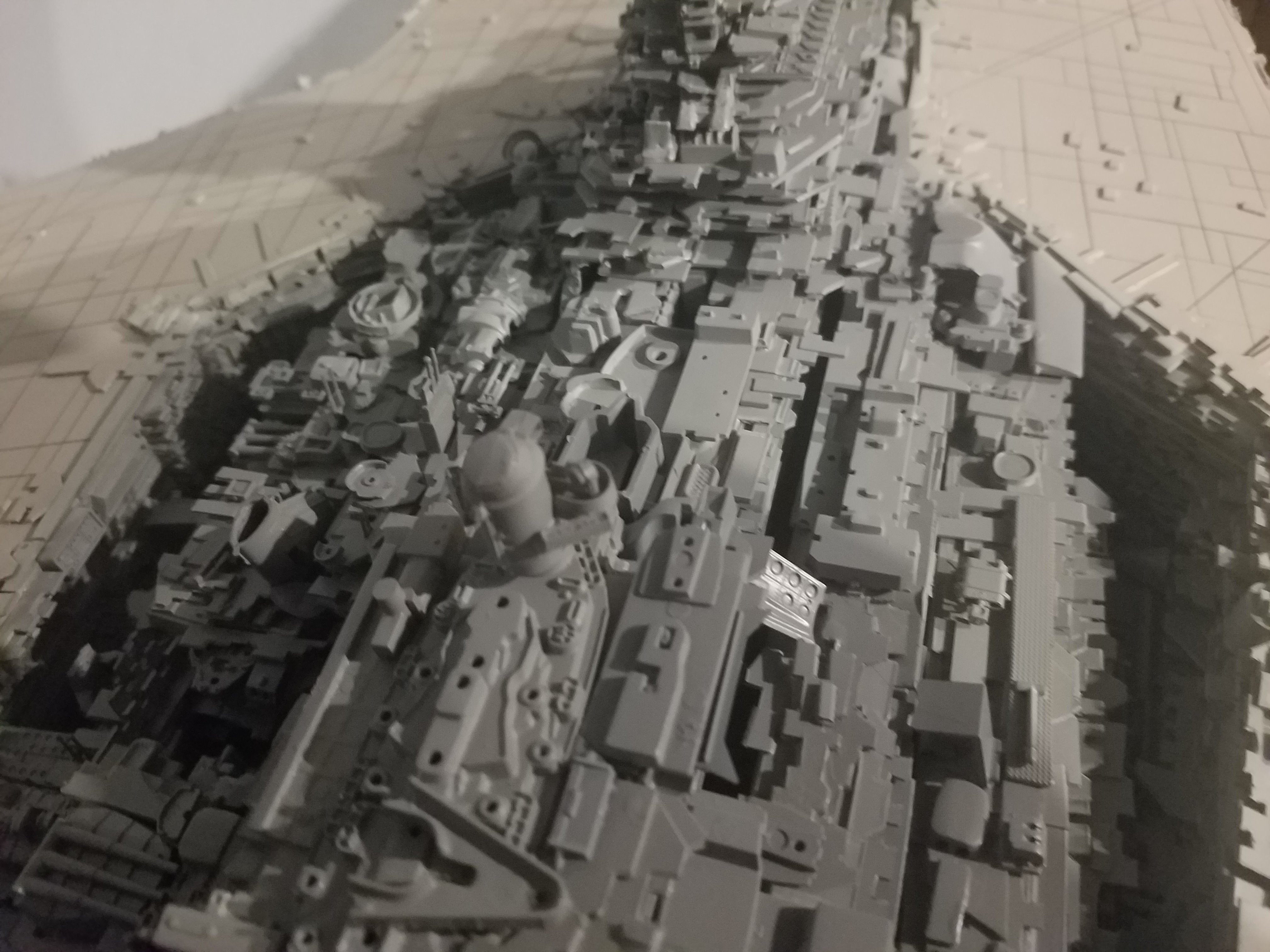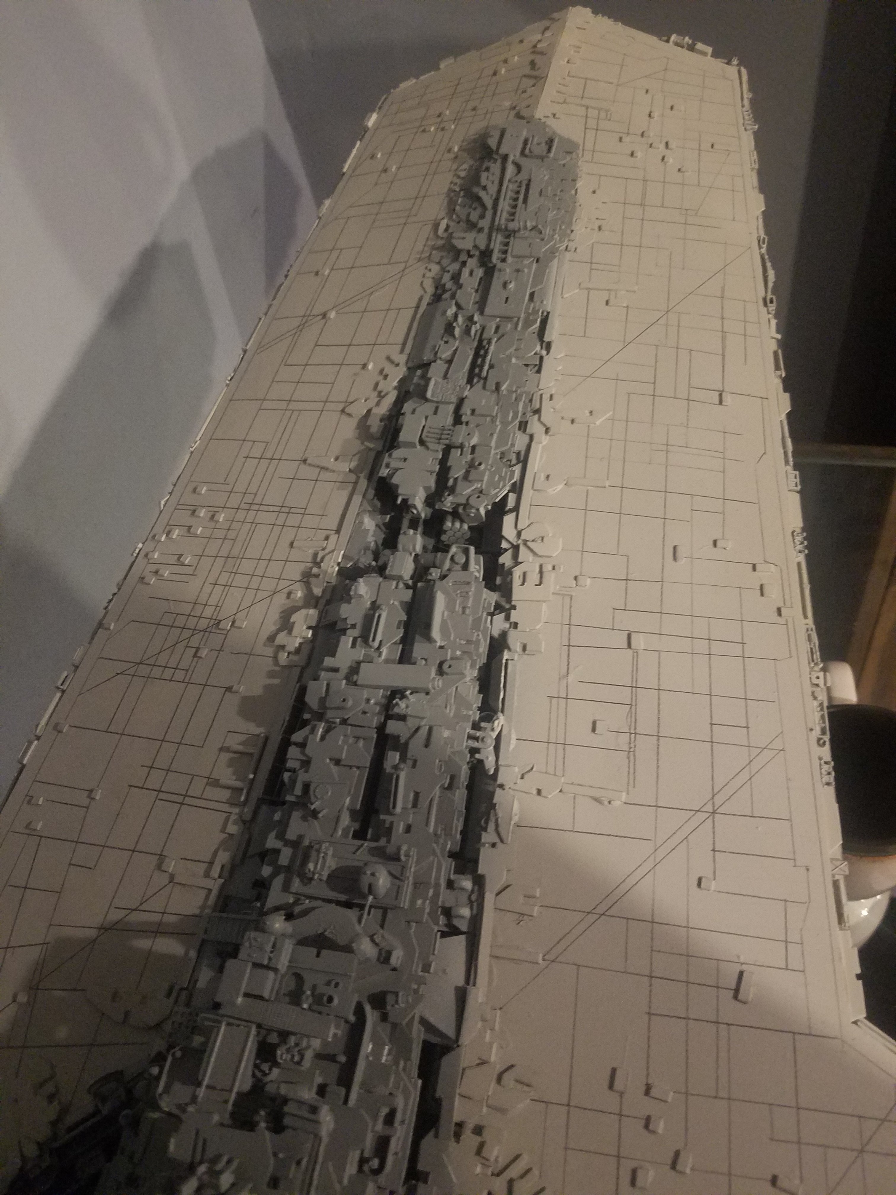 I finally completed my six foot long Empire Strikes Back Super Star Destroyer Build. It took just over a year to complete due to the exceedingly heavy detailing. Each piece of plastic I cut by hand and glued onto the model as well as parts from hundreds of various kits. Luckily I was able to find a seller on eBay selling boxes full of miscellaneous model parts for cheap. I had originally built this model a few years ago when I was just out of college and have been staring at it for years because I wasn’t quite happy with it. Being that this is my favorite ship of all time I had to do something about that so I ripped apart and started over. I saved the hulls but that was about it. Everything else was built up from scratch. The best part was trying to create the organized chaos look in the cityscape with all the structures kind of blending together yet looking like separate pieces still. I think overall I achieved the look I was going for and am pleased with the final result after all these years.