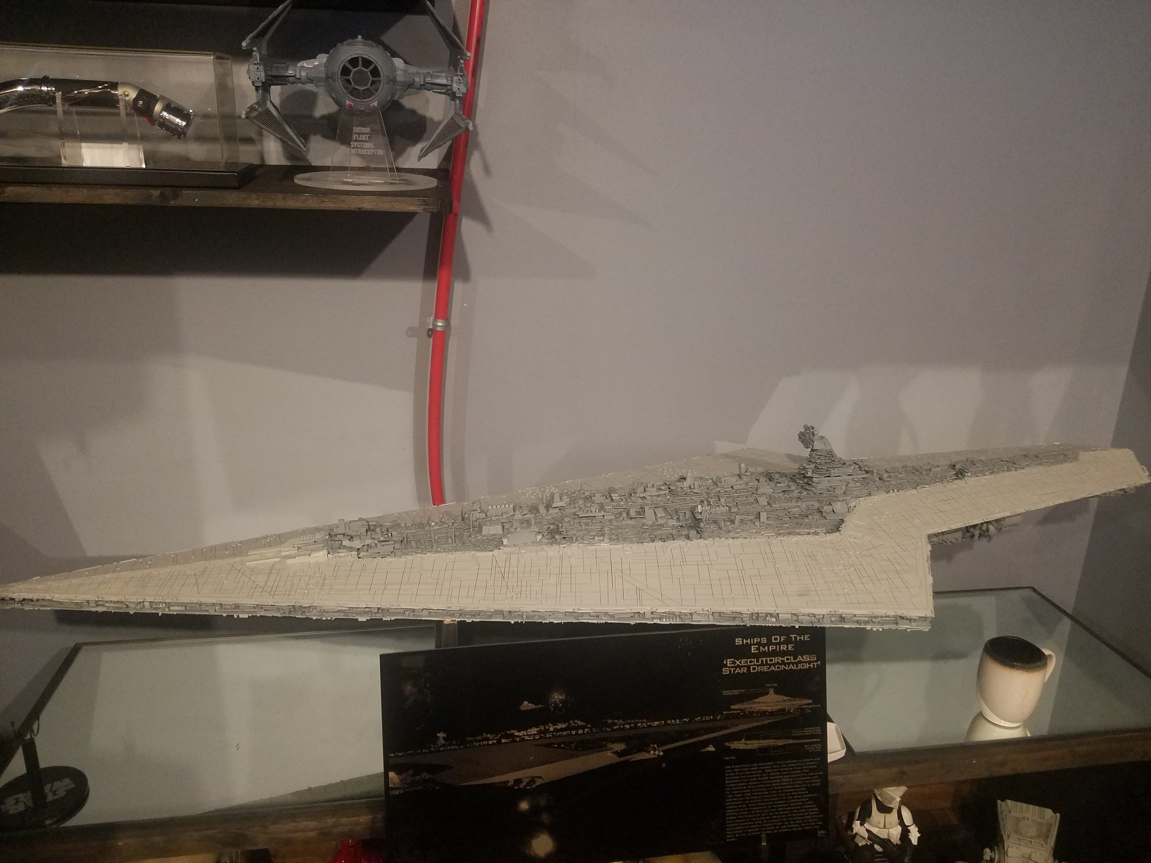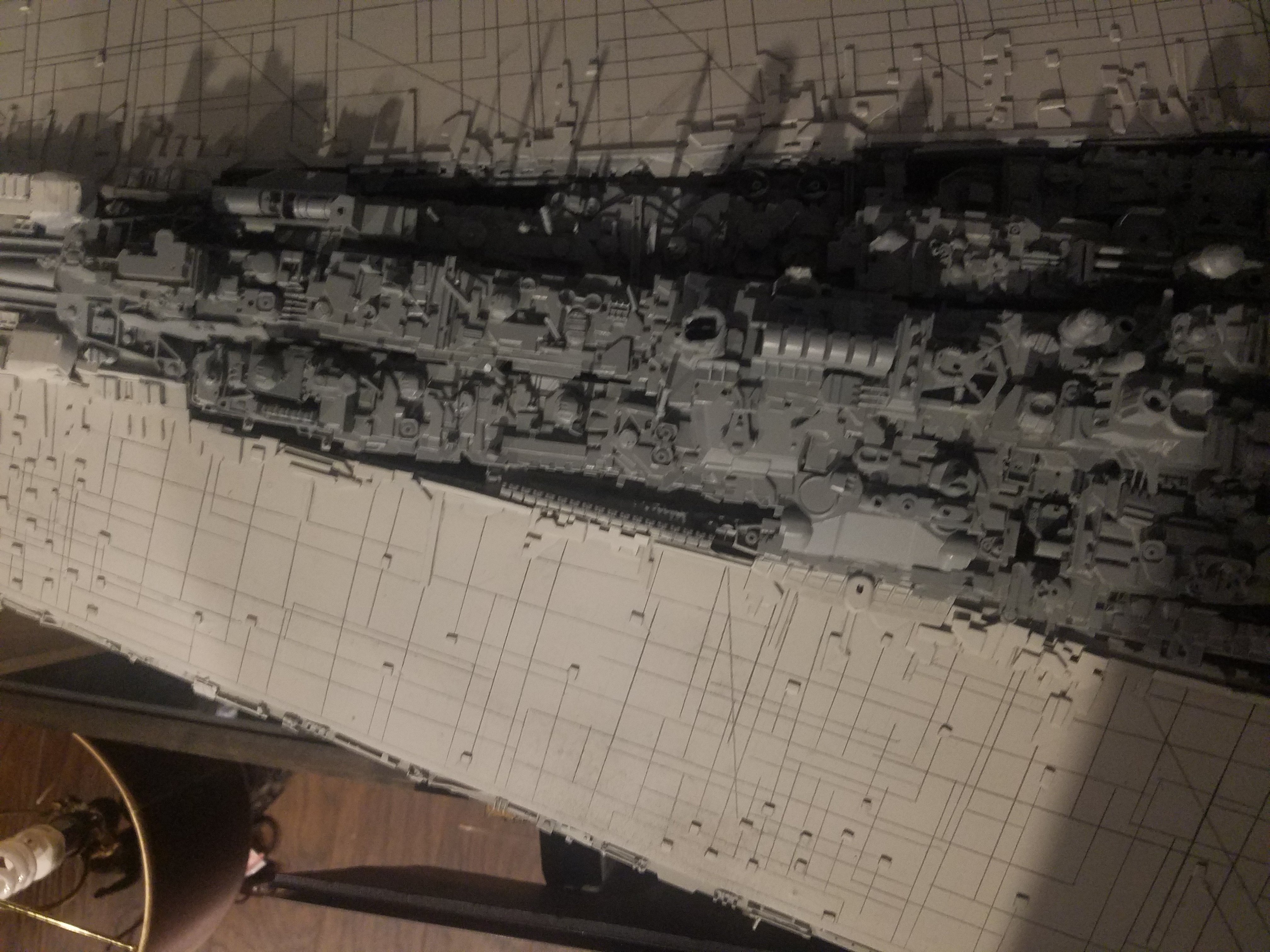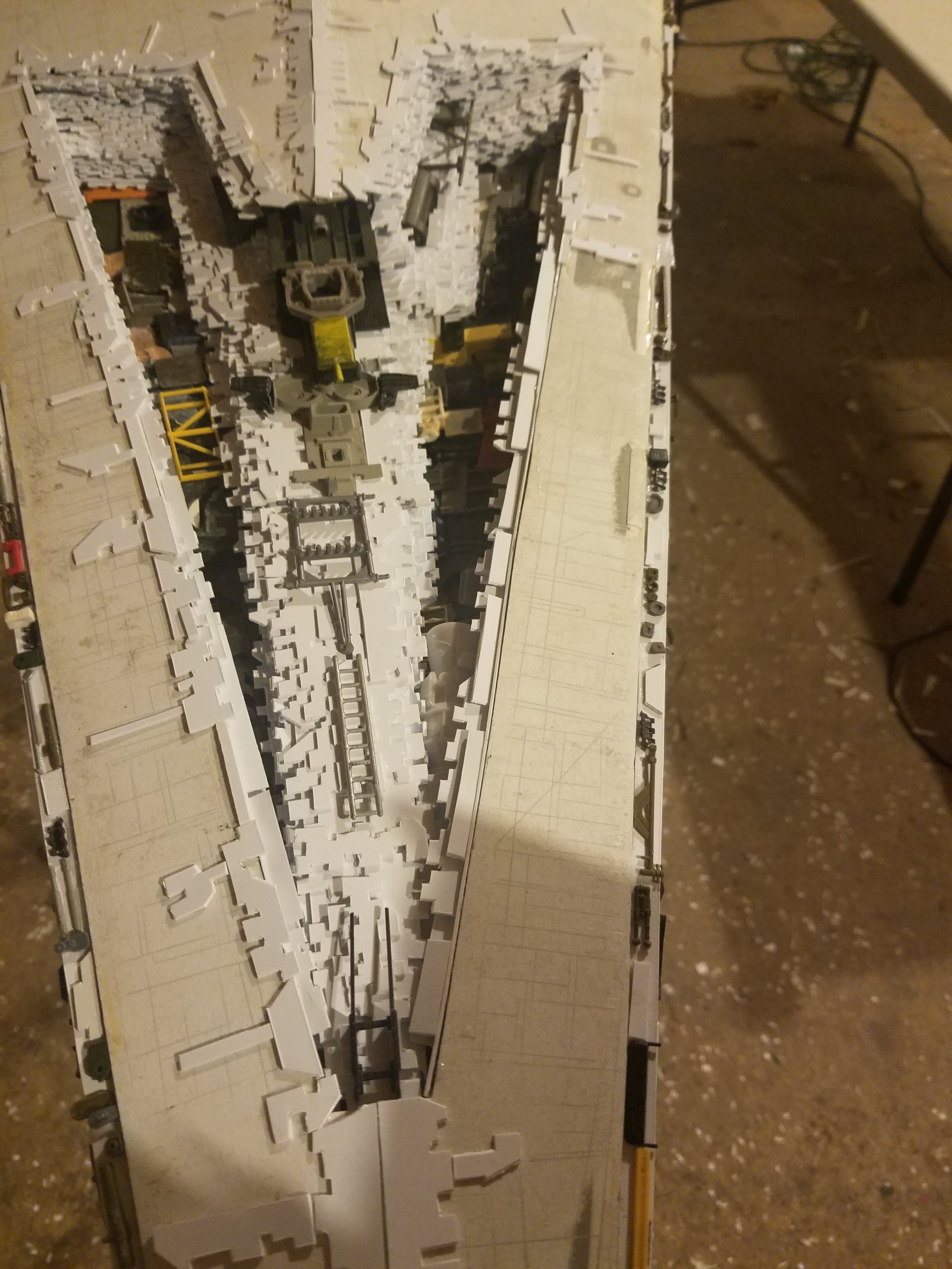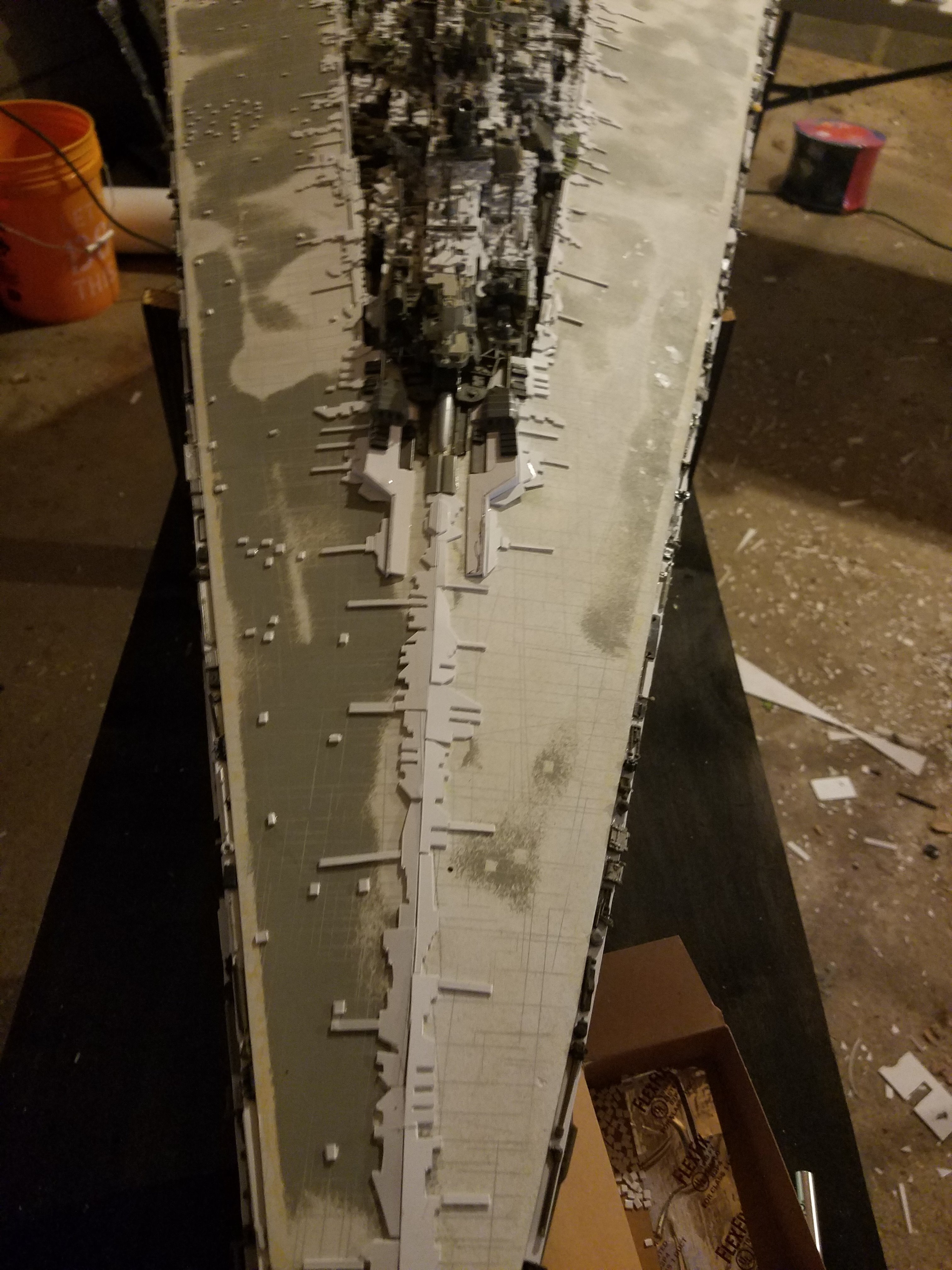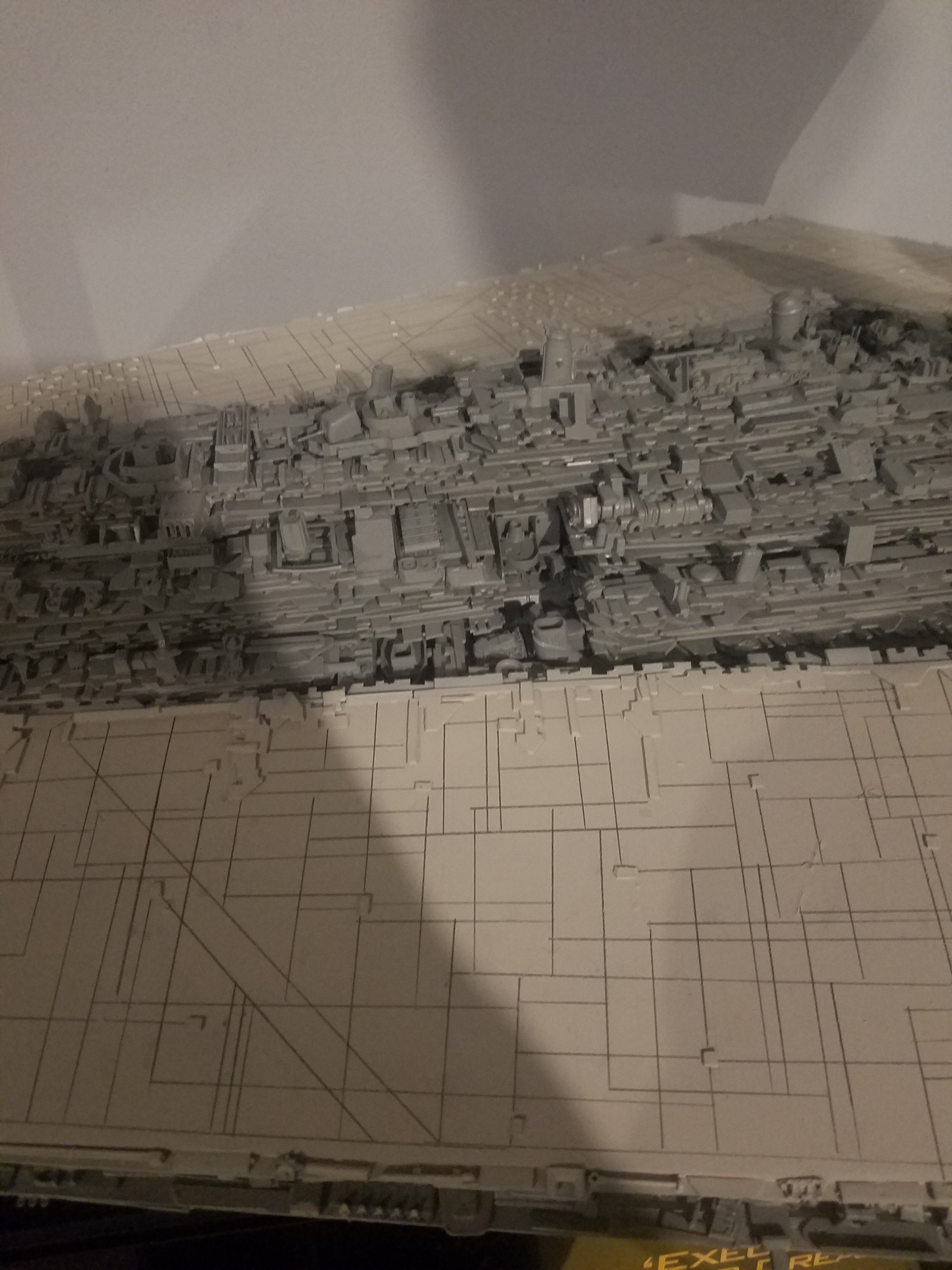 I finally completed my six foot long Empire Strikes Back Super Star Destroyer Build. It took just over a year to complete due to the exceedingly heavy detailing. Each piece of plastic I cut by hand and glued onto the model as well as parts from hundreds of various kits. Luckily I was able to find a seller on eBay selling boxes full of miscellaneous model parts for cheap. I had originally built this model a few years ago when I was just out of college and have been staring at it for years because I wasn’t quite happy with it. Being that this is my favorite ship of all time I had to do something about that so I ripped apart and started over. I saved the hulls but that was about it. Everything else was built up from scratch. The best part was trying to create the organized chaos look in the cityscape with all the structures kind of blending together yet looking like separate pieces still. I think overall I achieved the look I was going for and am pleased with the final result after all these years.