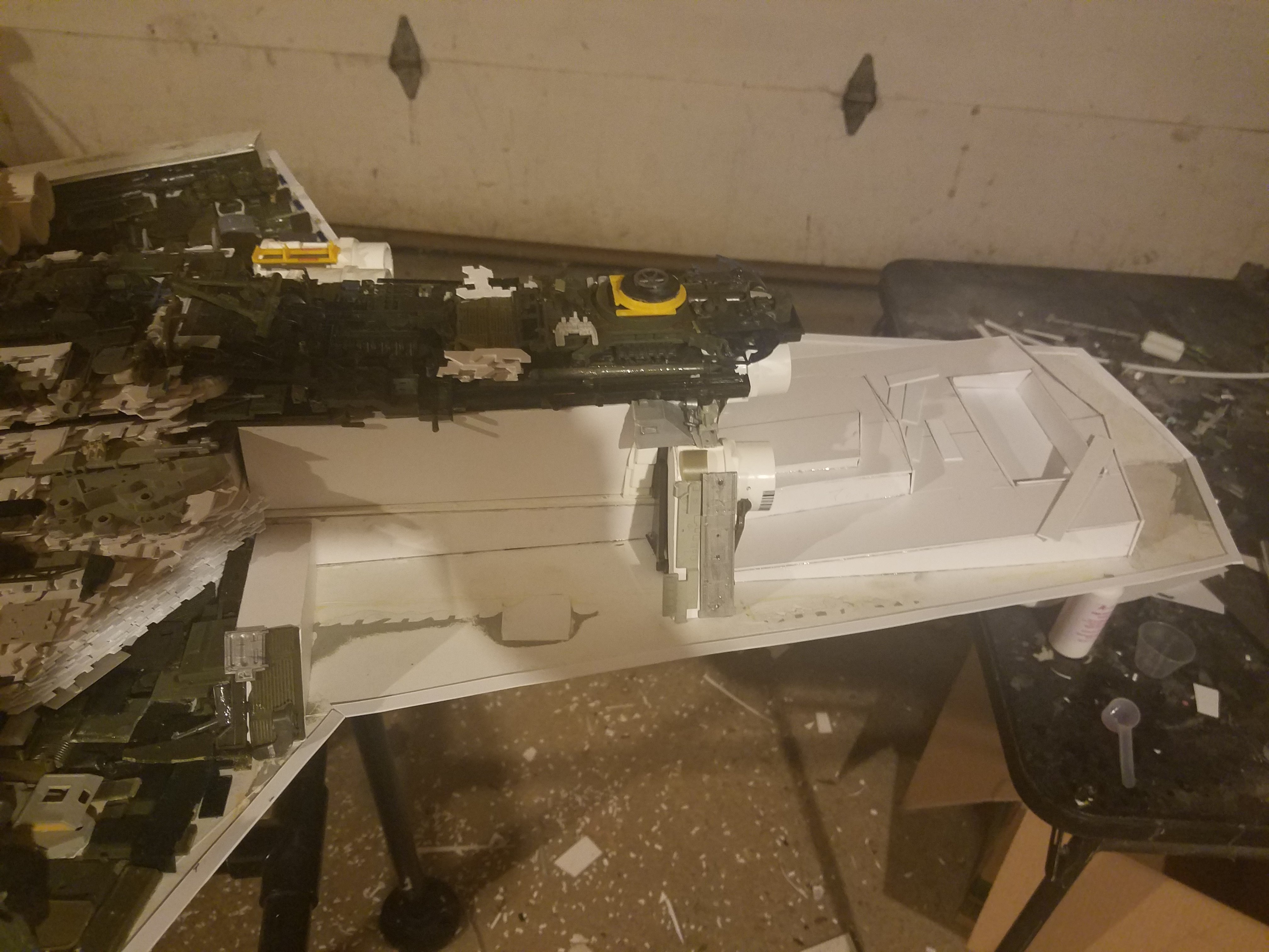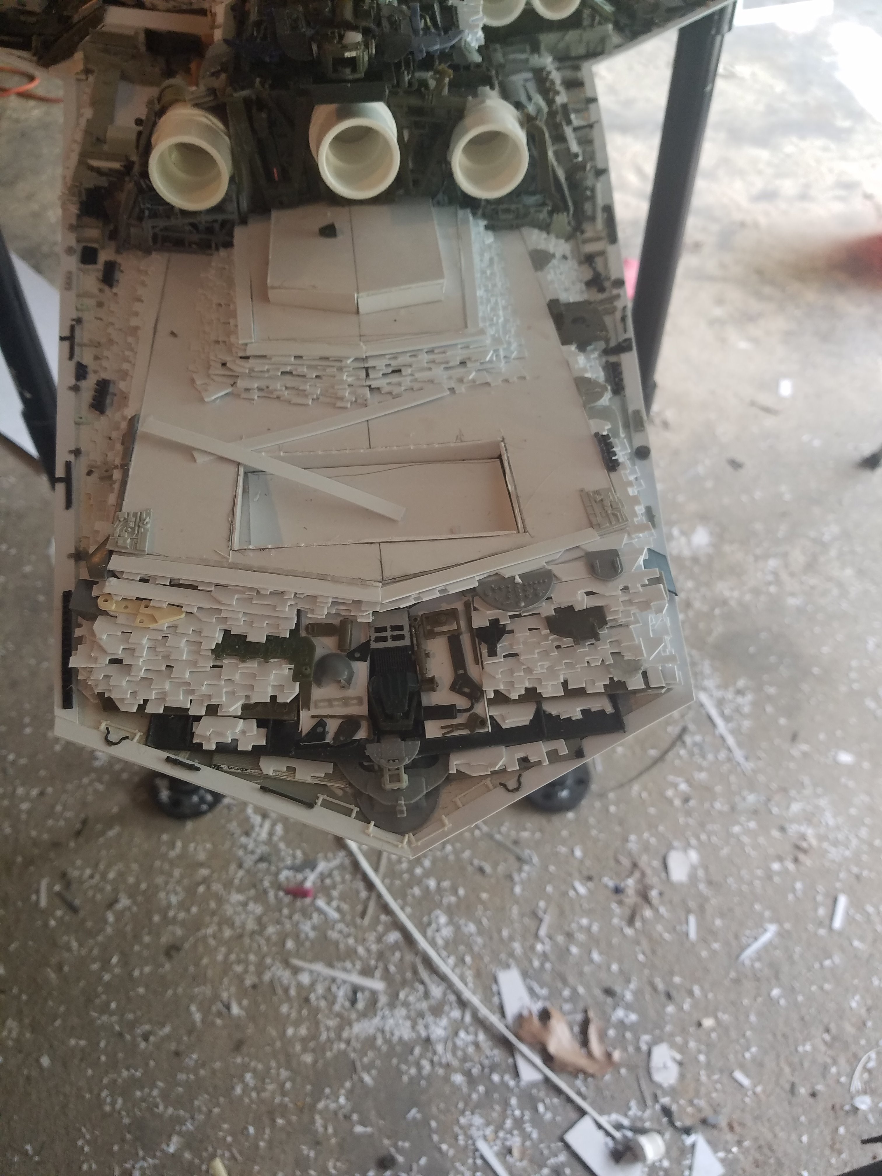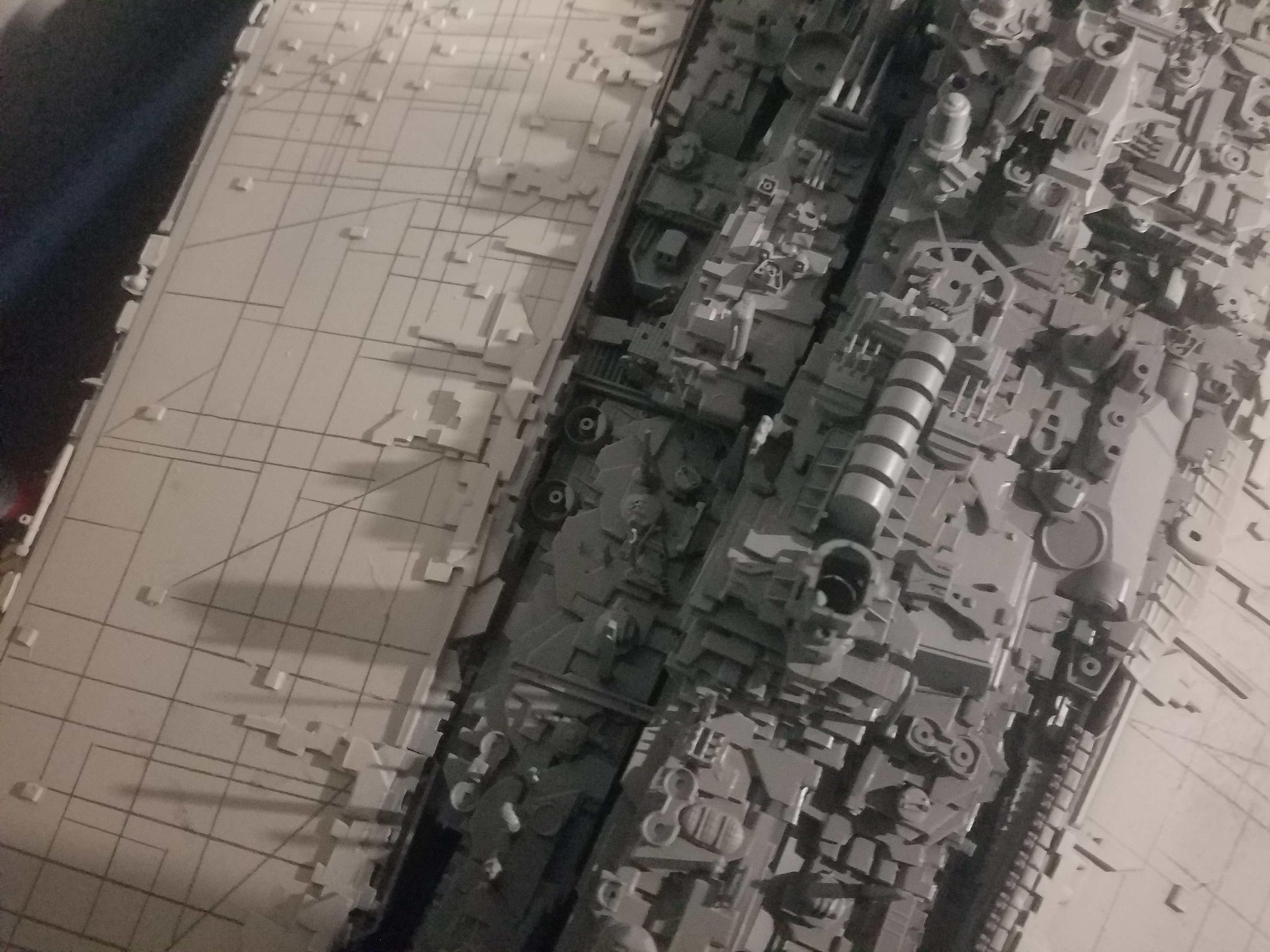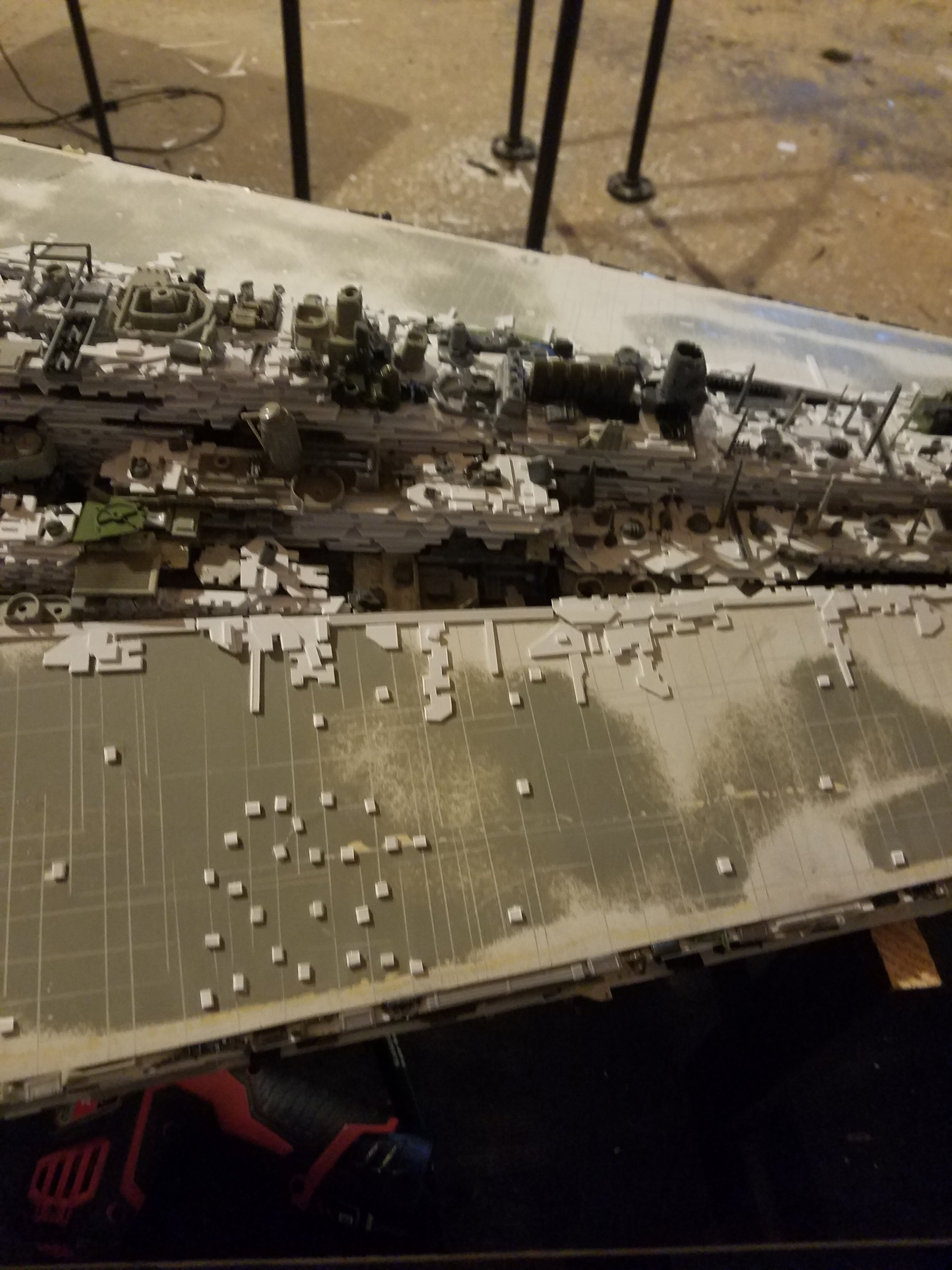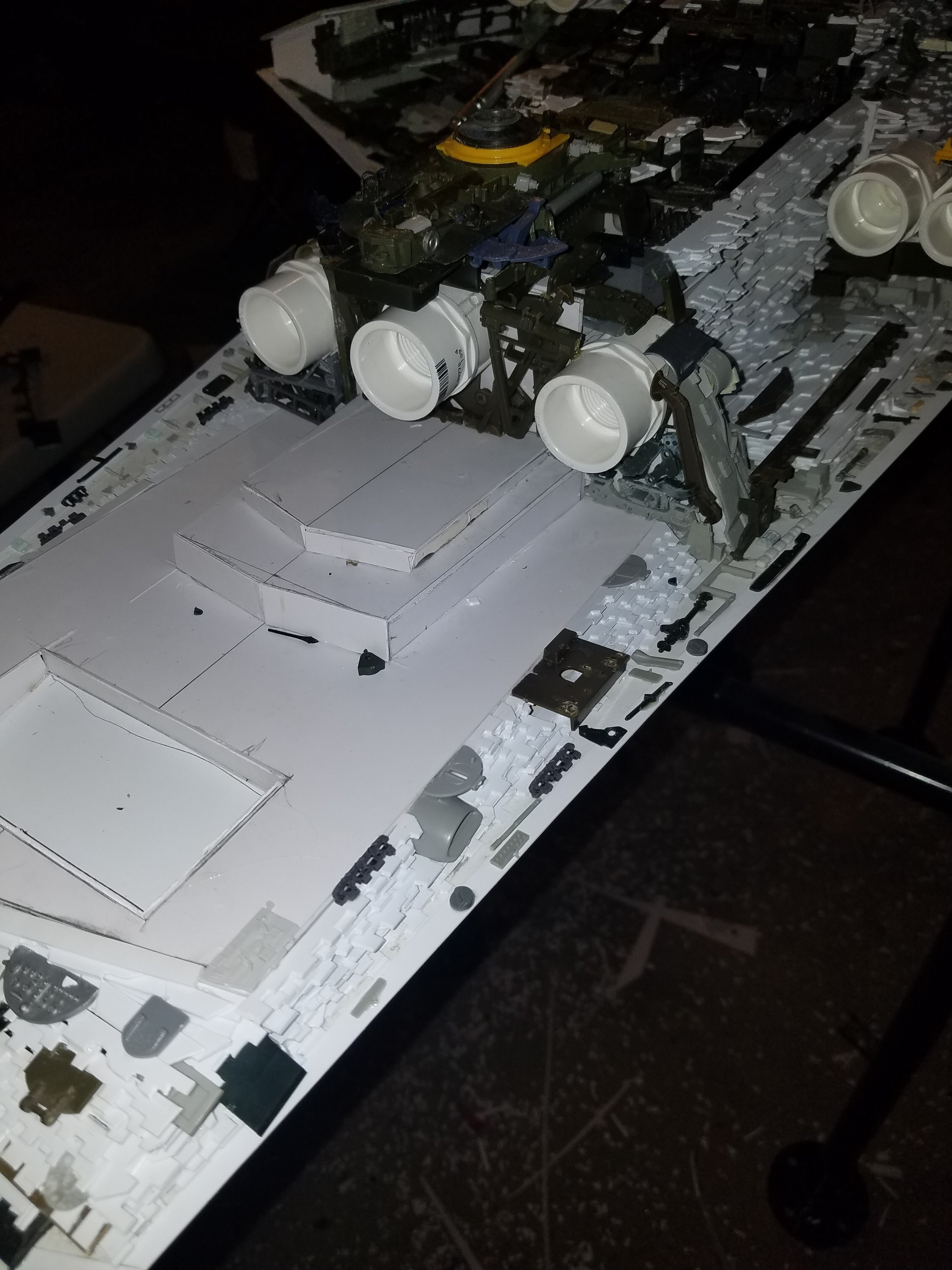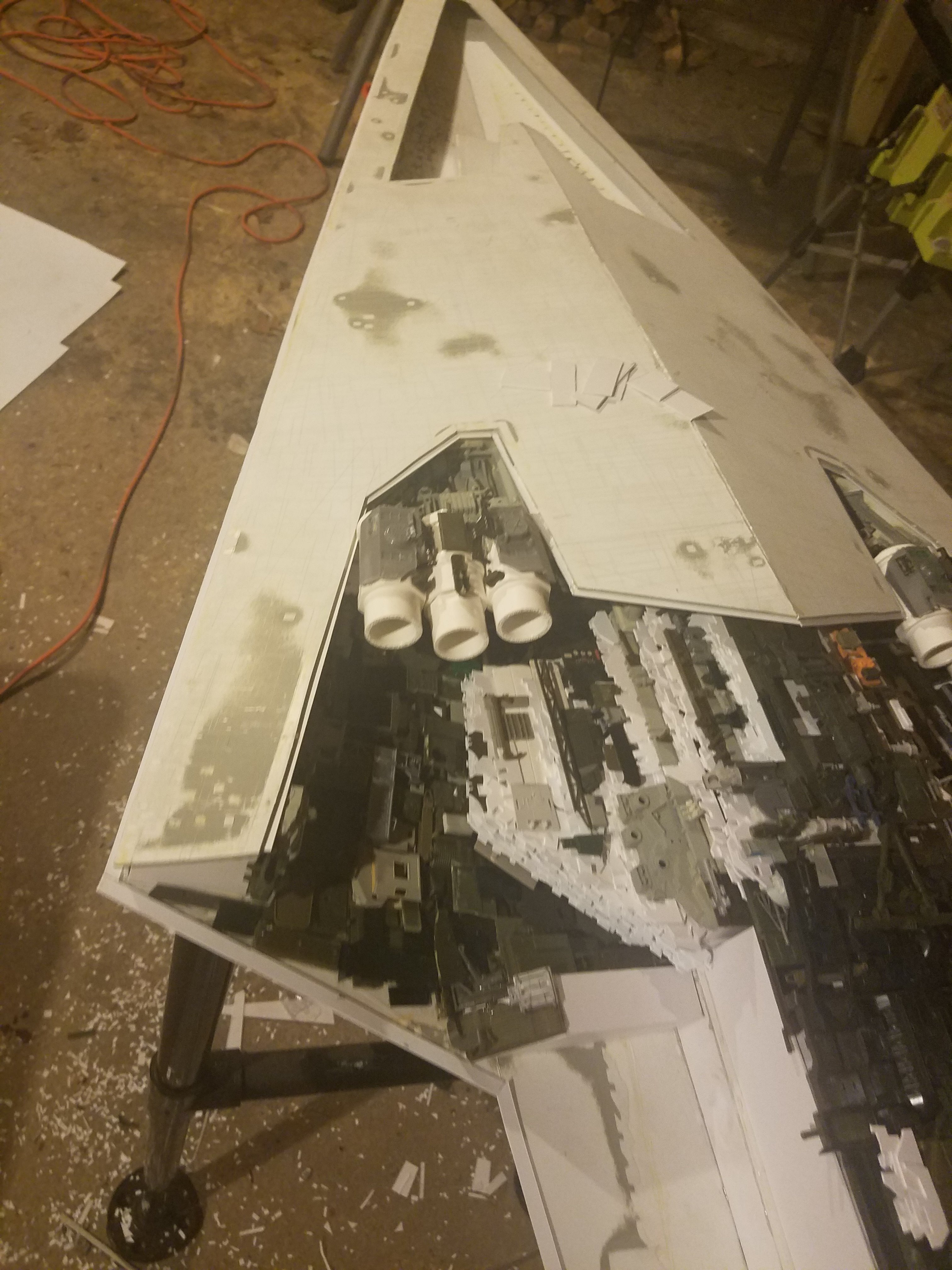 I finally completed my six foot long Empire Strikes Back Super Star Destroyer Build. It took just over a year to complete due to the exceedingly heavy detailing. Each piece of plastic I cut by hand and glued onto the model as well as parts from hundreds of various kits. Luckily I was able to find a seller on eBay selling boxes full of miscellaneous model parts for cheap. I had originally built this model a few years ago when I was just out of college and have been staring at it for years because I wasn’t quite happy with it. Being that this is my favorite ship of all time I had to do something about that so I ripped apart and started over. I saved the hulls but that was about it. Everything else was built up from scratch. The best part was trying to create the organized chaos look in the cityscape with all the structures kind of blending together yet looking like separate pieces still. I think overall I achieved the look I was going for and am pleased with the final result after all these years.