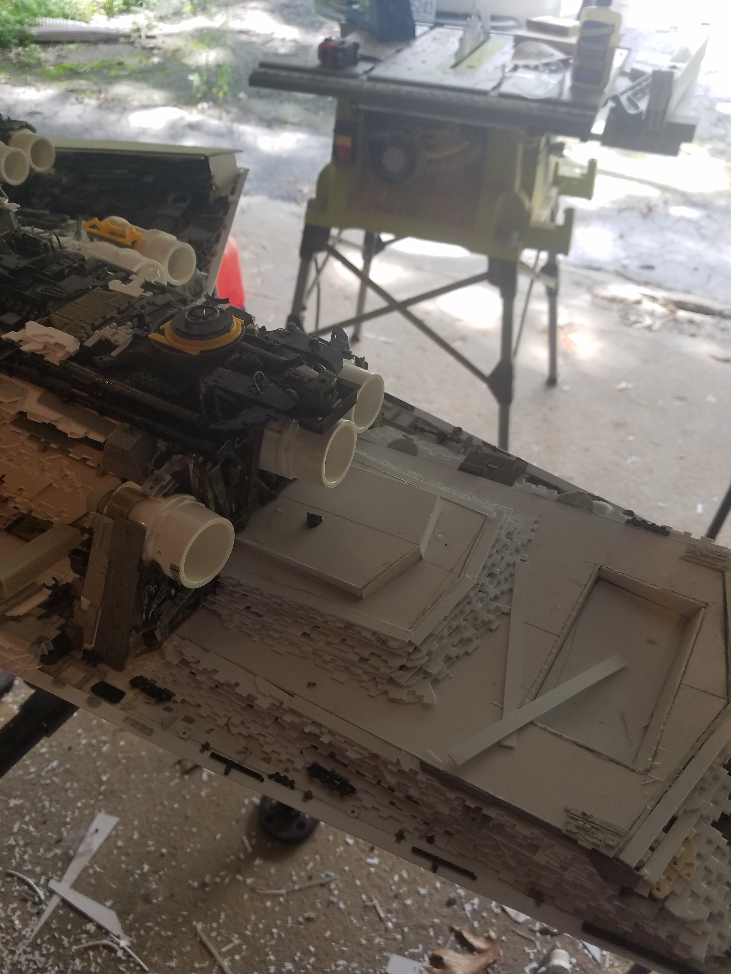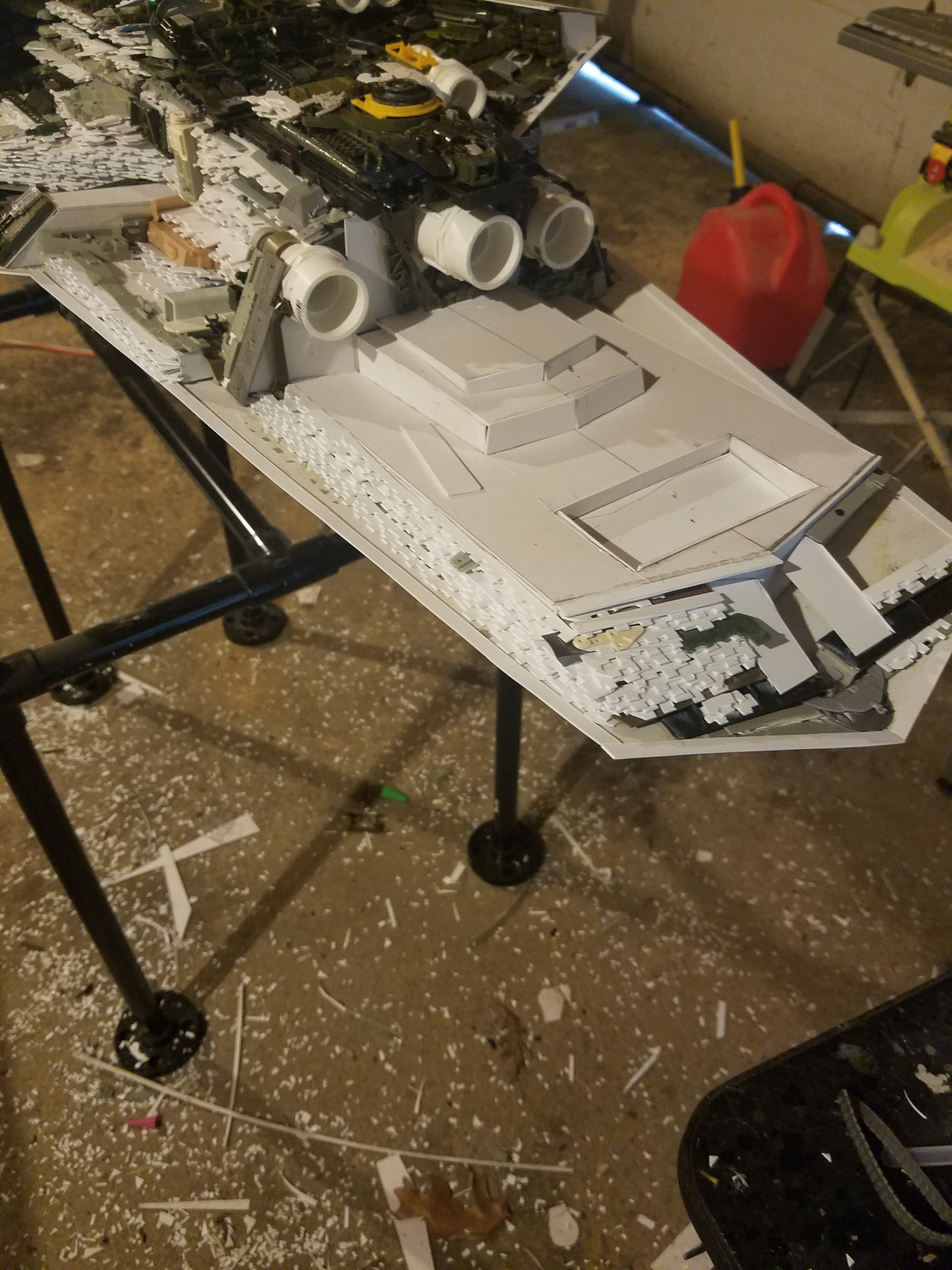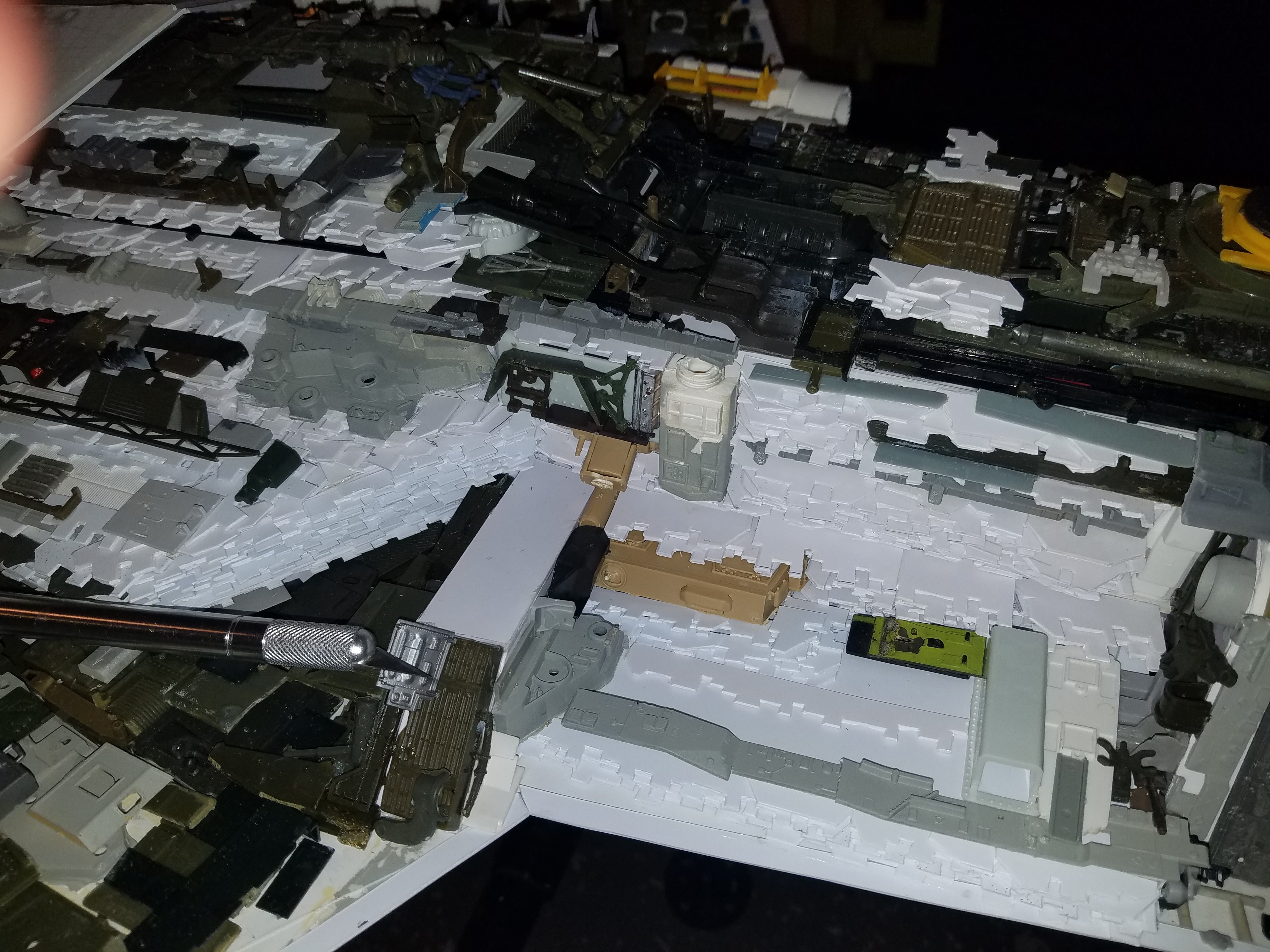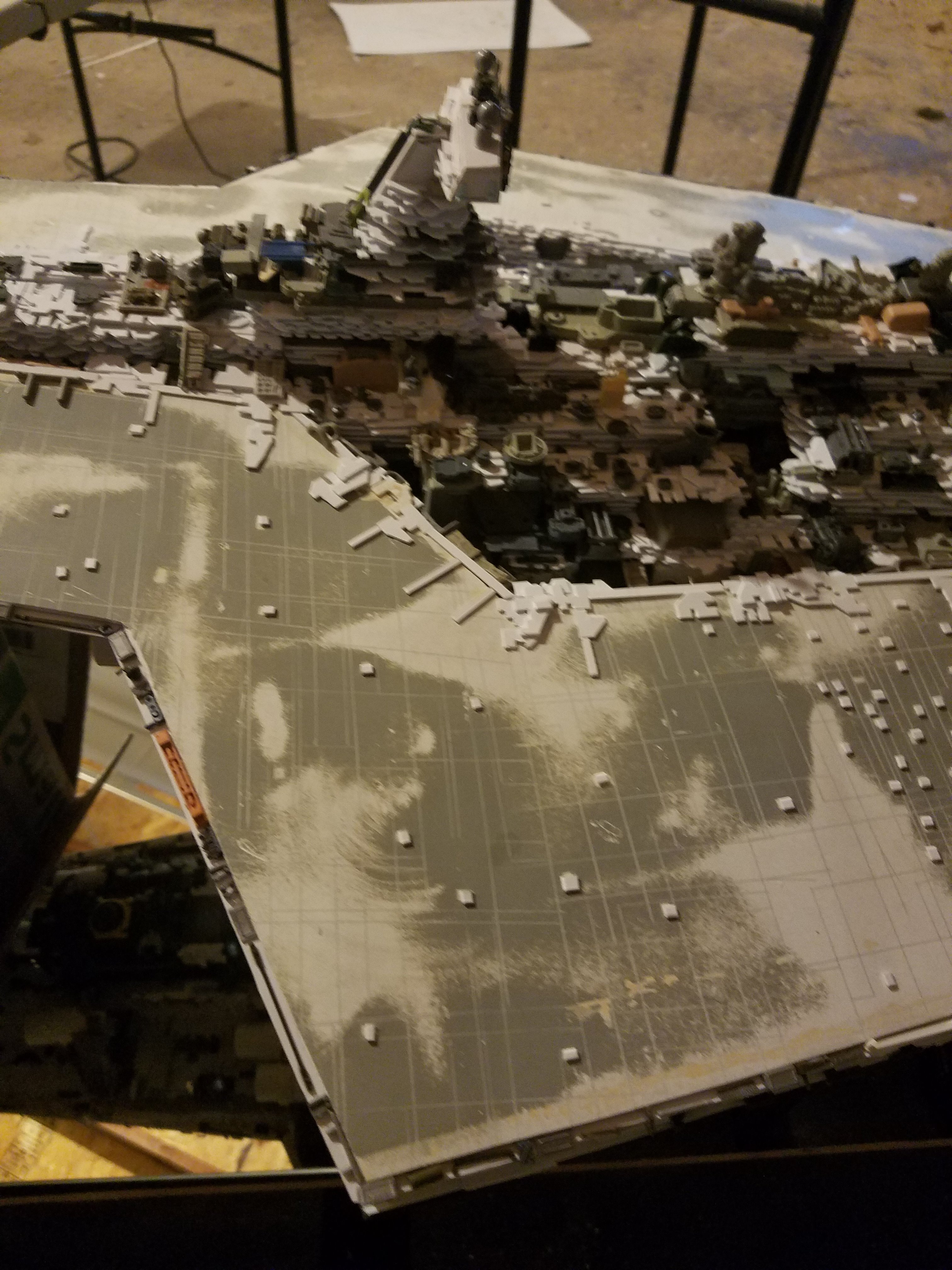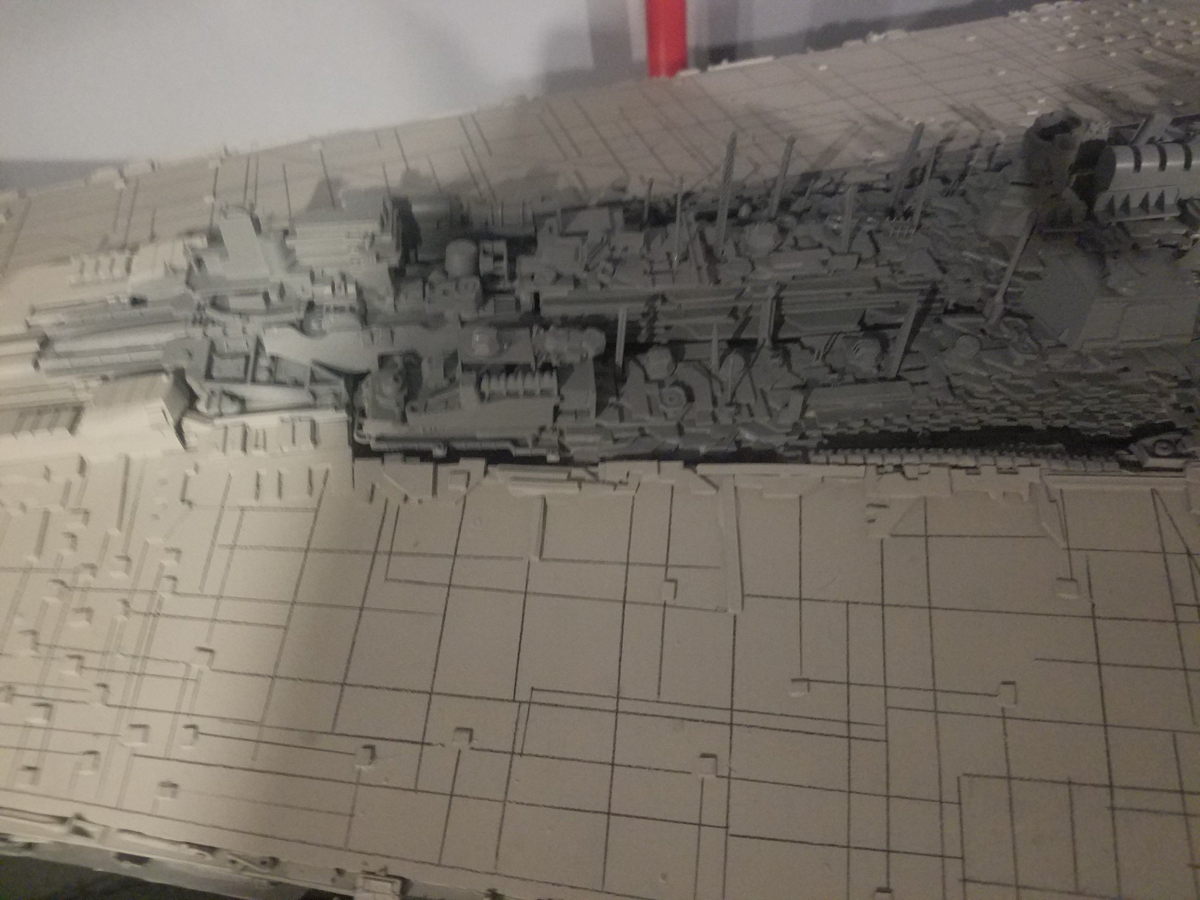 I finally completed my six foot long Empire Strikes Back Super Star Destroyer Build. It took just over a year to complete due to the exceedingly heavy detailing. Each piece of plastic I cut by hand and glued onto the model as well as parts from hundreds of various kits. Luckily I was able to find a seller on eBay selling boxes full of miscellaneous model parts for cheap. I had originally built this model a few years ago when I was just out of college and have been staring at it for years because I wasn’t quite happy with it. Being that this is my favorite ship of all time I had to do something about that so I ripped apart and started over. I saved the hulls but that was about it. Everything else was built up from scratch. The best part was trying to create the organized chaos look in the cityscape with all the structures kind of blending together yet looking like separate pieces still. I think overall I achieved the look I was going for and am pleased with the final result after all these years.