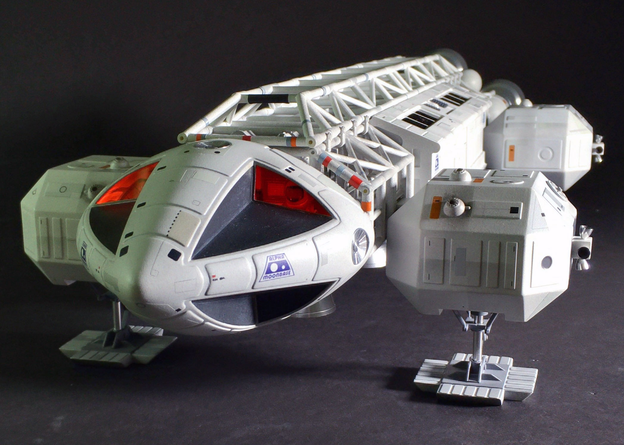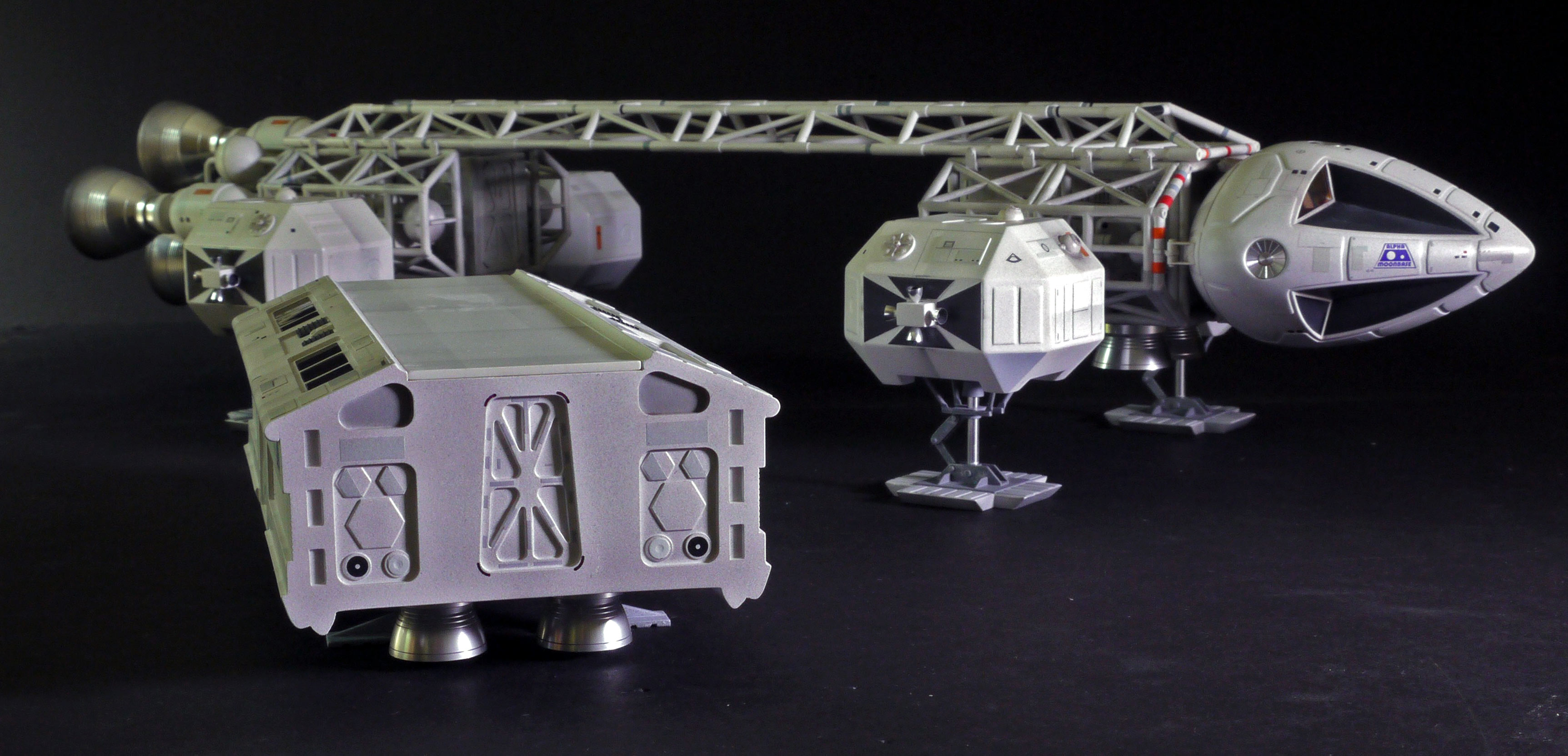 The landing pods, passenger pods, and walkways were all filled solid with resin for additional strength. Prior to pouring the resin, I installed one-inch disk magnets, so the passenger pods snap into place firmly, with no external hardware visible. With all of that resin filler, each model now weighs about five pounds, so a side benefit is that the spring-loaded landing gear compresses realistically under the heft of the model.