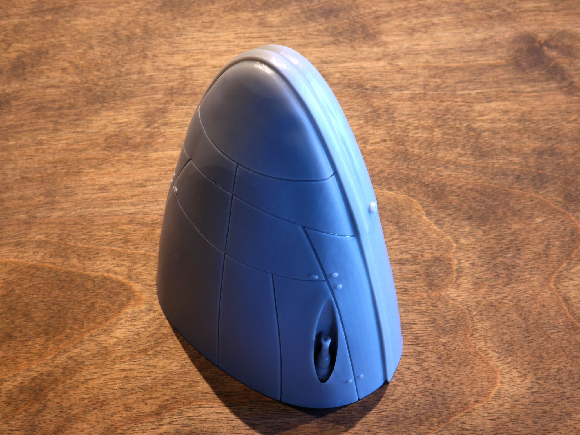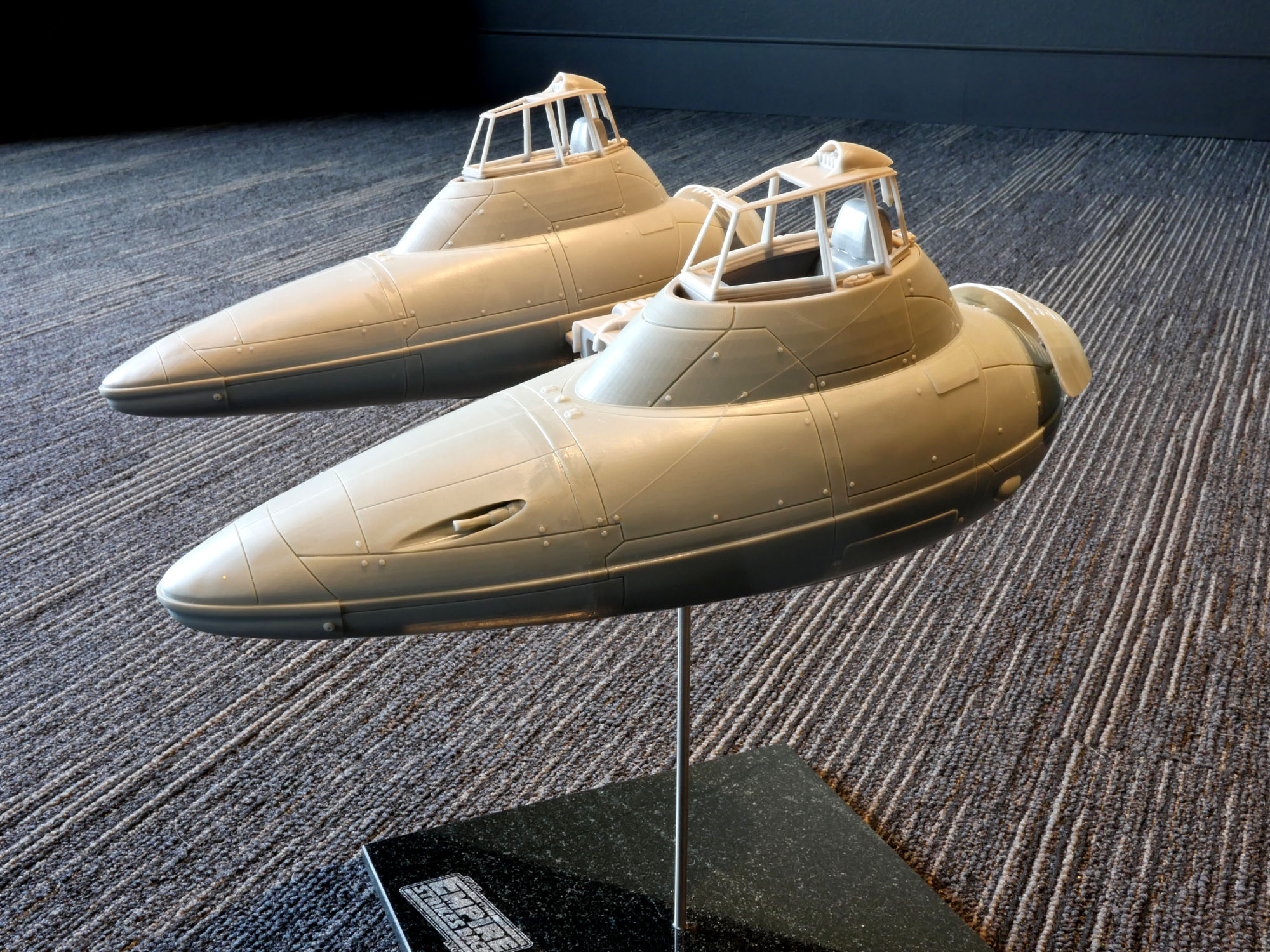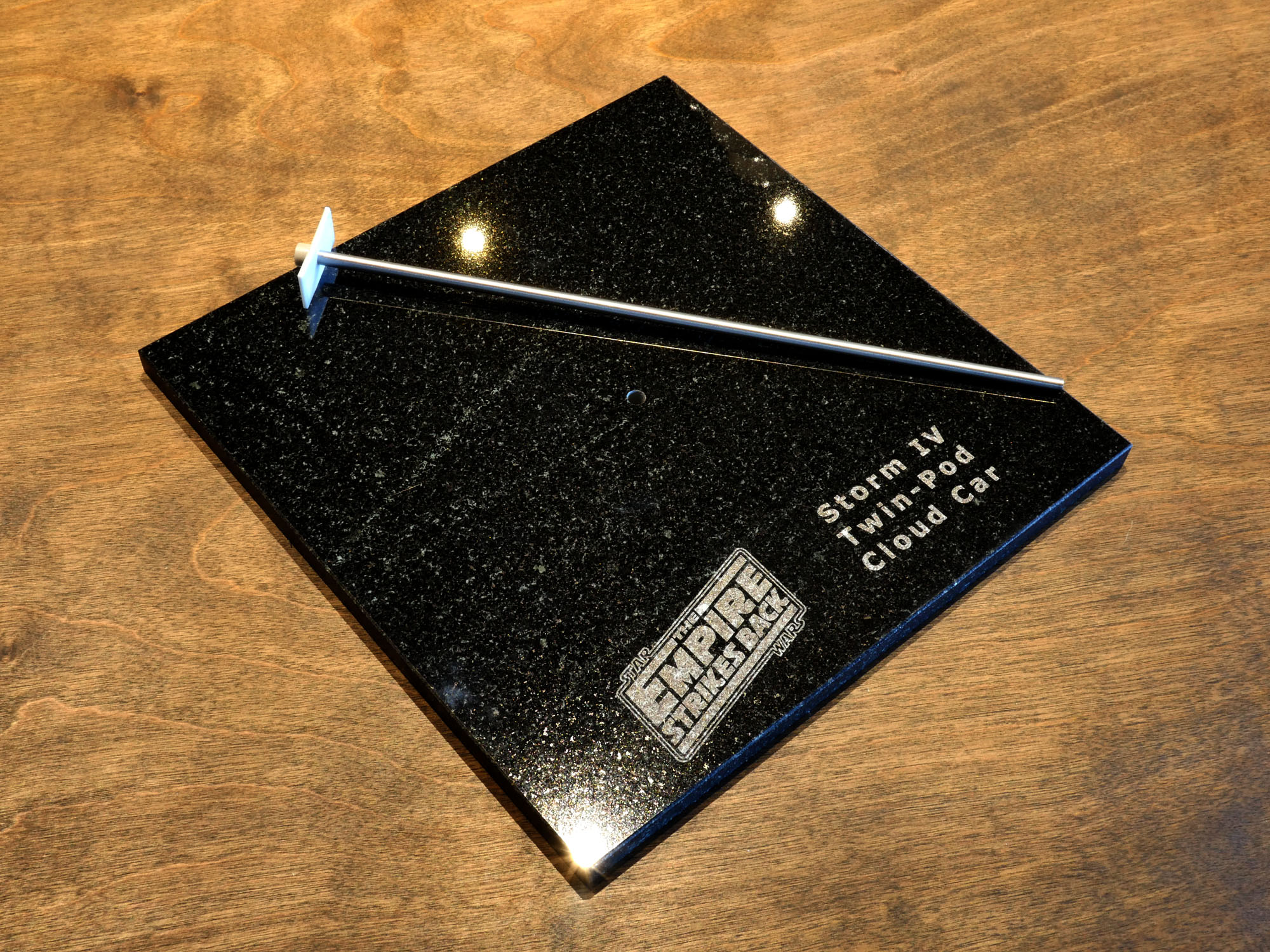 The granite base will have a slot cut into it to run wiring up through the stainless tube into the engine compartment for lighting. The base will have a laser cut cork bottom to not scratch a table top or other surface. Additionally the ‘wings’ of the engine have a hollow section that leads into the main bodies to light the cockpit, optionally. If you are not going to light it or want to have it battery operated where the components are all housed in the engine compartment and do not want a slot cut into the base, please let me know.