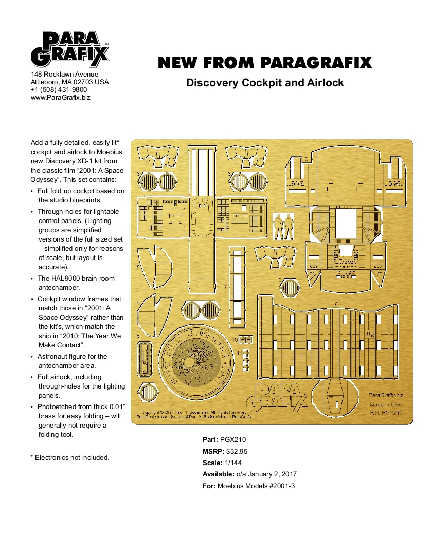 I am pleased to announce my two newest photo etch sets for the upcoming Discovery XD-1 kit from Moebius Models. The first set is a full cockpit and the airlock, while the second is the pod bay. Both feature through holes for lighting and many other details. Please see the attached sheets for a complete description.Expected ship date is around the first week of the year, though that might be delayed due to the holidays.