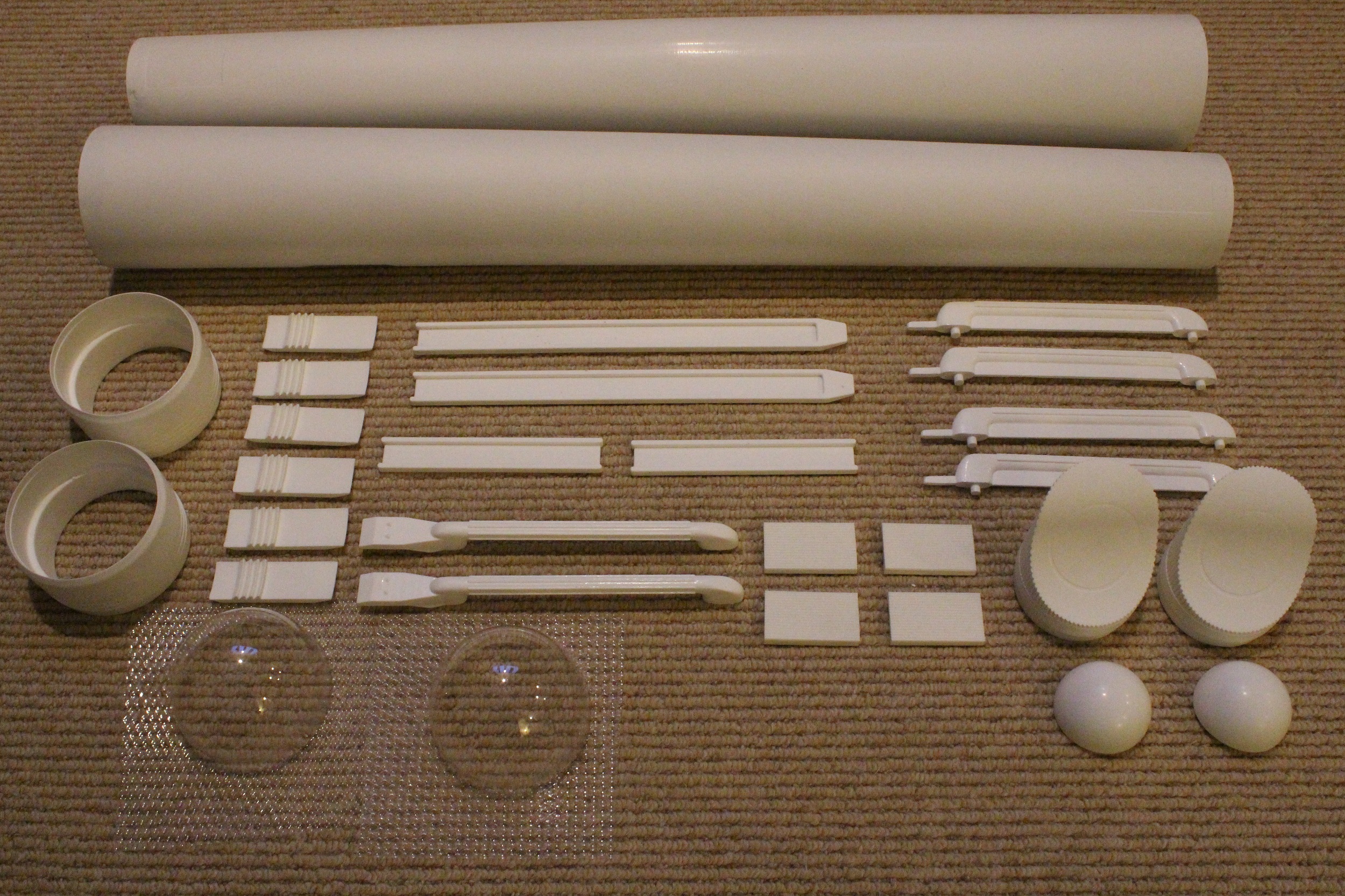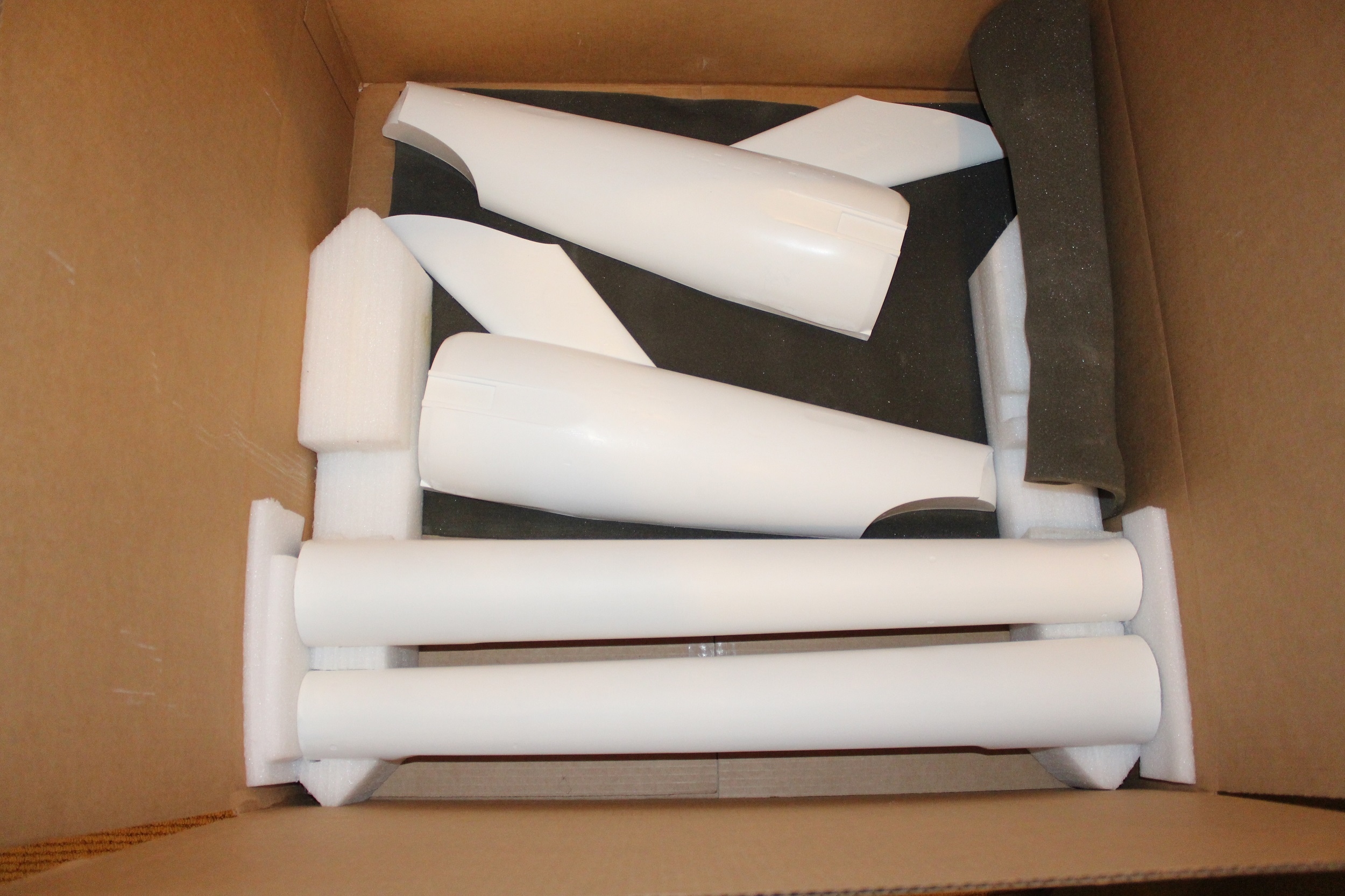Kit Materials: Carbon Fiber, fiberglass, Cast resin, Laser sintered Nylon 3D printed parts, vacuum formed PETG(nacelle domes), aluminum