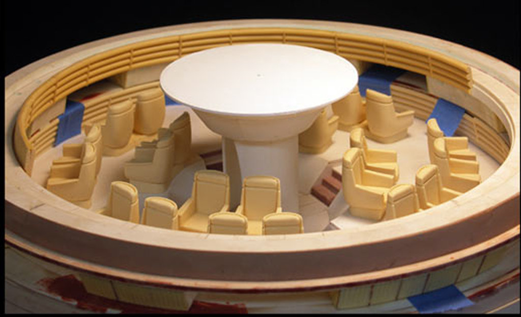 This highly detailed model is 1:32 and included a full passenger cabin and flight deck interiors. We researched the kit parts used on the filming model, which was twice the size of our kit, and every such detail is recreated by hand to assure complete accuracy. Included figures are 2 Pilots, 1 Flight Attendant, and Dr. Floyd. These model parts are very heavy.