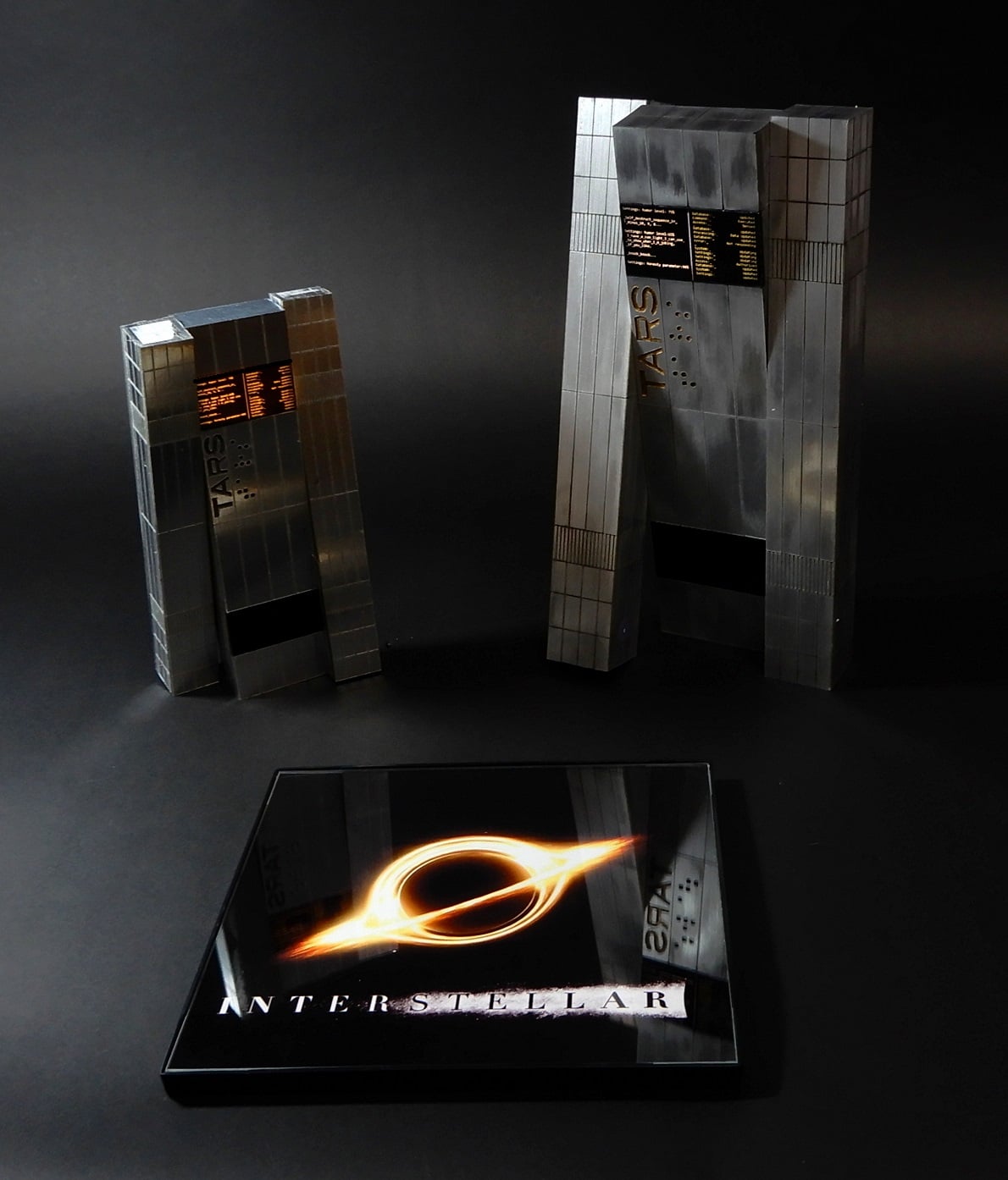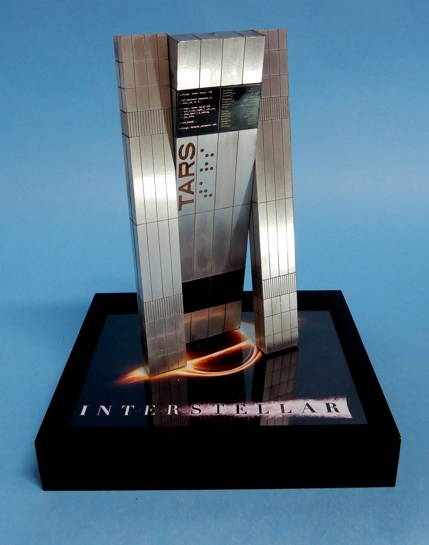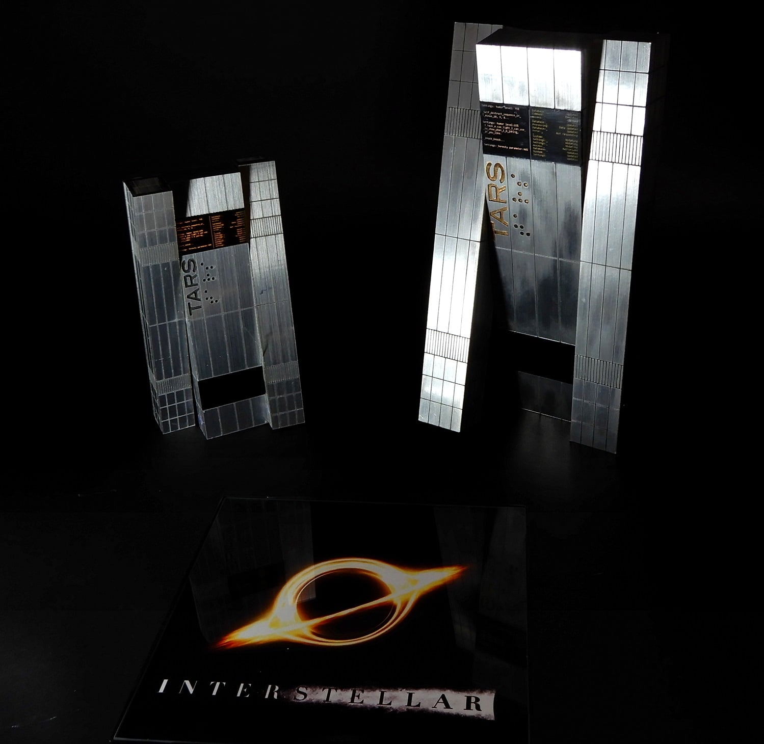 Kit Description: This is a laser cut model kit with the stainless steel vinyl applied before cutting it. It’ll have LEDs to light the front panel. I’m taking orders now.. The 1/6 scale (11.5″) TARS sells for $175 USD plus shipping. [1/10 scale (7.5″) sells for $170 USD, which INCLUDES SHIPPING.]