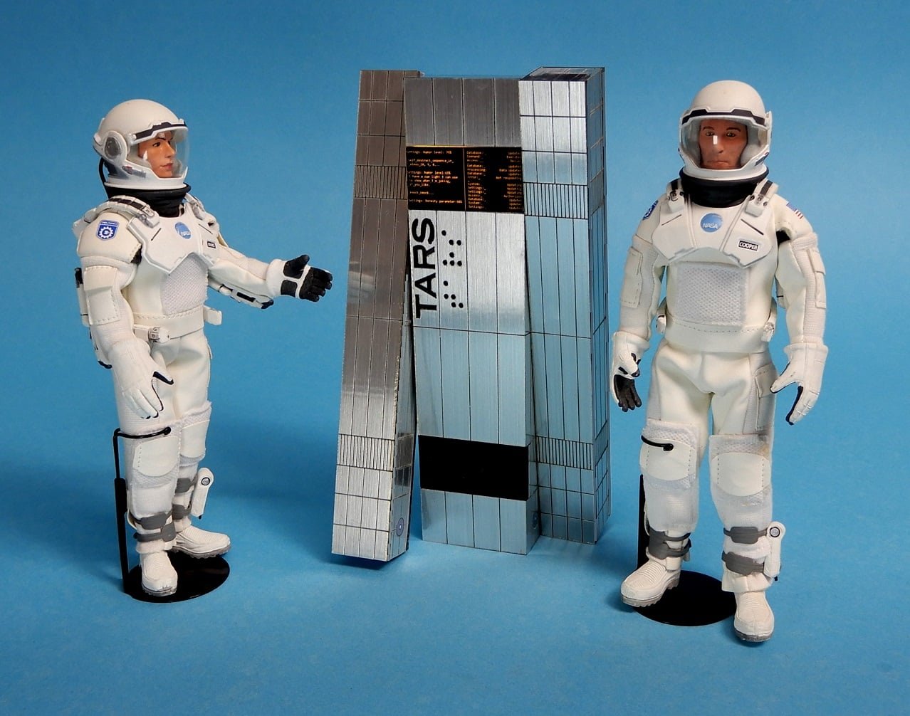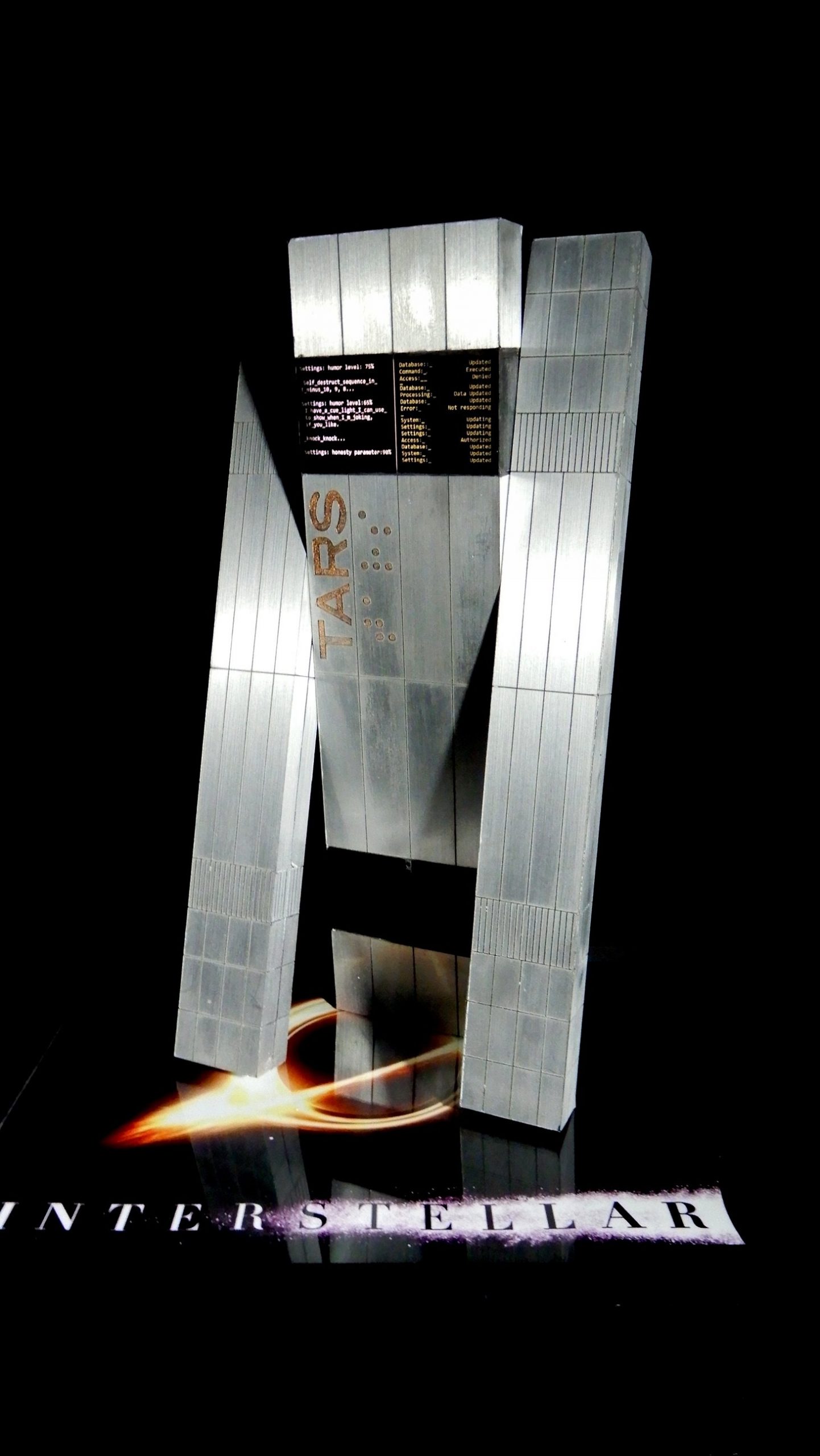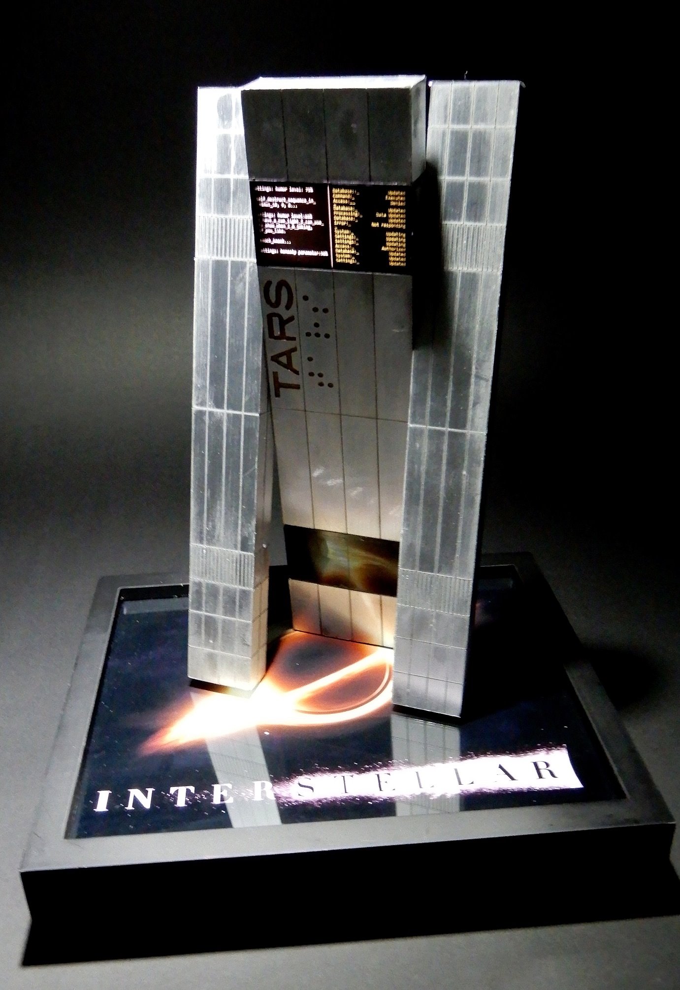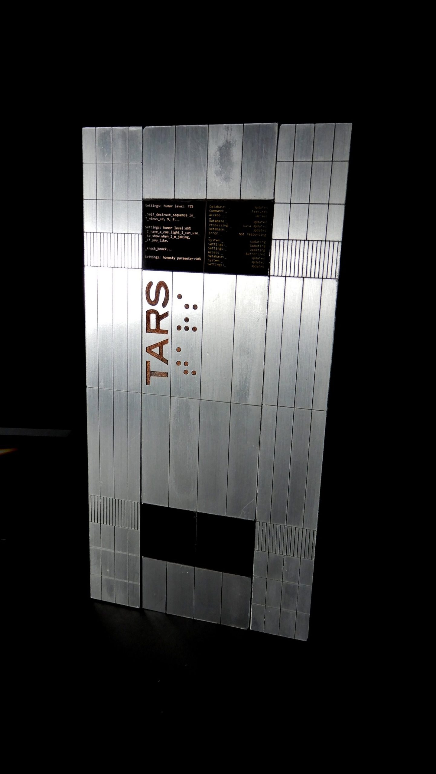 Kit Description: This is a laser cut model kit with the stainless steel vinyl applied before cutting it. It’ll have LEDs to light the front panel. I’m taking orders now.. The 1/6 scale (11.5″) TARS sells for $175 USD plus shipping. [1/10 scale (7.5″) sells for $170 USD, which INCLUDES SHIPPING.]