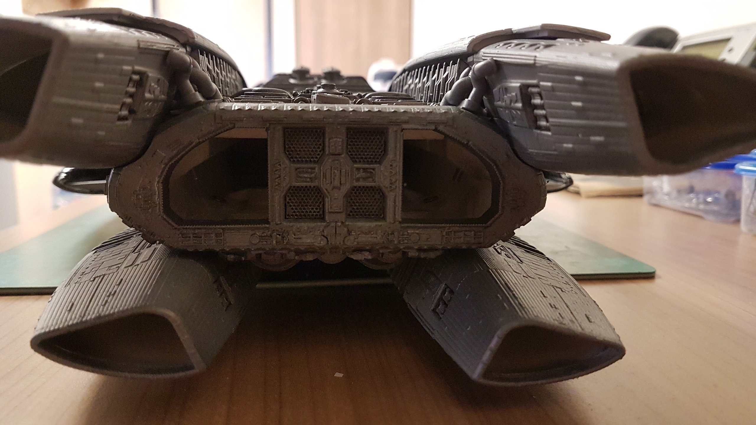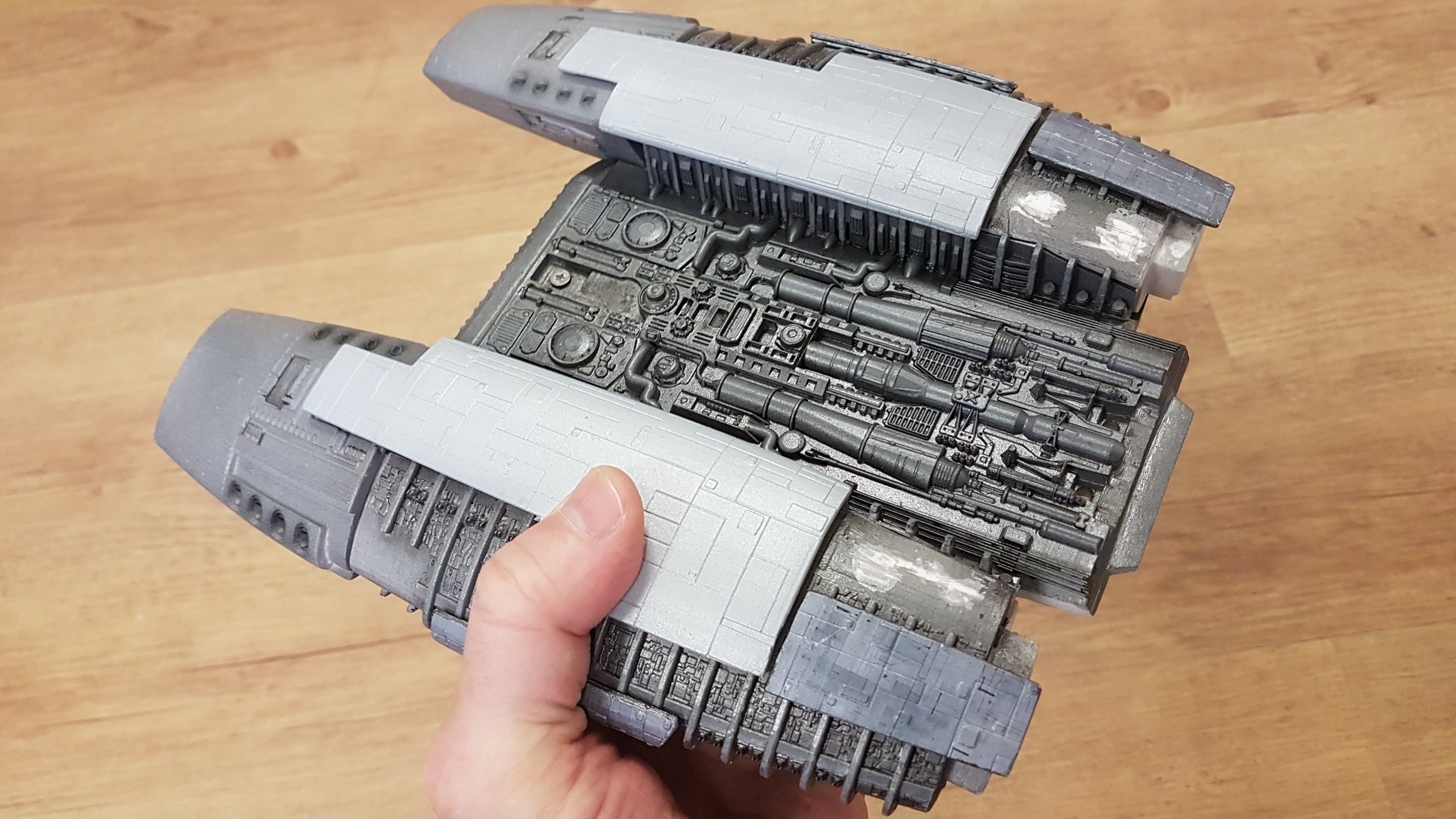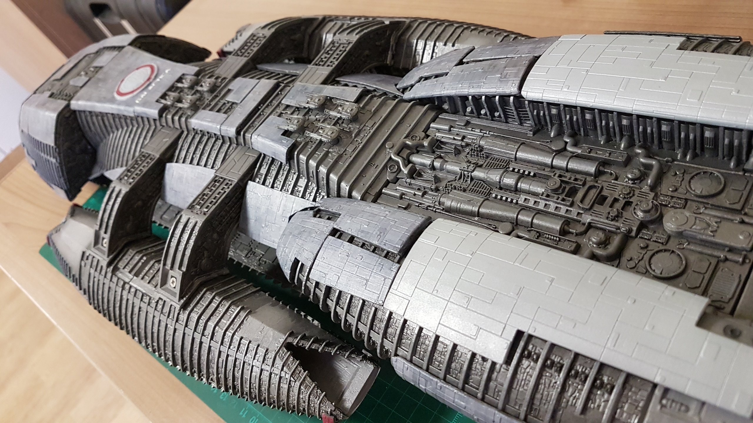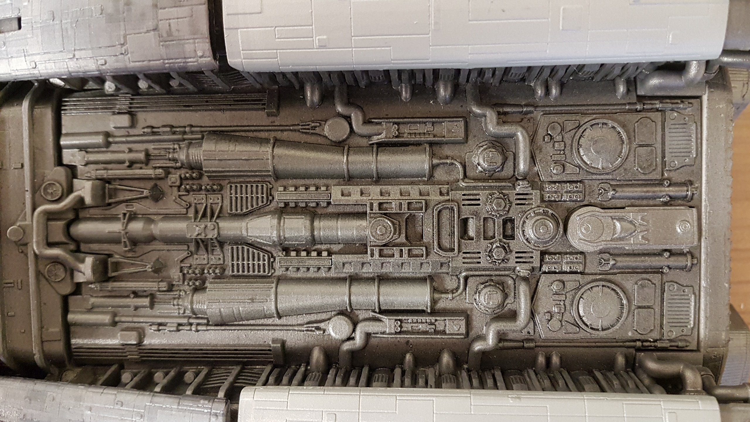 The belly slots together with the option to glue them together. Screws can then be added to the 3 spine sections and the nose/jaw and engine parts sliding and screwing into place. Adding lighting will be easy since all the parts are made to accommodate wiring and LED’s. The kit at that stage of these shown photos isn’t complete and needs Pod Landing Bay and Armor as well as Top Engine Armor decals.