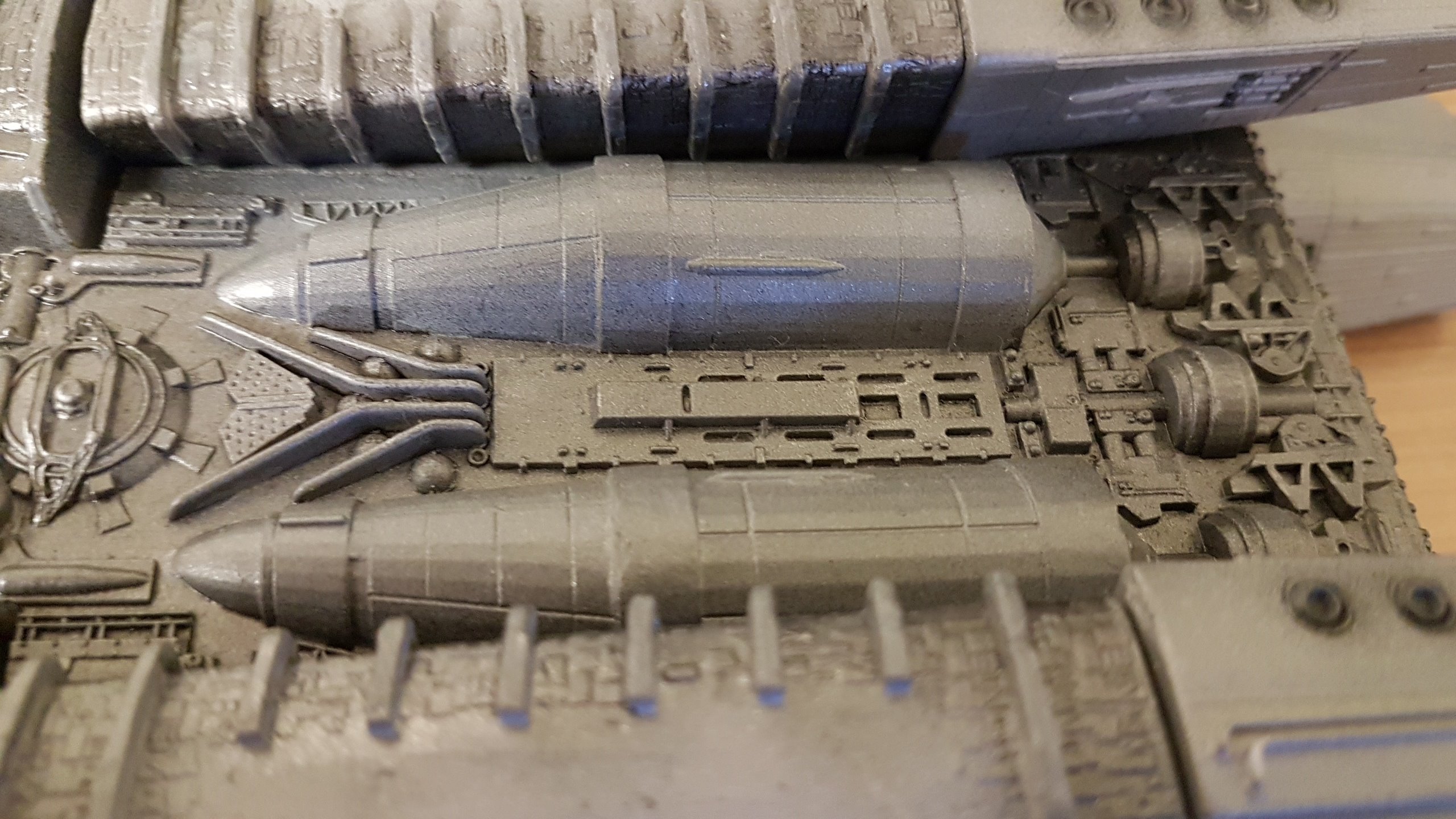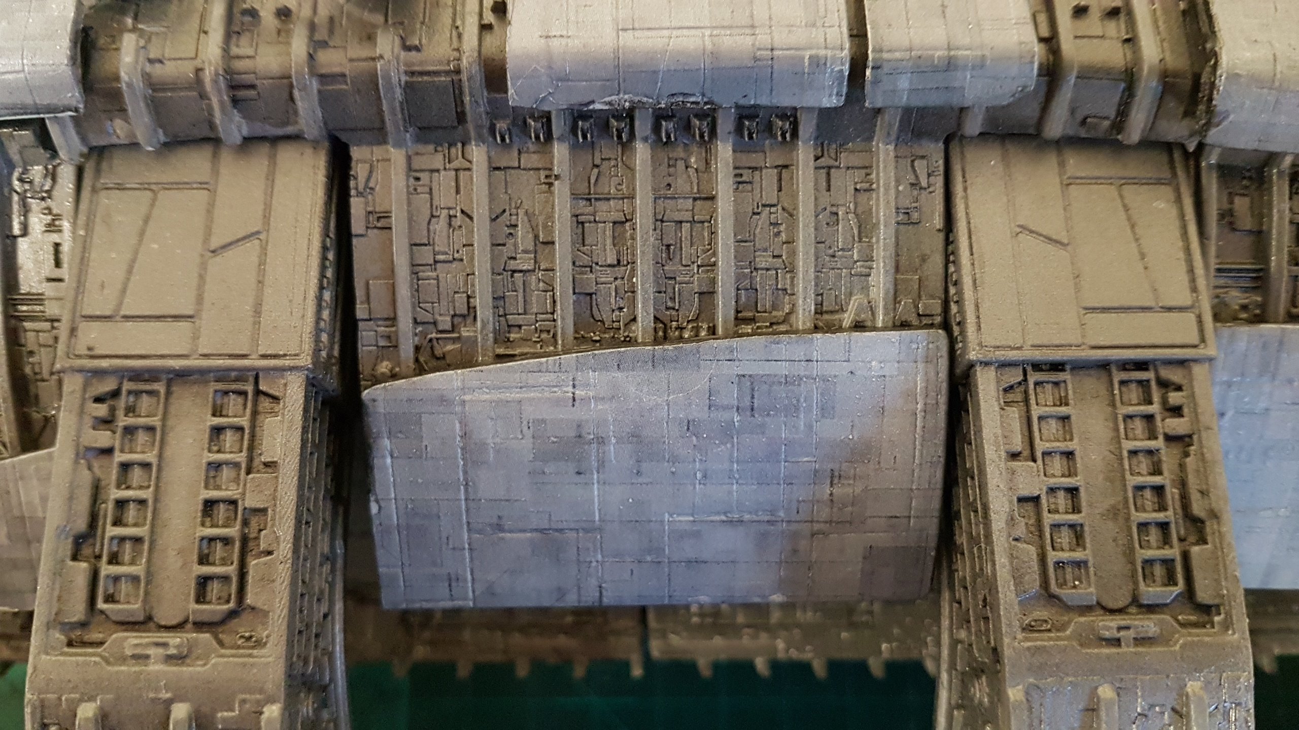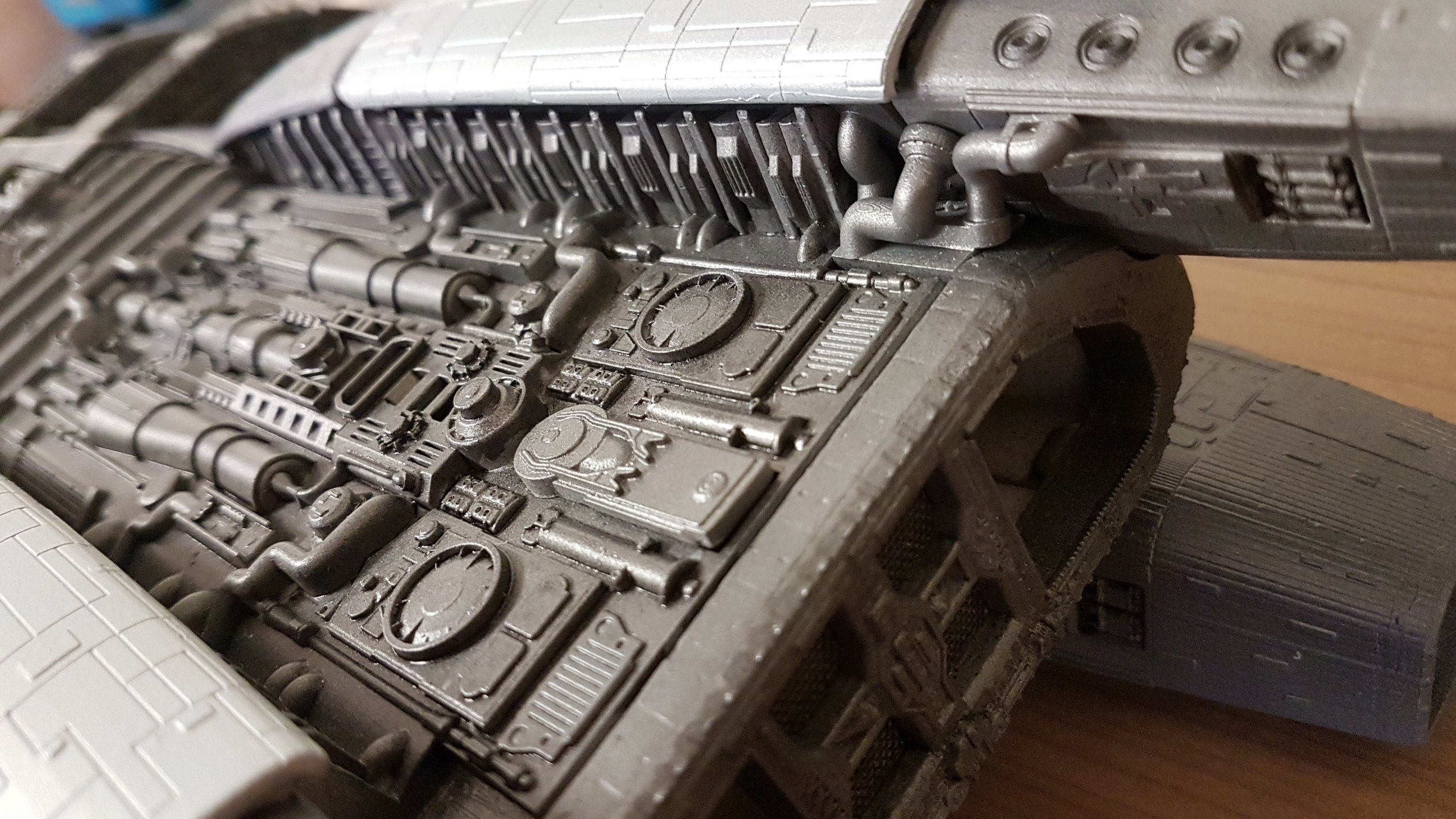 The belly slots together with the option to glue them together. Screws can then be added to the 3 spine sections and the nose/jaw and engine parts sliding and screwing into place. Adding lighting will be easy since all the parts are made to accommodate wiring and LED’s. The kit at that stage of these shown photos isn’t complete and needs Pod Landing Bay and Armor as well as Top Engine Armor decals.