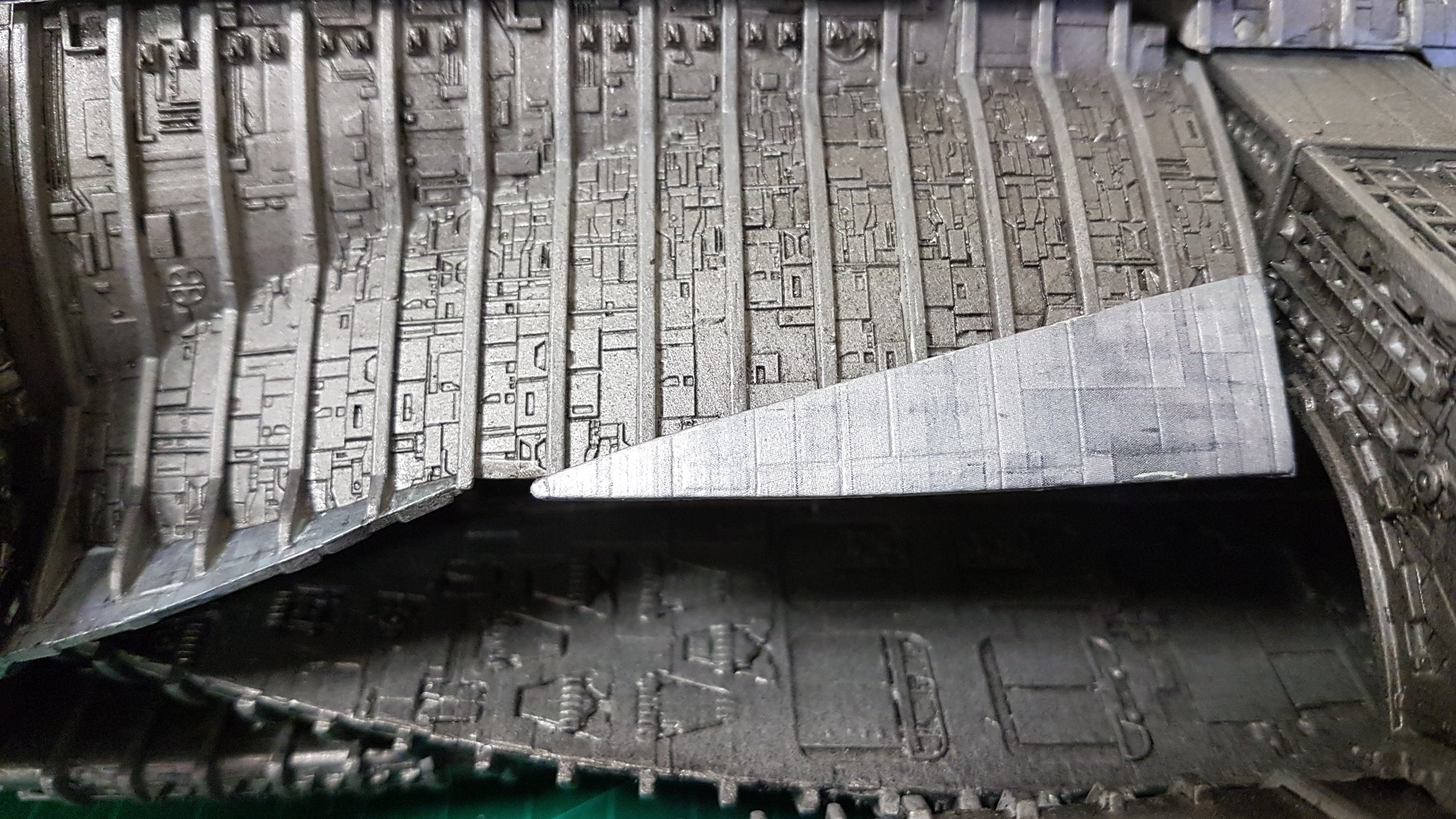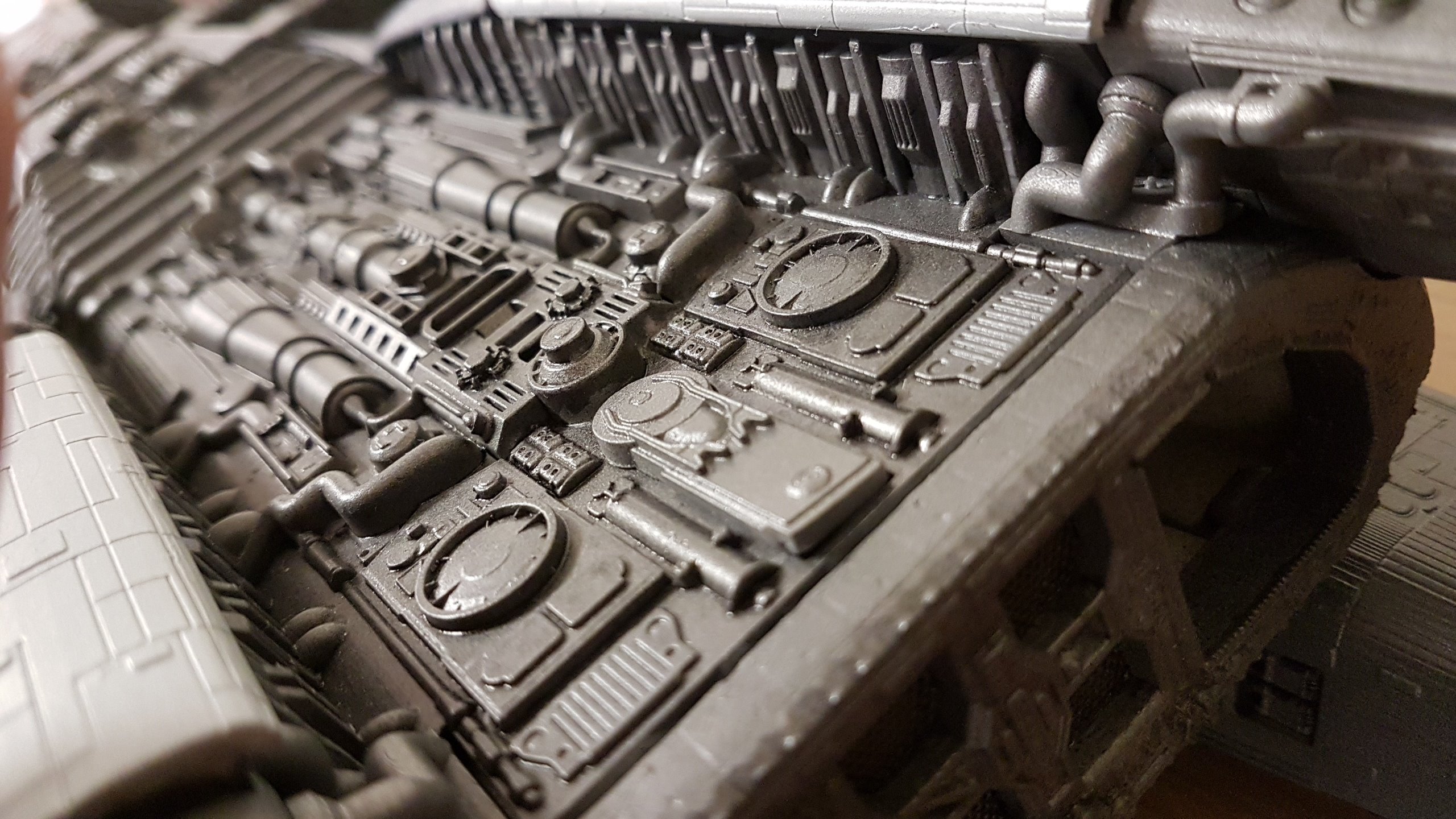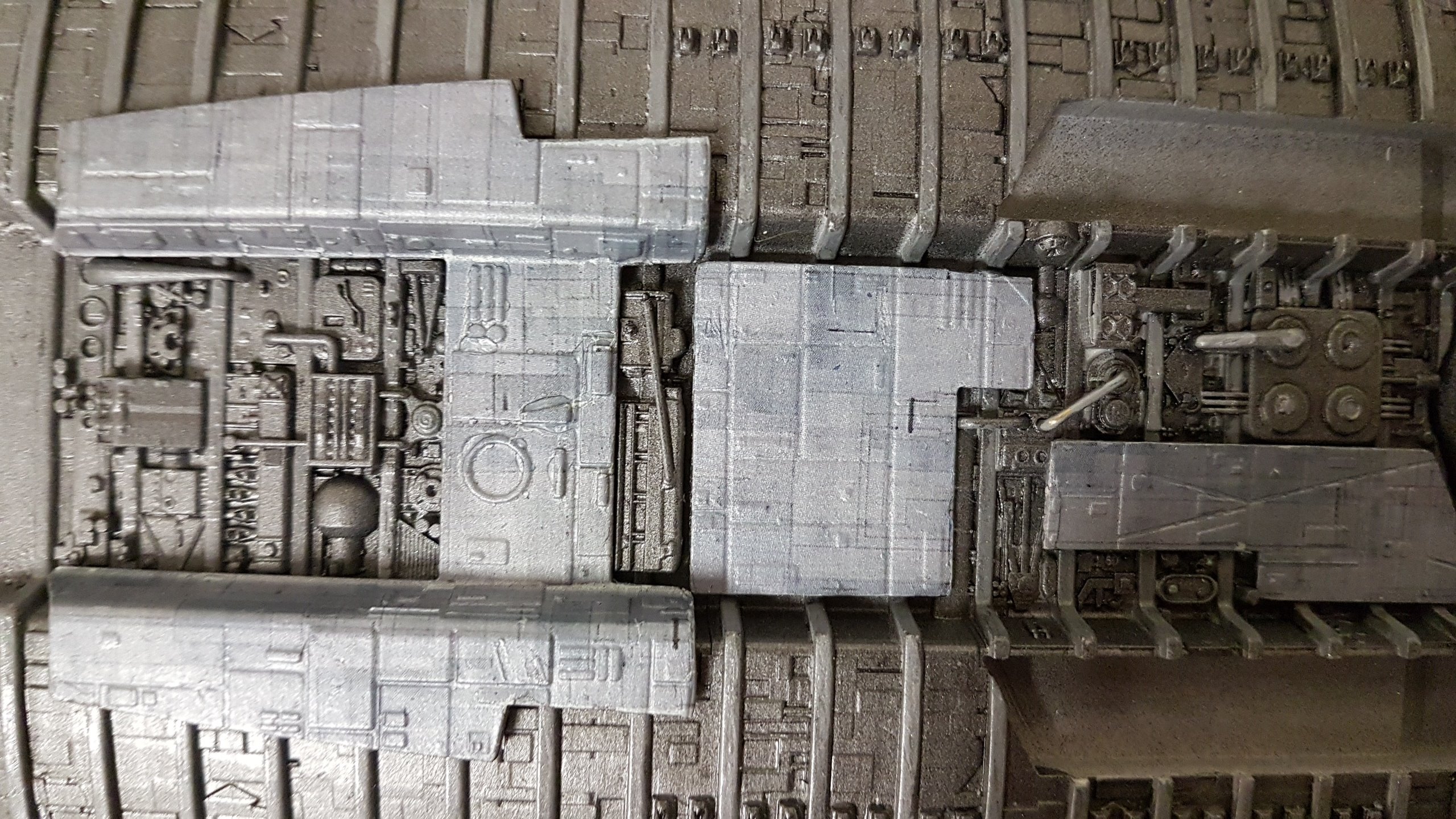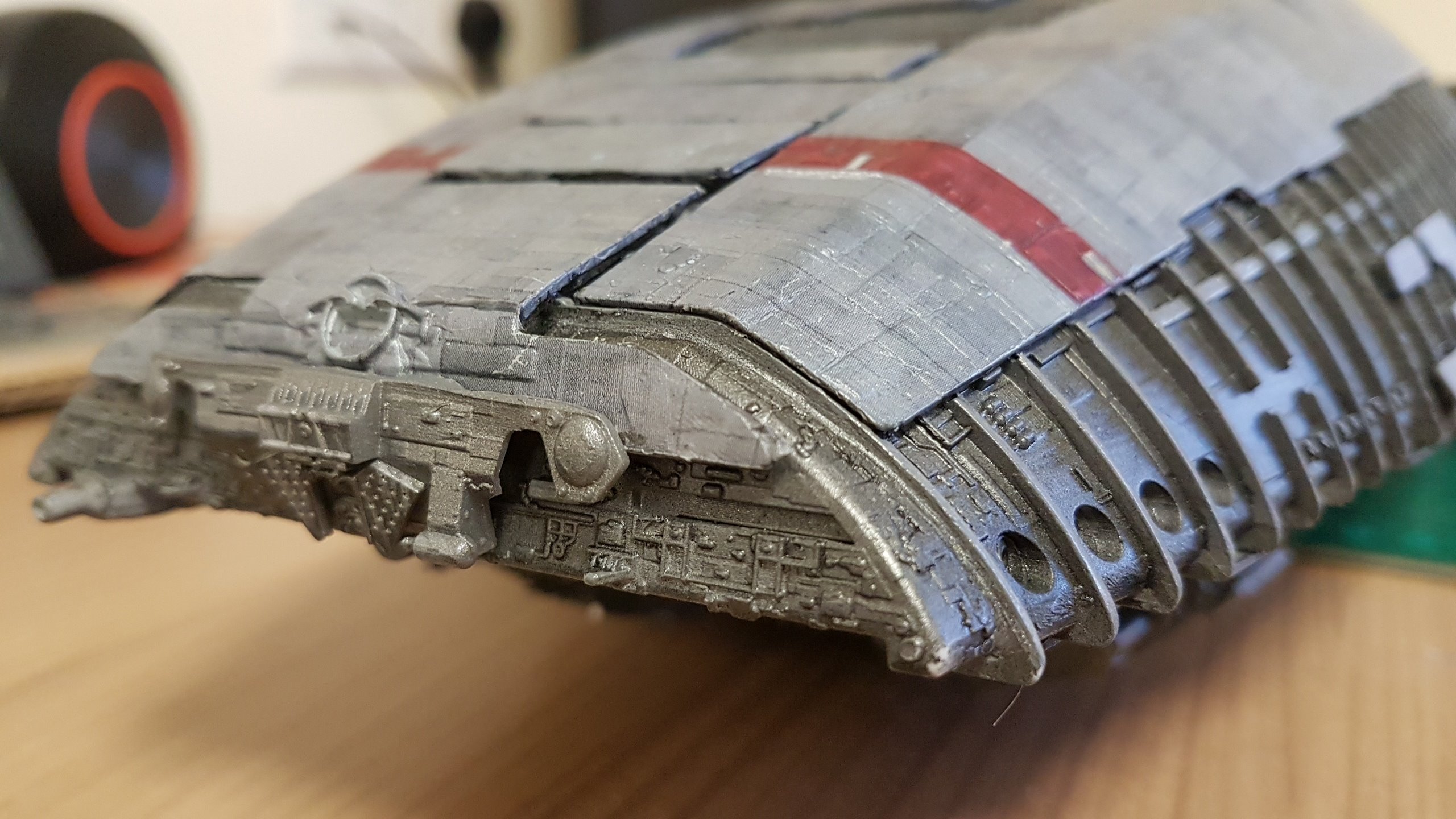 The belly slots together with the option to glue them together. Screws can then be added to the 3 spine sections and the nose/jaw and engine parts sliding and screwing into place. Adding lighting will be easy since all the parts are made to accommodate wiring and LED’s. The kit at that stage of these shown photos isn’t complete and needs Pod Landing Bay and Armor as well as Top Engine Armor decals.