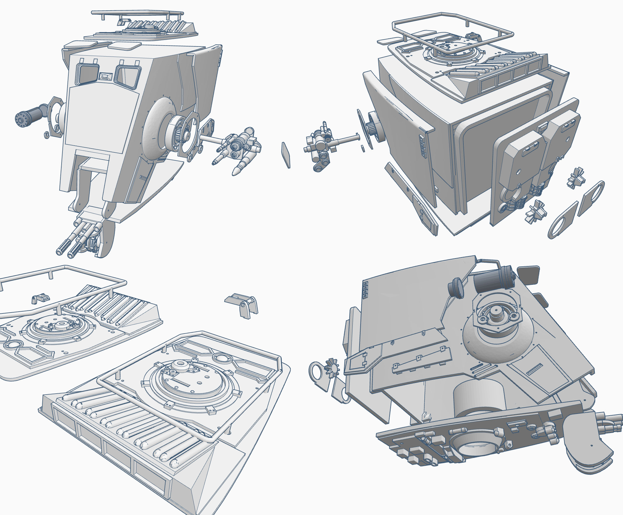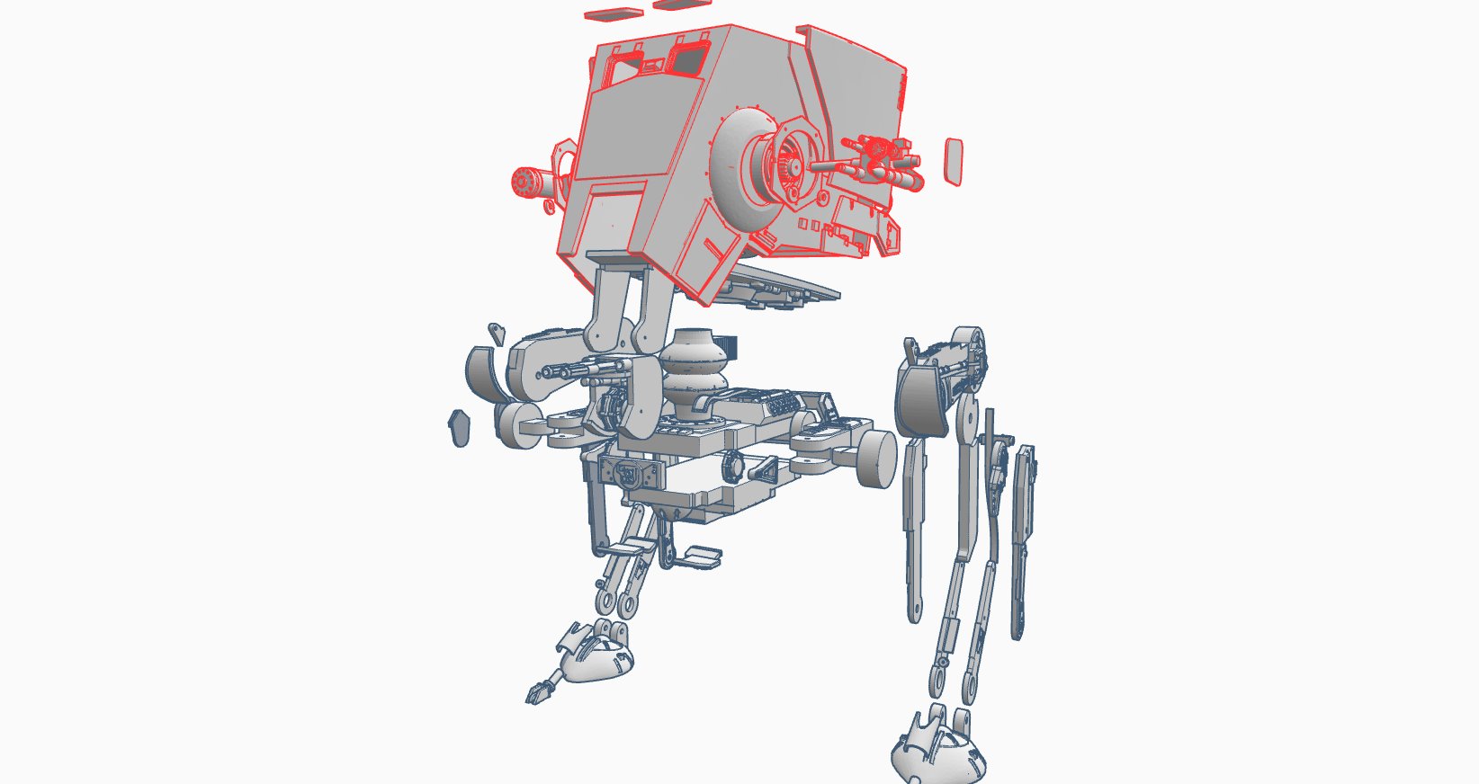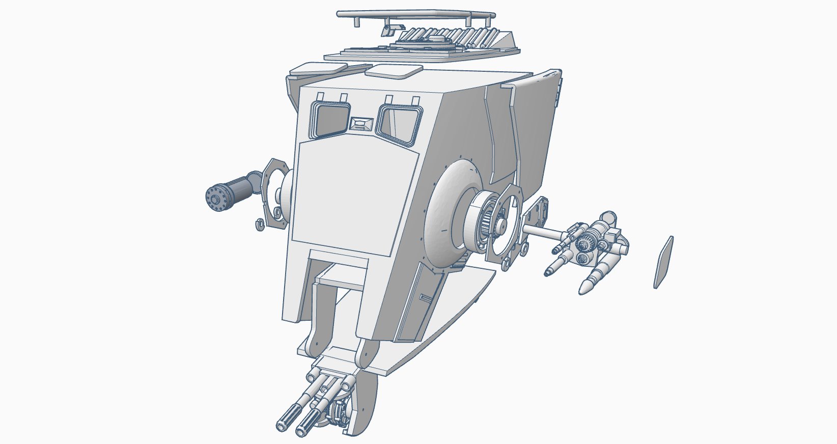 The model can be articulated at every single leg, hip, foot, neck and gun joint using machine screws and hex nuts. I modeled it studio scale but it can be easily scaled up or down and printed easily on even small printers with zero to minimal support structures.