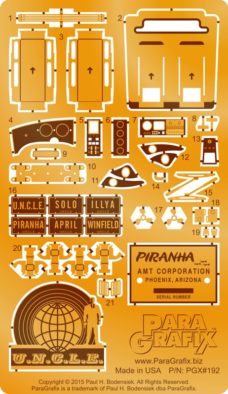 Kit Description: I am happy to announce my latest photoetch set for the upcoming re-release of the Piranha Super Spy Car kit – also known as the car from the classic TV Series “The Man from U.N.C.L.E.”.