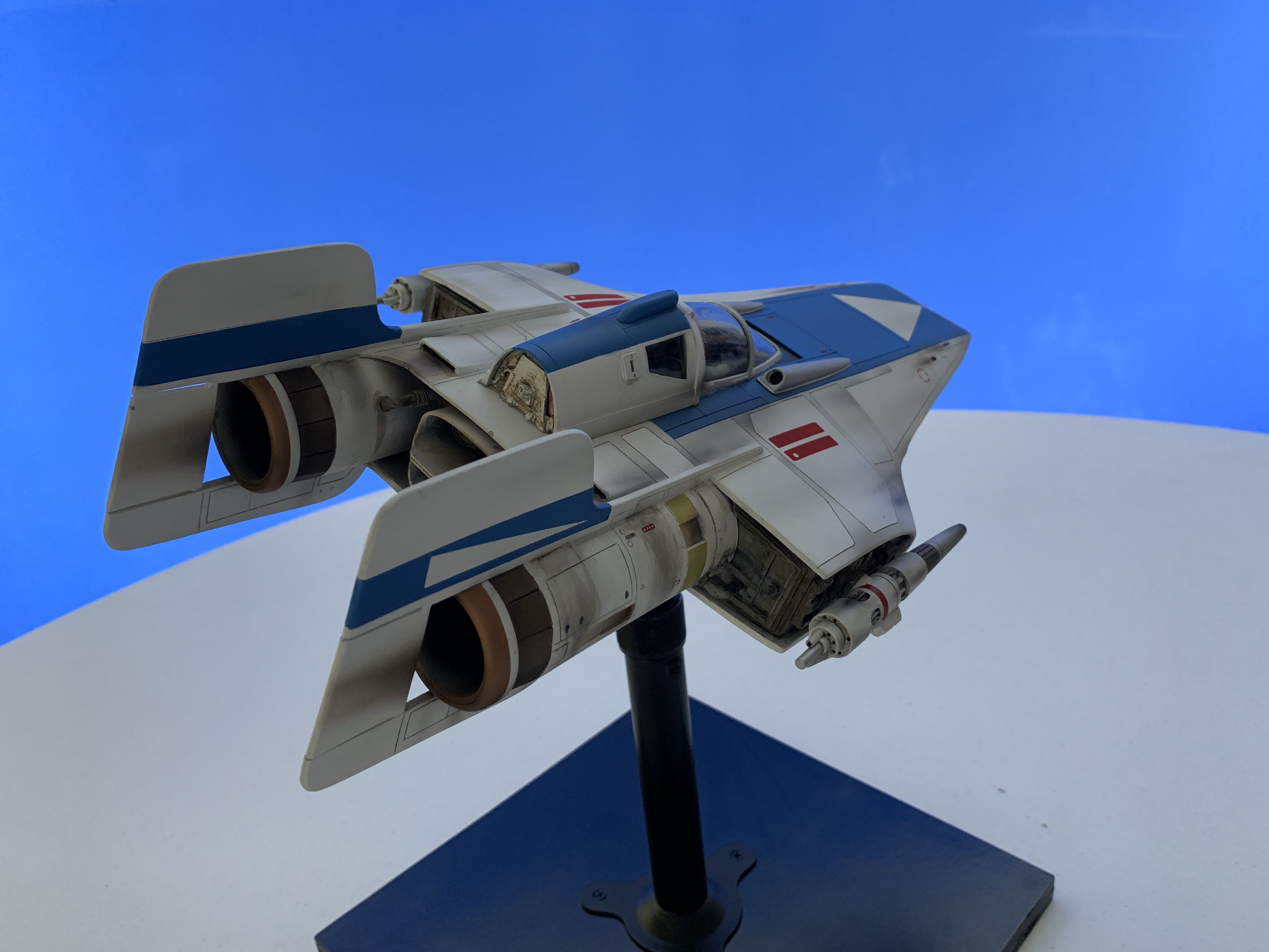 Kit Description: Originally patterned and released by artist Richard Long, (based off the original Ralph McQuarrie CONCEPT A-Wing design), KORBANTH is proud to offer this kit once again under it’s own banner. This kit comes perfectly cast up and ready to glue together. A very nice concept spacecraft. The model will arrive unpainted and un-assembled. The photos showing the Kuhn Global (Kurt Kuhn) build by artist Dan Grumeretz is an example of how it can look once completed.