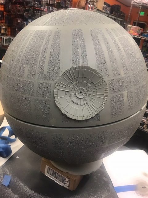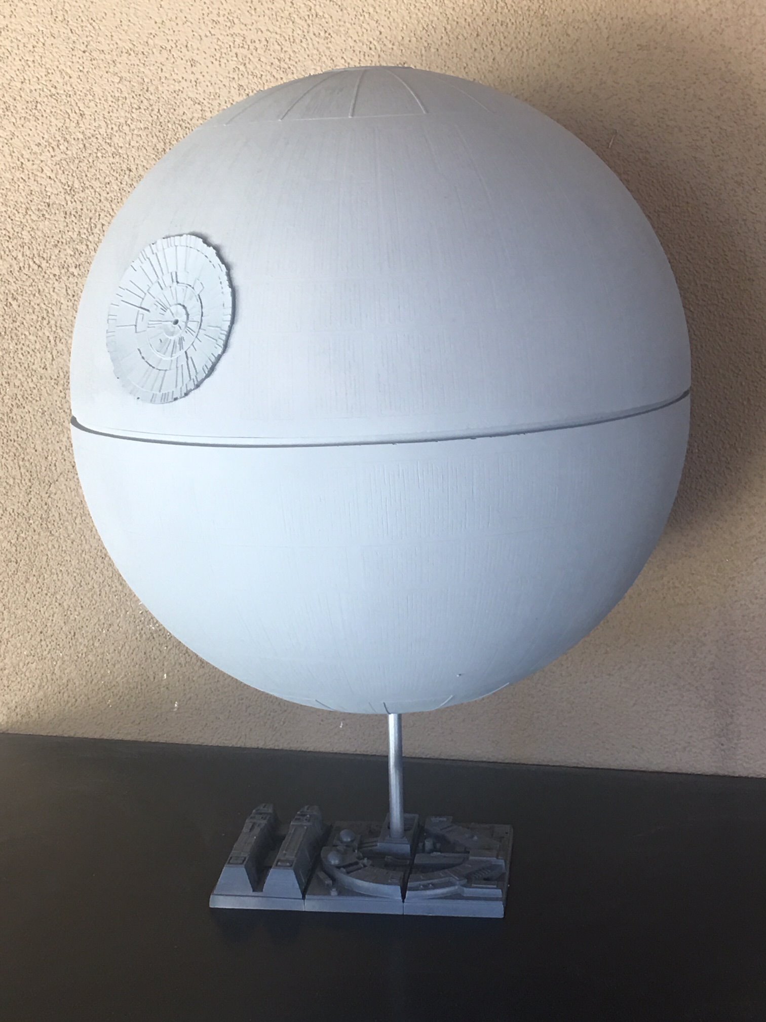 Kit Description: 18 inch diameter of the Death Star model as seen in Rogue One. It is hollow, created in a semi-translucent fiberglass resin so that a light source can be added, and the surface paint can be scratched off to allow light to shine through to recreate the amazing Death Star lighting effects. The KIT comes with a Death Star surface stand. The Space Station can also take hundreds of fiber optic wires as light up option as well. Postage is due to the over-sized box for the two sphere halves and base.