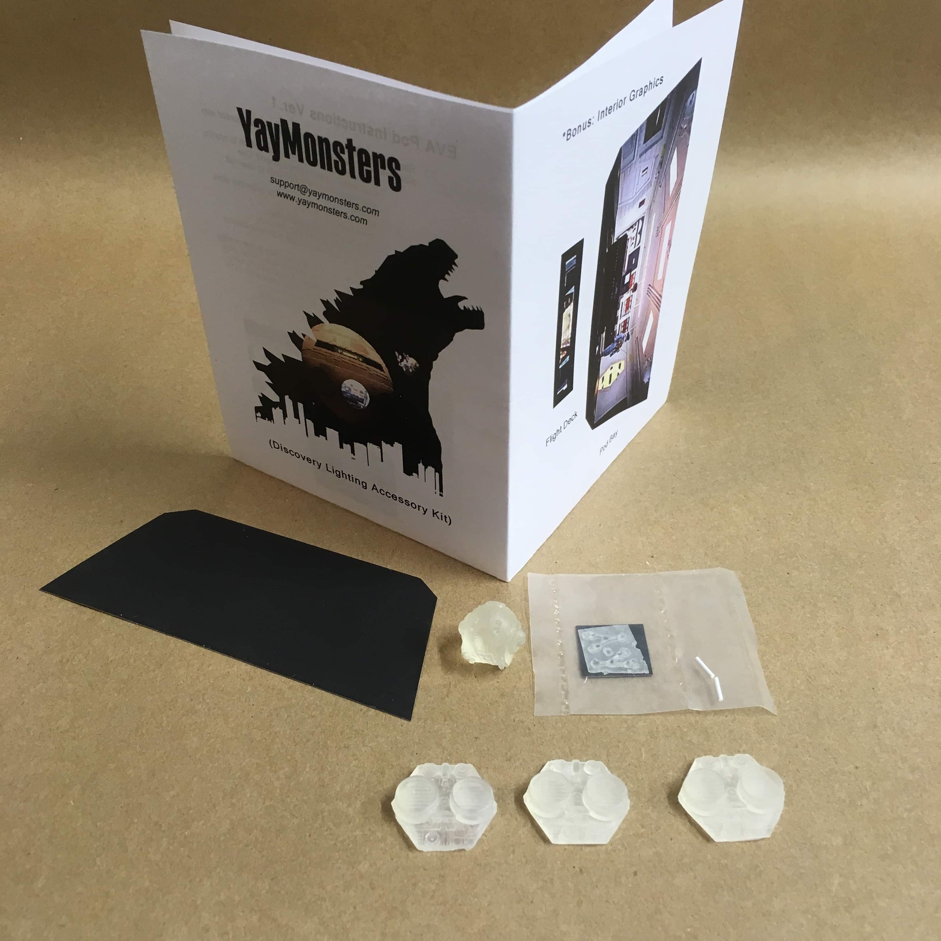 - The Yay!Monsters kit comes with mini EVA Pod in clear & clear engine covers, he includes a back lit interior graphic for the main pod & cockpit area as a bonus for the kit.