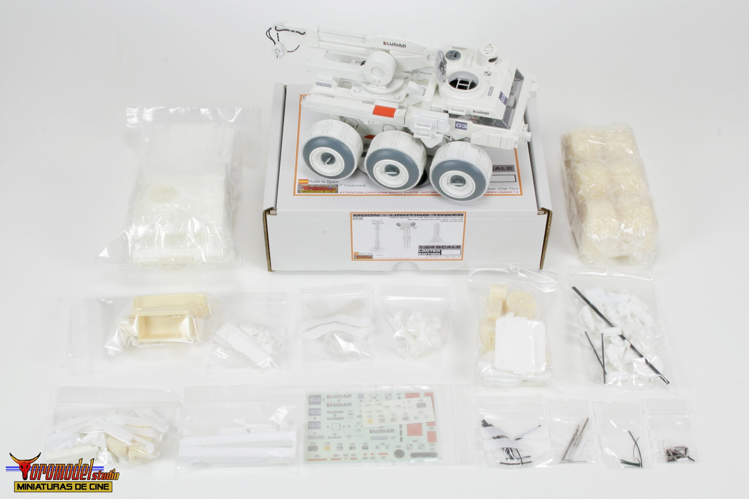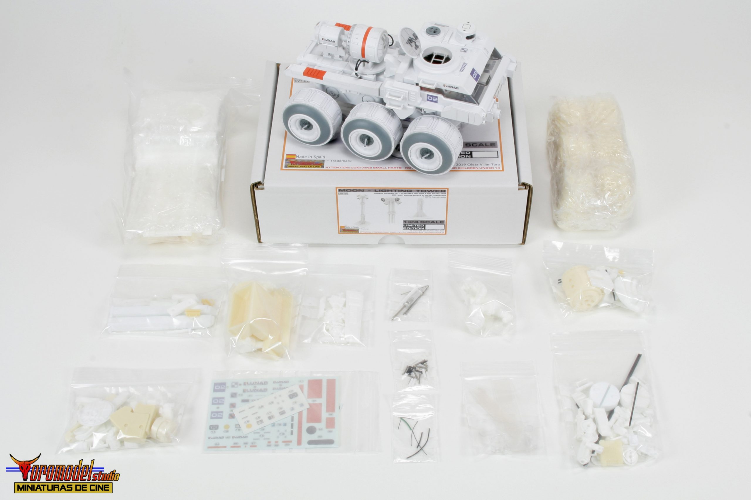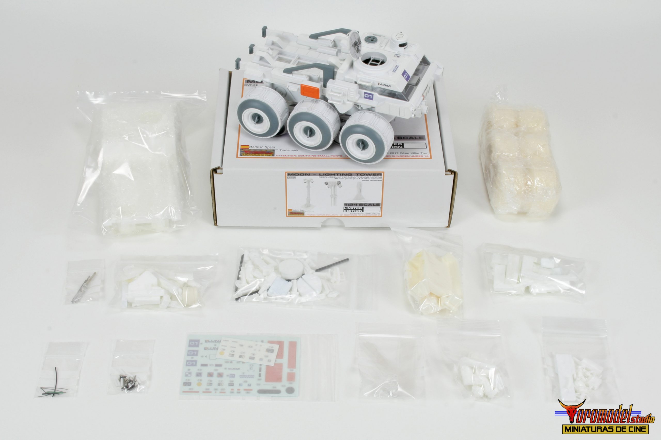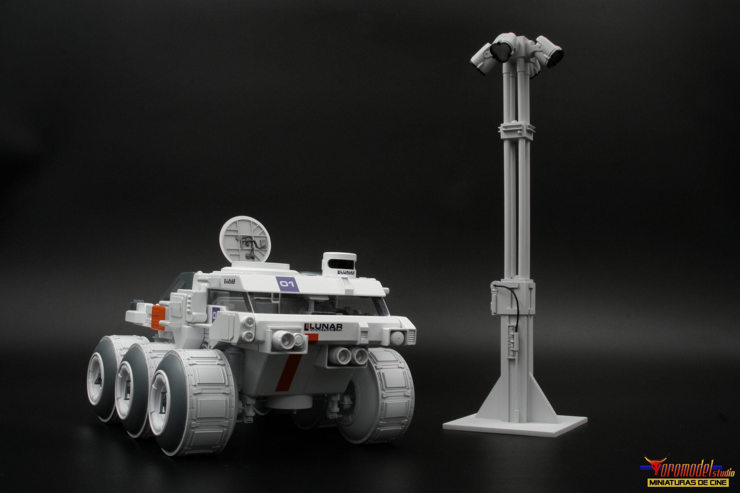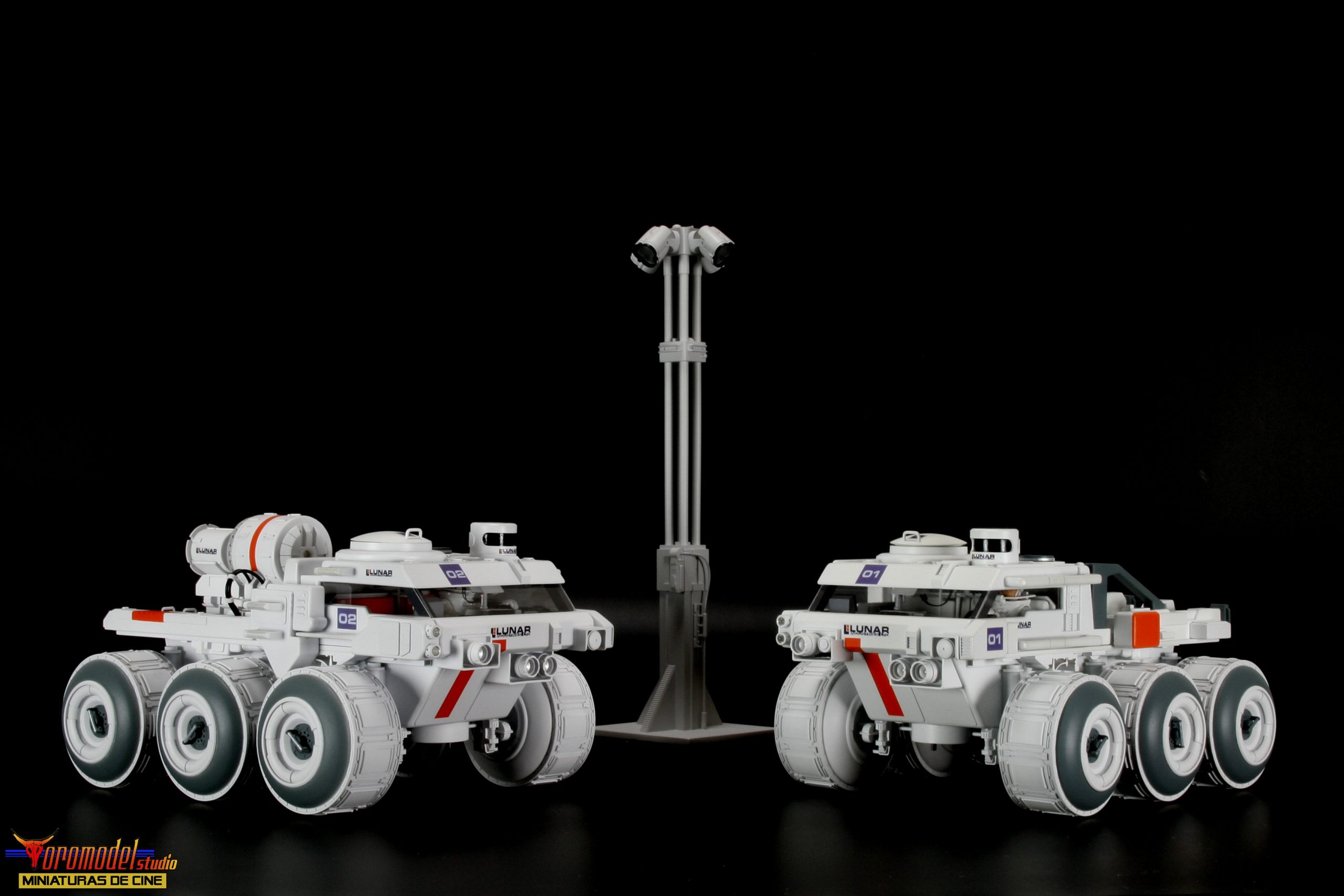 Kit Description: Coinciding with the tenth anniversary of the premiere of the acclaimed Duncan Jones MOON film and after almost 3 years of work, I present my first 100% handmade kit, a 1/24 scale replica of the lunar rover driven by the protagonist of the film Sam Bell (Sam Rockwell). What best tribute could be done to one of the best modern science fiction movies? The Rover from Lunar Industries Ltd. is available in all three versions that appear on the movie, plus a companion kit that replicates the Sarang lunar station’s exterior lighting towers. The models are an accurate and meticulous reproduction of the 1/12 scale miniatures that their magnificent team of artists built for the movie.