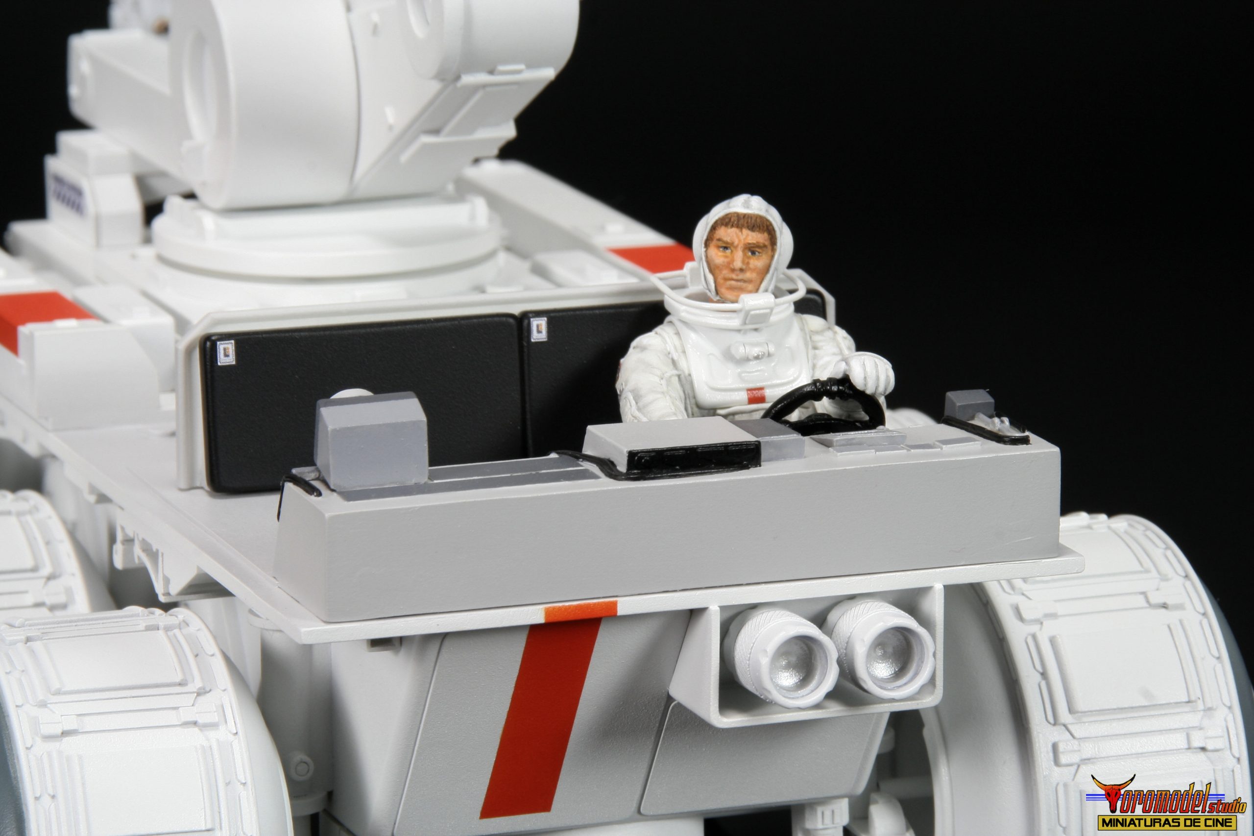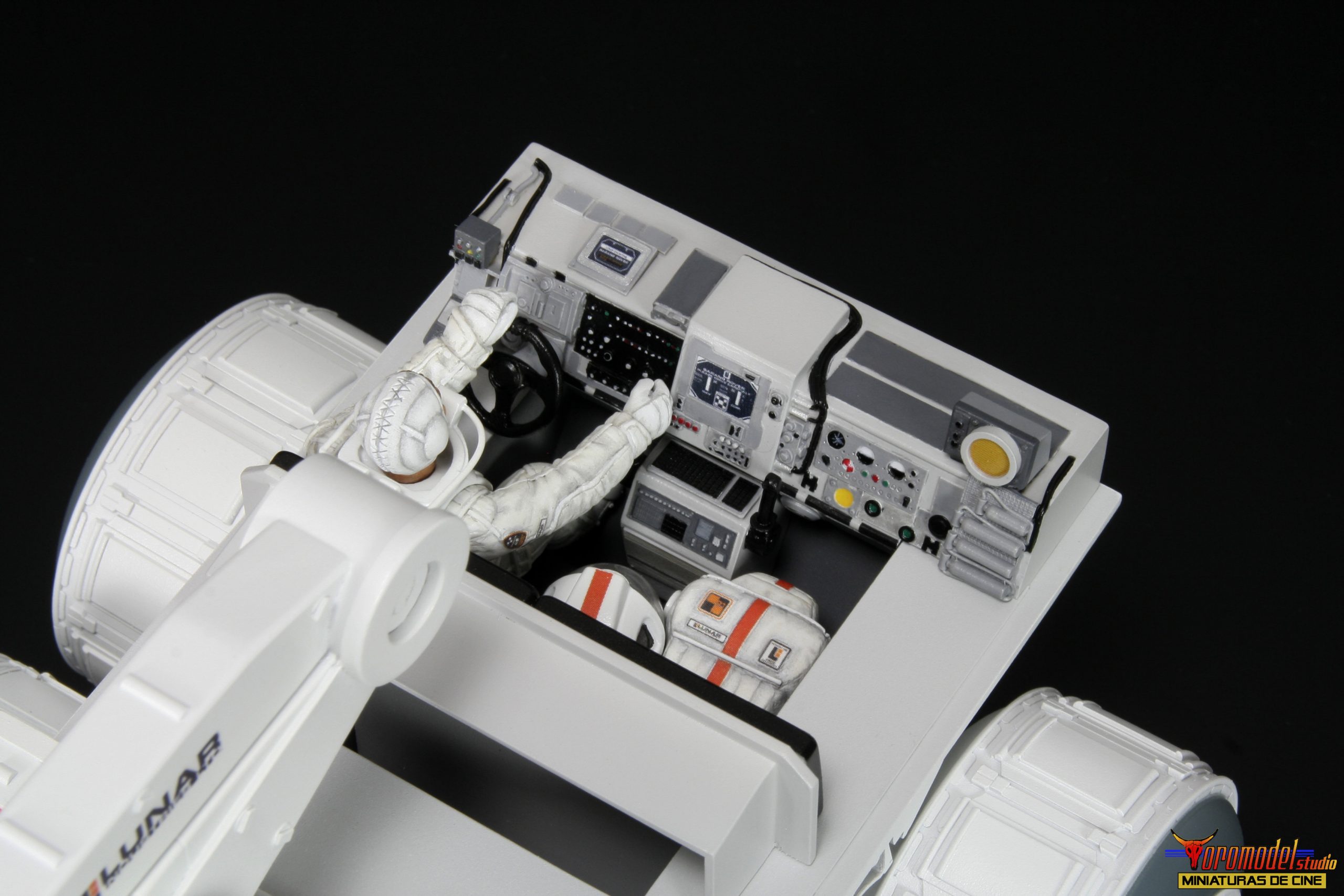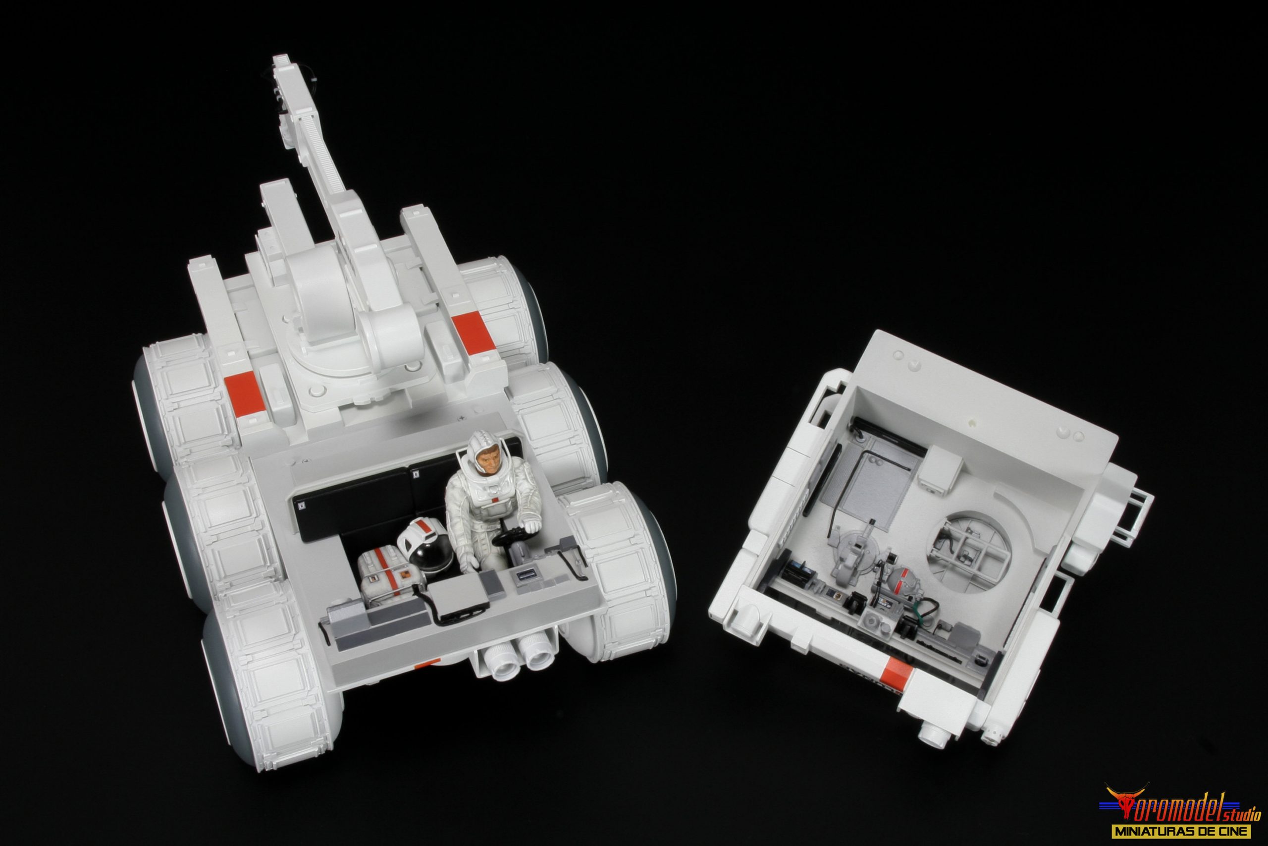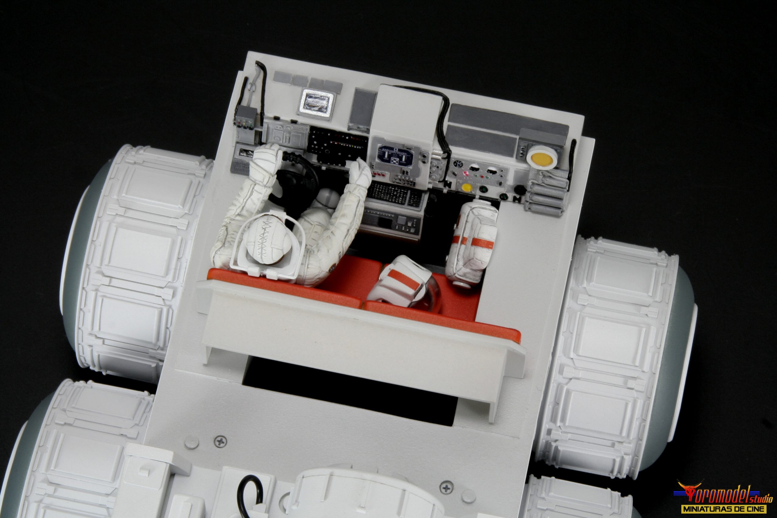 The Rover kit is made up of more than 100 pieces cast in premium quality White Smooth-On resin * except the wheels, which where made of resin from other brands, as well as extra pieces of different materials to complete the assembly. The cockpit is a thorough reproduction of the scenery used in the film, adapted to fit perfectly into the dimensions of the kit, and includes the figure of the main character with his complete equipment of astronaut. There is the option to request the instrument panel of the vehicle in clear resin for a small extra price, designed for those who want to install a lighting circuit (only one of the two pieces will be included).