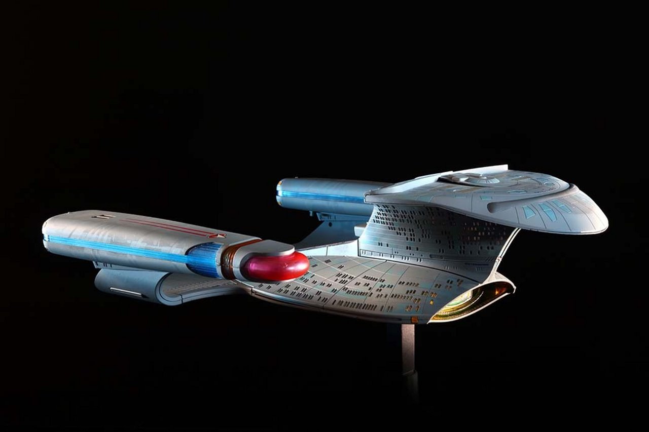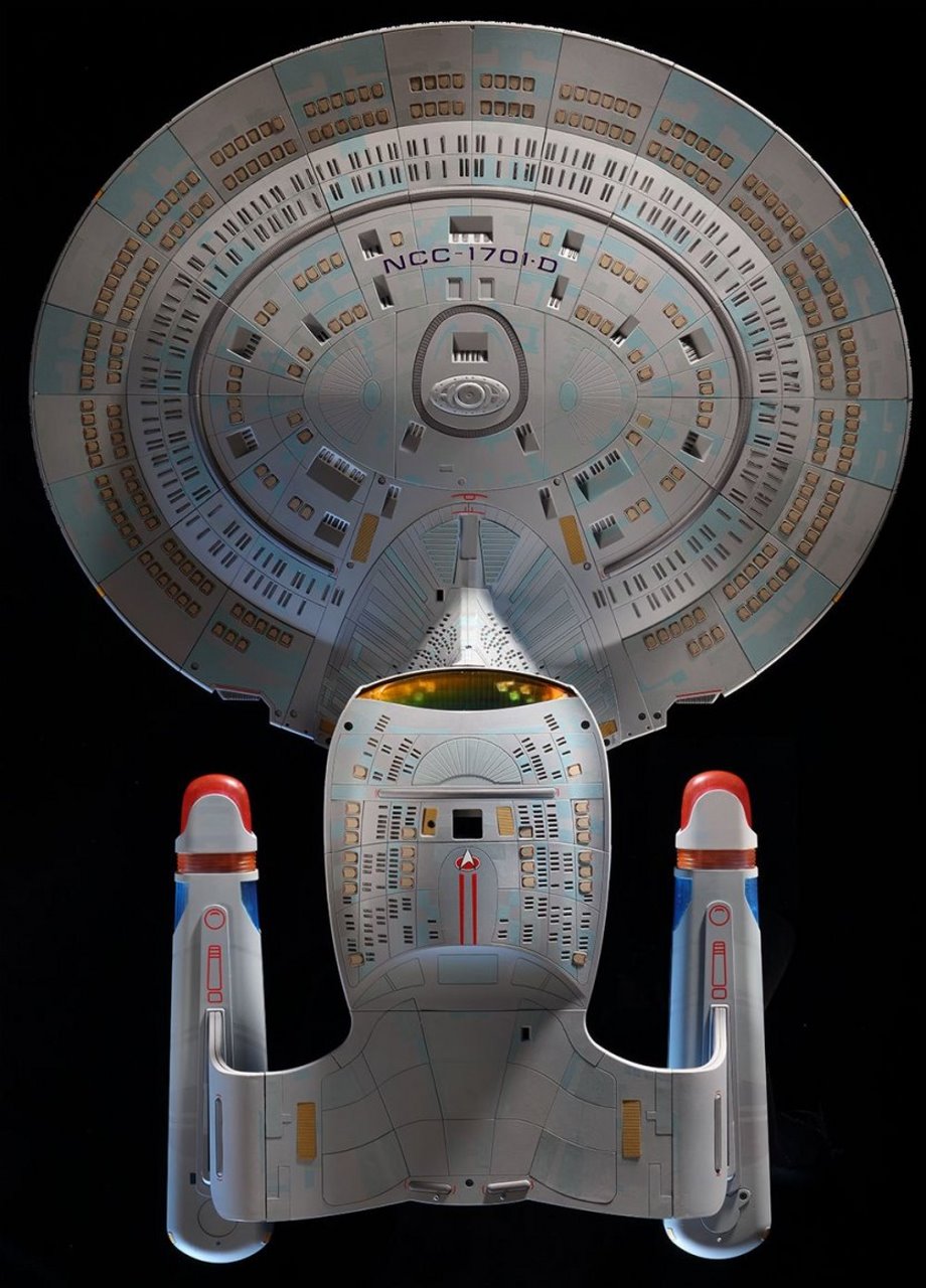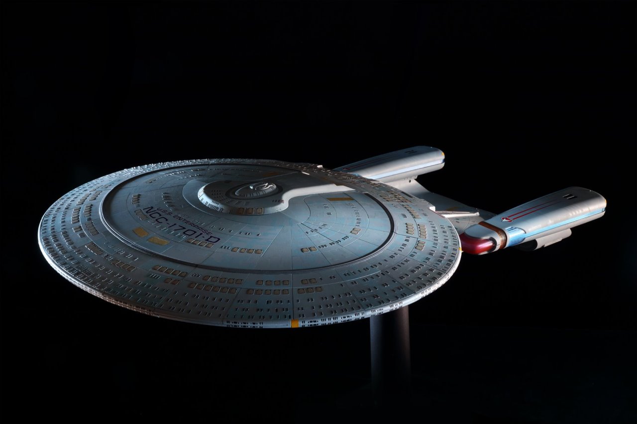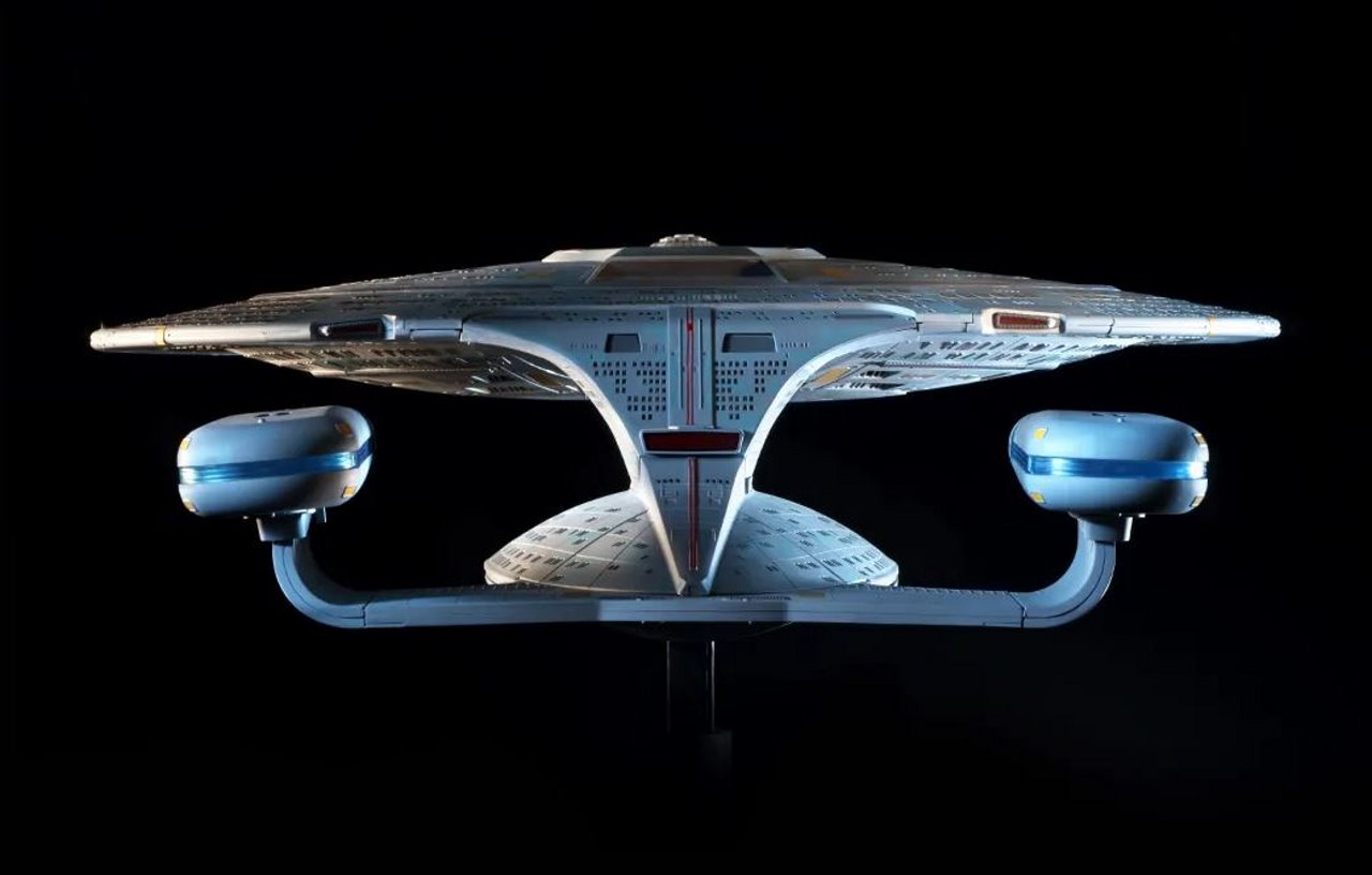 Based on a careful study of the different studio models used in filming, the model replicates every last detail of the U.S.S. Enterprise-D, from its phaser strips and RCS thrusters to the Captain’s yacht, including:
