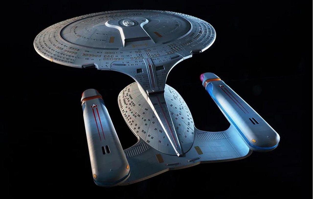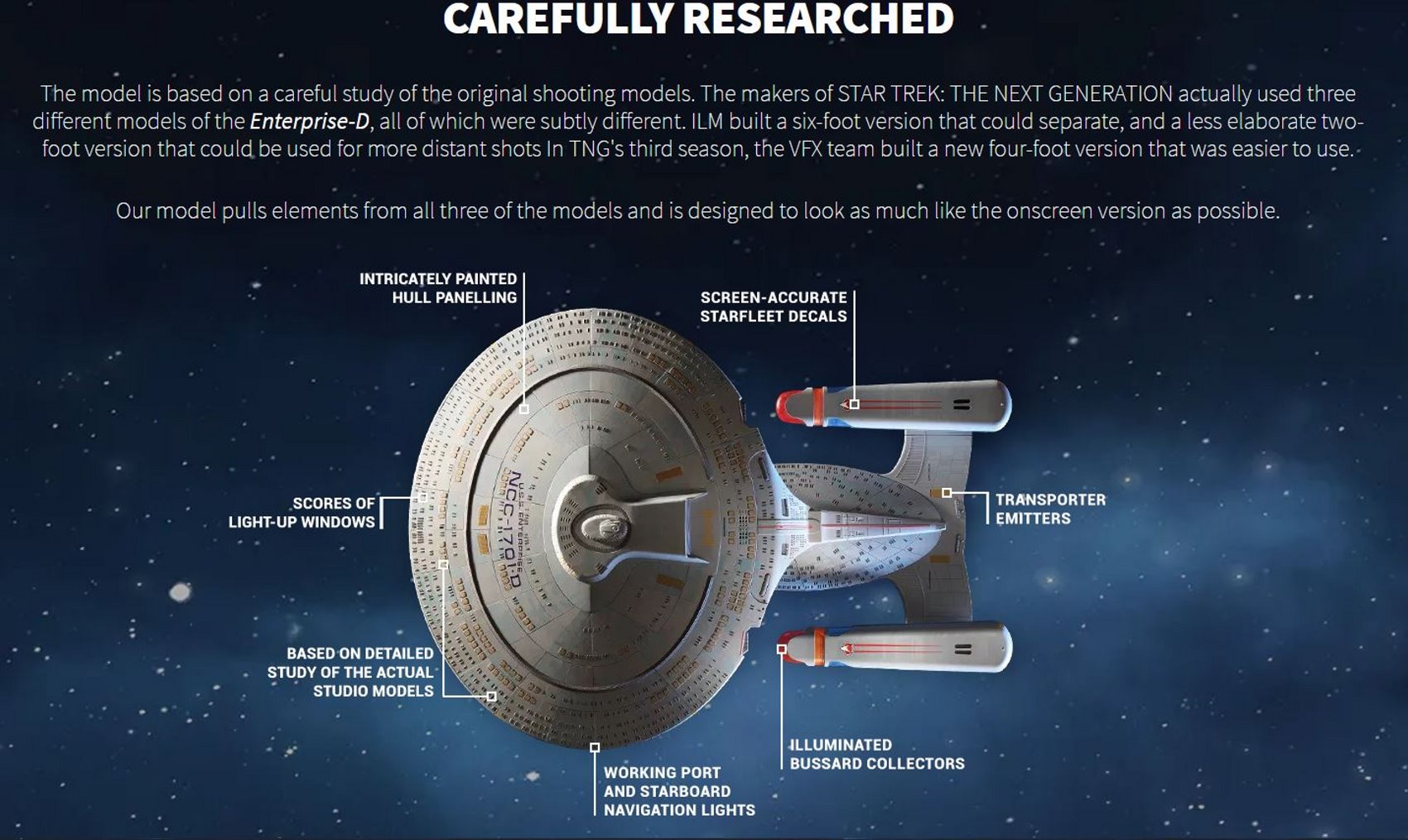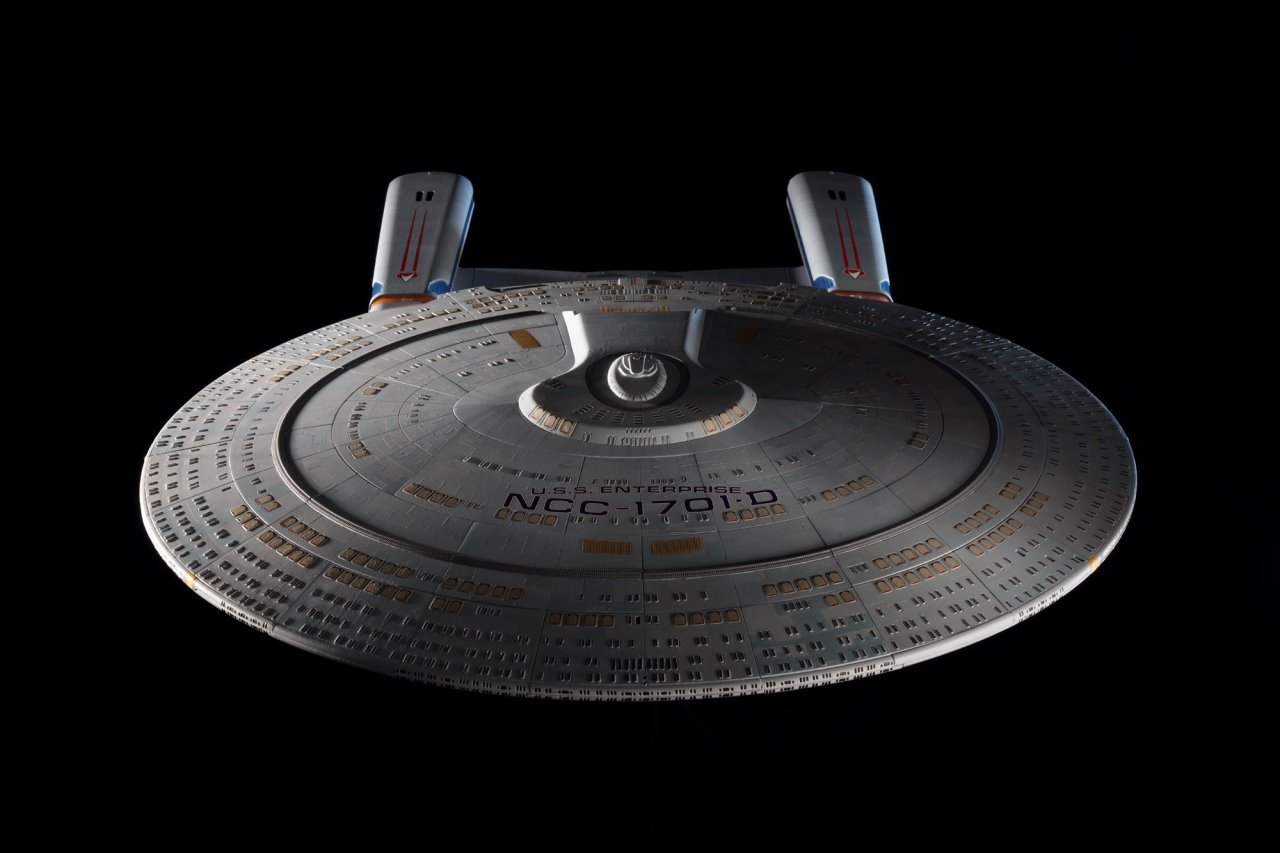 Based on a careful study of the different studio models used in filming, the model replicates every last detail of the U.S.S. Enterprise-D, from its phaser strips and RCS thrusters to the Captain’s yacht, including: