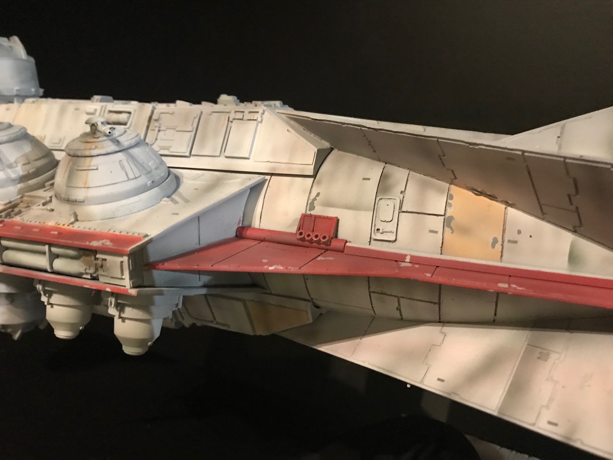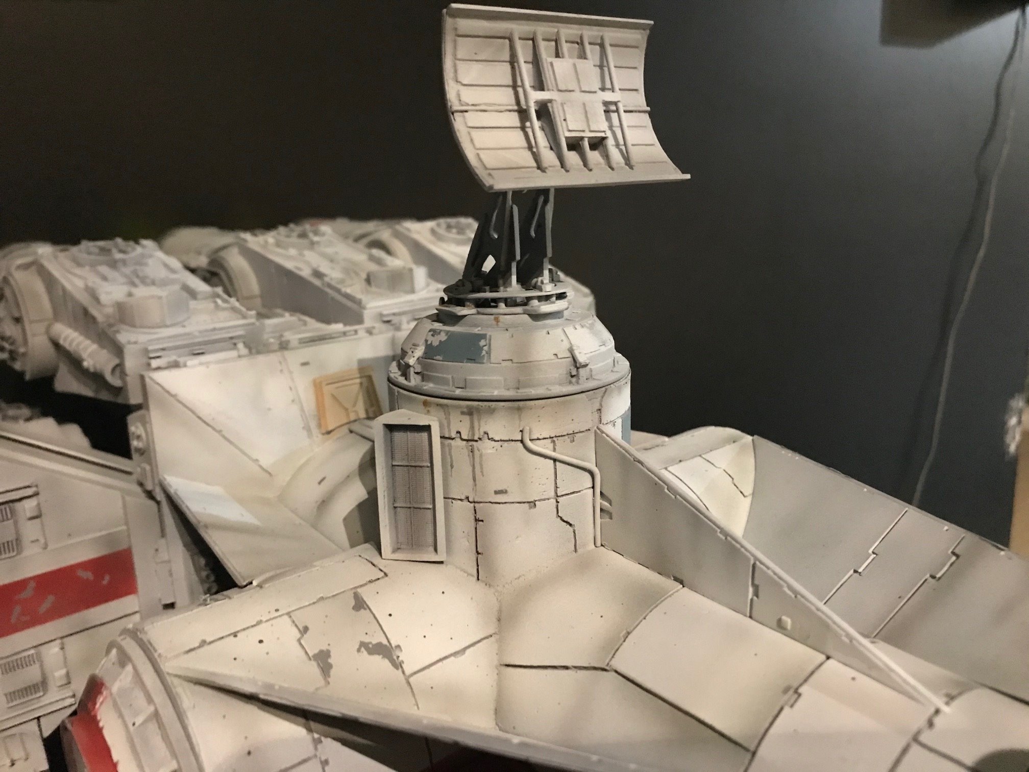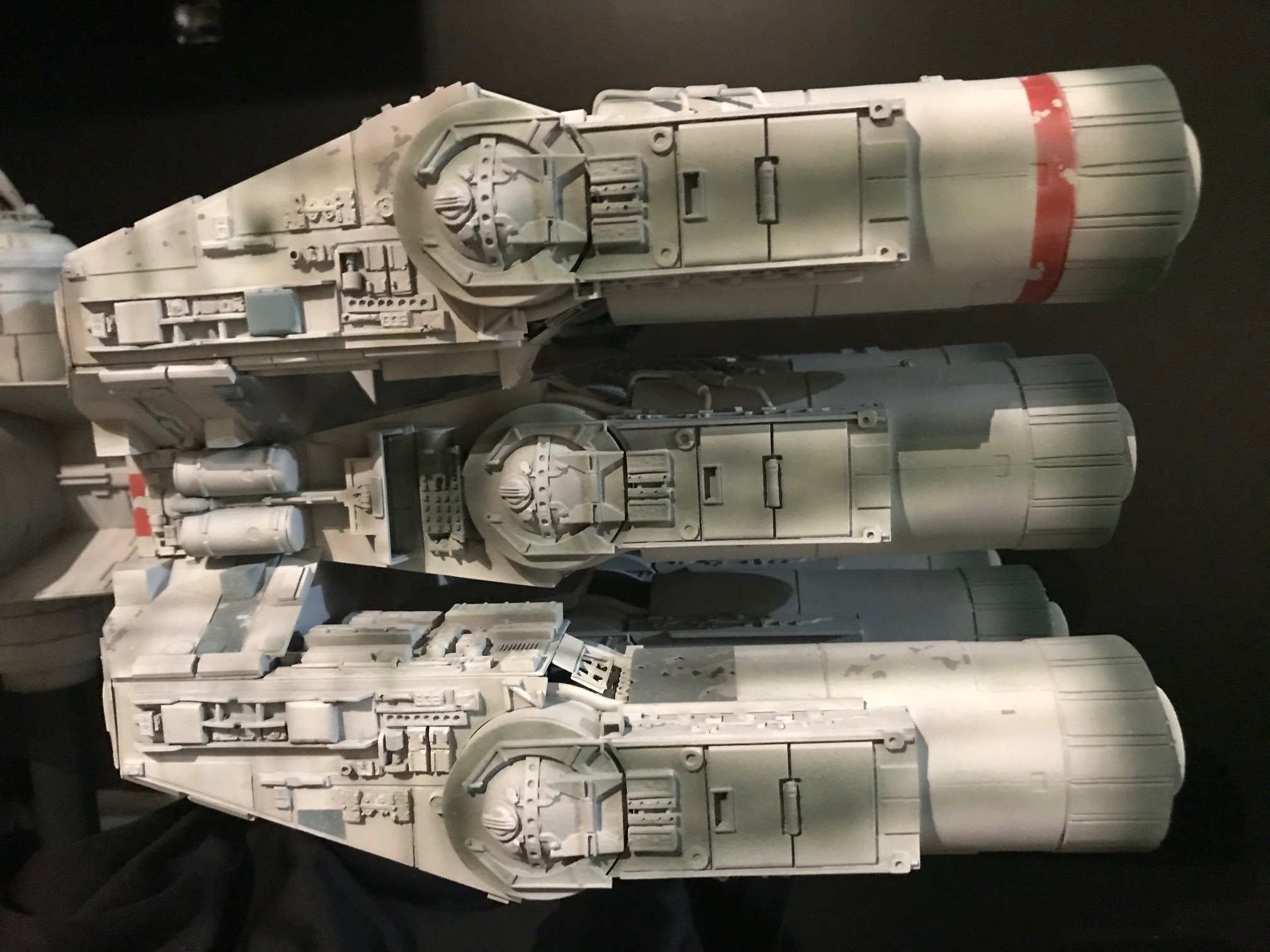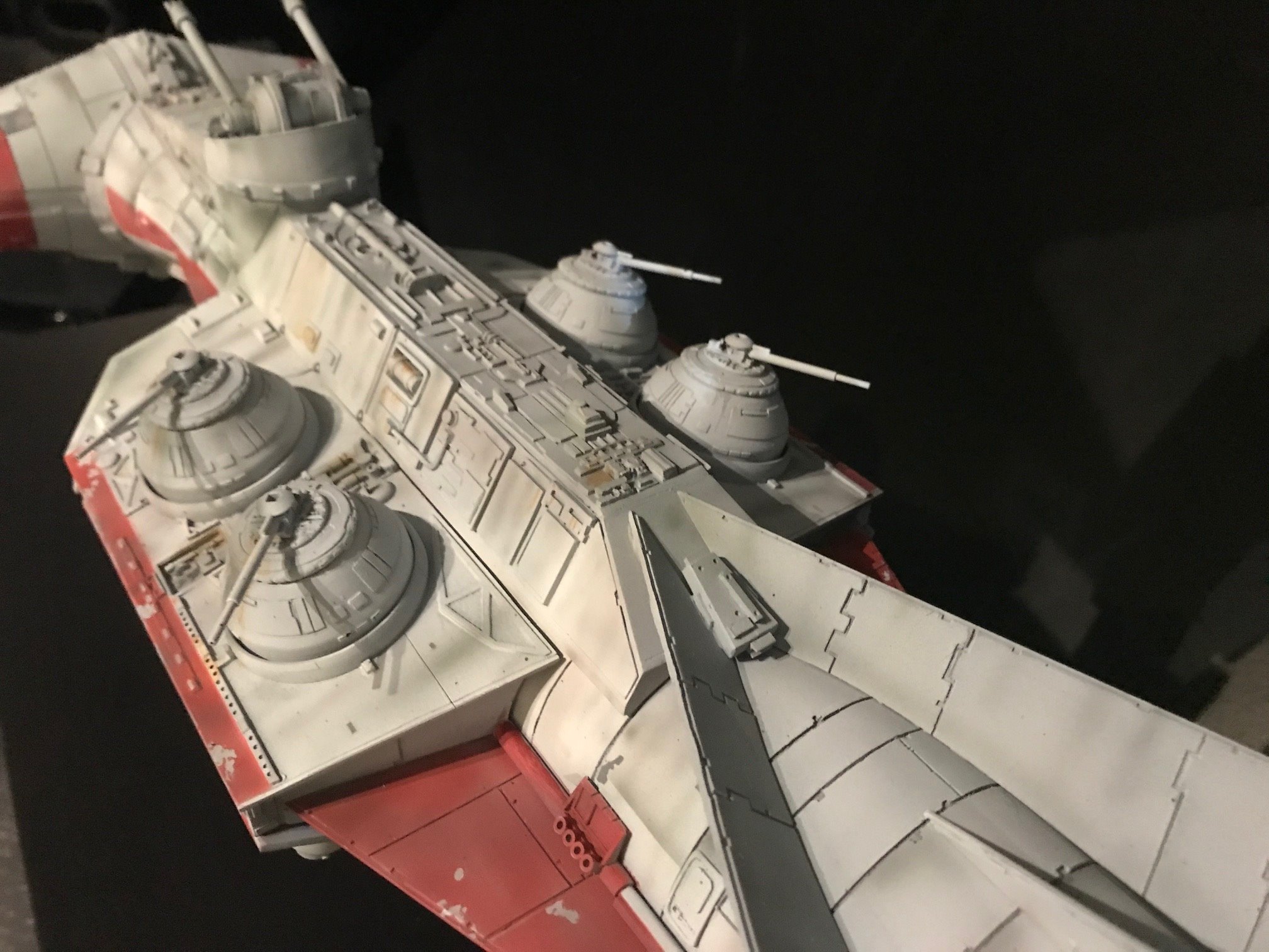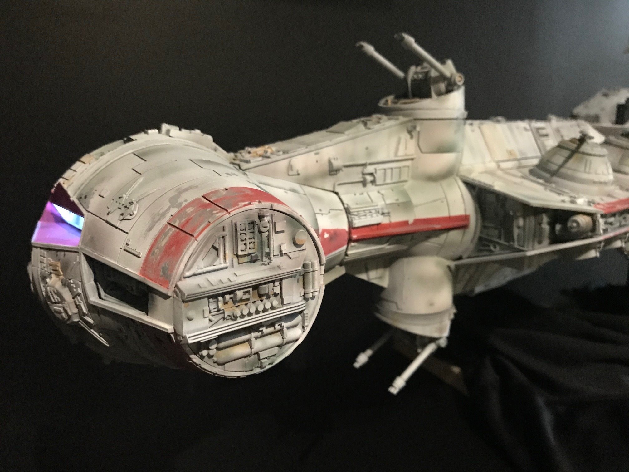 Here is the Korbanth Blockade Runner I put together. I’ve added tons of small extra piping and greeblies to get a more screen accurate version. Extra piping in the upper/lower guns, added more tips to the barrels, as well as the engines have extra parts added like the original. It’s all lit up with a scratch built cockpit and also added the centerfold poster as well as a Star Wars vintage poster like the original and is powered by a 12V outlet fed out the center of the mount. All the guns and radar dish are mounted using magnets to allow for re-positioning. Painted using Mission Models paints. This is a huge, heavy, awesome beast.