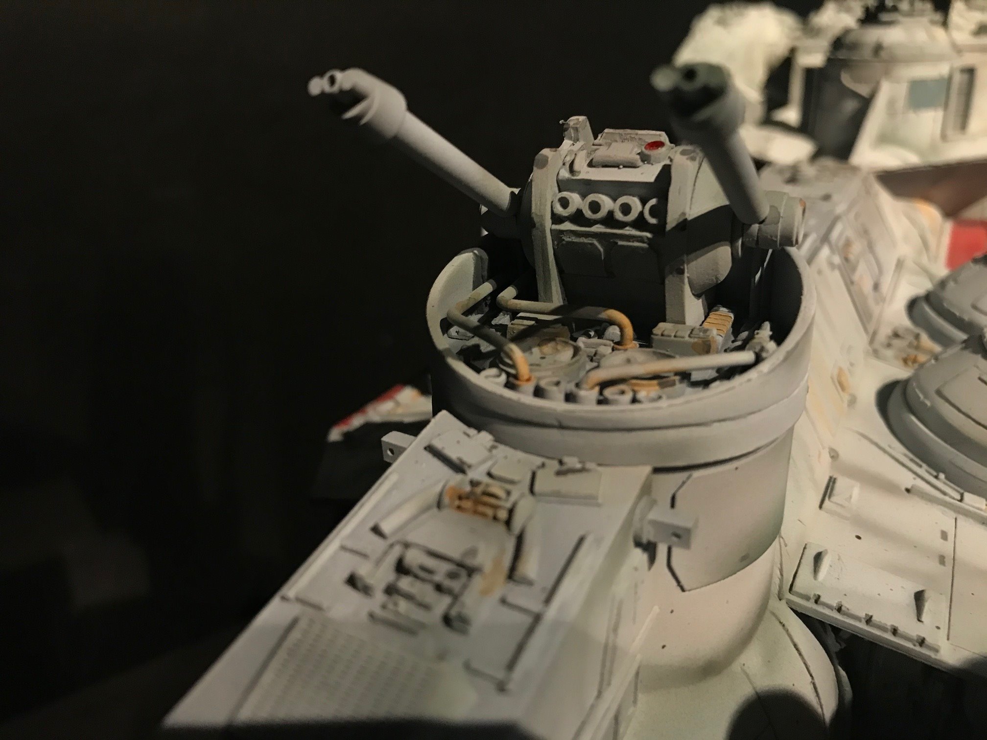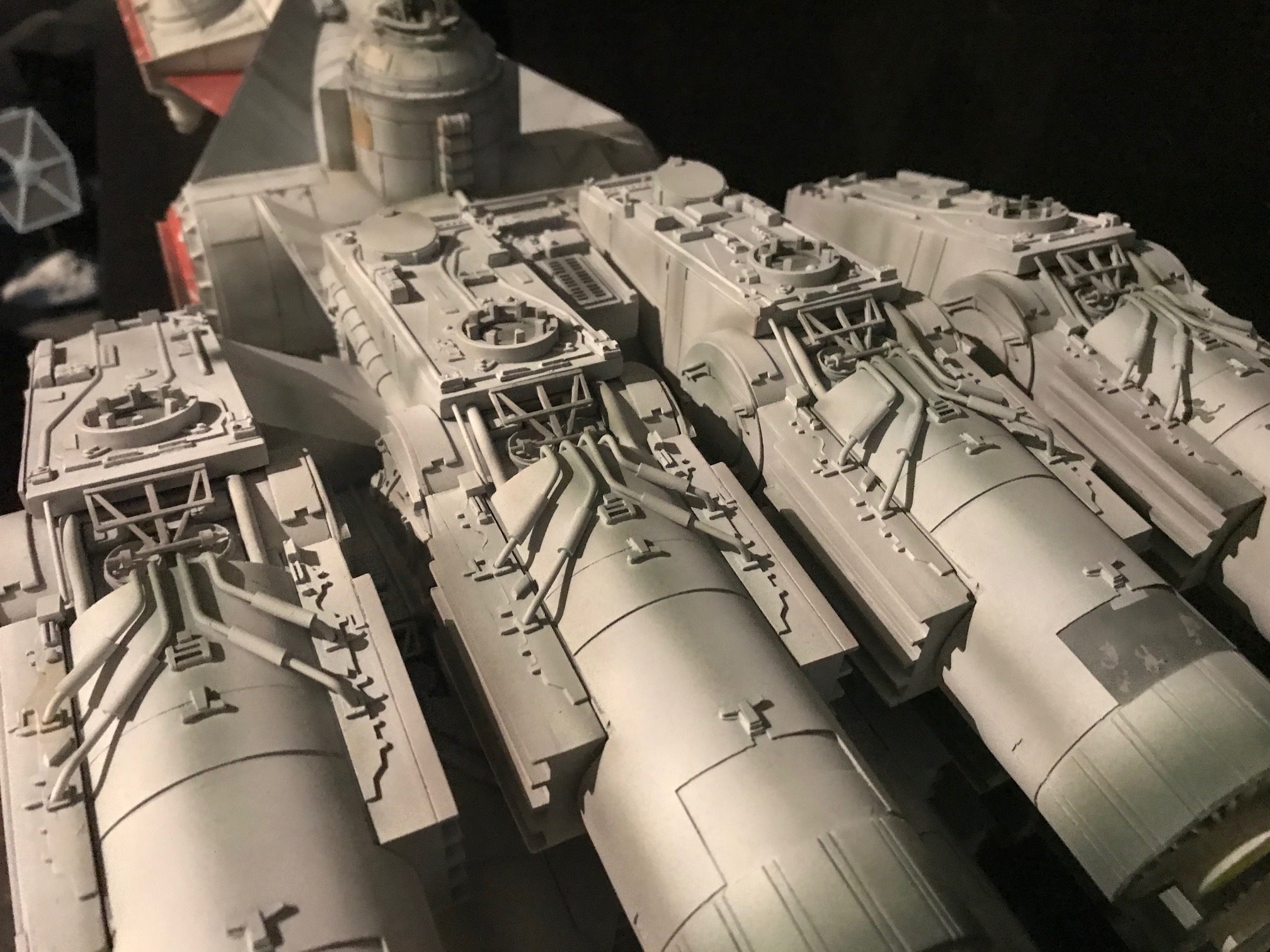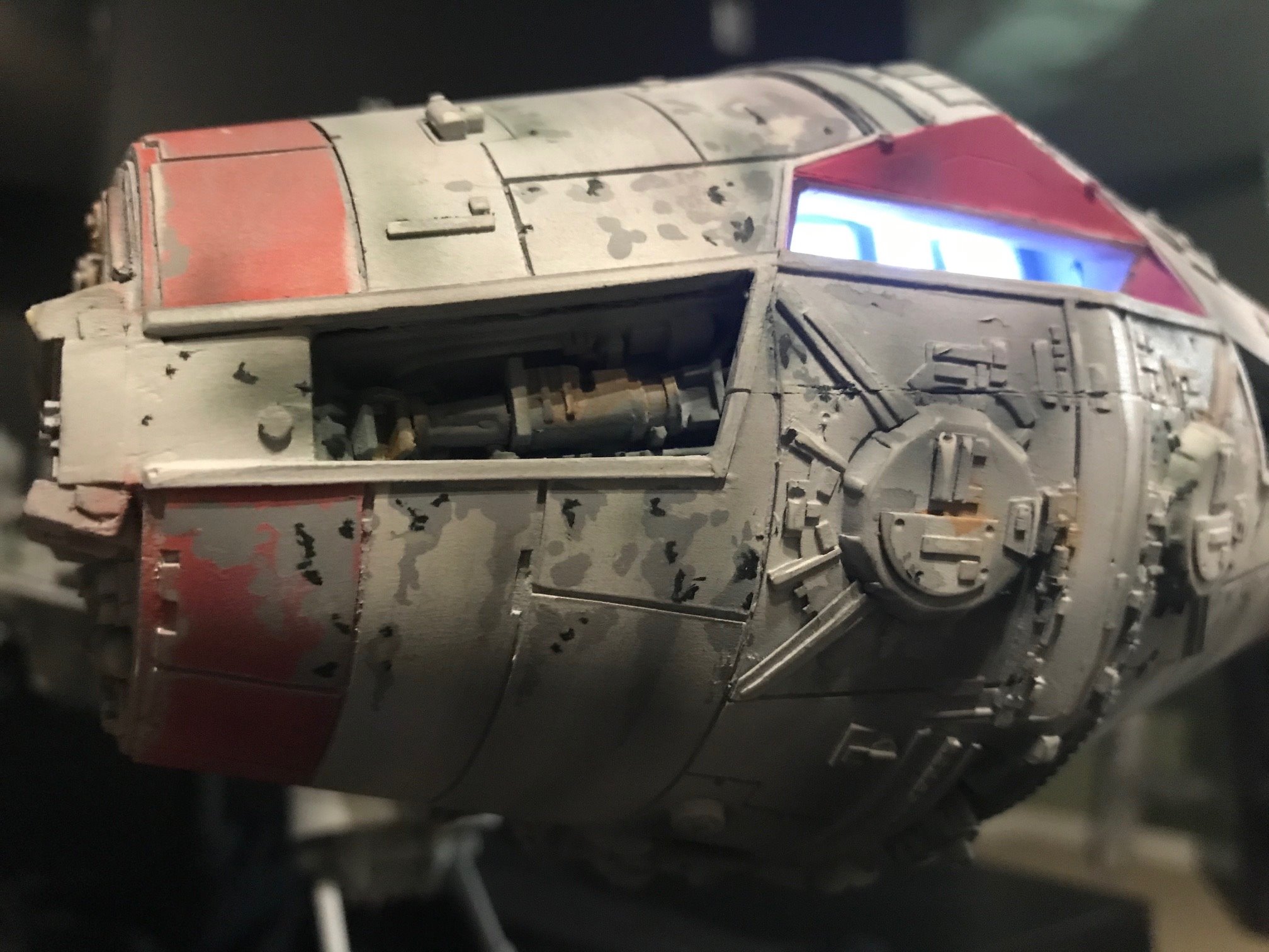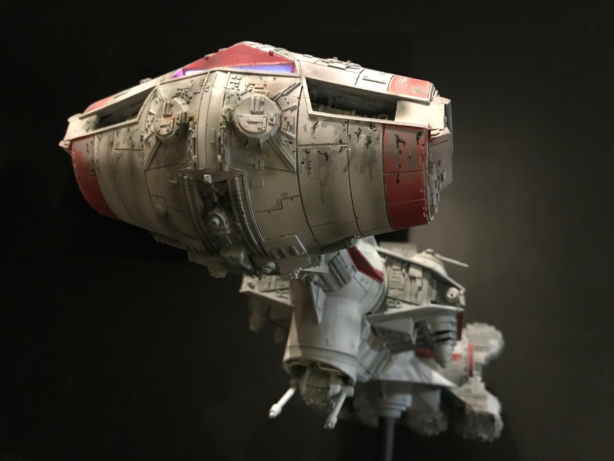 Here is the Korbanth Blockade Runner I put together. I’ve added tons of small extra piping and greeblies to get a more screen accurate version. Extra piping in the upper/lower guns, added more tips to the barrels, as well as the engines have extra parts added like the original. It’s all lit up with a scratch built cockpit and also added the centerfold poster as well as a Star Wars vintage poster like the original and is powered by a 12V outlet fed out the center of the mount. All the guns and radar dish are mounted using magnets to allow for re-positioning. Painted using Mission Models paints. This is a huge, heavy, awesome beast.