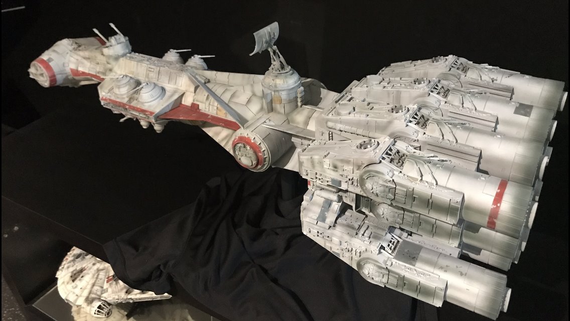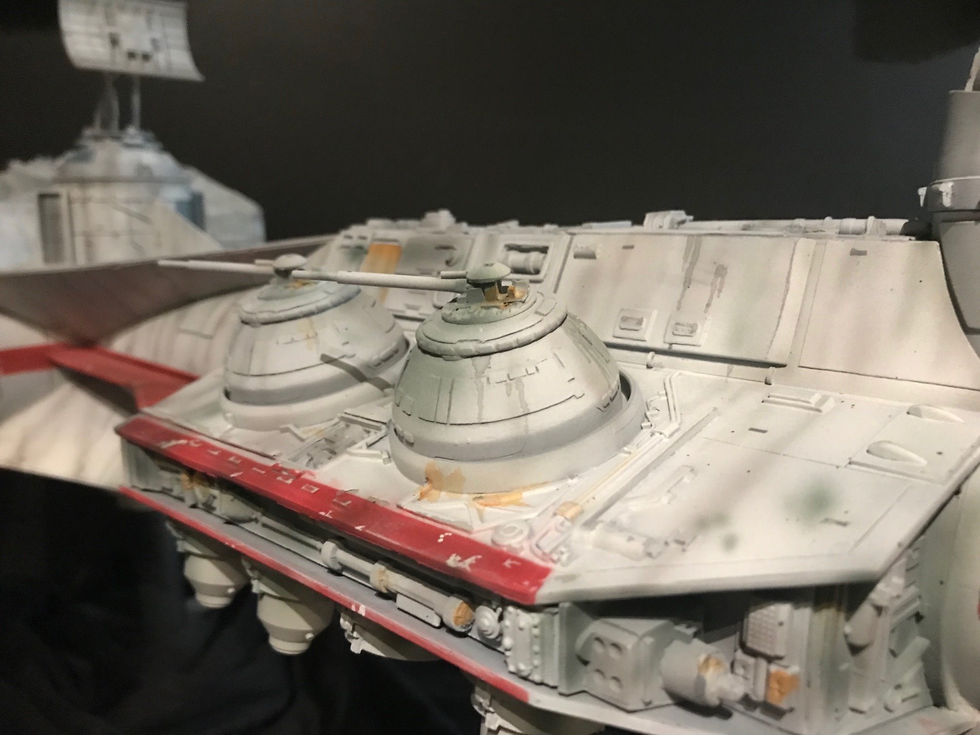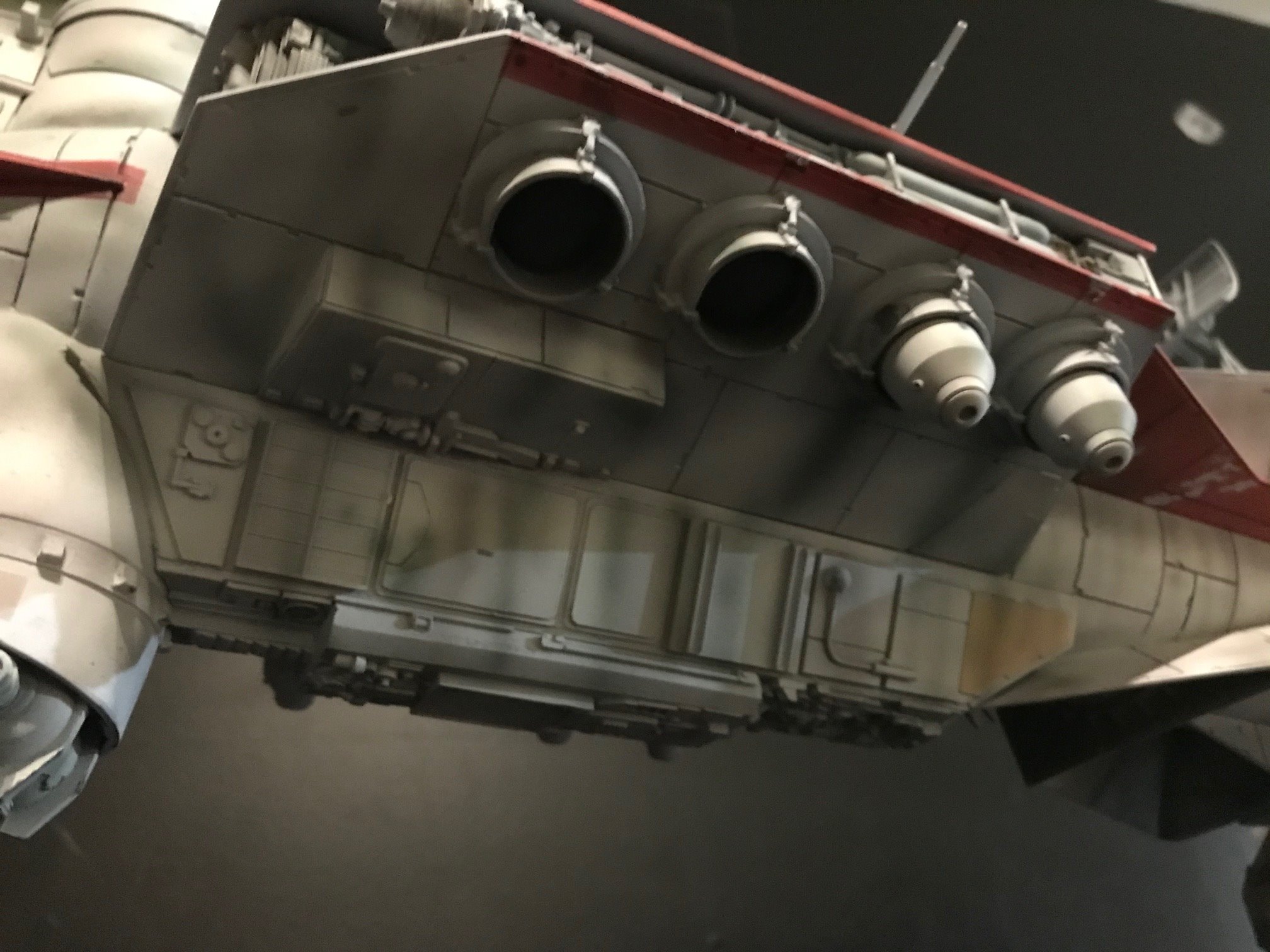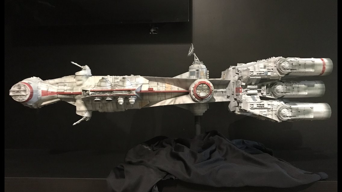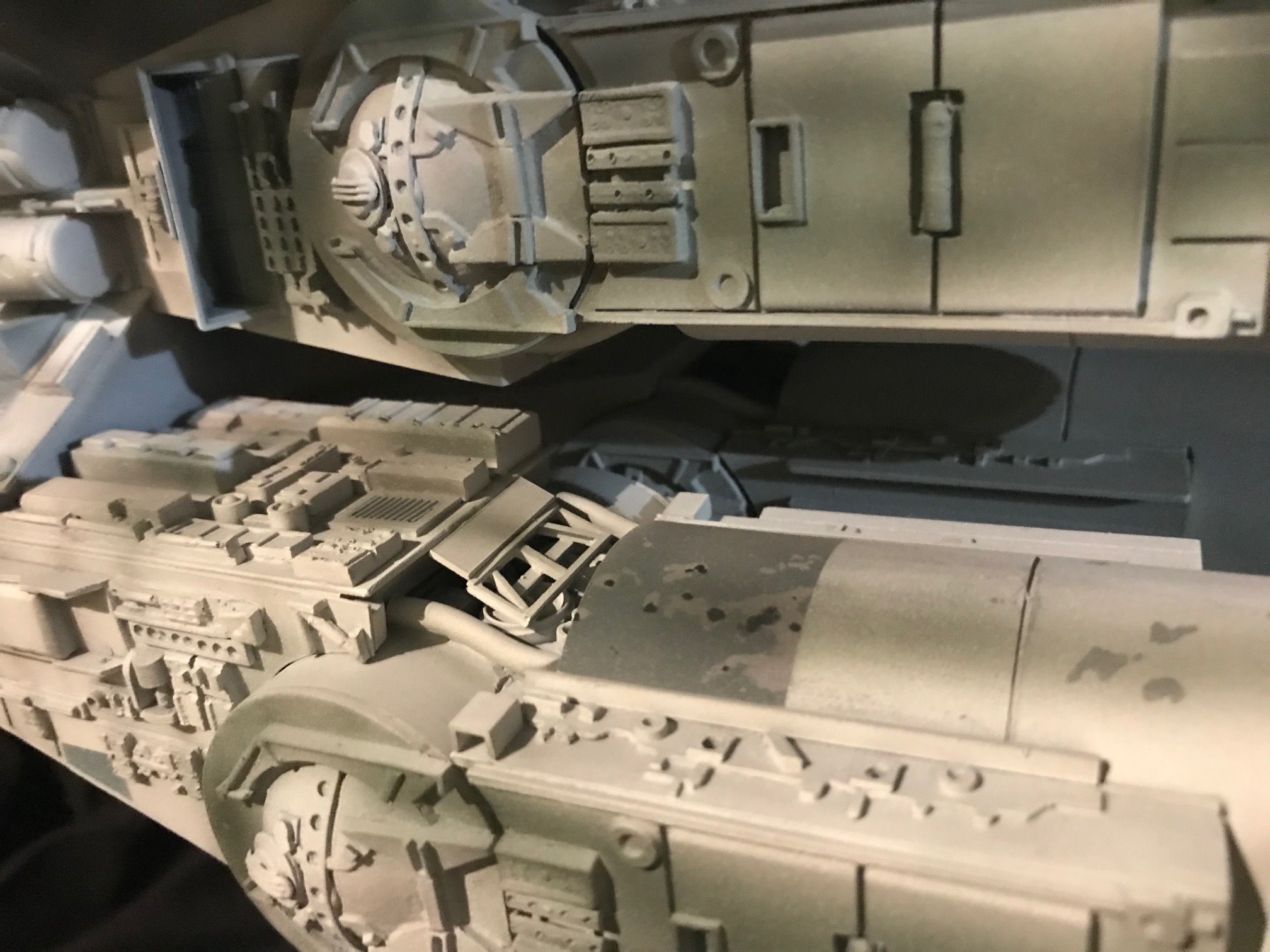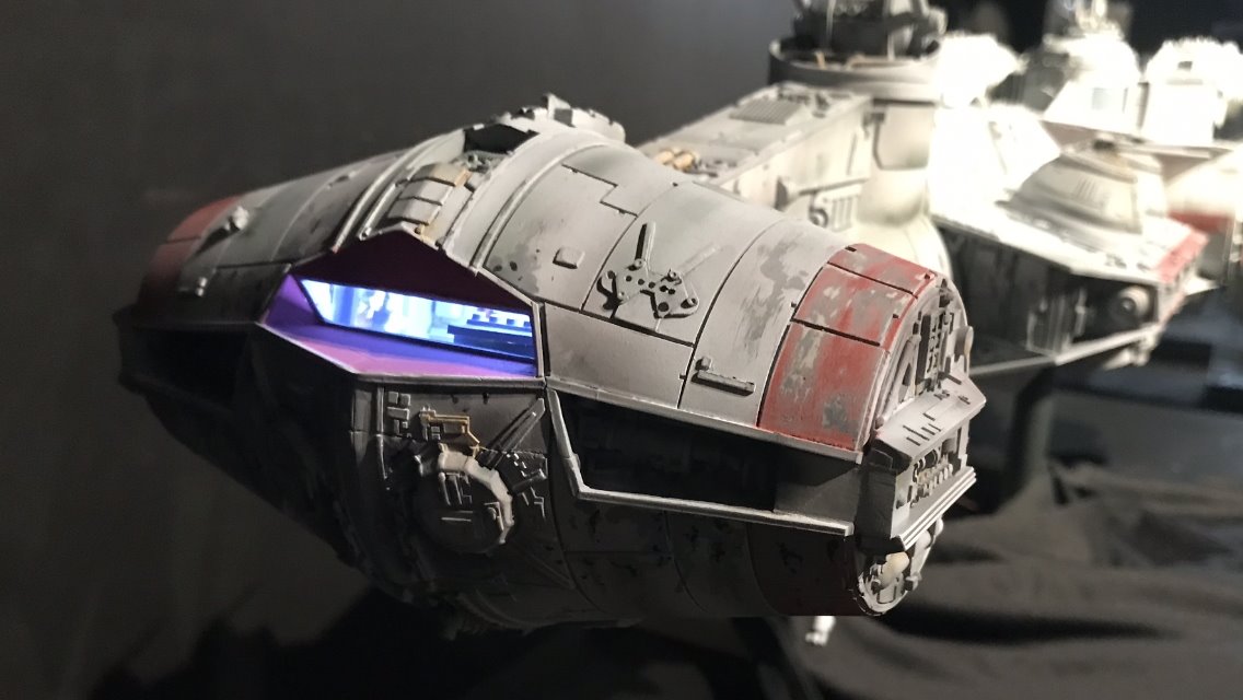 Here is the Korbanth Blockade Runner I put together. I’ve added tons of small extra piping and greeblies to get a more screen accurate version. Extra piping in the upper/lower guns, added more tips to the barrels, as well as the engines have extra parts added like the original. It’s all lit up with a scratch built cockpit and also added the centerfold poster as well as a Star Wars vintage poster like the original and is powered by a 12V outlet fed out the center of the mount. All the guns and radar dish are mounted using magnets to allow for re-positioning. Painted using Mission Models paints. This is a huge, heavy, awesome beast.