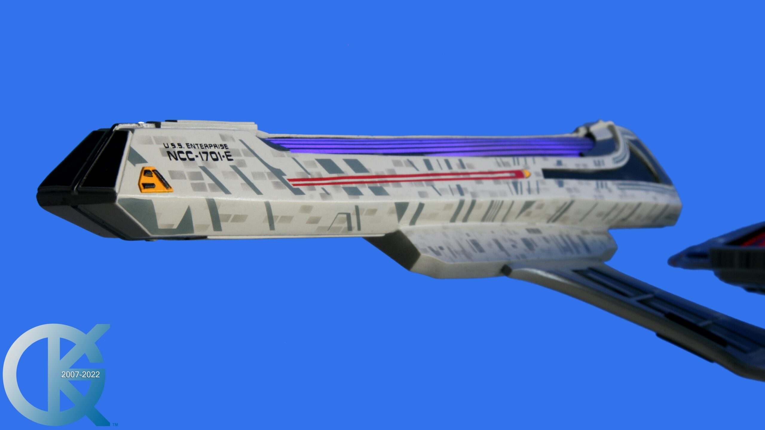 Nearly 15 years later from it’s original build, now being April 2022, this model has now reached it’s pinnacle. Dan Grumeretz has done amazing work with his replication of the USS Enterprise 1701-E as Albert Siow wanted it to be seen. This all new build, made from Cast #001, is seen here in my Blue Screen Photos. What I wish I had captured as well is the amazing lighting and sound effects that are now included in this model… which I refer to as “Incarnation #004”. Perhaps Albert and Dan will make an additional posting on Modelers Miniatures & Magic to show those amazing features in the future,.. as they are stunning! No pun intended. lol. I mean ‘stunning’ literally as the phaser strips work as if they are firing. Then there are the nacelle effects of going to warp! And in addition are not only Photon Torpedo firing effects, but also Quantum Torpedo firing effects! This piece is fully loaded, enabled by the fantastic products of Starling Technologies… Stanley Koziol. I also love the fact that Dan included the Shuttle design, from Star Trek: Insurrection, to be inside the open, and lit, main Shuttle Bay on the rear of the Saucer section. If you look closely at it, you will notice that the Nacelles of the Shuttle are actually lit! The beautiful paint job is amazing… and everything, with the exception of the lifeboat numbering, is PAINTED ON!! Dan did amazing work on this piece. OUTSTANDING!!