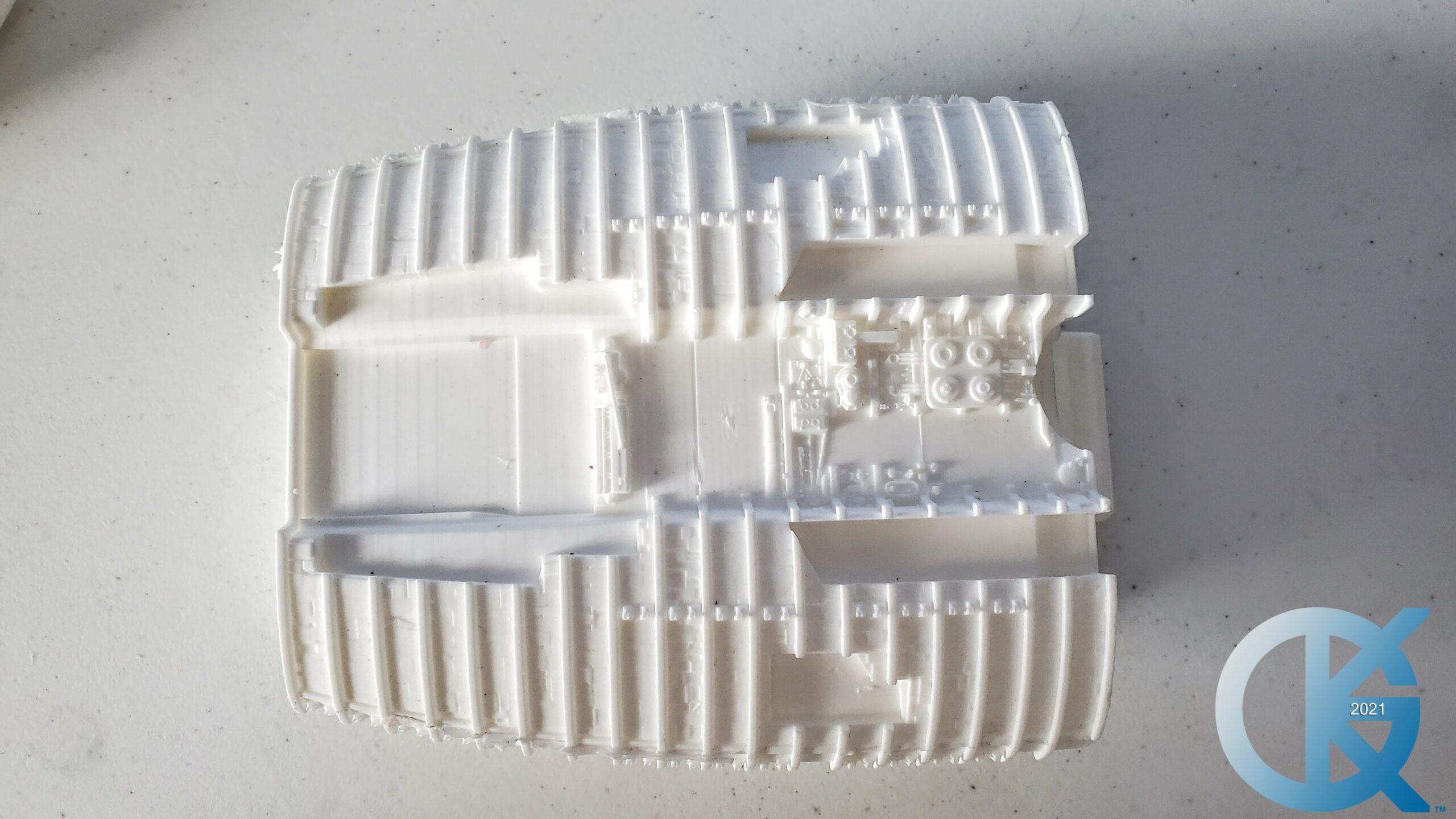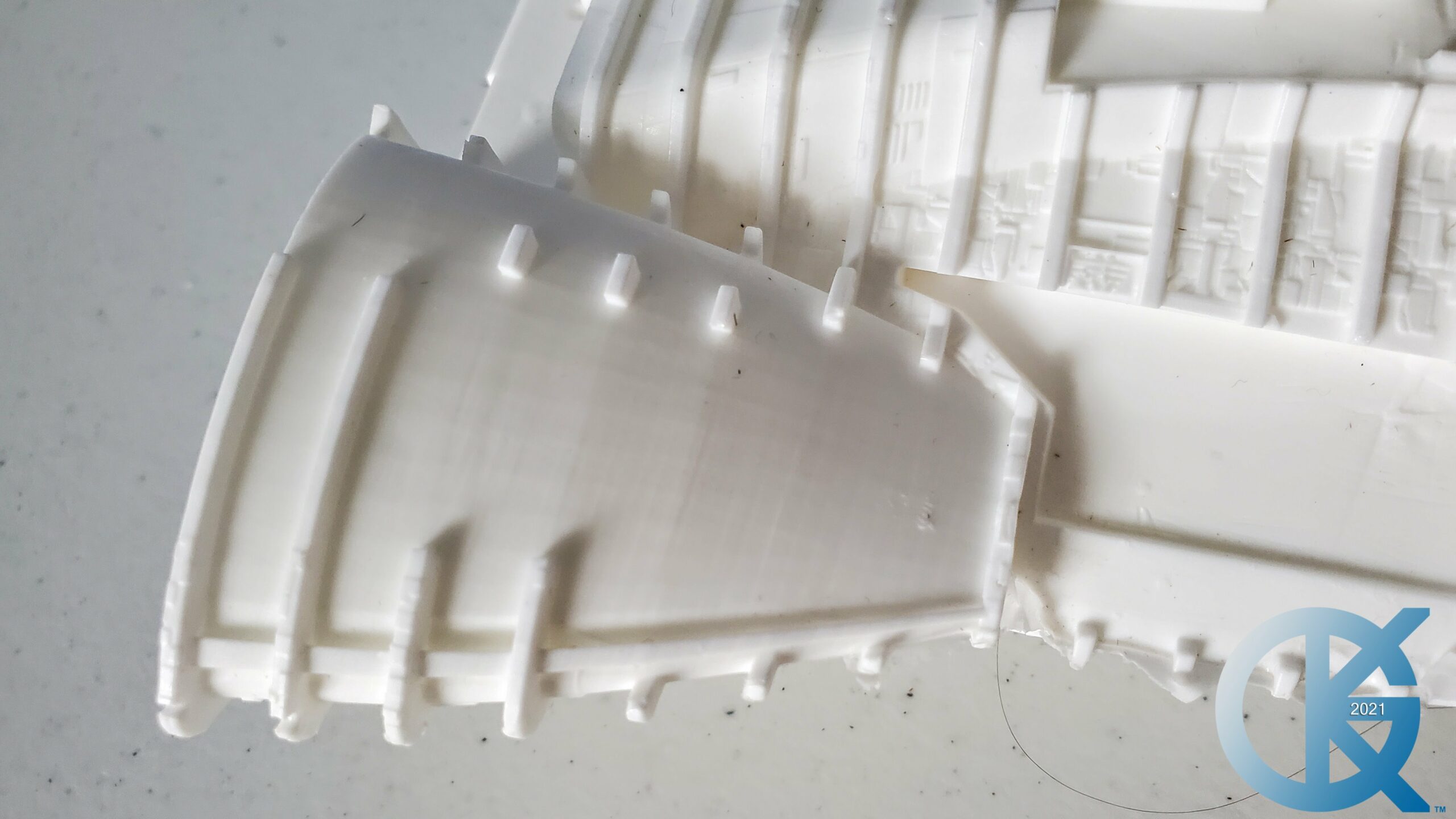 Looking at most of the kit, one can tell the engineering of this kit was quite in depth. Even so, this kit is not for the beginner in this art form, and shall require much care. The parts are very detailed in some areas, and a bit blotchy in others, requiring clean up in some very small spaces. Tedious in task, yet that is where the fun is in making something come to life, right? As a former builder, I know this well. There are some parts, like the clear engine inserts (which are very cool btw), and may be easy to fit. As you may see in the photos below, I dry fit one of these inserts without issue as they seem to simply slide into place. They are neat clear resin features that I am pleased were added. Another neat feature of this kit are the interiors of the Landing/Launch Pods Bays. They require no future add-on parts to create those interiors…. Unless of course you wish then to be even more than they are offered. The interior of the Pods on my kit need a bit of clean up, though I believe they will look great after the build is completed. One of the features I like about them is that they are clearly marked as to which side they belong on, and whether they are front or rear parts for the Pods