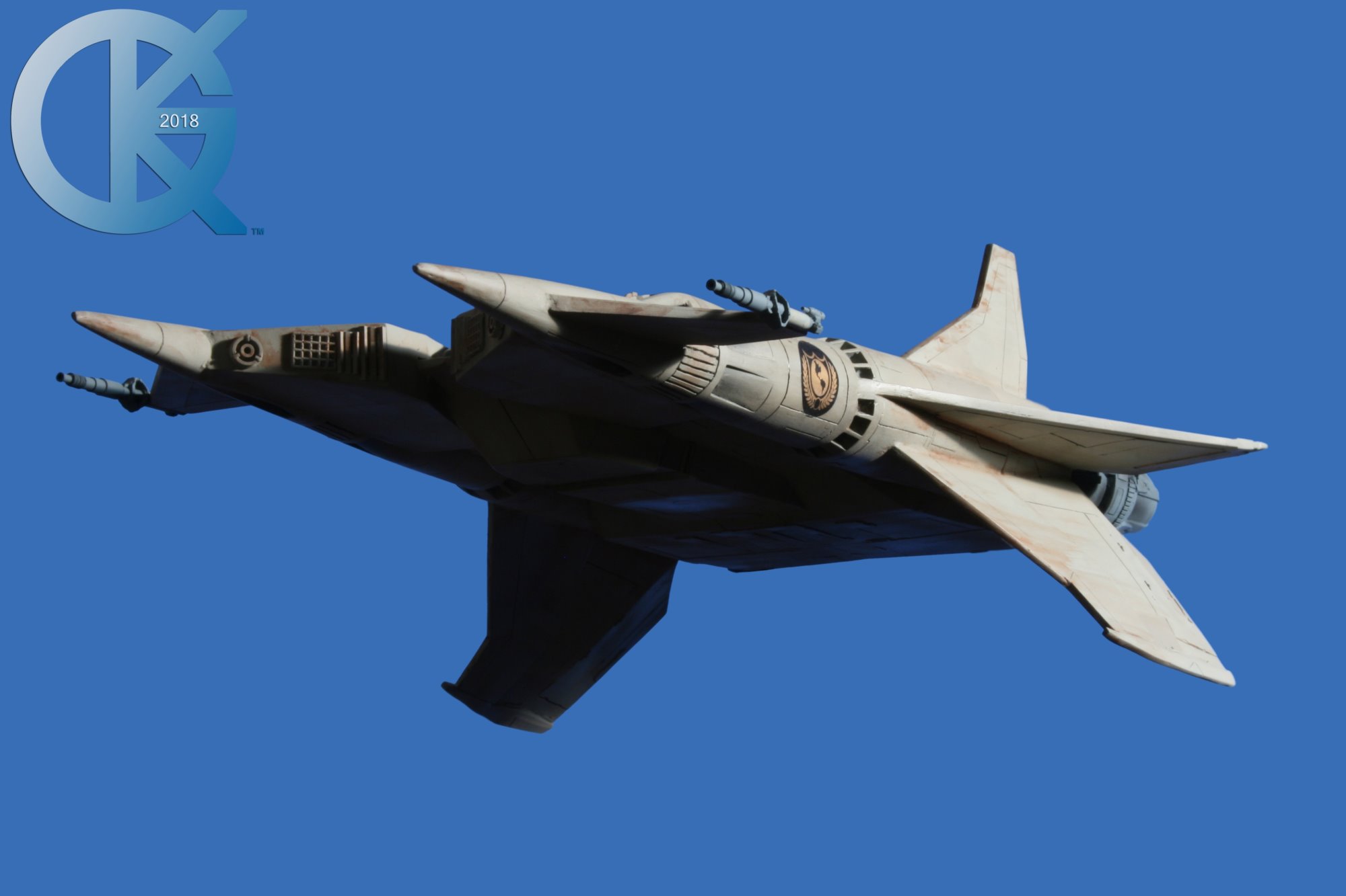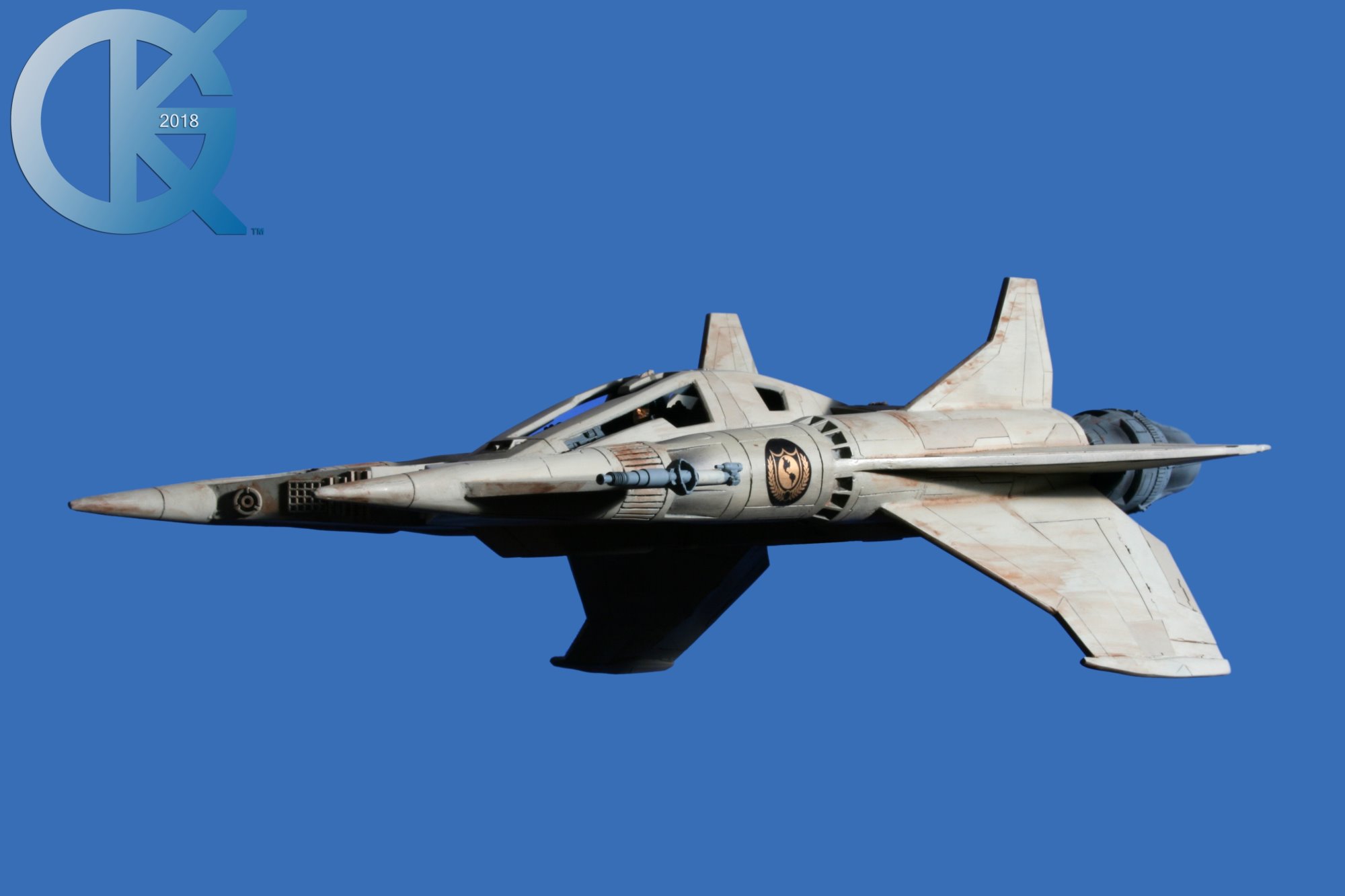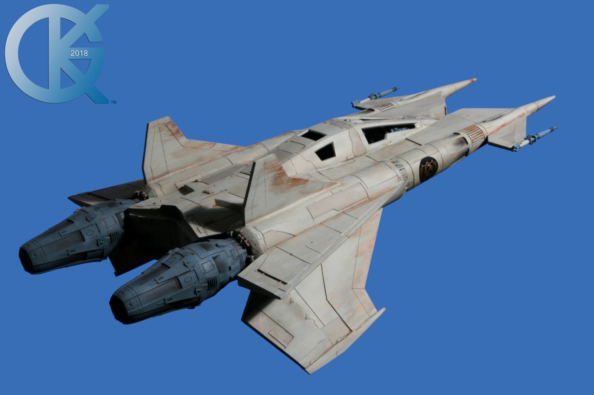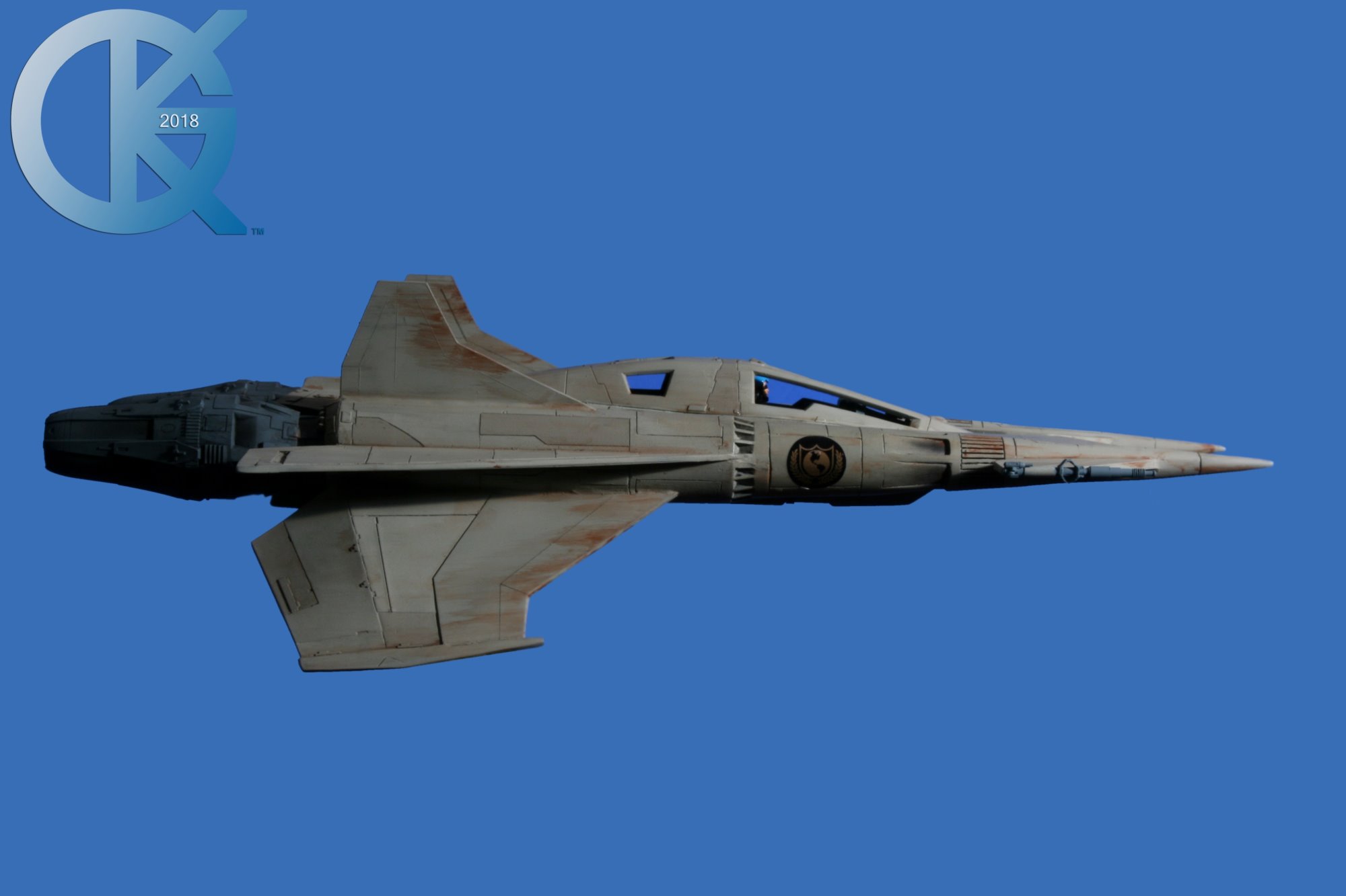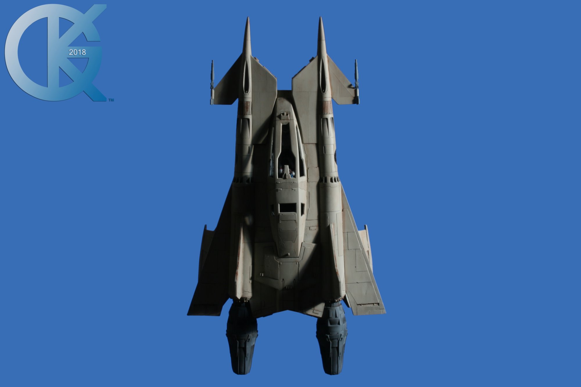 This model replica has been a thrill to photograph. Each angle simply looks menacing… and cool! I received this completed piece from Dan last year. Truth be told, it had started life many years ago as an actual cast from an original. The original cast was given to R.L. Bleecker to build and paint up as Buck’s Thunderfighter (SEEN HERE). It spent many years on display, and after it was borrowed to be on Display at different events (in order to suggest replicas would soon come from a Licensed Company), it eventually was returned months later with damage. At that time I thought we would change this one up. I then gave it to Dan Grumeretz to do so. Dan and I decided to make it the fantastic “Happy Birthday, Buck” Fighter…. which is Cornell Traeger’s early Starfighter seen in that very episode.