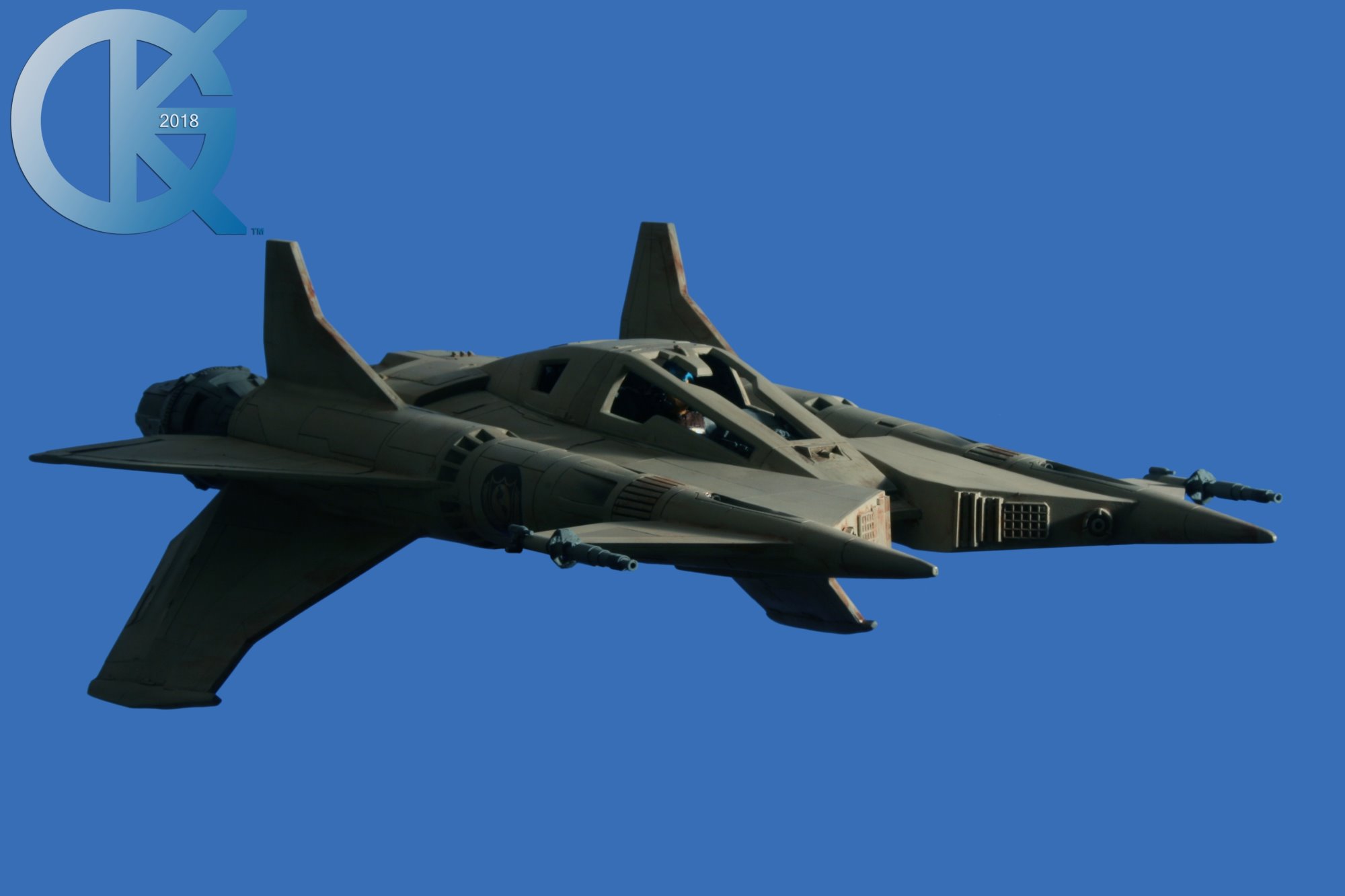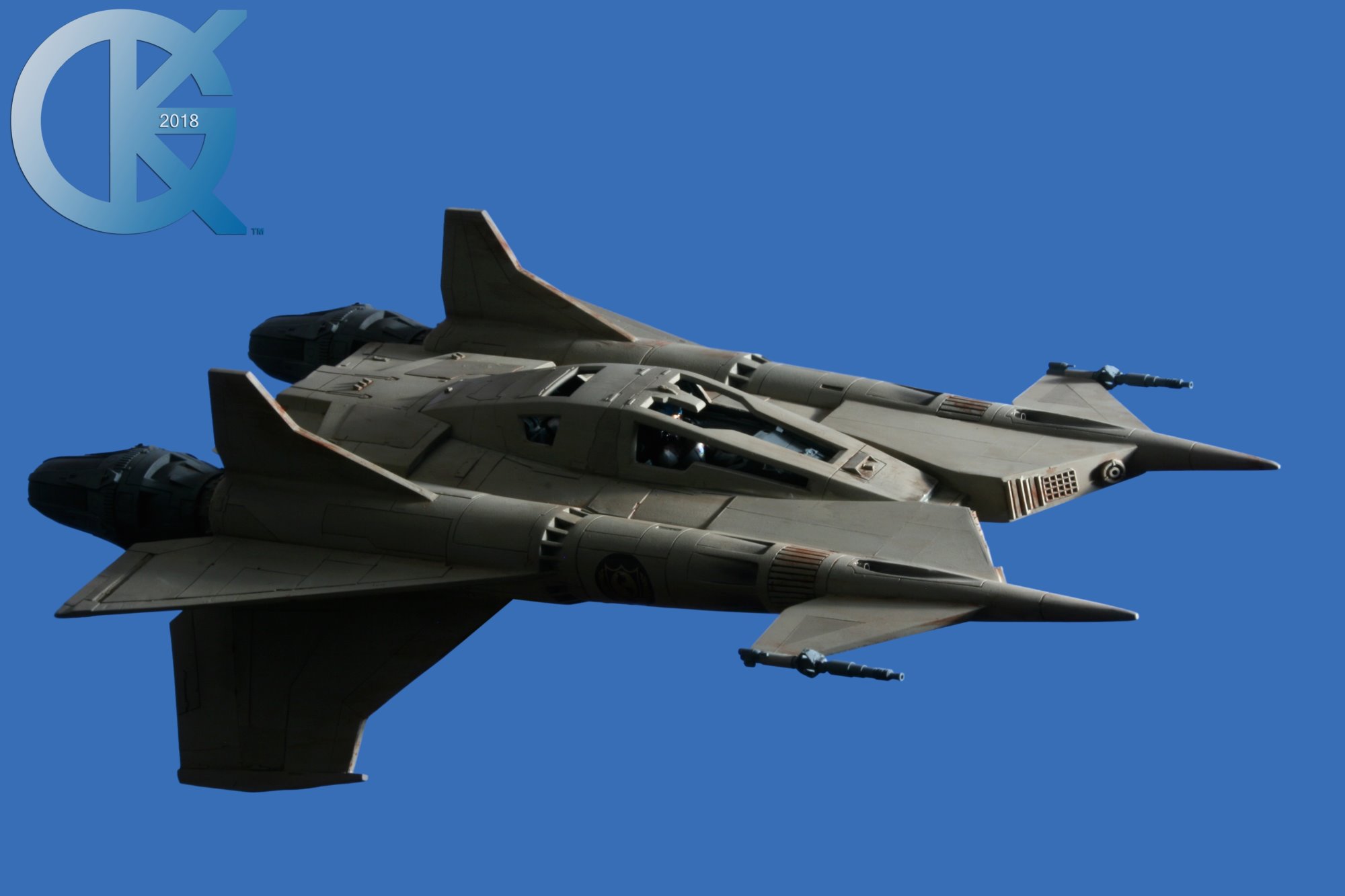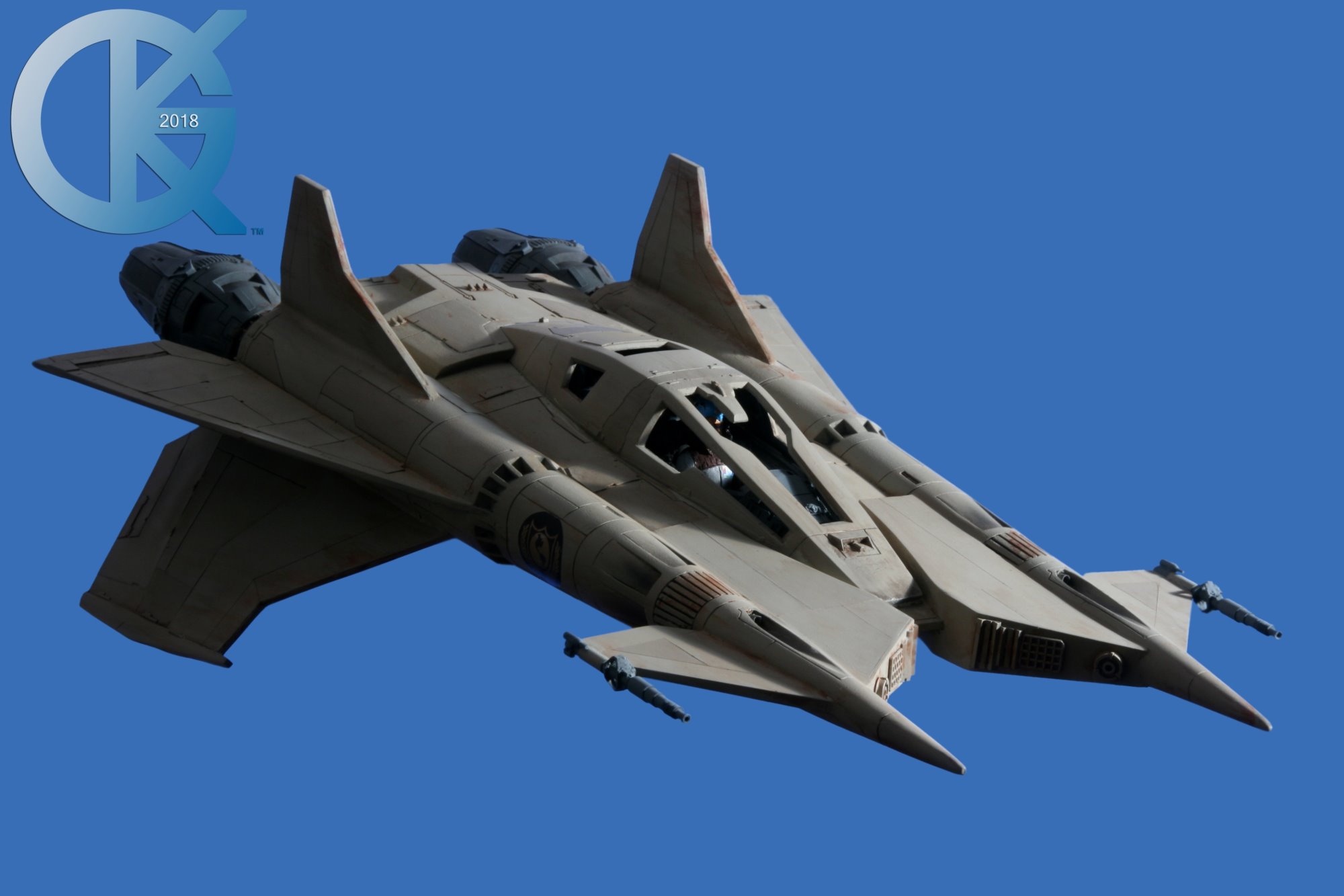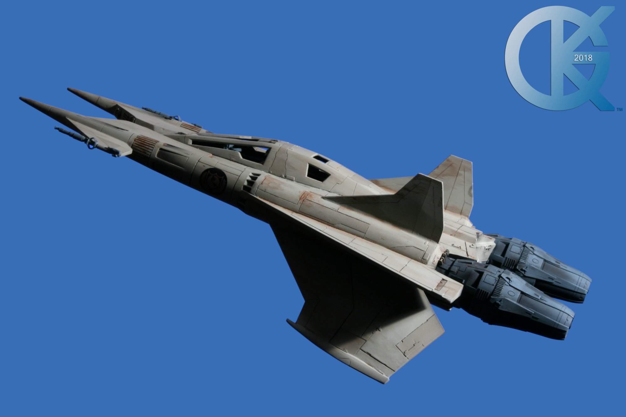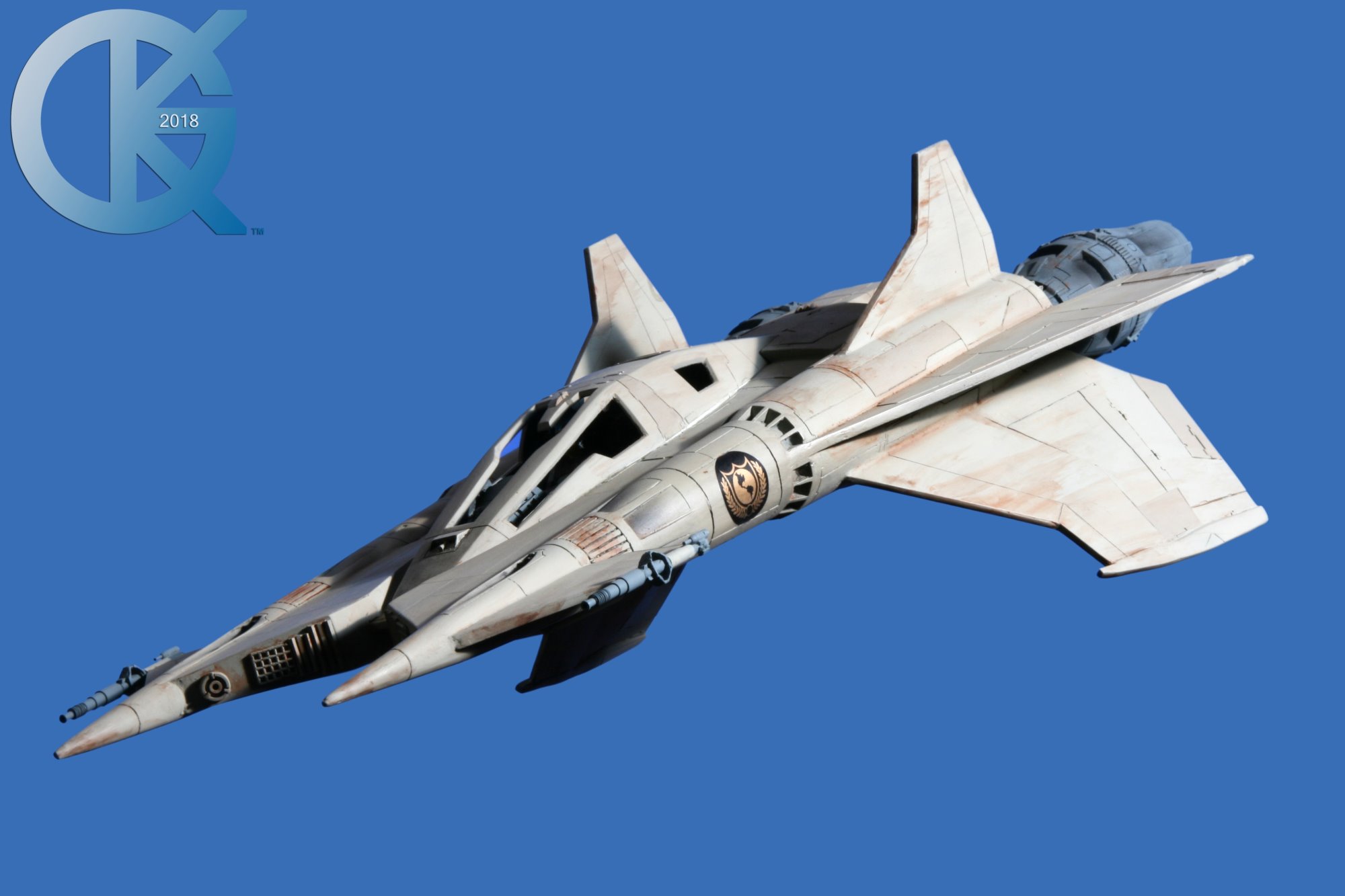 This model replica has been a thrill to photograph. Each angle simply looks menacing… and cool! I received this completed piece from Dan last year. Truth be told, it had started life many years ago as an actual cast from an original. The original cast was given to R.L. Bleecker to build and paint up as Buck’s Thunderfighter (SEEN HERE). It spent many years on display, and after it was borrowed to be on Display at different events (in order to suggest replicas would soon come from a Licensed Company), it eventually was returned months later with damage. At that time I thought we would change this one up. I then gave it to Dan Grumeretz to do so. Dan and I decided to make it the fantastic “Happy Birthday, Buck” Fighter…. which is Cornell Traeger’s early Starfighter seen in that very episode.