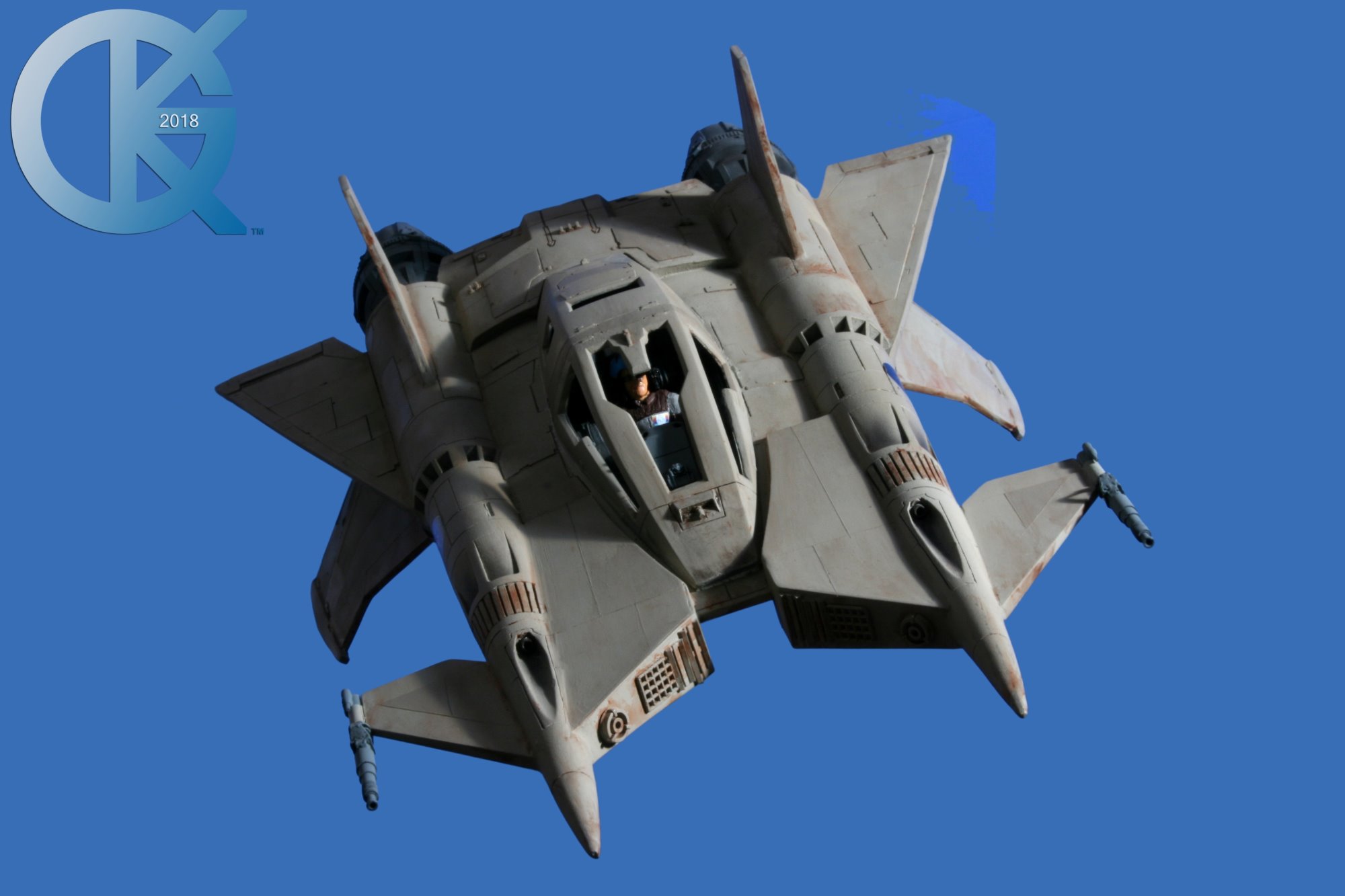Traeger’s Starfighter differs from Buck’s Thunderfighter with it’s top stabilizers standing in their menacing positions, and the bottom stabilizers actually lengthened to be much longer than the Thunderfighter we all know. Then there are the front side wings with the guns that are very close to those used (if not the same) on a Colonial Viper. There are other minor details here and there, and Dan did it complete justice, making this a very worthy replica. One difference from the original however,… Dan made Traeger as the pilot, copying what the actor wore in the episode. Even Traeger’s visor is on him. Excellent work.