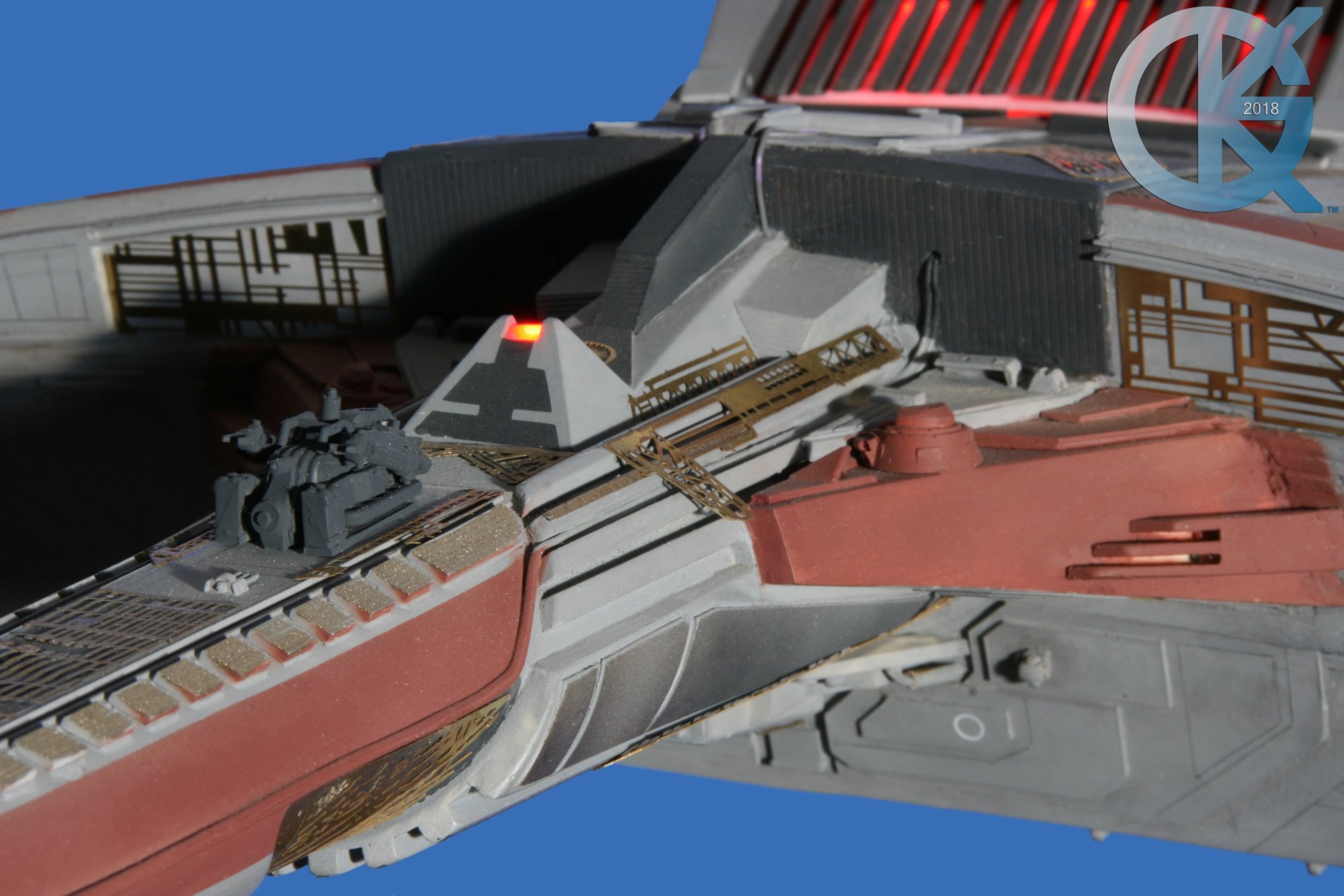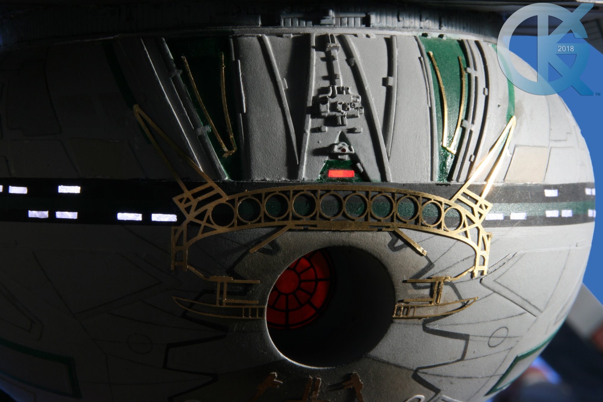 Built from the amazing Richard Long studio scale Klingon K’TINGA kit (of which only 5 or 6 were produced), artist Dan Grumeretz took extra care to make sure this piece was as accurate as we could make it to be K’RONOS One. Utilizing the Jim Creveling photos of the actual studio model (Seen Here), Dan replicated the details that were not on the K’Tinga Kit. He modified the neck mating area, the Engine Nacelles, the Bridge, the rear…. just about everything other than the shape Richard amazingly created by hand. We even recreated the patterns for the brass photo etch, sending them out to a company that is unfamiliar with this art form… just so this would be a surprise to everyone. I asked Dan to place in full lighting…. including the navigation and blinking lights, and the Torpedo Bay which lightly burns… like the embers of a fire almost out… extremely nice to view. Even the wiring on the outside of the ship, going down the length of the neck, we replicated. One cannot really touch this piece as their hands or clothes may get caught on the many pieces of photo etch upon it’s hull….. it is everywhere! I asked Dan to replicate the splotches of gold painted on here and there to make this K’Ronos replica as ornate as the original. It is magnificent. Dan did a fantastic job…. as is his usual. Thank you Dan! And though he is no longer in this art form…. thank you Richard.
