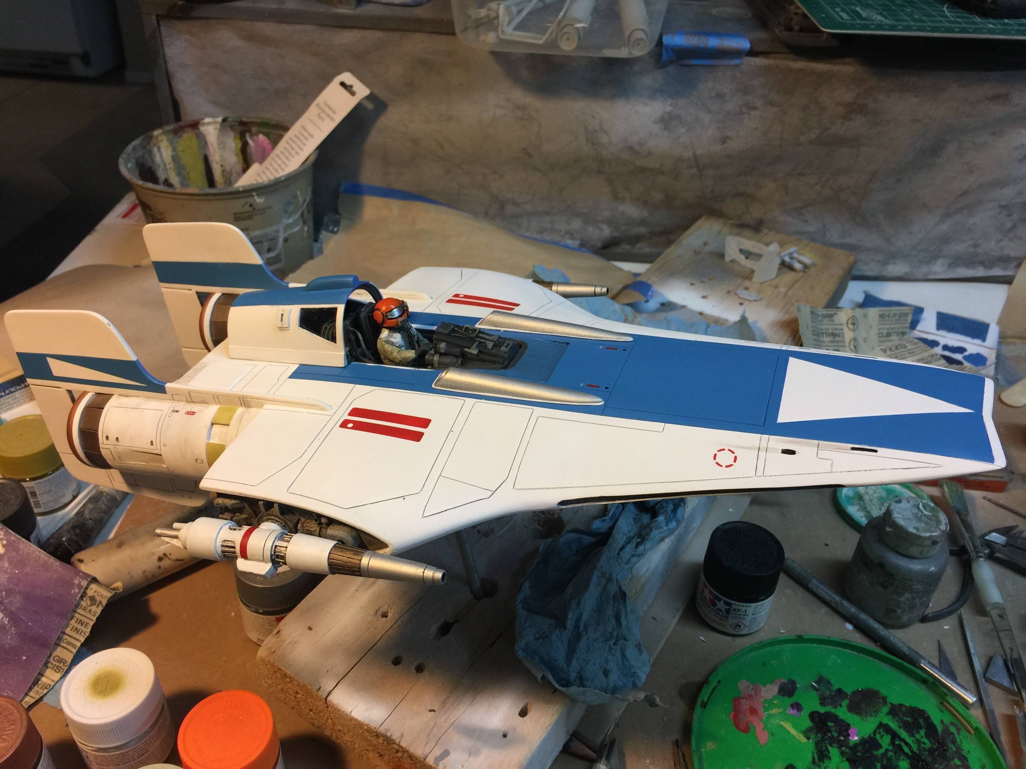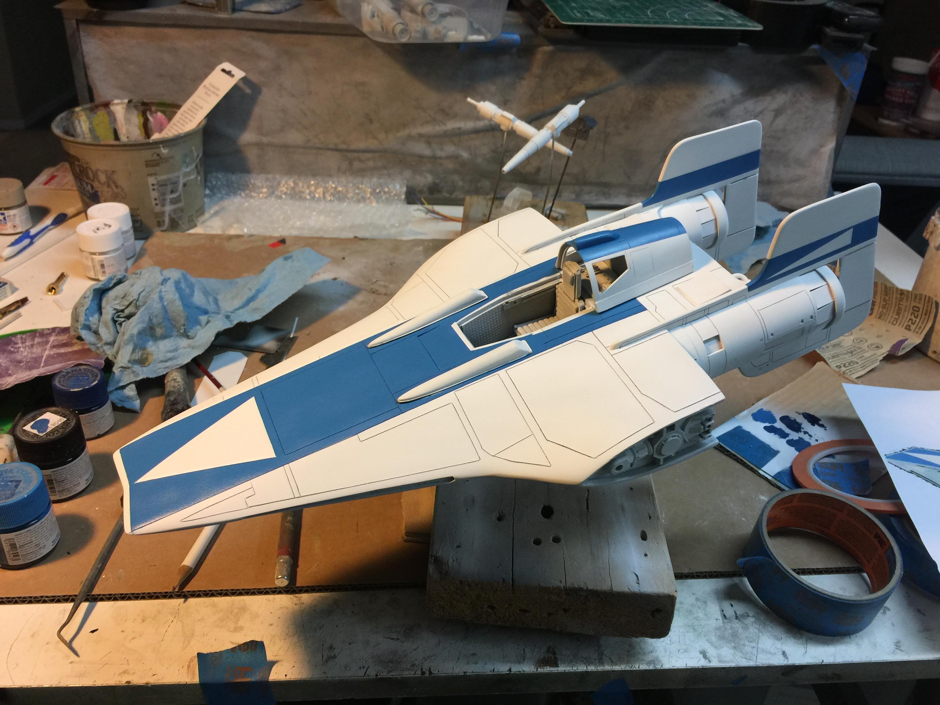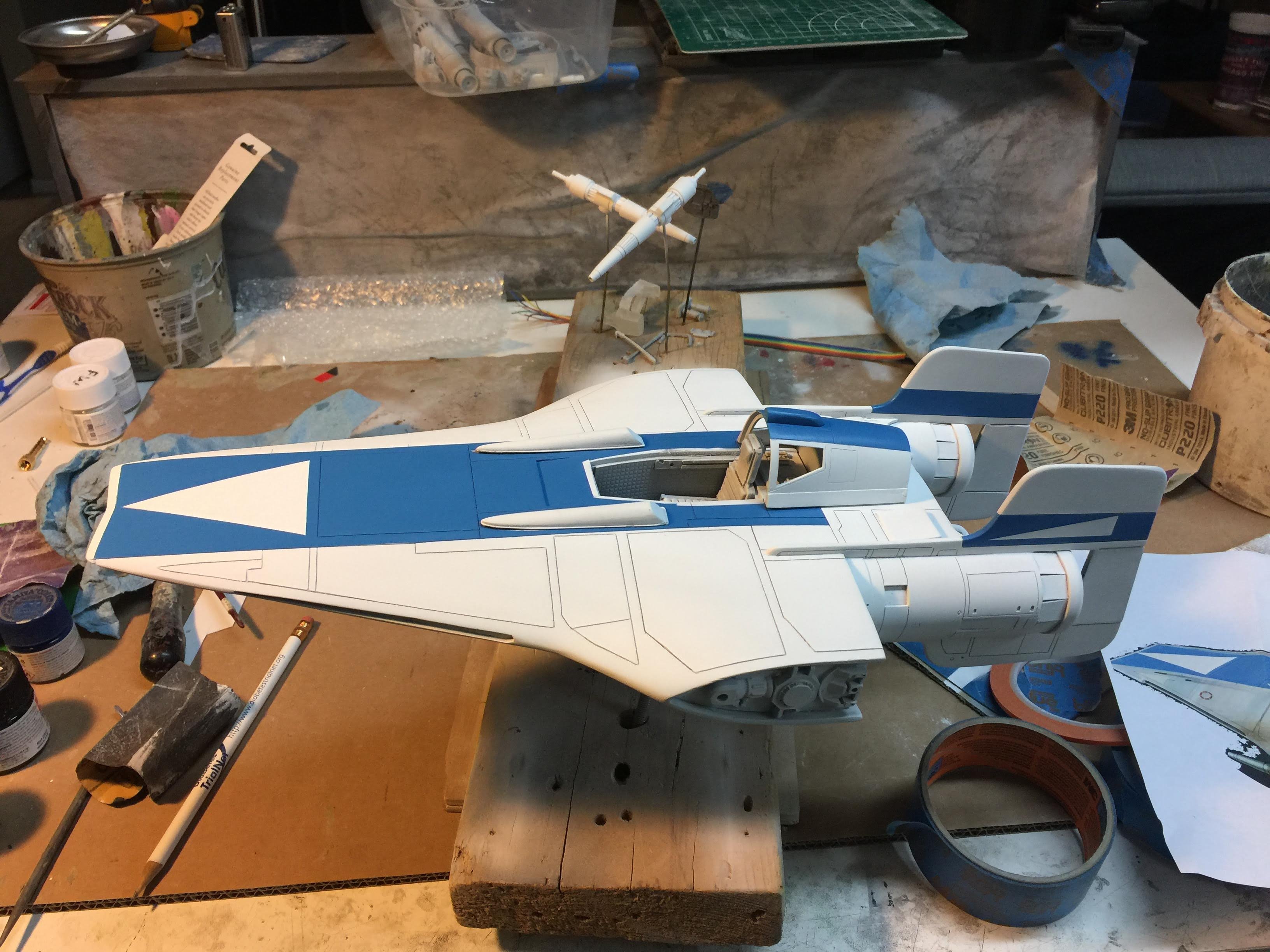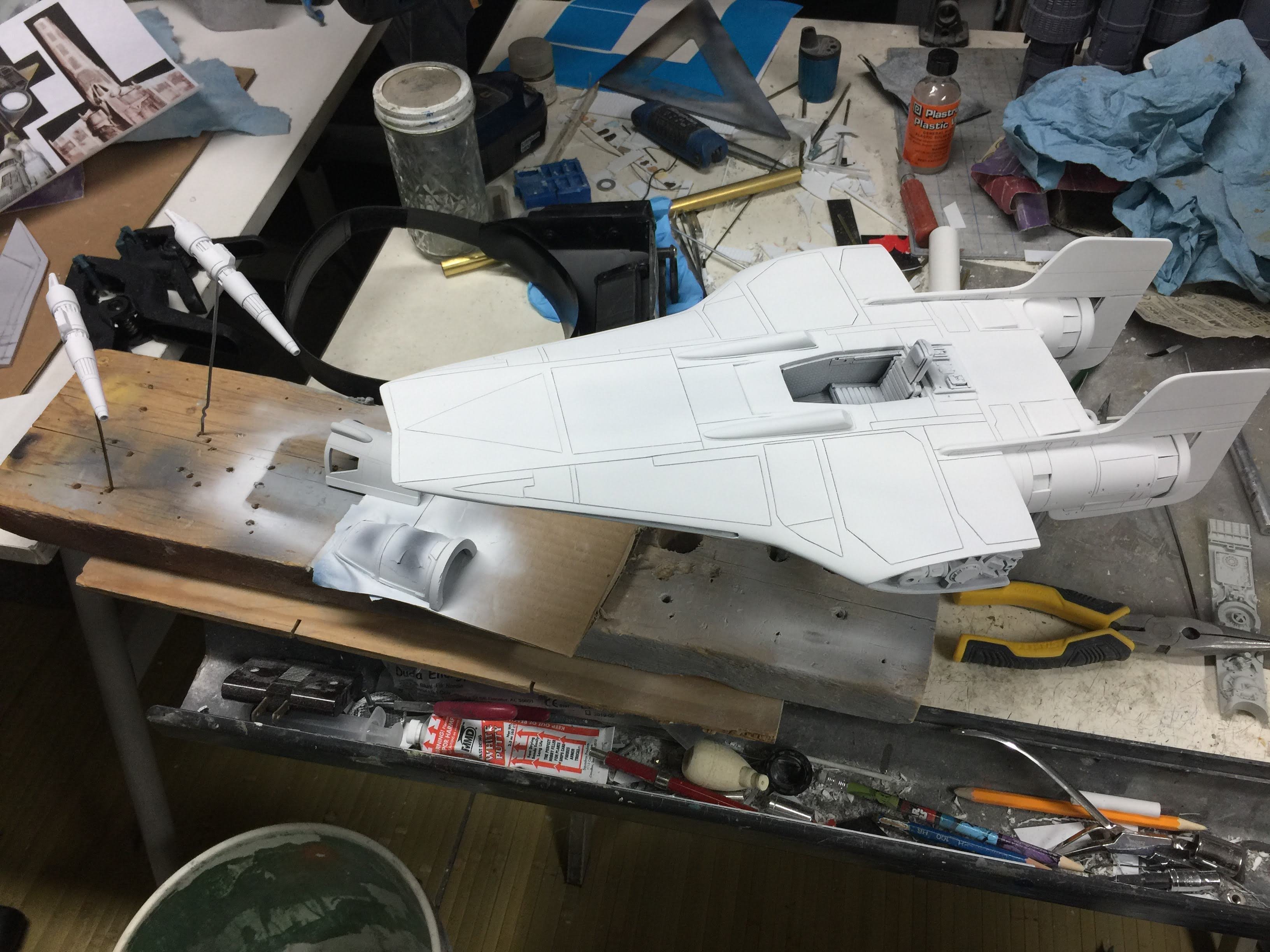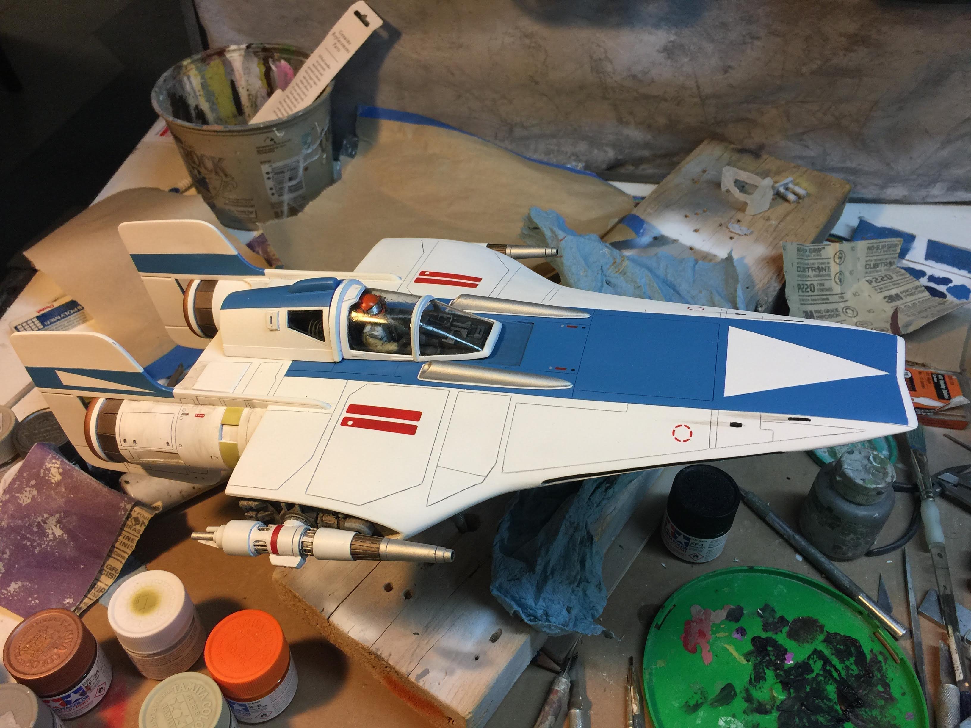 Artist Ralph McQaurrie will always be remembered for his brilliant and imaginative work in the film and art industry. A many of his designs were used for popular science fiction films… of which this one made it into the Star Wars universe. If real, this concept A-Wing is much larger than the actual A-Wing that we saw in Return of the Jedi. When artist Richard Long patterned a kit of it, I wanted one greatly. I eventually was able to get this kit direct from Richard Long, and even arrange the pattern sale to KORBANTH, who may begin selling it soon. That stated… this model was masterfully built up by artist Dan Grumeretz for our display here. Dan took time to really follow what McQuarrie had painted. In recent years, the series Star Wars Rebels began using this design, albeit slightly different, against the growing Imperial menace. Needless to say, even though that show is amazing, I wanted this to be a tribute to Ralph McQuarrie, and as such… Dan made it so. He slightly modified this model in panel lines, and even shape. The front nose in the paintings is not straight, but V-shaped. Even the new toy missed that one. I am very pleased with Dan’s work on this. I believe Ralph would have liked this. Ble Screen Photos will soon be shown.