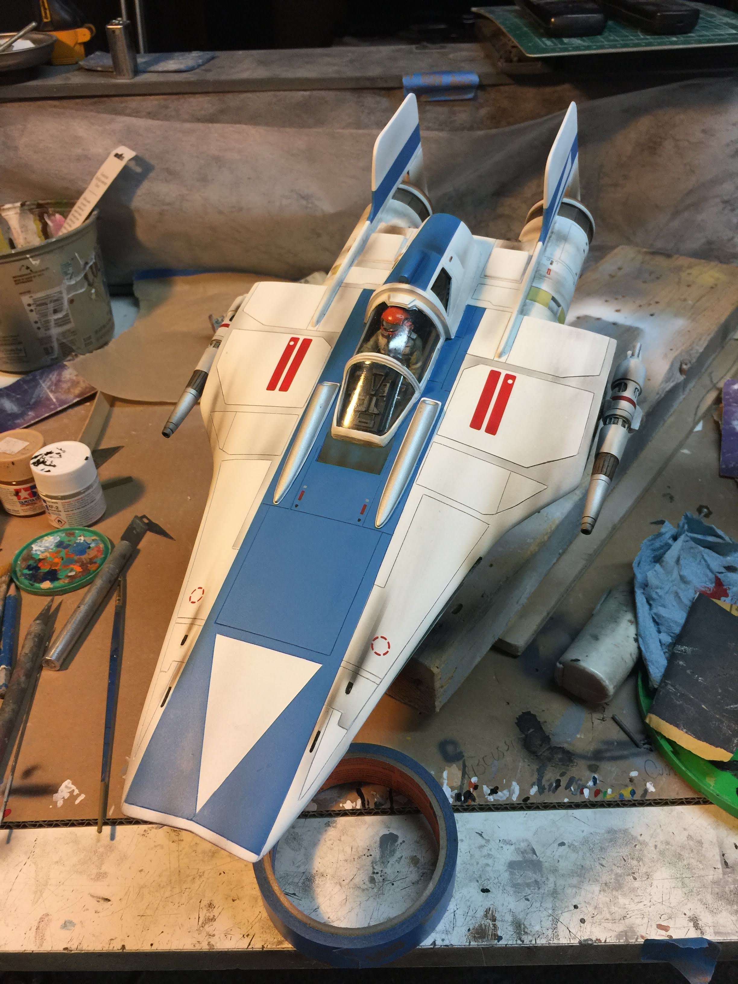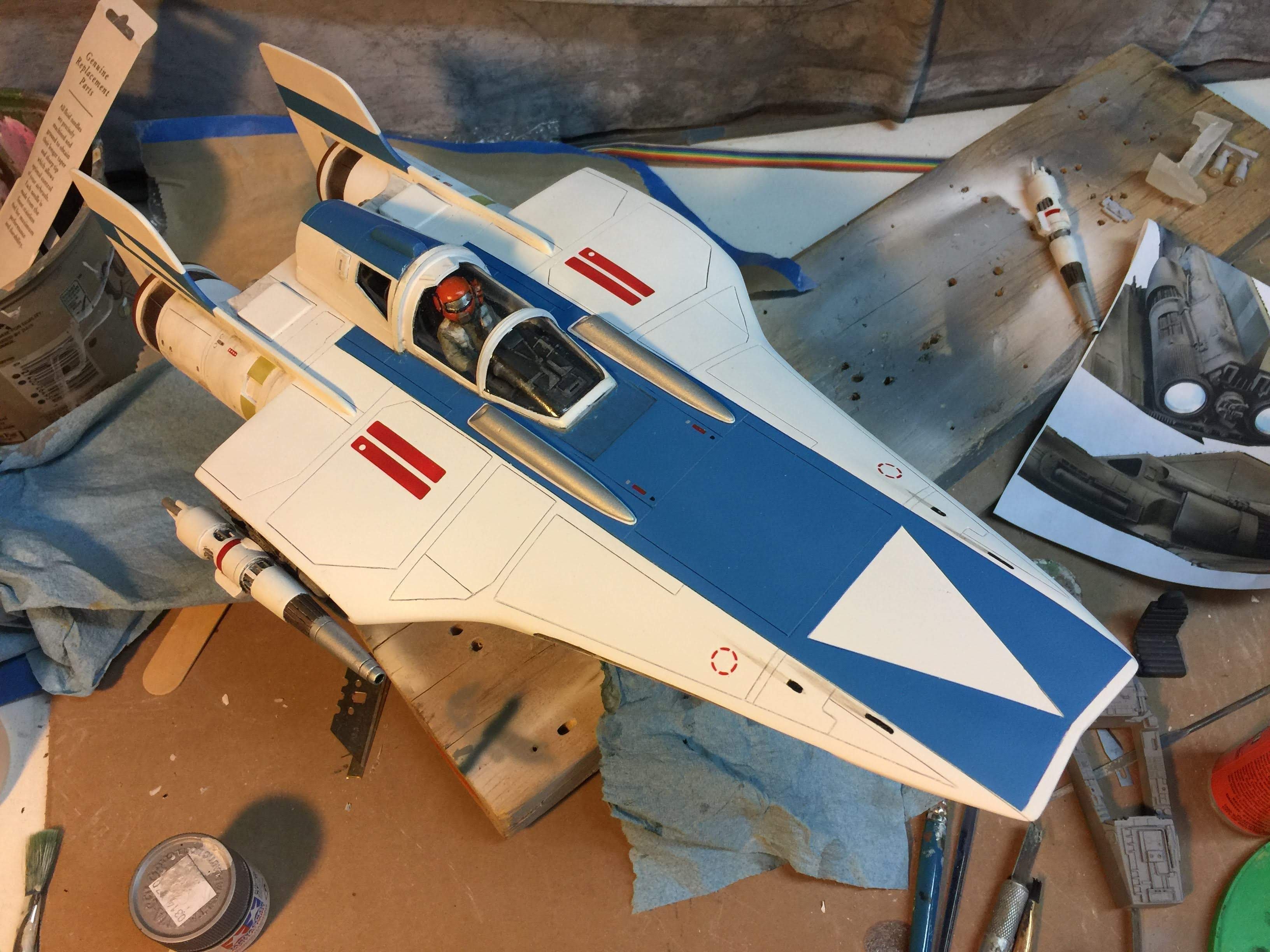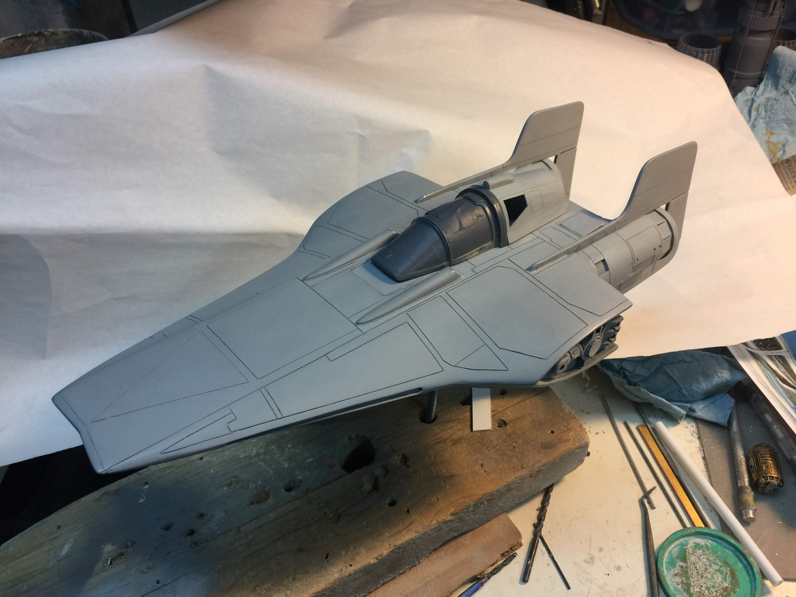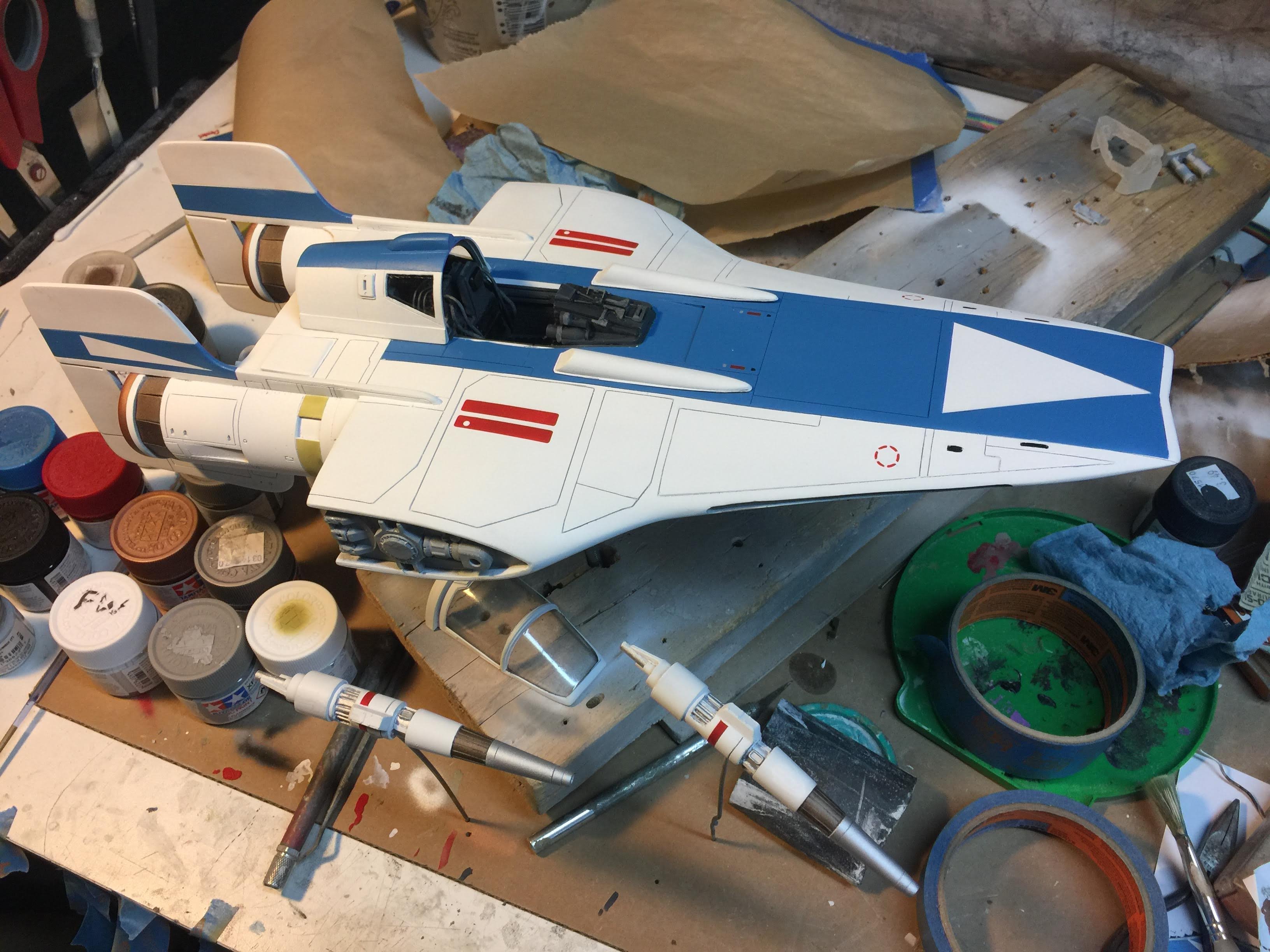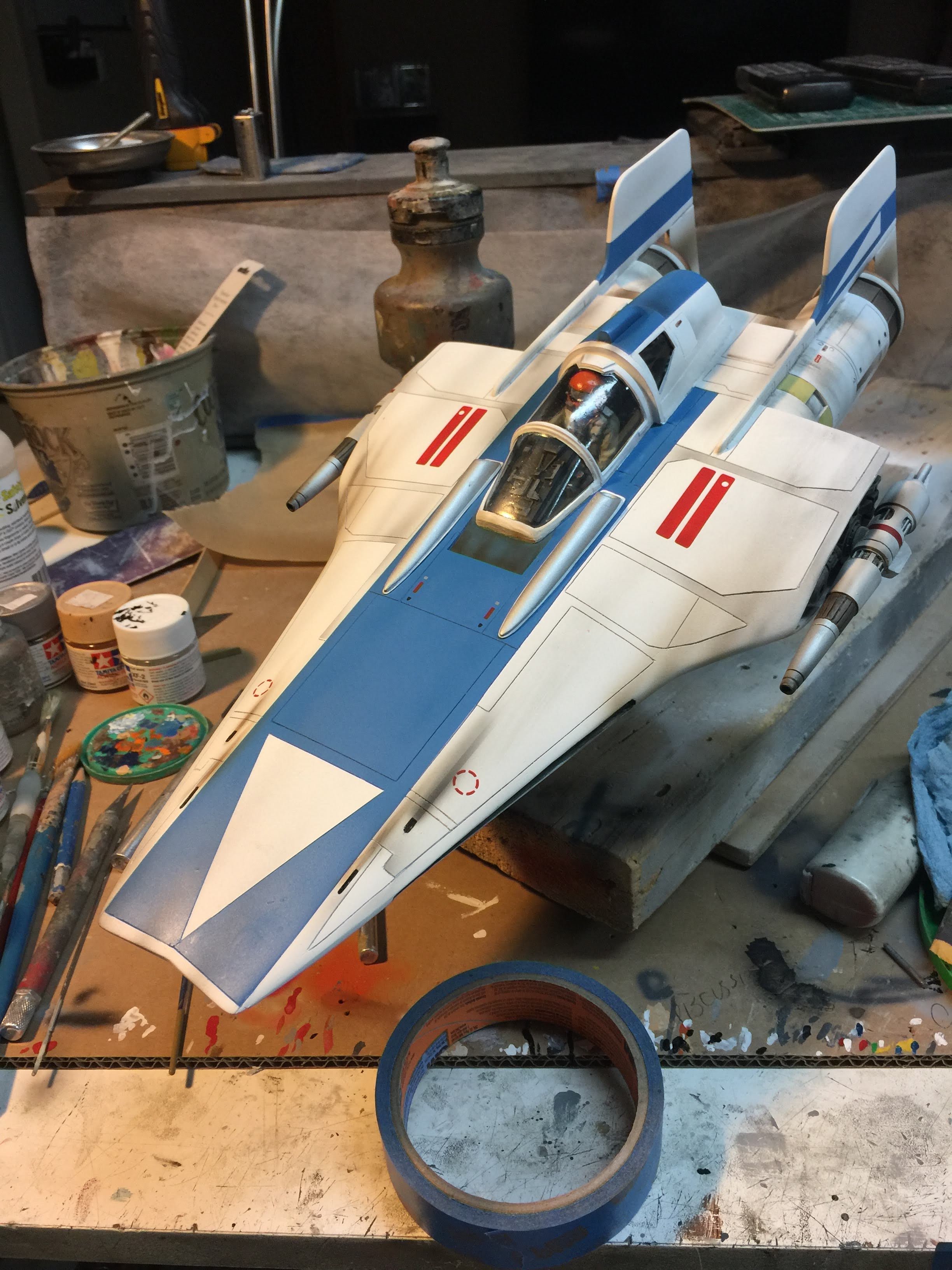 Artist Ralph McQaurrie will always be remembered for his brilliant and imaginative work in the film and art industry. A many of his designs were used for popular science fiction films… of which this one made it into the Star Wars universe. If real, this concept A-Wing is much larger than the actual A-Wing that we saw in Return of the Jedi. When artist Richard Long patterned a kit of it, I wanted one greatly. I eventually was able to get this kit direct from Richard Long, and even arrange the pattern sale to KORBANTH, who may begin selling it soon. That stated… this model was masterfully built up by artist Dan Grumeretz for our display here. Dan took time to really follow what McQuarrie had painted. In recent years, the series Star Wars Rebels began using this design, albeit slightly different, against the growing Imperial menace. Needless to say, even though that show is amazing, I wanted this to be a tribute to Ralph McQuarrie, and as such… Dan made it so. He slightly modified this model in panel lines, and even shape. The front nose in the paintings is not straight, but V-shaped. Even the new toy missed that one. I am very pleased with Dan’s work on this. I believe Ralph would have liked this. Ble Screen Photos will soon be shown.