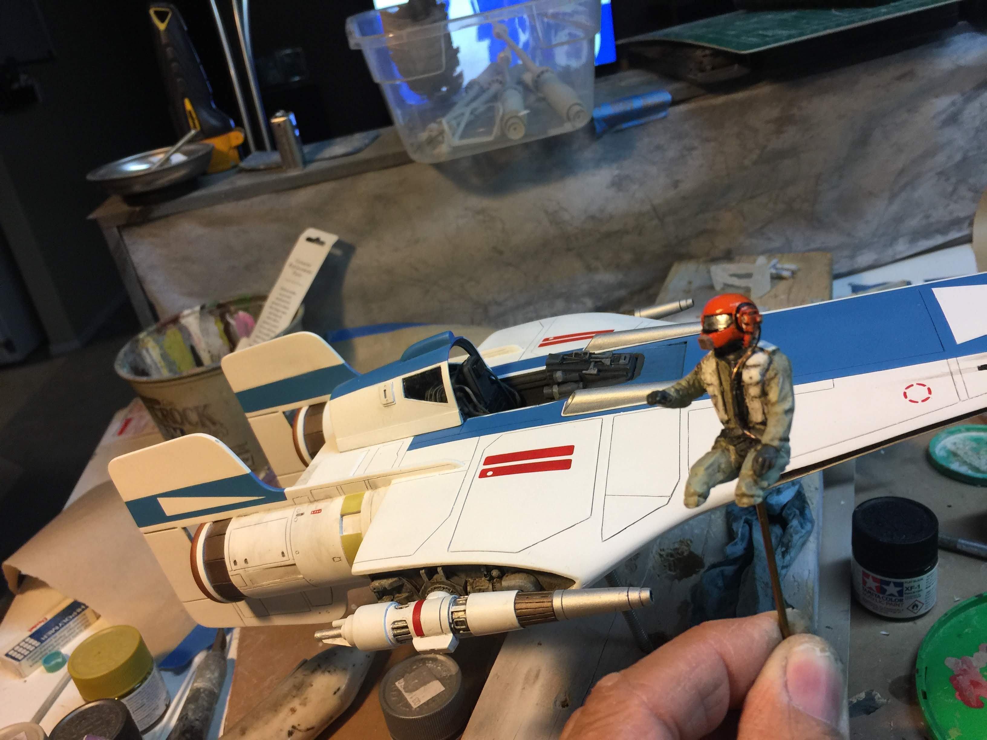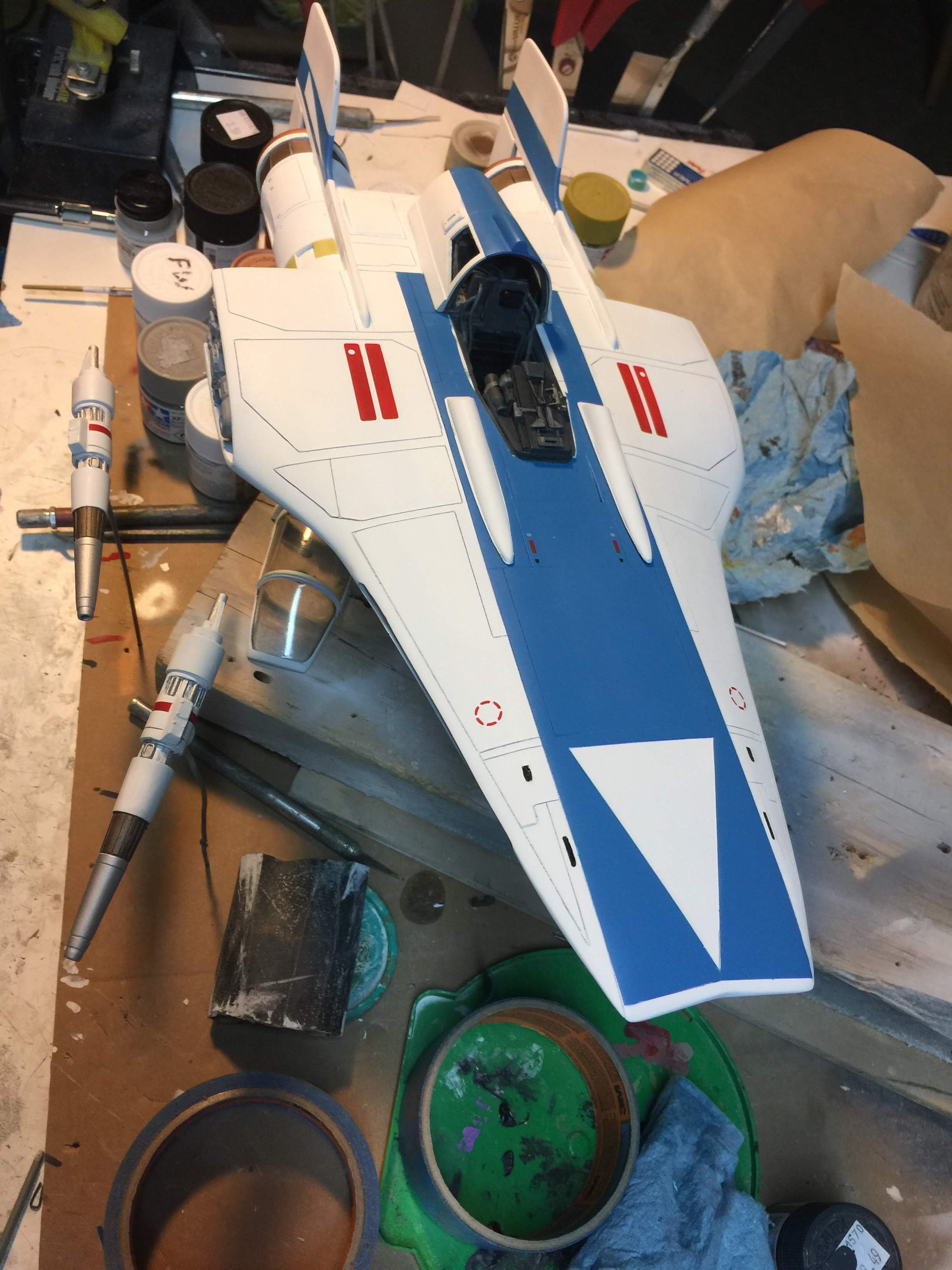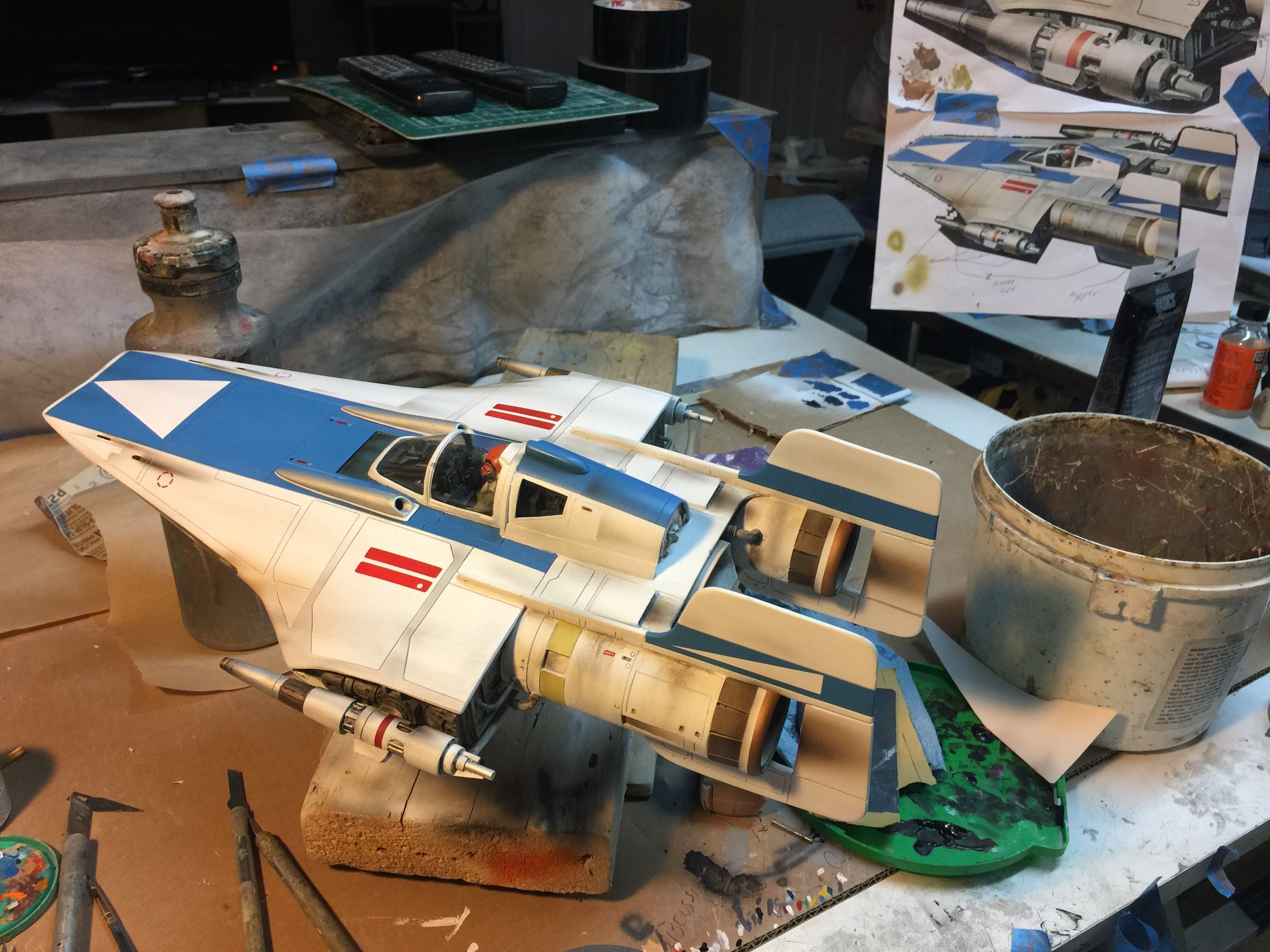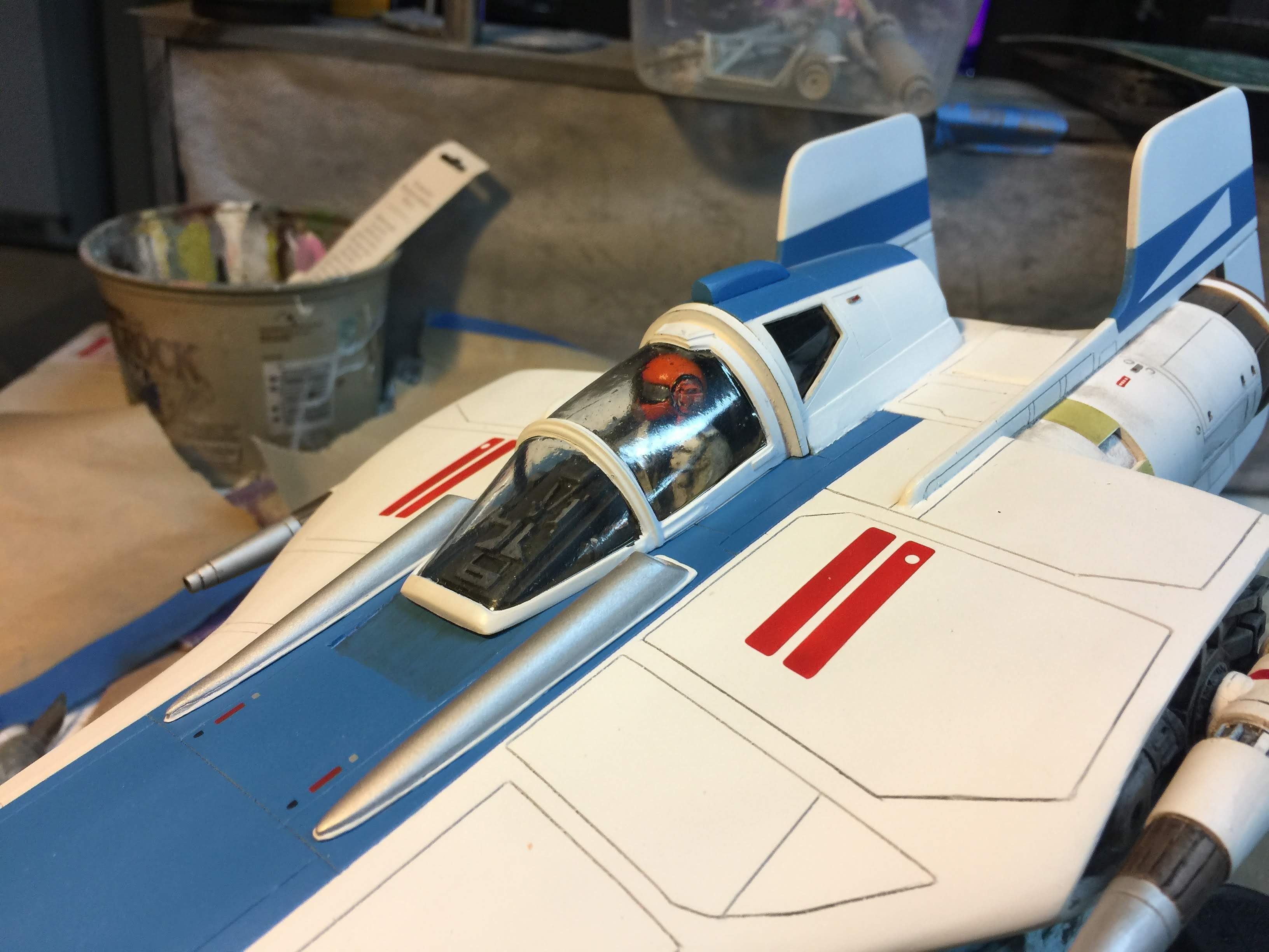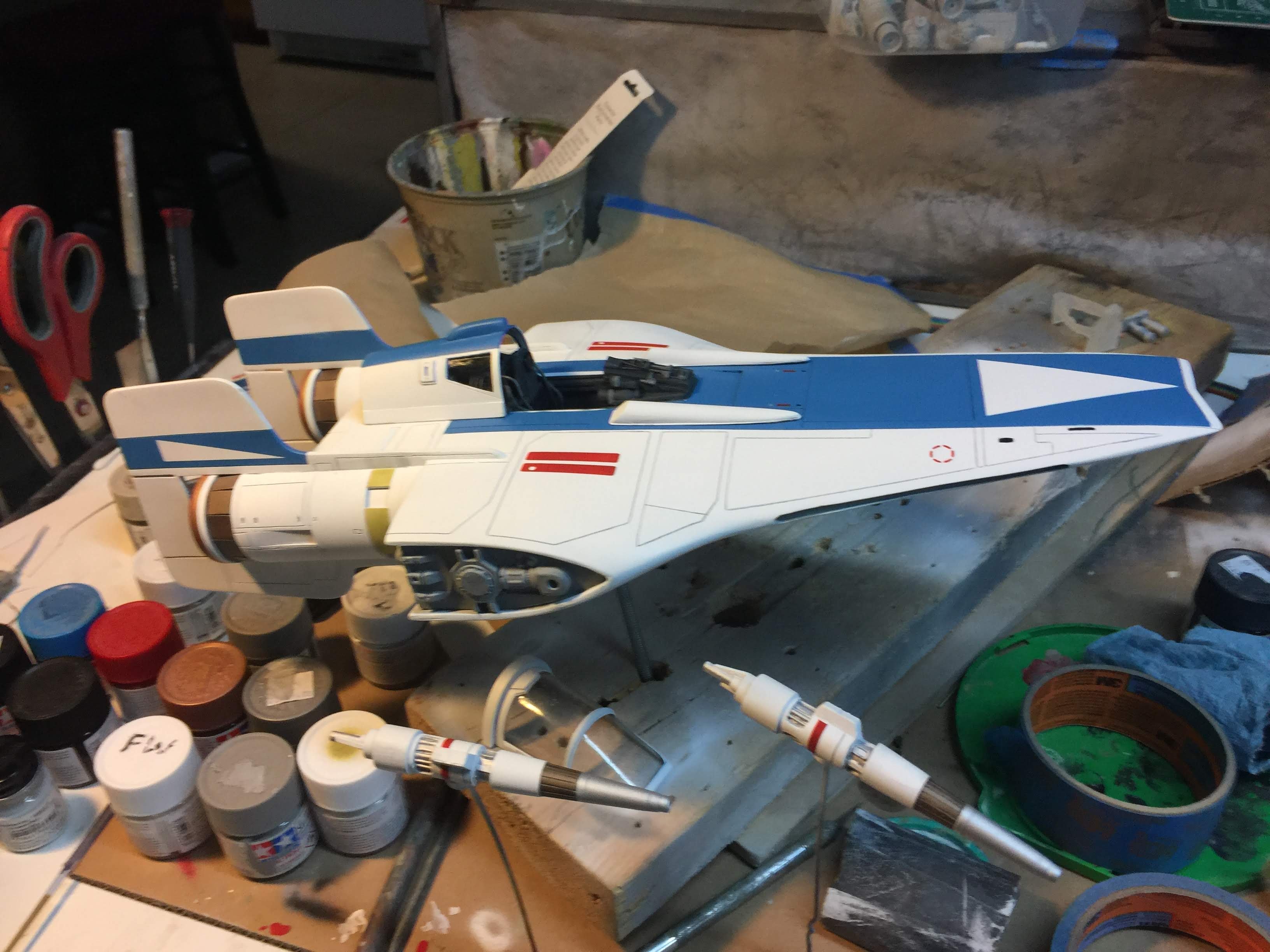 Artist Ralph McQaurrie will always be remembered for his brilliant and imaginative work in the film and art industry. A many of his designs were used for popular science fiction films… of which this one made it into the Star Wars universe. If real, this concept A-Wing is much larger than the actual A-Wing that we saw in Return of the Jedi. When artist Richard Long patterned a kit of it, I wanted one greatly. I eventually was able to get this kit direct from Richard Long, and even arrange the pattern sale to KORBANTH, who may begin selling it soon. That stated… this model was masterfully built up by artist Dan Grumeretz for our display here. Dan took time to really follow what McQuarrie had painted. In recent years, the series Star Wars Rebels began using this design, albeit slightly different, against the growing Imperial menace. Needless to say, even though that show is amazing, I wanted this to be a tribute to Ralph McQuarrie, and as such… Dan made it so. He slightly modified this model in panel lines, and even shape. The front nose in the paintings is not straight, but V-shaped. Even the new toy missed that one. I am very pleased with Dan’s work on this. I believe Ralph would have liked this. Ble Screen Photos will soon be shown.