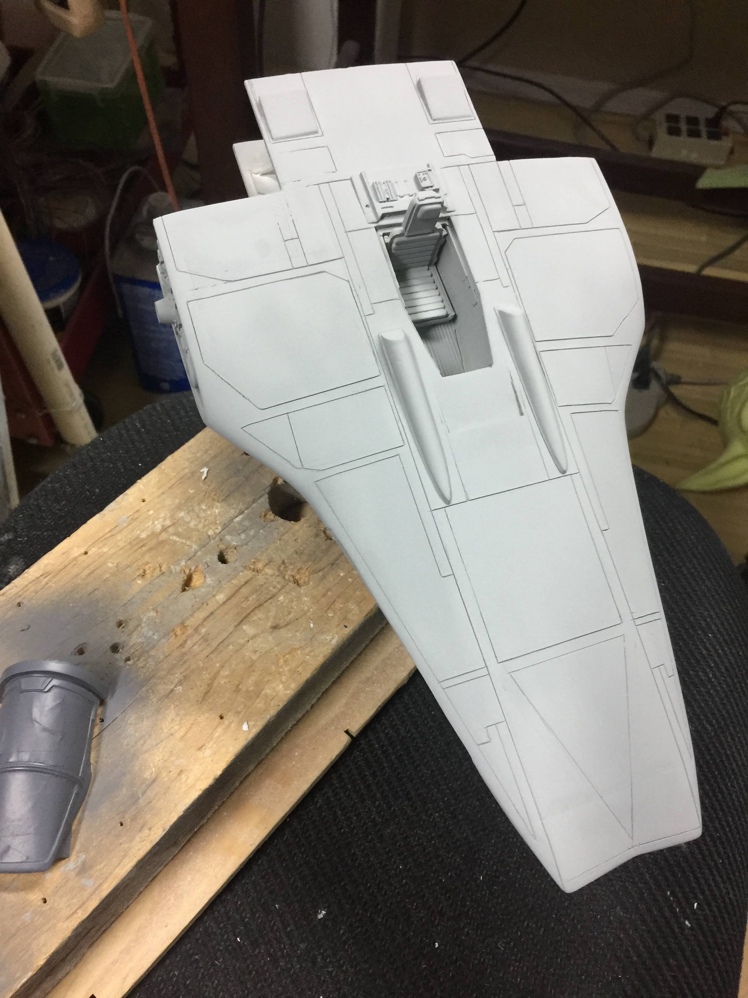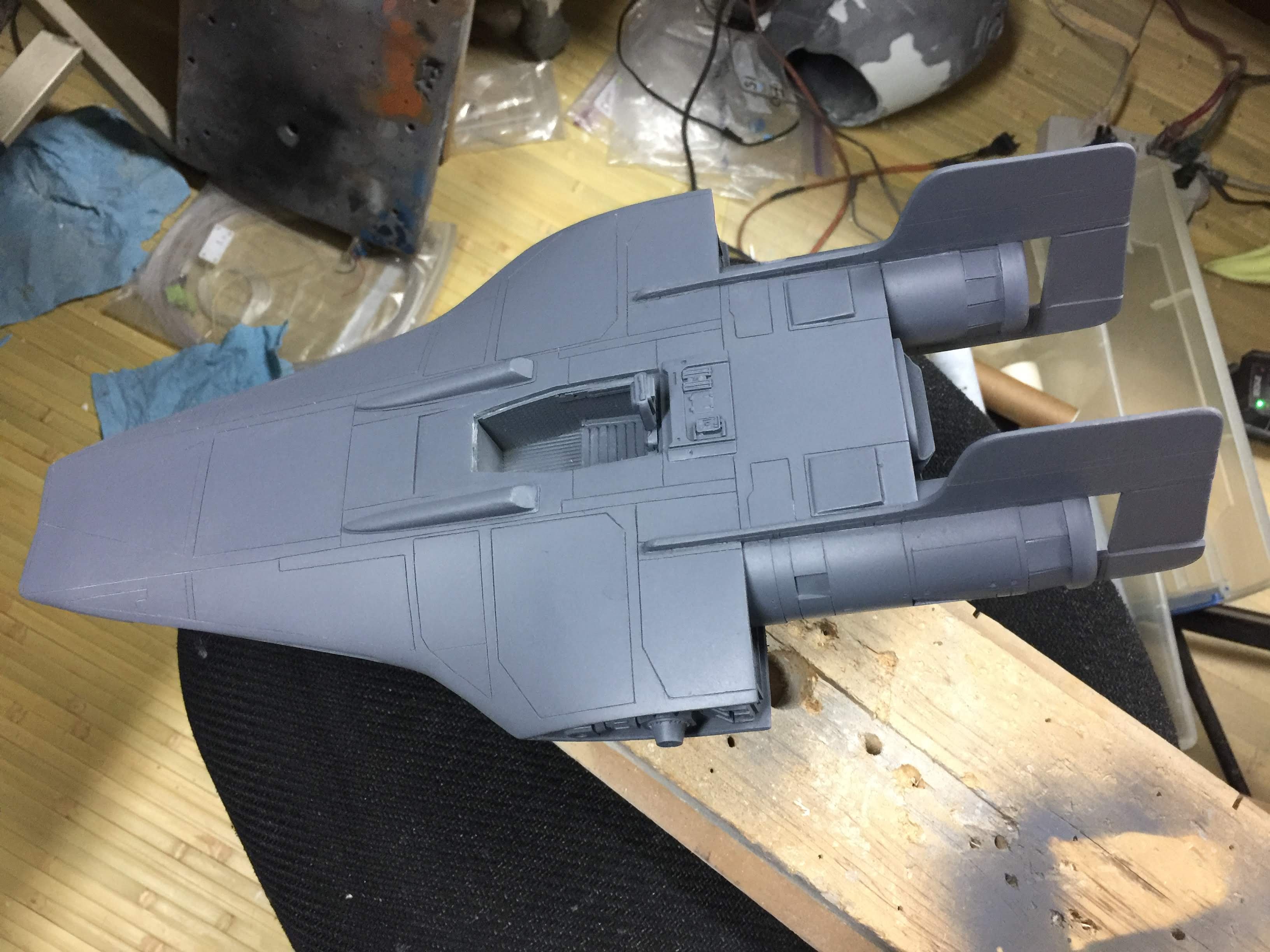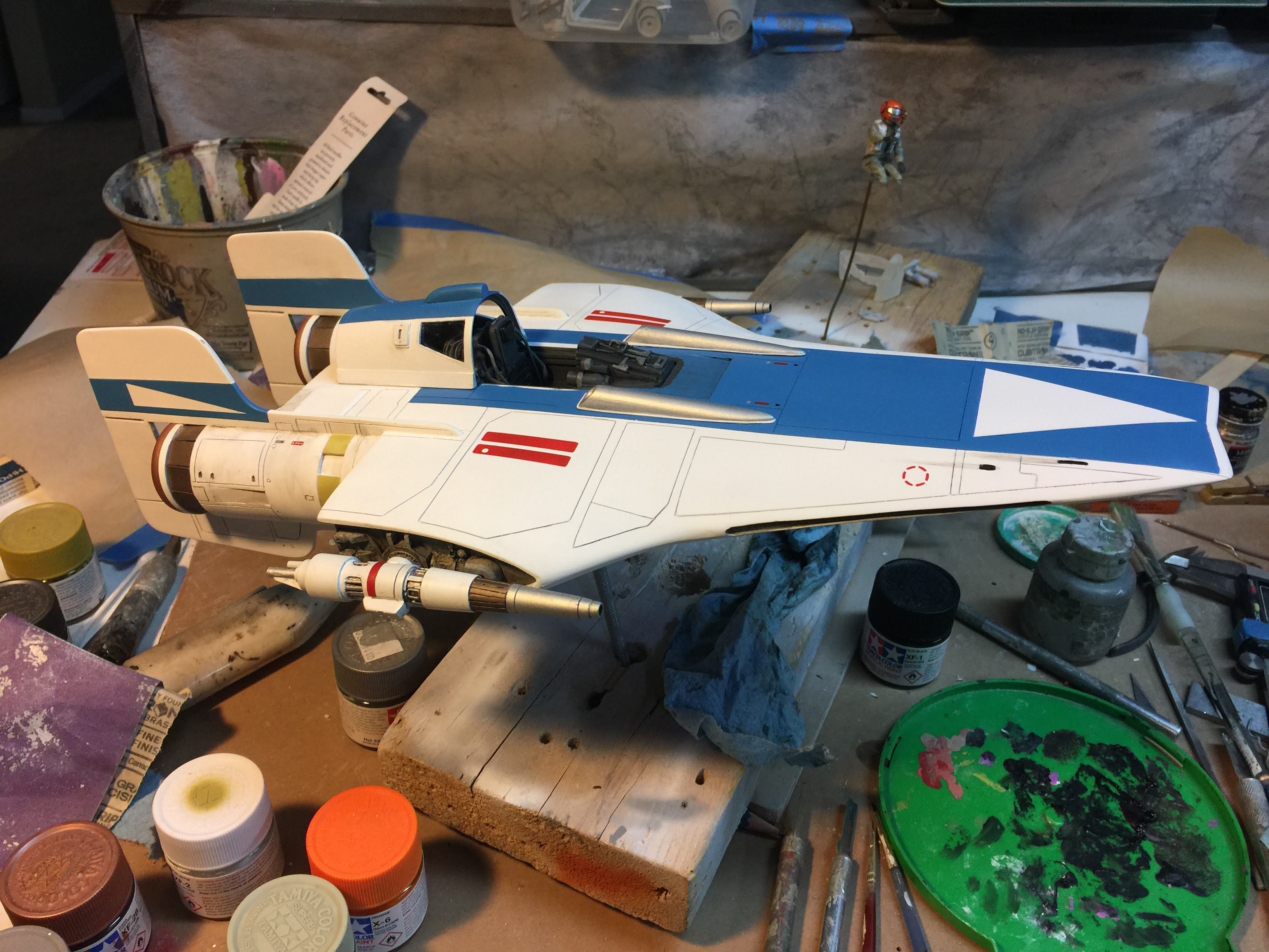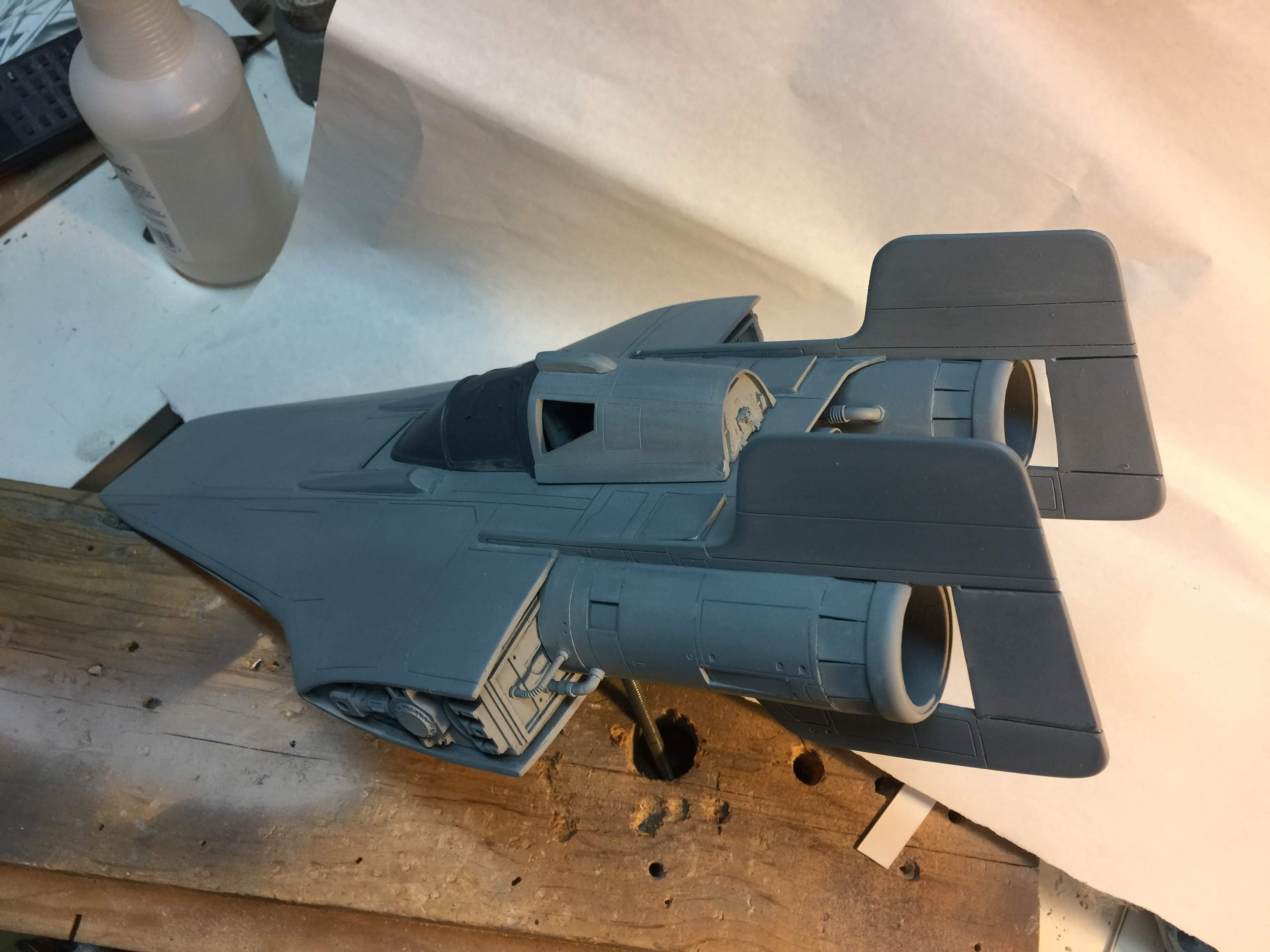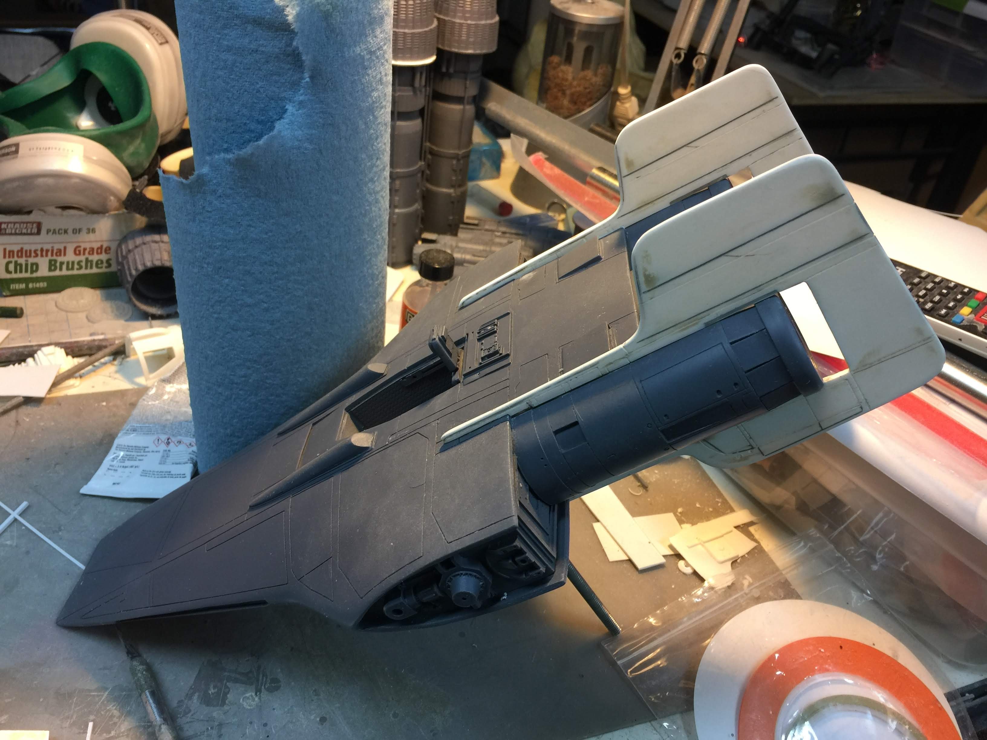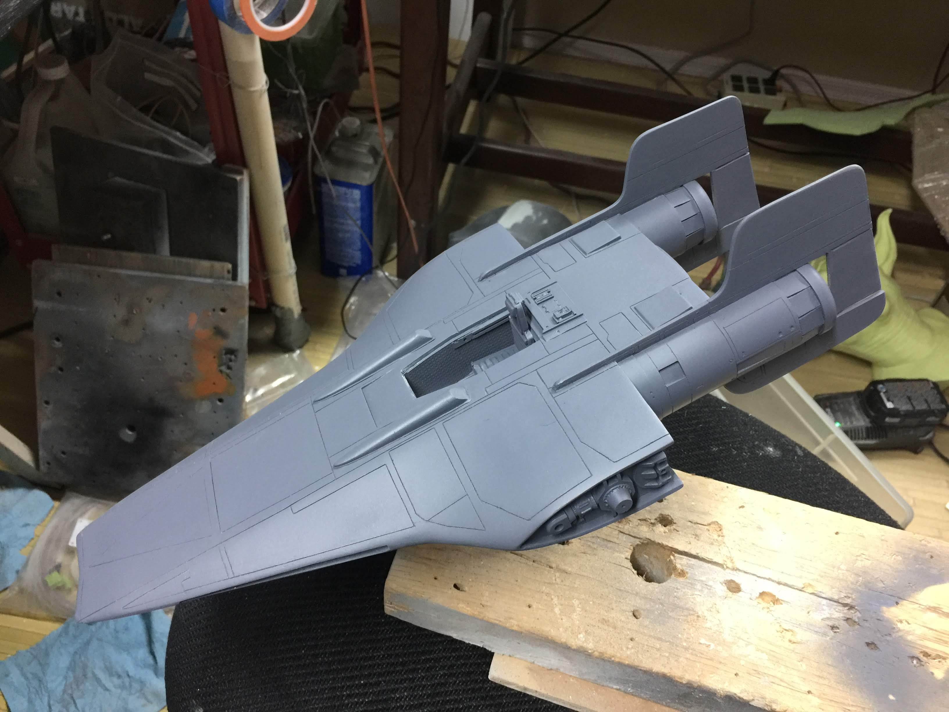 Artist Ralph McQaurrie will always be remembered for his brilliant and imaginative work in the film and art industry. A many of his designs were used for popular science fiction films… of which this one made it into the Star Wars universe. If real, this concept A-Wing is much larger than the actual A-Wing that we saw in Return of the Jedi. When artist Richard Long patterned a kit of it, I wanted one greatly. I eventually was able to get this kit direct from Richard Long, and even arrange the pattern sale to KORBANTH, who may begin selling it soon. That stated… this model was masterfully built up by artist Dan Grumeretz for our display here. Dan took time to really follow what McQuarrie had painted. In recent years, the series Star Wars Rebels began using this design, albeit slightly different, against the growing Imperial menace. Needless to say, even though that show is amazing, I wanted this to be a tribute to Ralph McQuarrie, and as such… Dan made it so. He slightly modified this model in panel lines, and even shape. The front nose in the paintings is not straight, but V-shaped. Even the new toy missed that one. I am very pleased with Dan’s work on this. I believe Ralph would have liked this. Ble Screen Photos will soon be shown.
