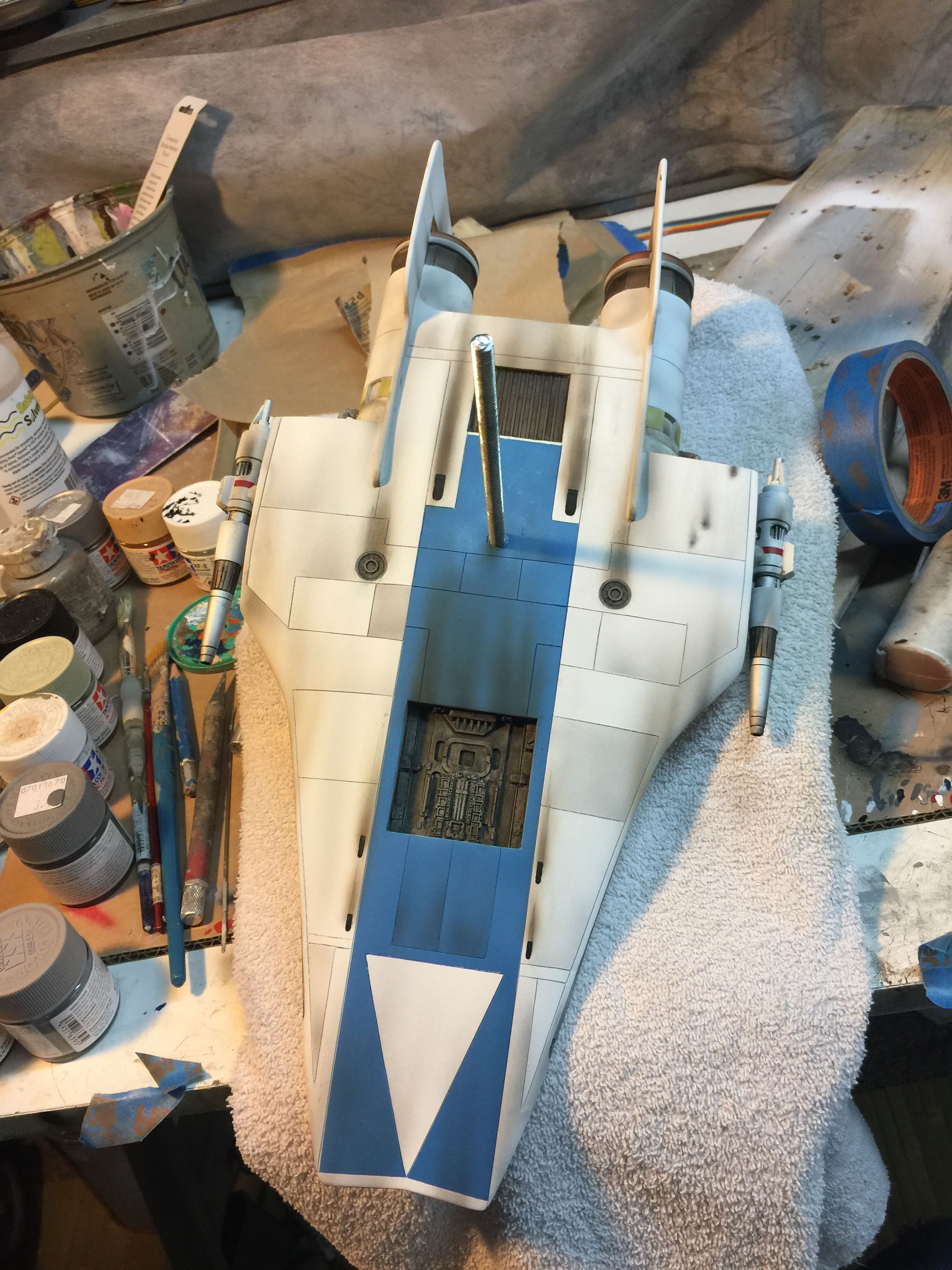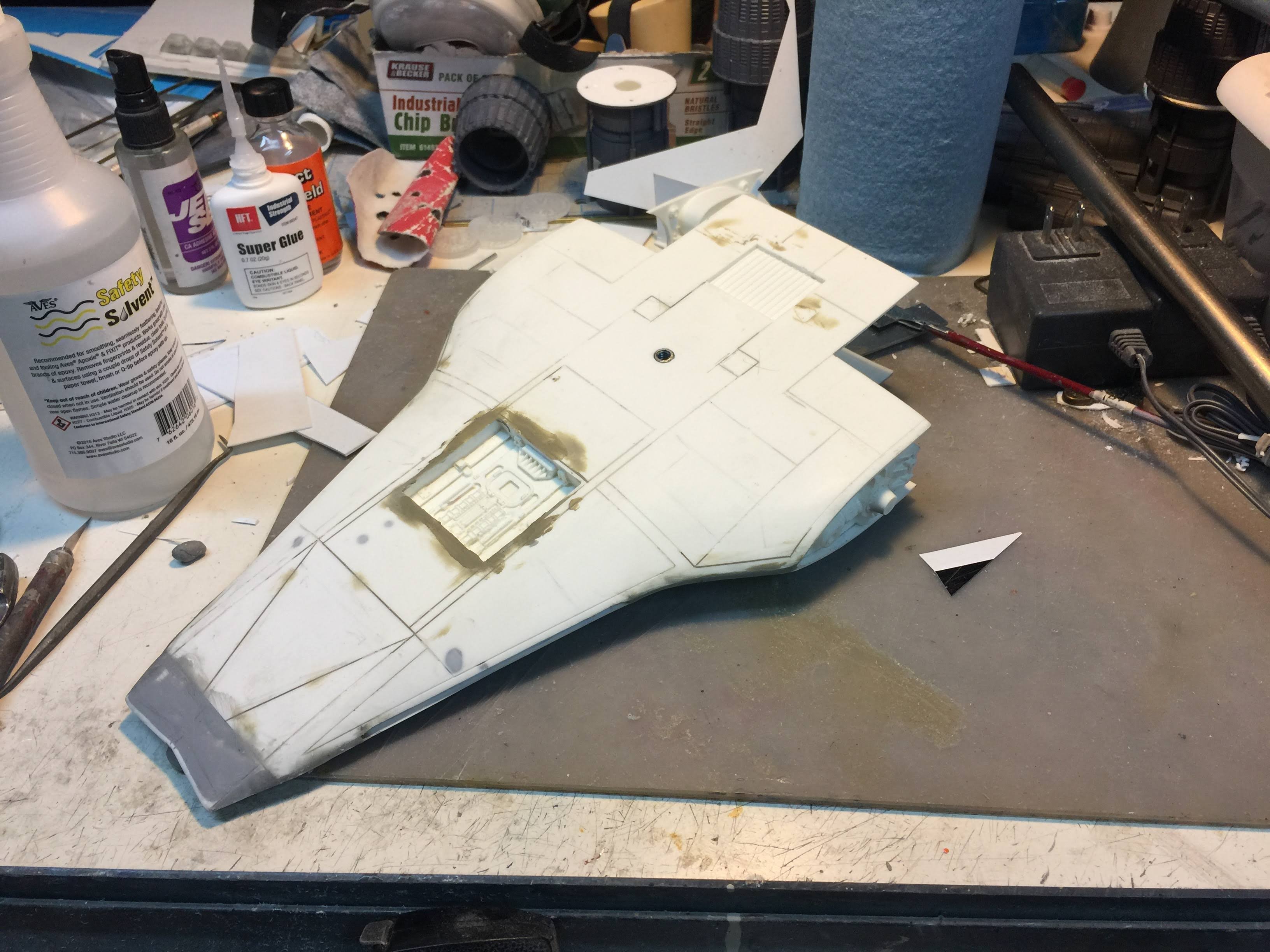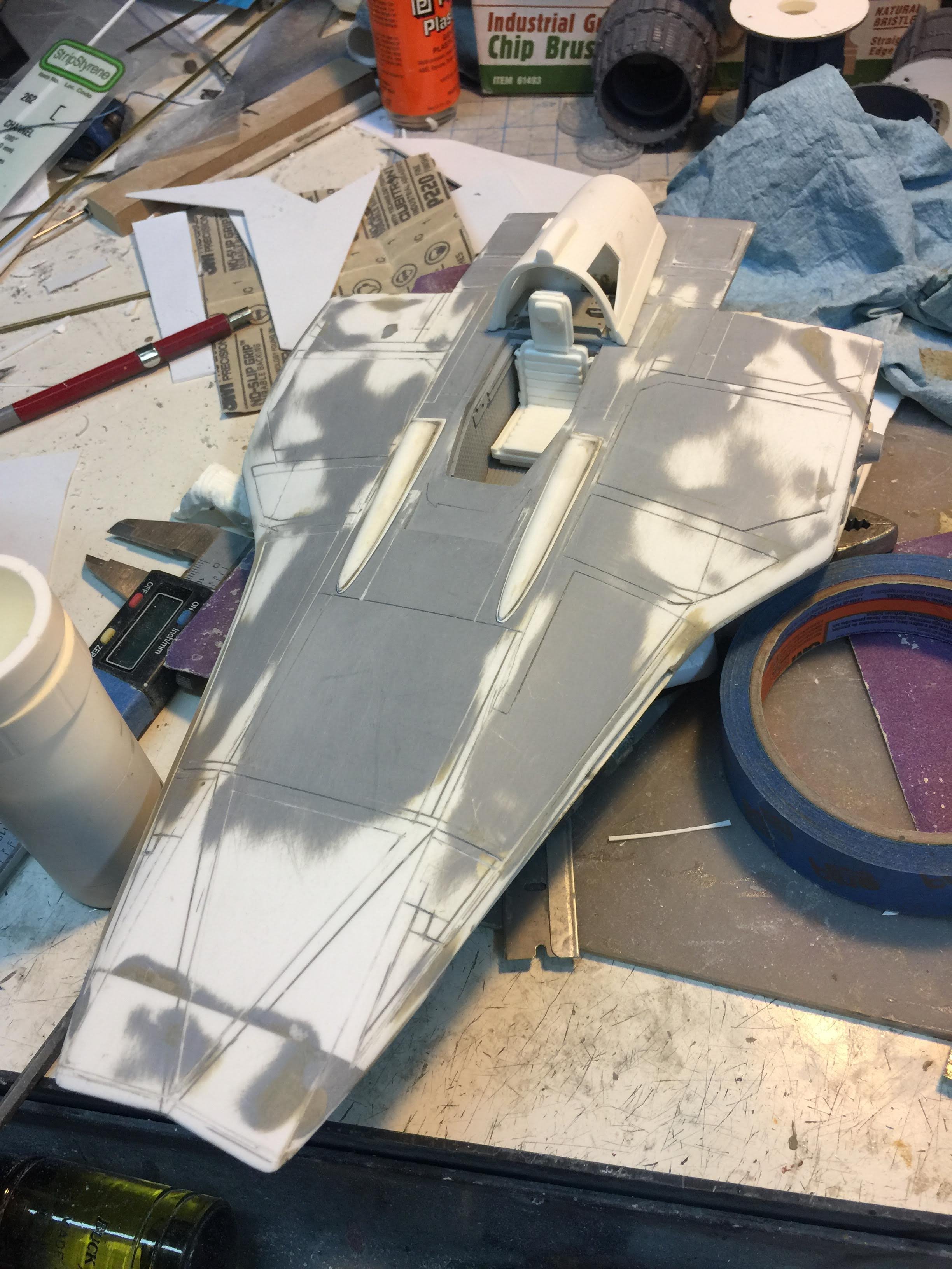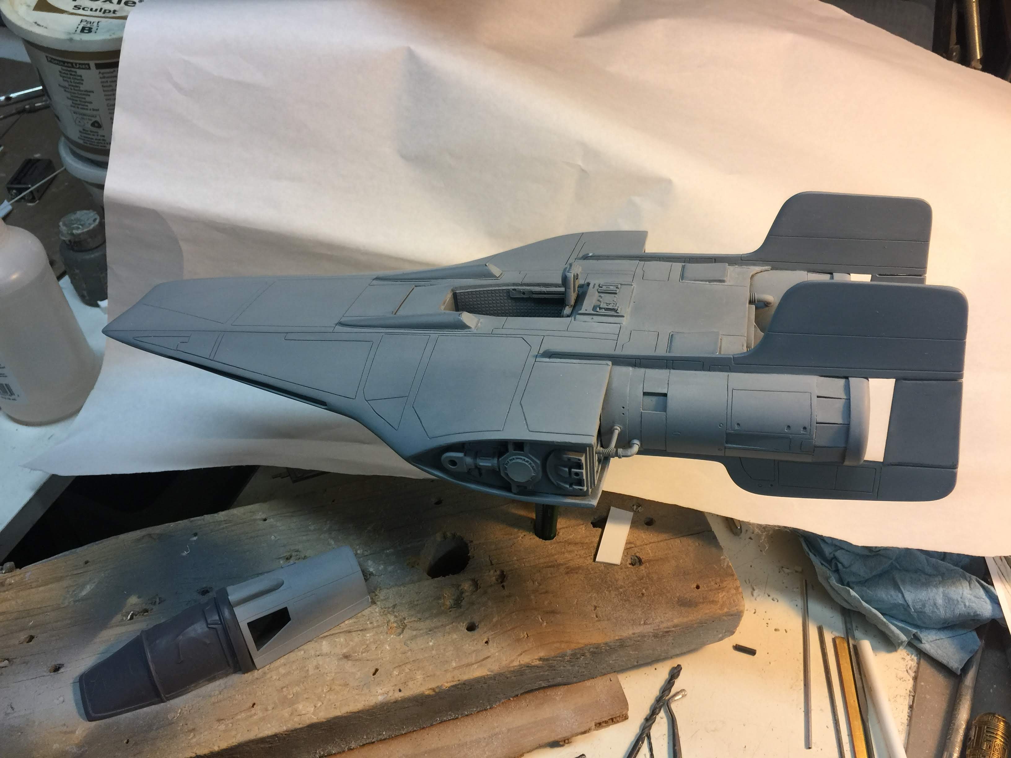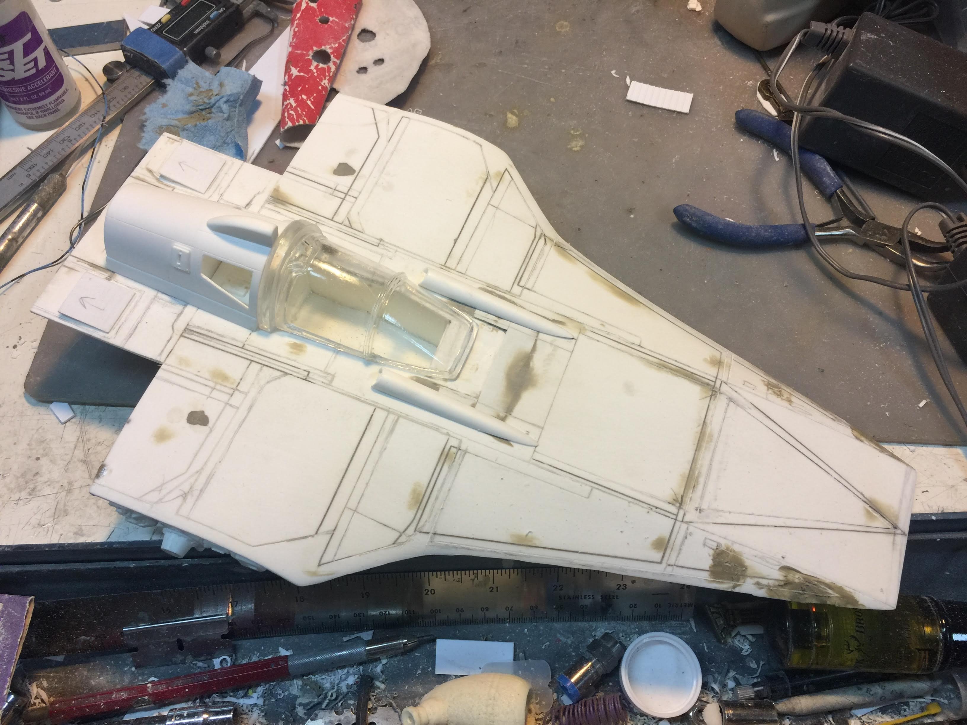 Artist Ralph McQaurrie will always be remembered for his brilliant and imaginative work in the film and art industry. A many of his designs were used for popular science fiction films… of which this one made it into the Star Wars universe. If real, this concept A-Wing is much larger than the actual A-Wing that we saw in Return of the Jedi. When artist Richard Long patterned a kit of it, I wanted one greatly. I eventually was able to get this kit direct from Richard Long, and even arrange the pattern sale to KORBANTH, who may begin selling it soon. That stated… this model was masterfully built up by artist Dan Grumeretz for our display here. Dan took time to really follow what McQuarrie had painted. In recent years, the series Star Wars Rebels began using this design, albeit slightly different, against the growing Imperial menace. Needless to say, even though that show is amazing, I wanted this to be a tribute to Ralph McQuarrie, and as such… Dan made it so. He slightly modified this model in panel lines, and even shape. The front nose in the paintings is not straight, but V-shaped. Even the new toy missed that one. I am very pleased with Dan’s work on this. I believe Ralph would have liked this. Ble Screen Photos will soon be shown.
