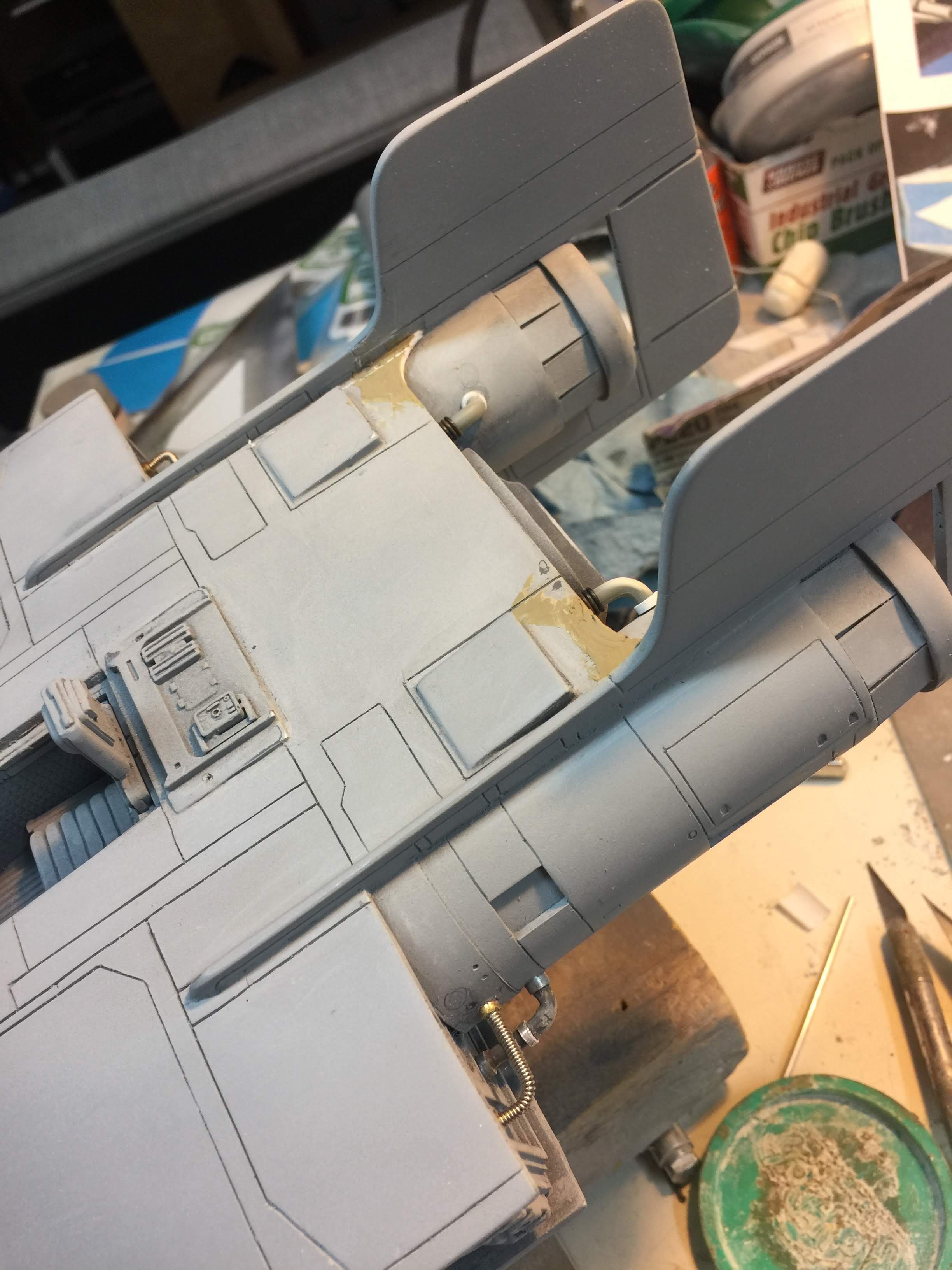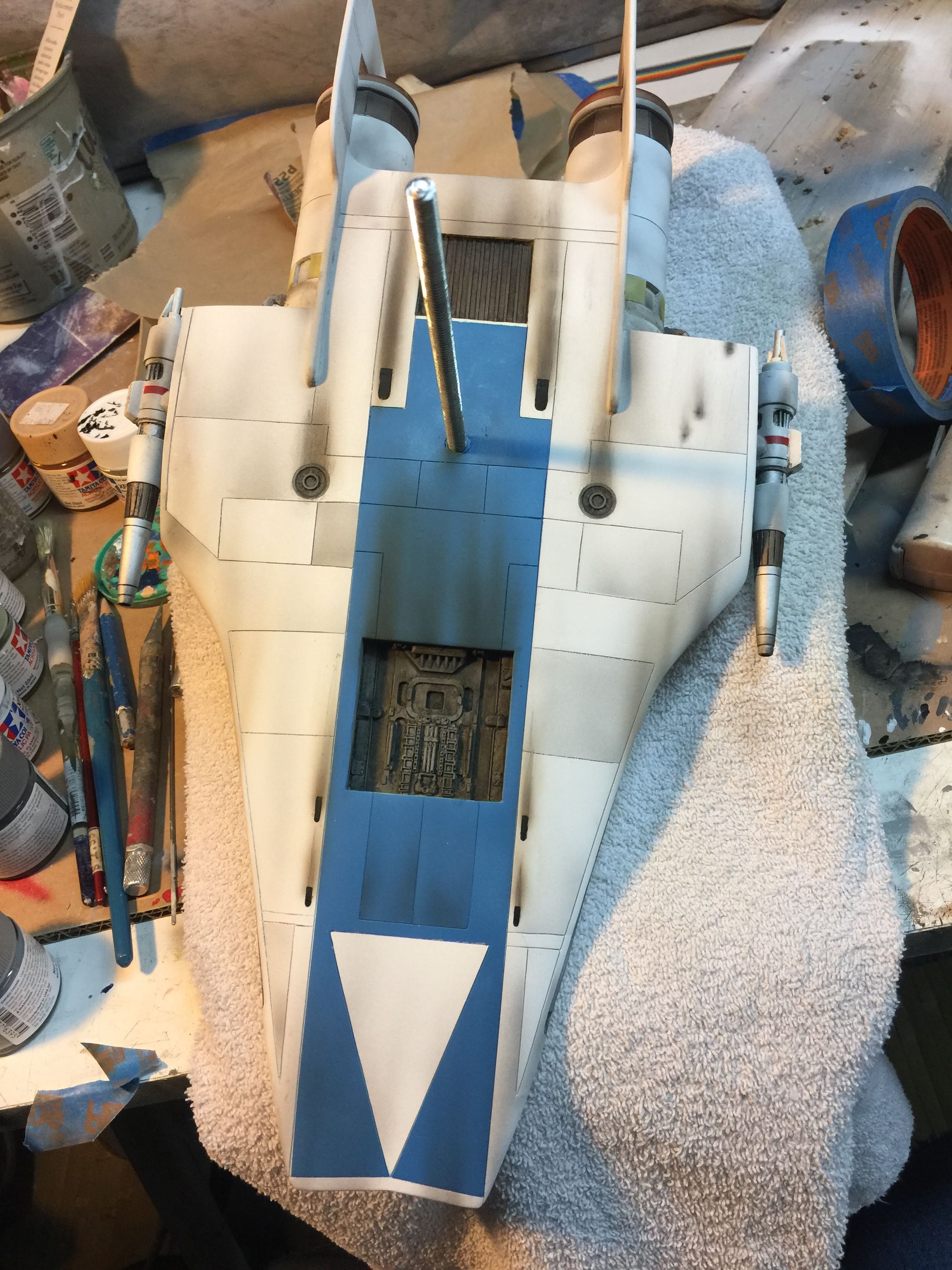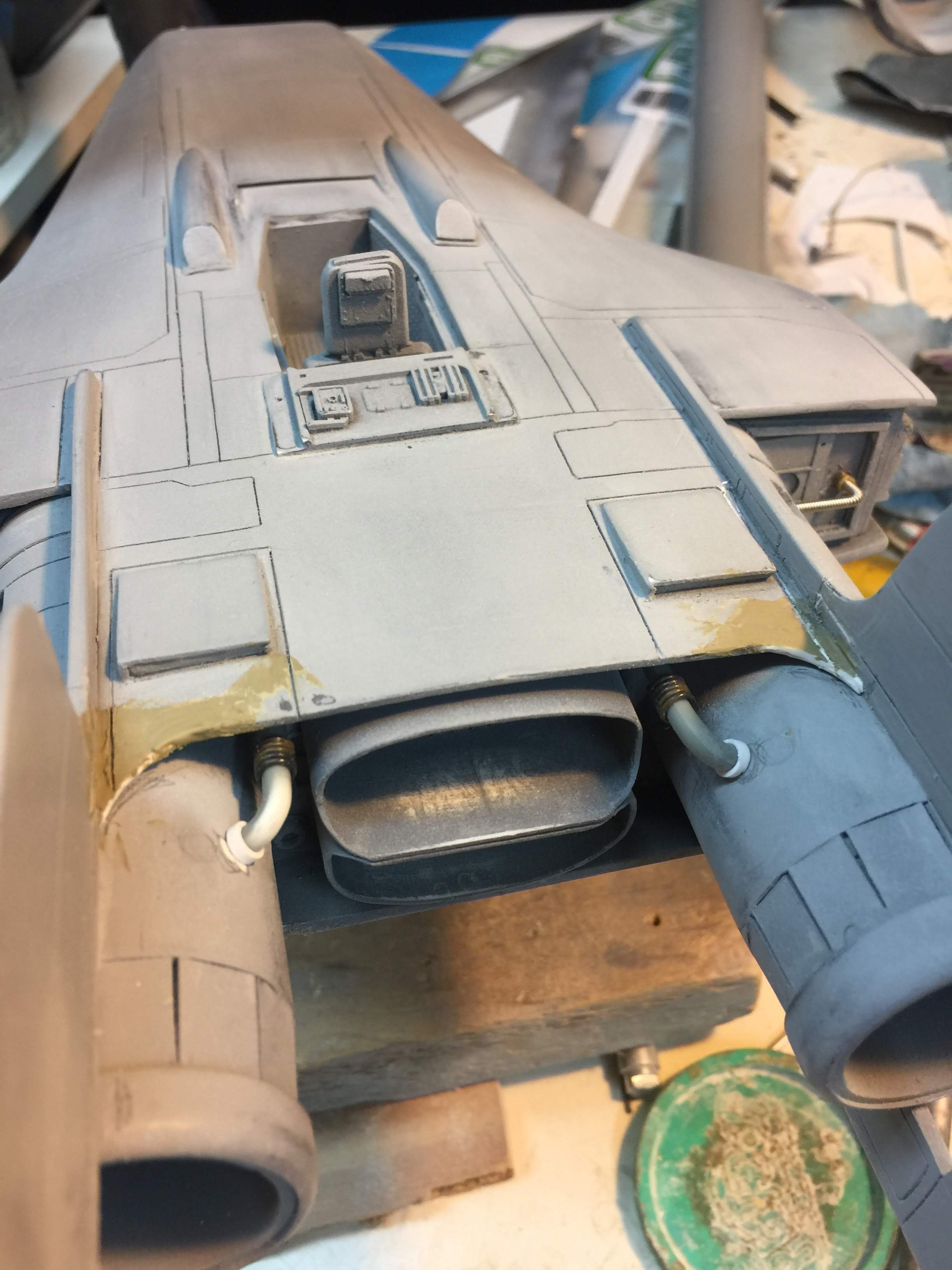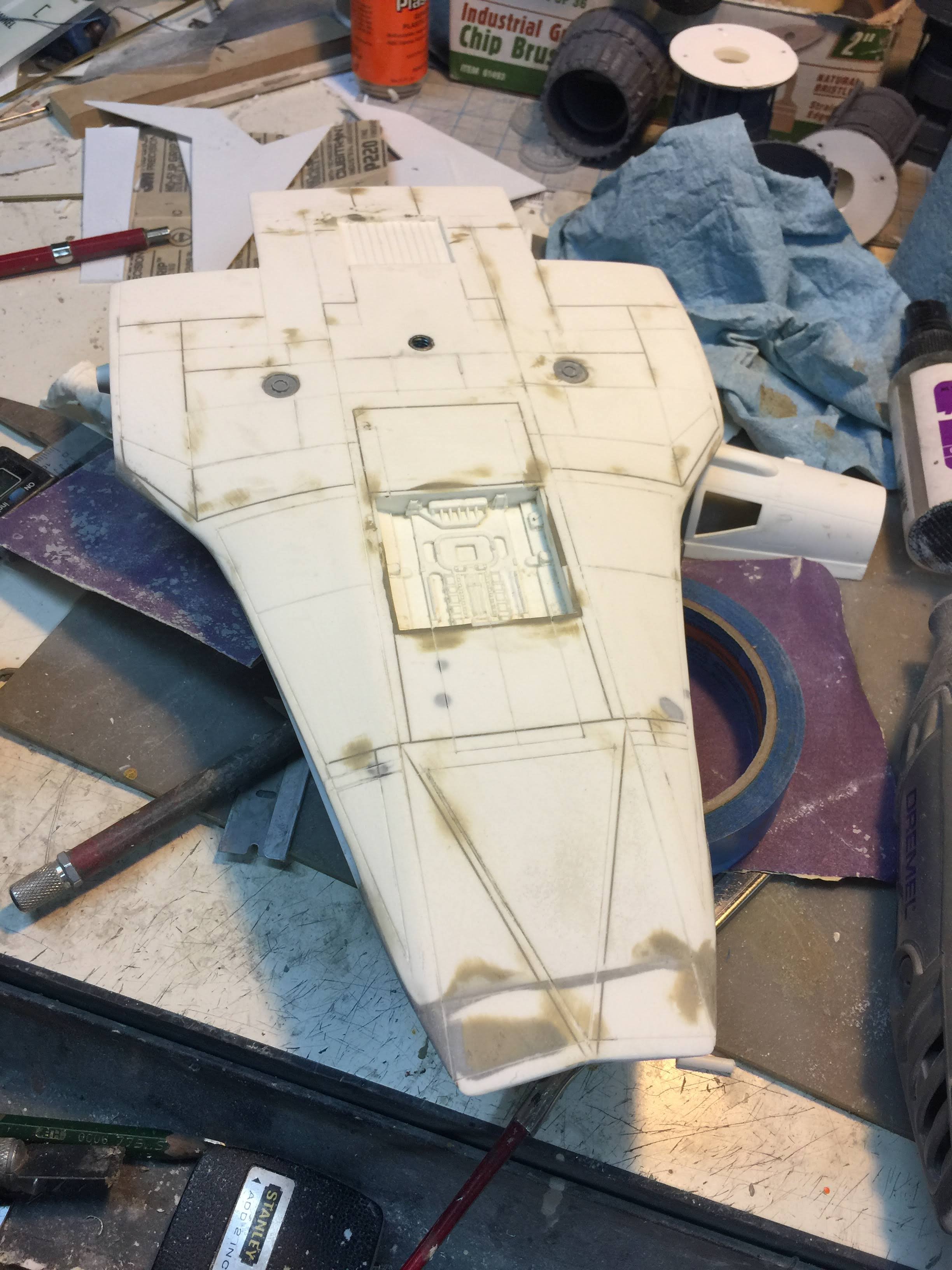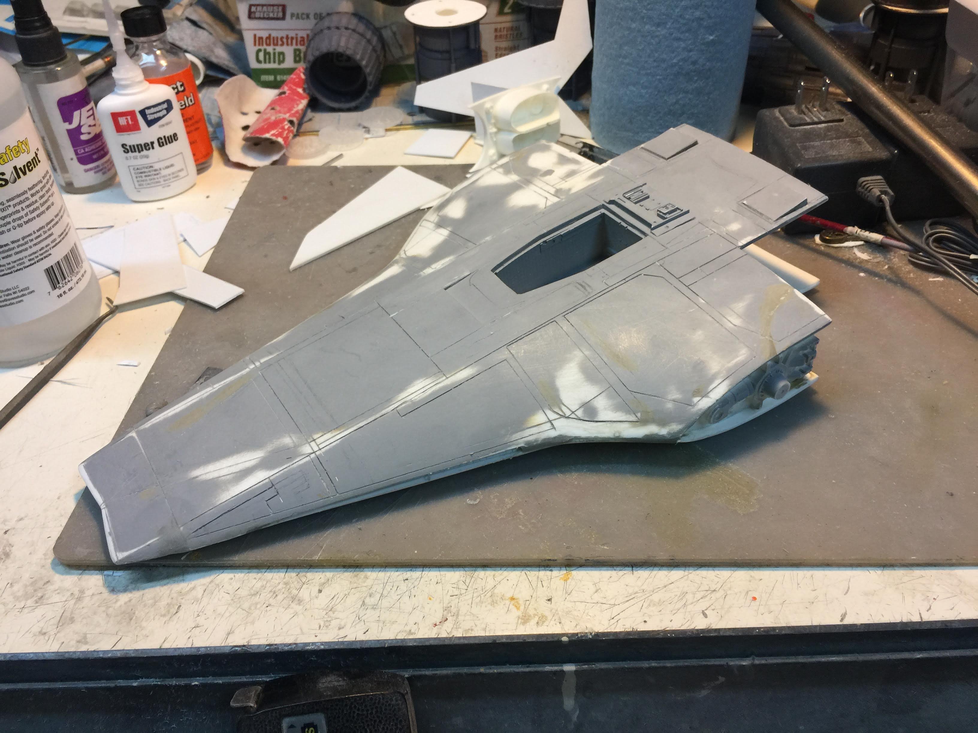 Artist Ralph McQaurrie will always be remembered for his brilliant and imaginative work in the film and art industry. A many of his designs were used for popular science fiction films… of which this one made it into the Star Wars universe. If real, this concept A-Wing is much larger than the actual A-Wing that we saw in Return of the Jedi. When artist Richard Long patterned a kit of it, I wanted one greatly. I eventually was able to get this kit direct from Richard Long, and even arrange the pattern sale to KORBANTH, who may begin selling it soon. That stated… this model was masterfully built up by artist Dan Grumeretz for our display here. Dan took time to really follow what McQuarrie had painted. In recent years, the series Star Wars Rebels began using this design, albeit slightly different, against the growing Imperial menace. Needless to say, even though that show is amazing, I wanted this to be a tribute to Ralph McQuarrie, and as such… Dan made it so. He slightly modified this model in panel lines, and even shape. The front nose in the paintings is not straight, but V-shaped. Even the new toy missed that one. I am very pleased with Dan’s work on this. I believe Ralph would have liked this. Ble Screen Photos will soon be shown.