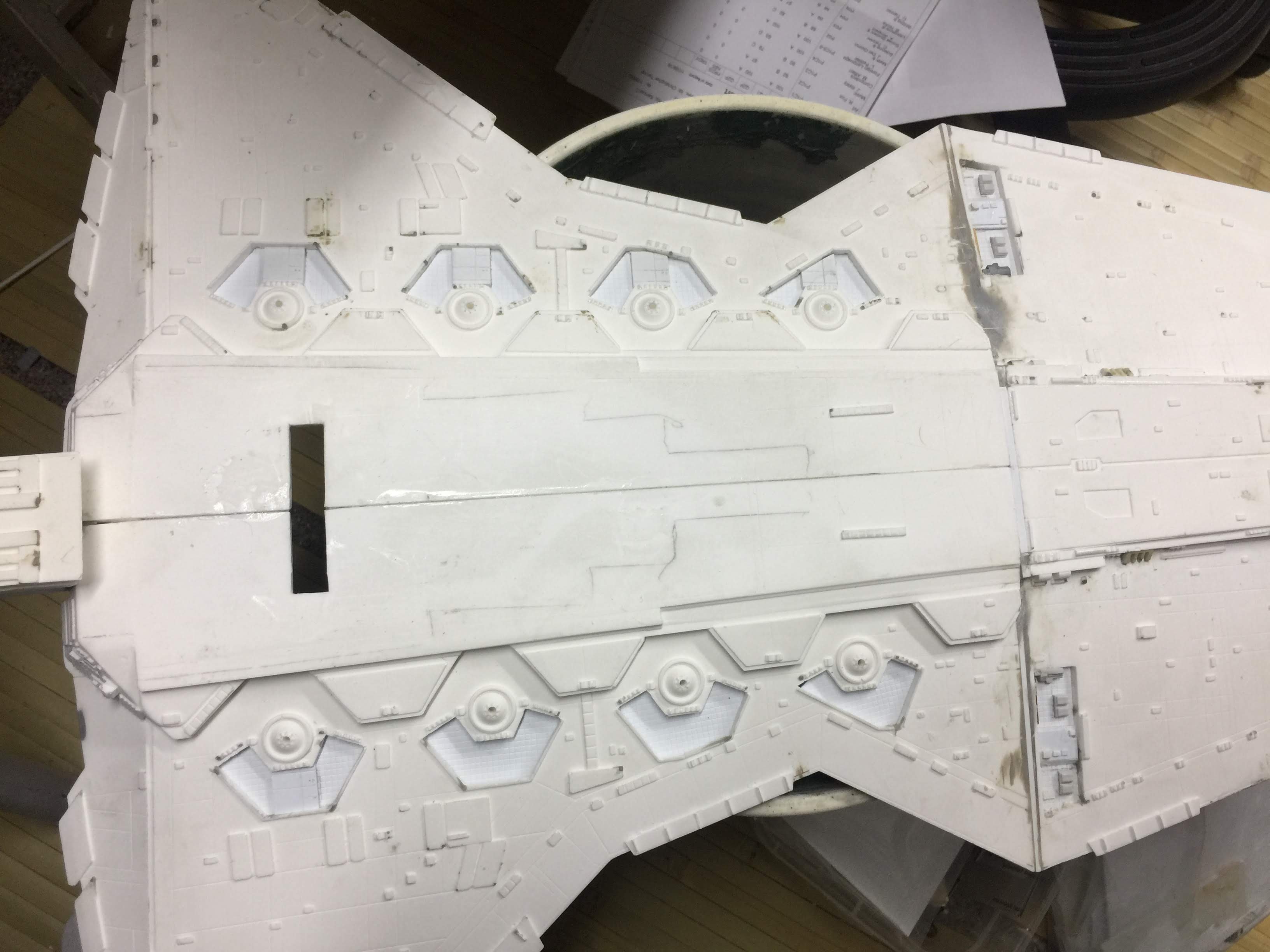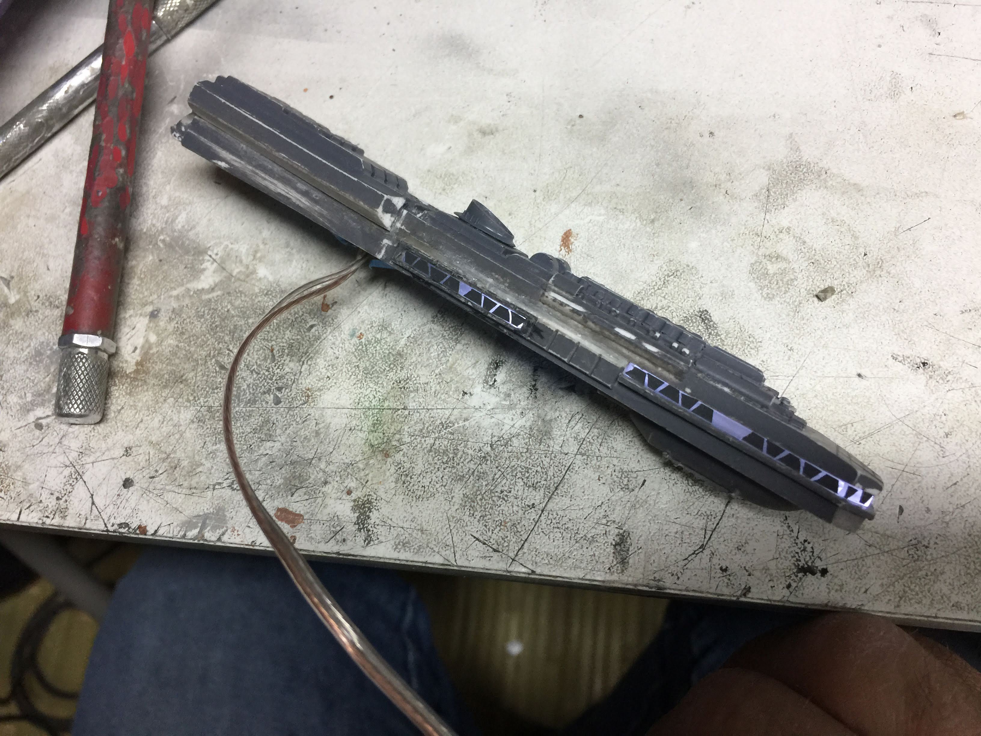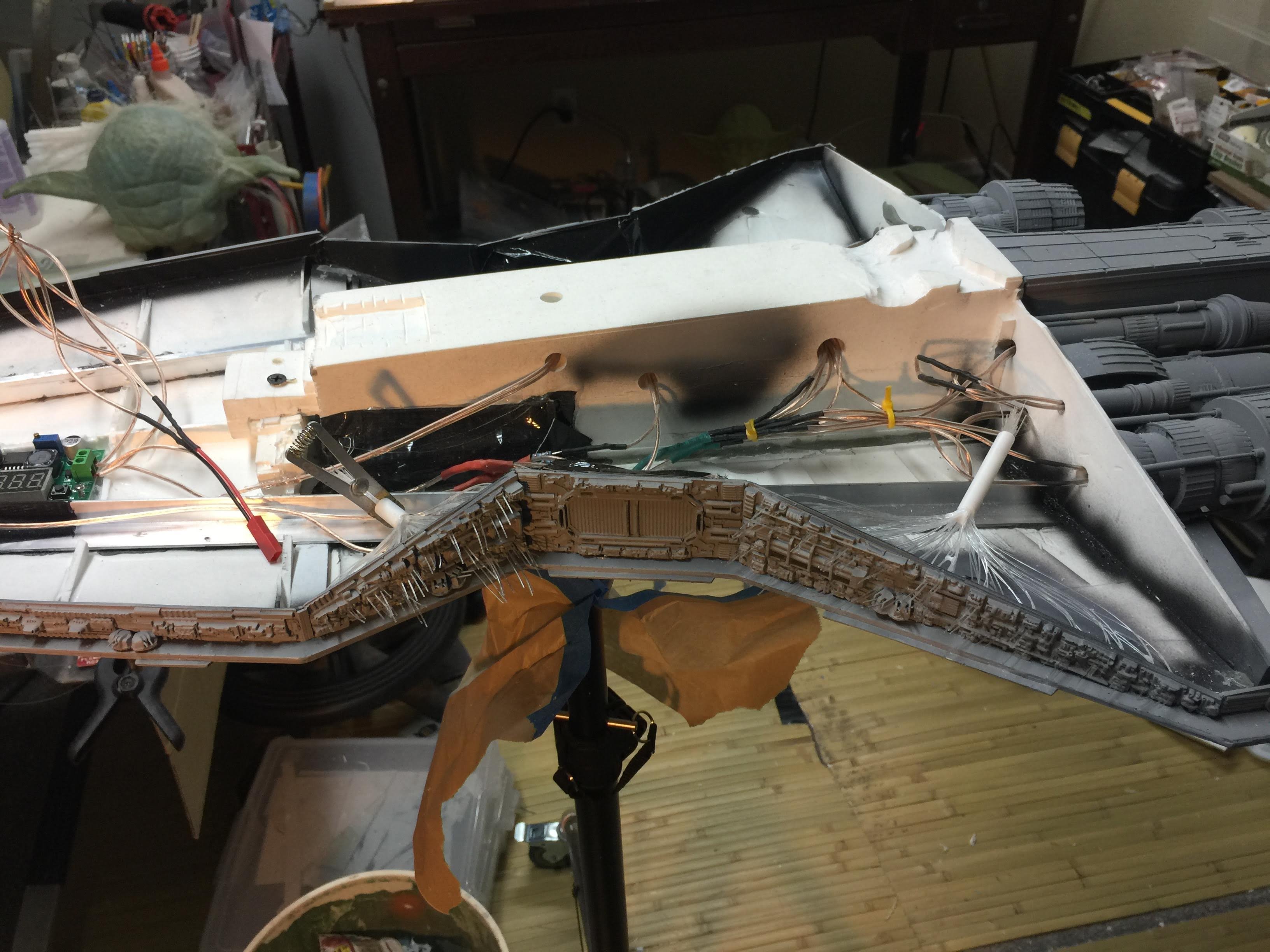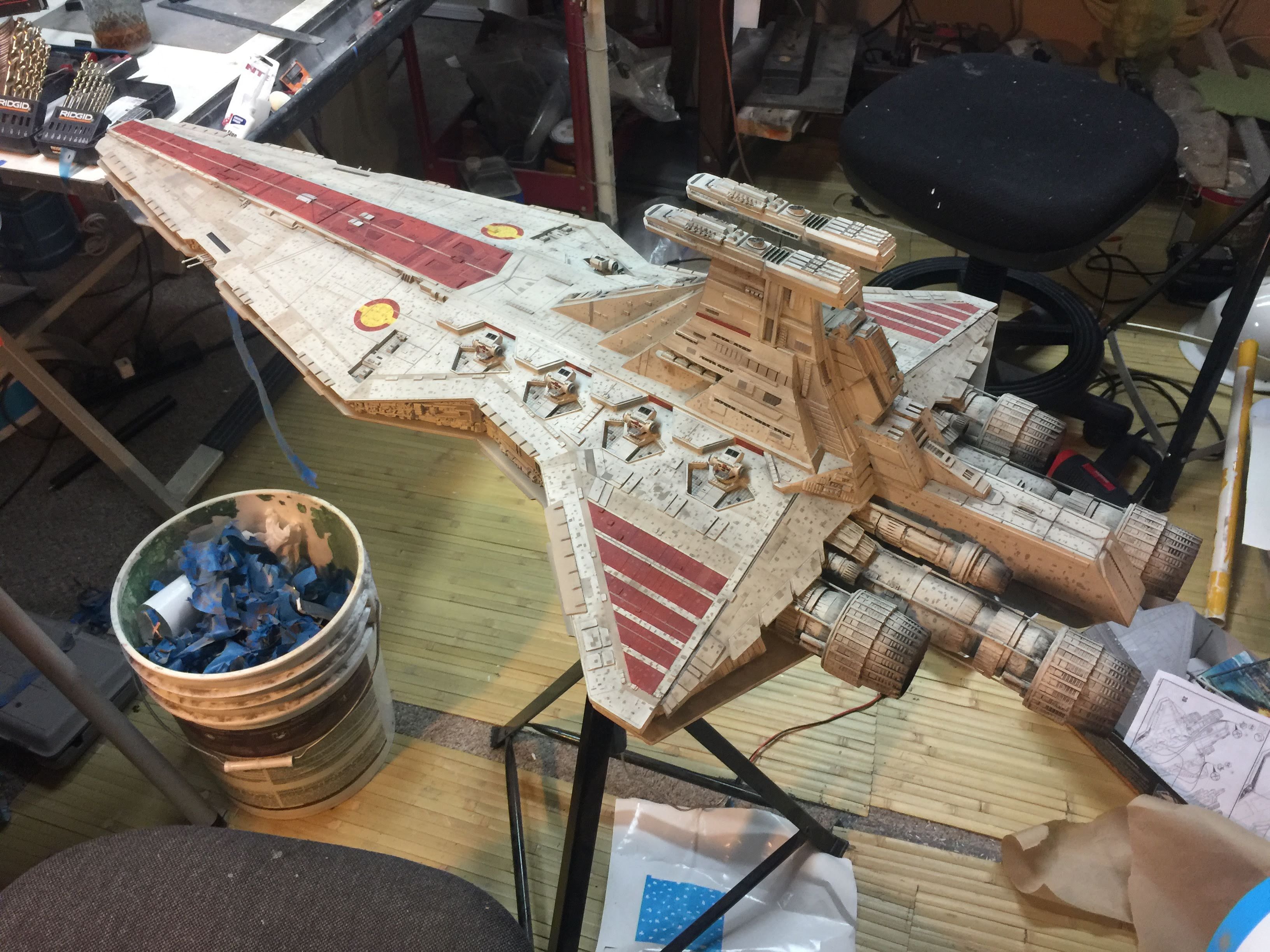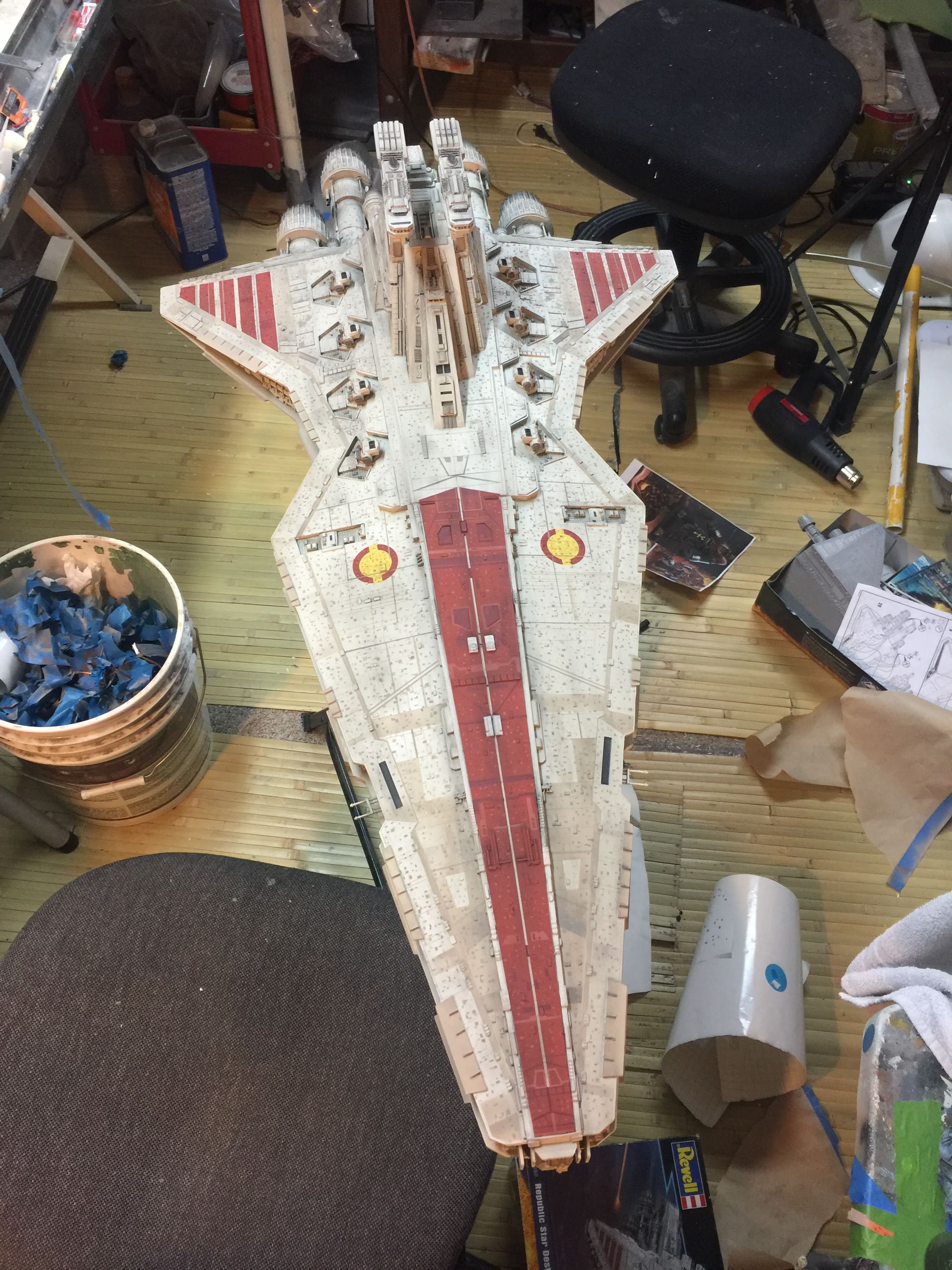 There were many things done to these two kits to make them look like they do. Many modifications to make then each look like what we viewed in the Revenge of the Sith. The kit was patterned after the Revell model, which has been stated as having been created with the digital files. Artist Alfred Wong did a magnificent job making these patterns a much larger version of that kit. That stated, I wanted these to be as movie accurate (from what I viewed) as we could make them at this size (Which when finished measured 40.5 inches… ~1/1000). I state that because we also have a 6 foot Venator in the wings just waiting to be pushed to the bench.