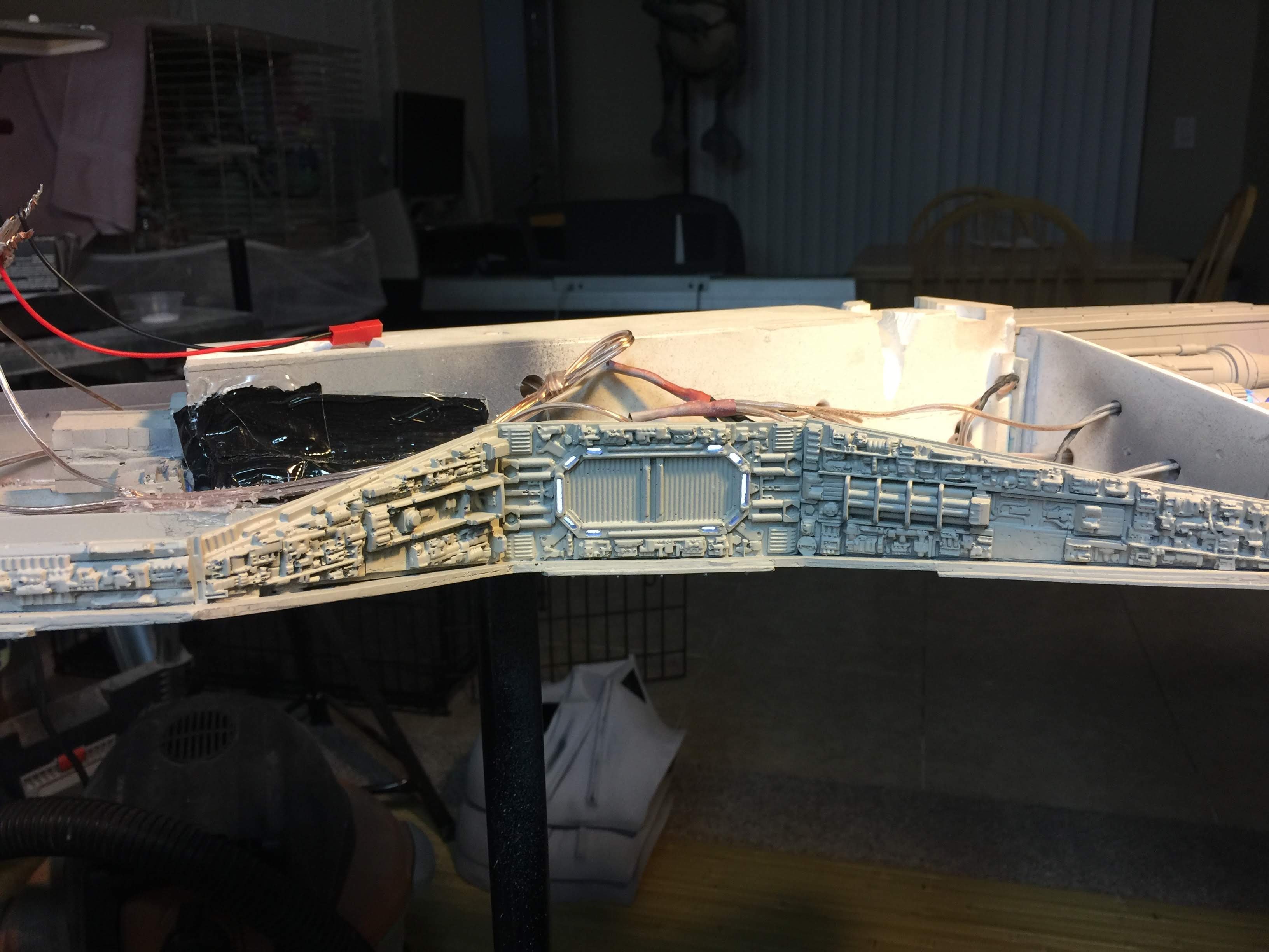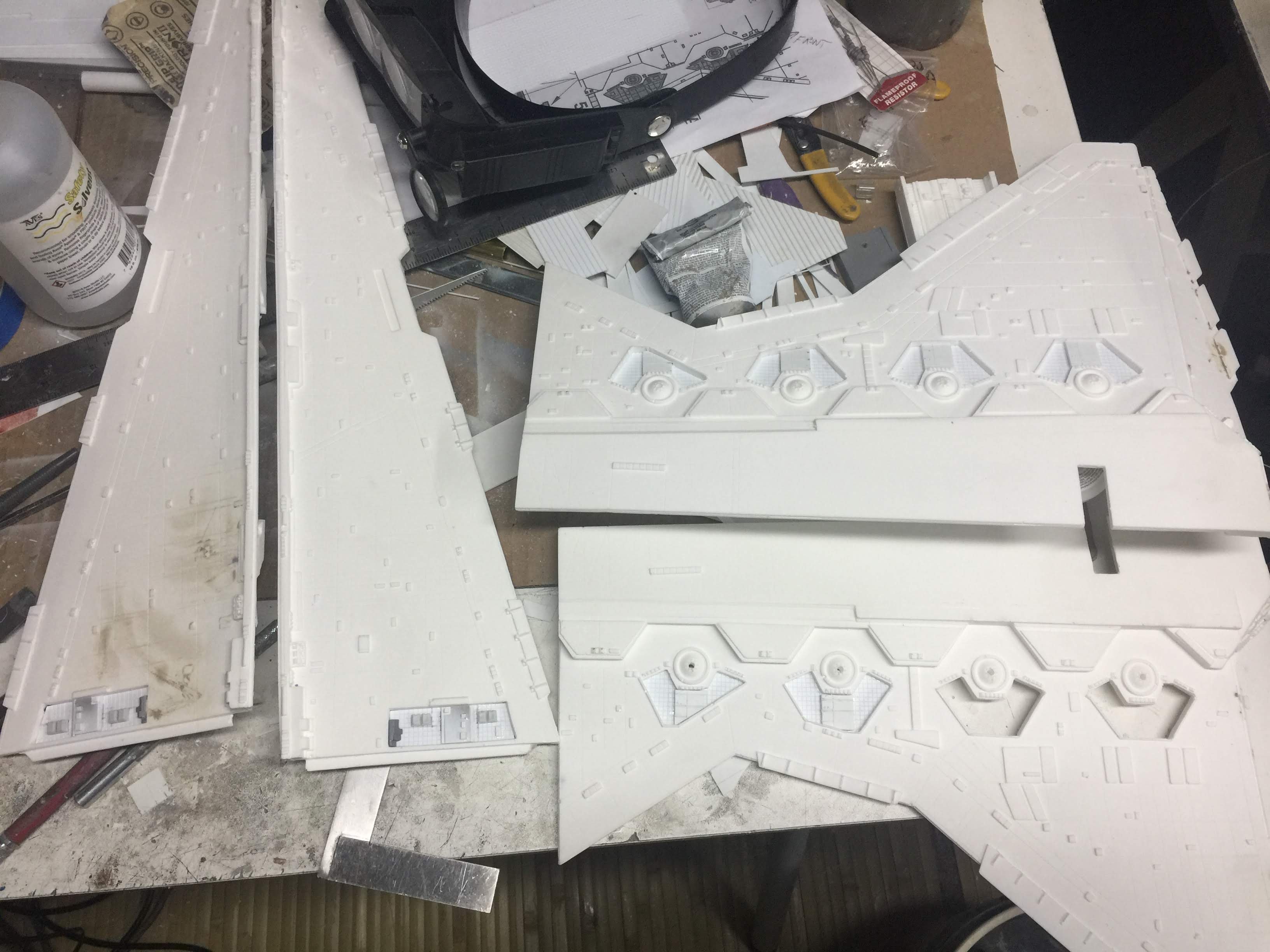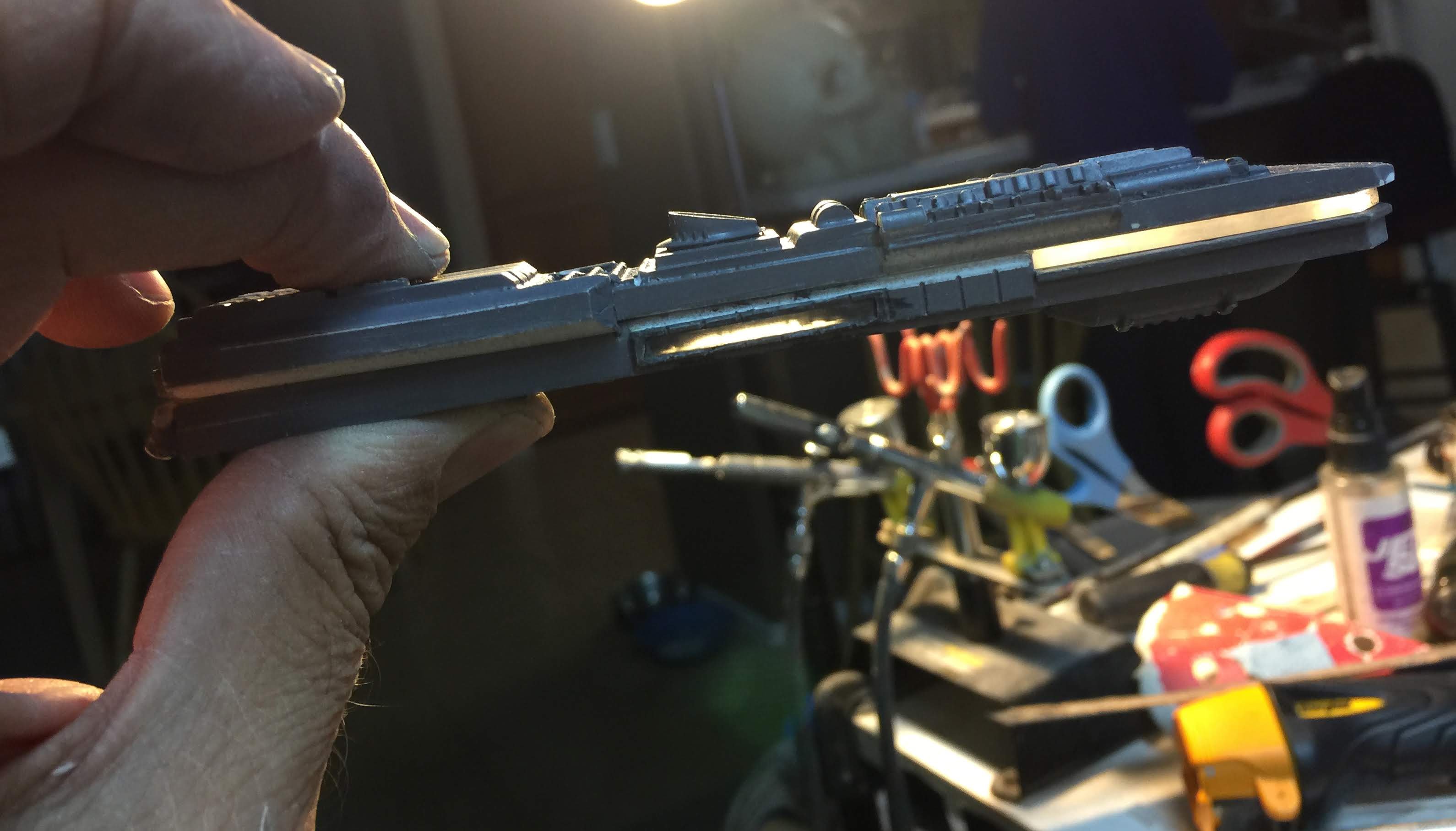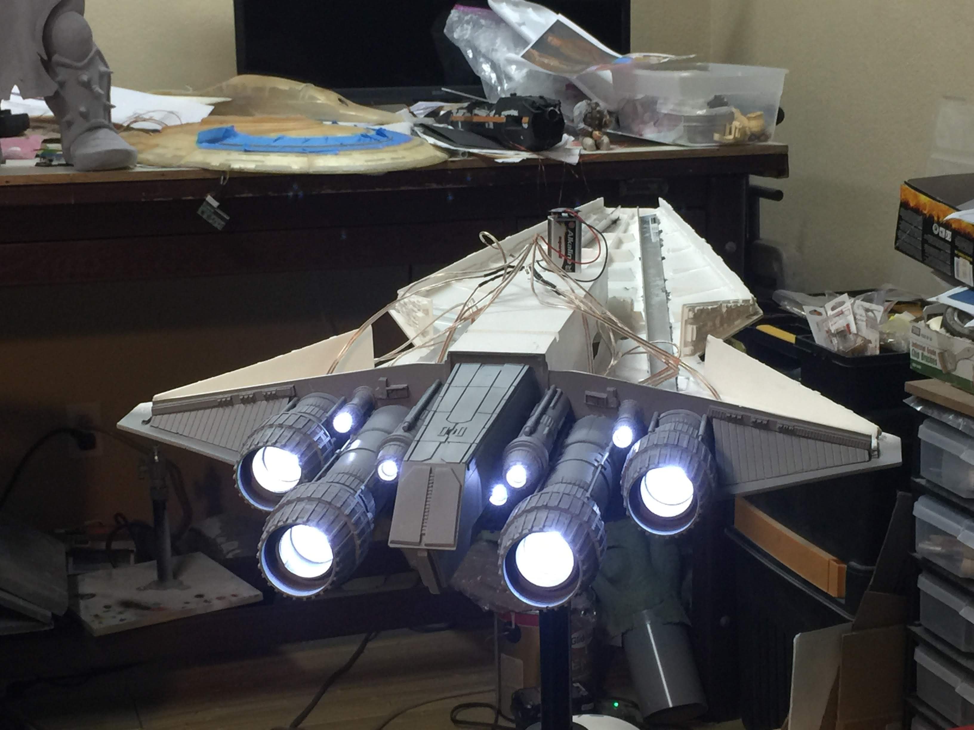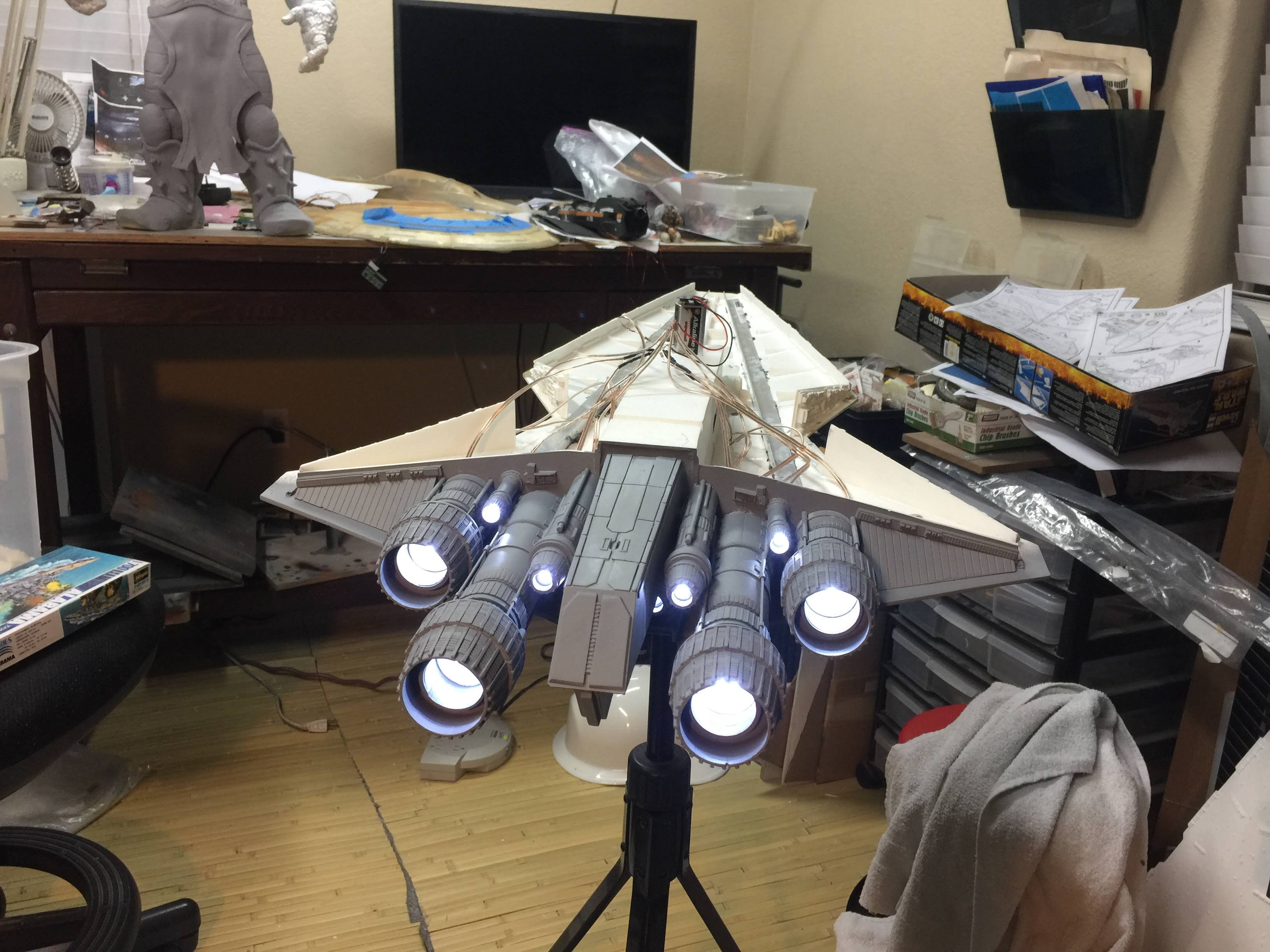 There were many things done to these two kits to make them look like they do. Many modifications to make then each look like what we viewed in the Revenge of the Sith. The kit was patterned after the Revell model, which has been stated as having been created with the digital files. Artist Alfred Wong did a magnificent job making these patterns a much larger version of that kit. That stated, I wanted these to be as movie accurate (from what I viewed) as we could make them at this size (Which when finished measured 40.5 inches… ~1/1000). I state that because we also have a 6 foot Venator in the wings just waiting to be pushed to the bench.
