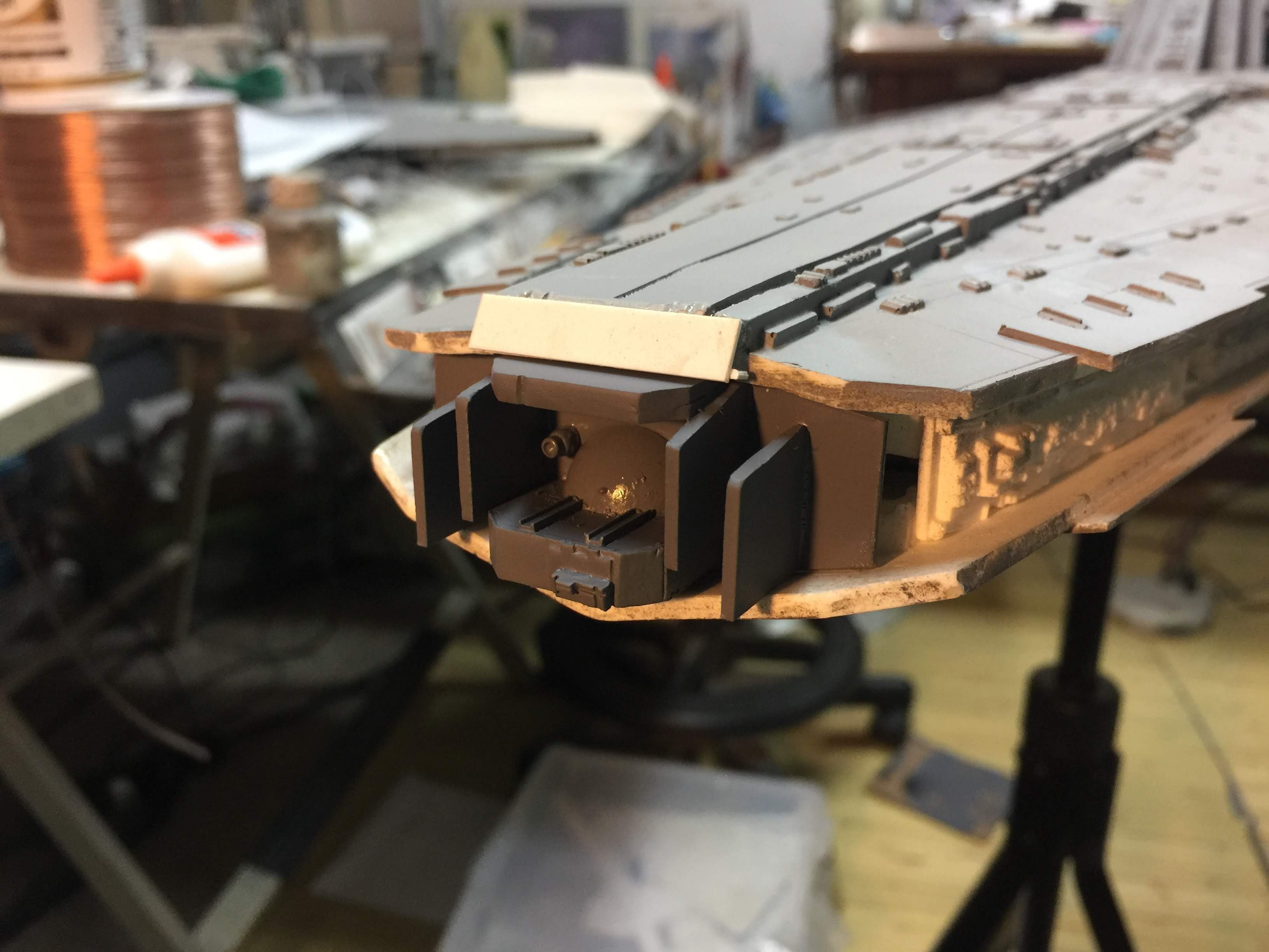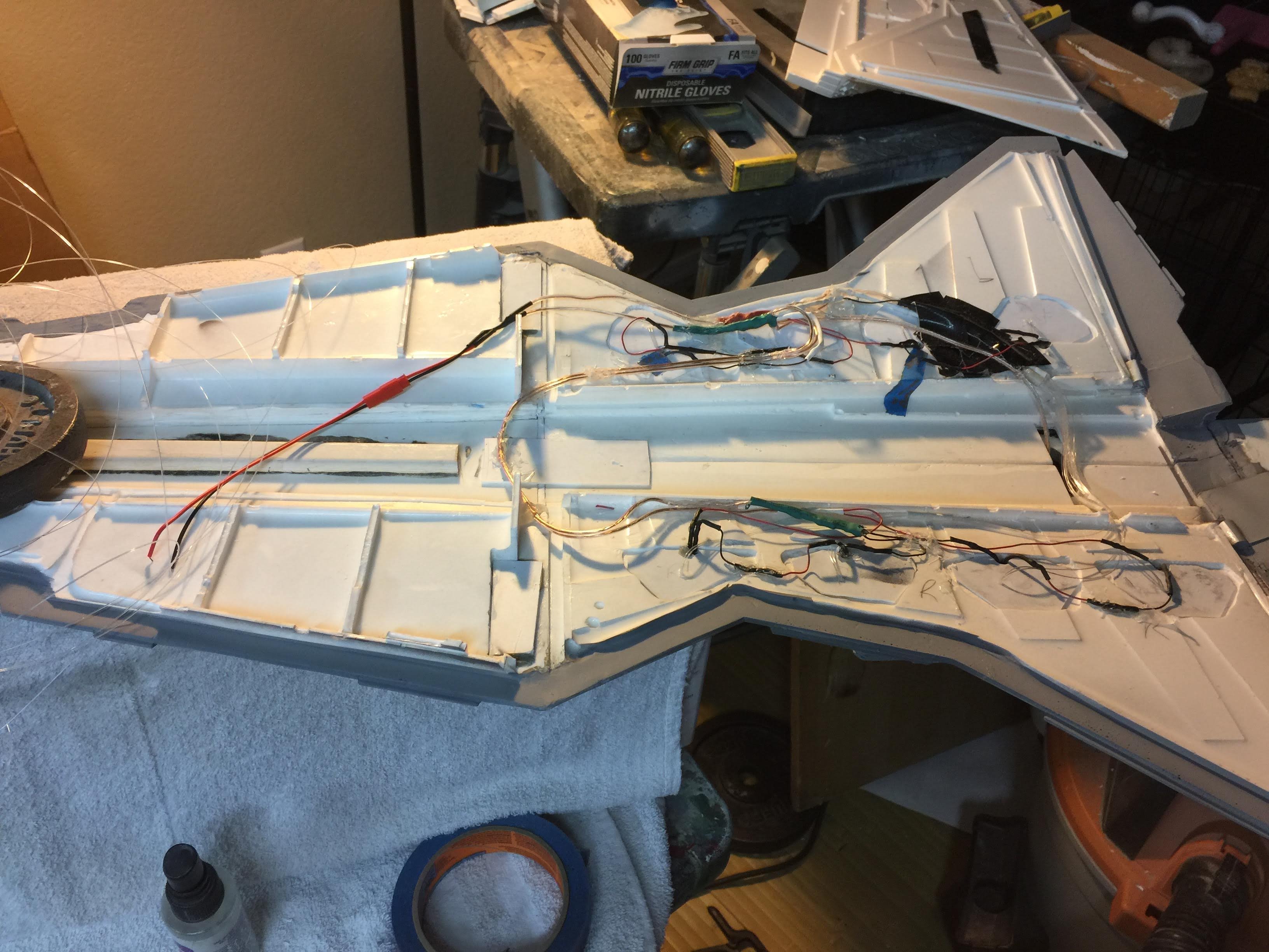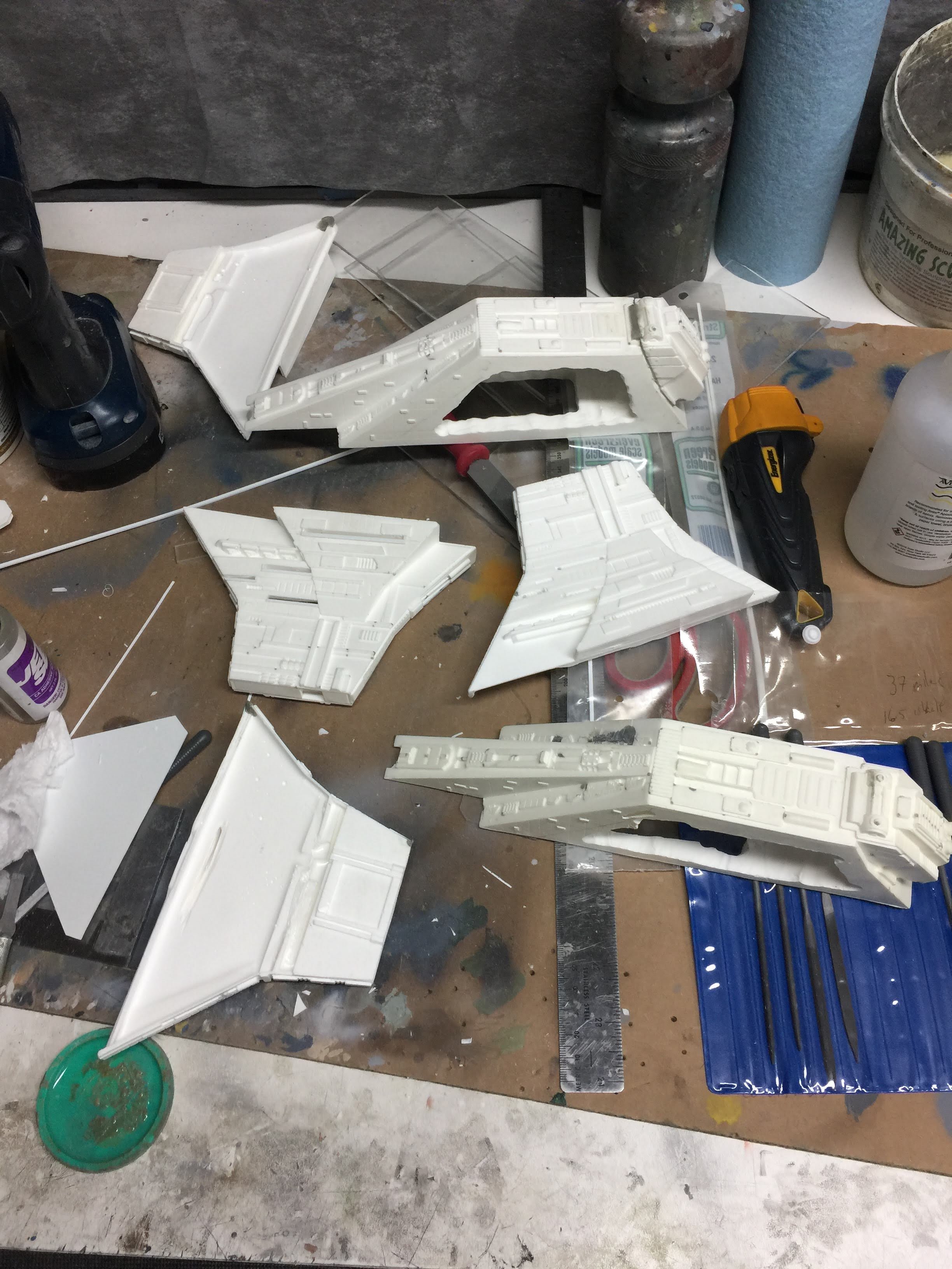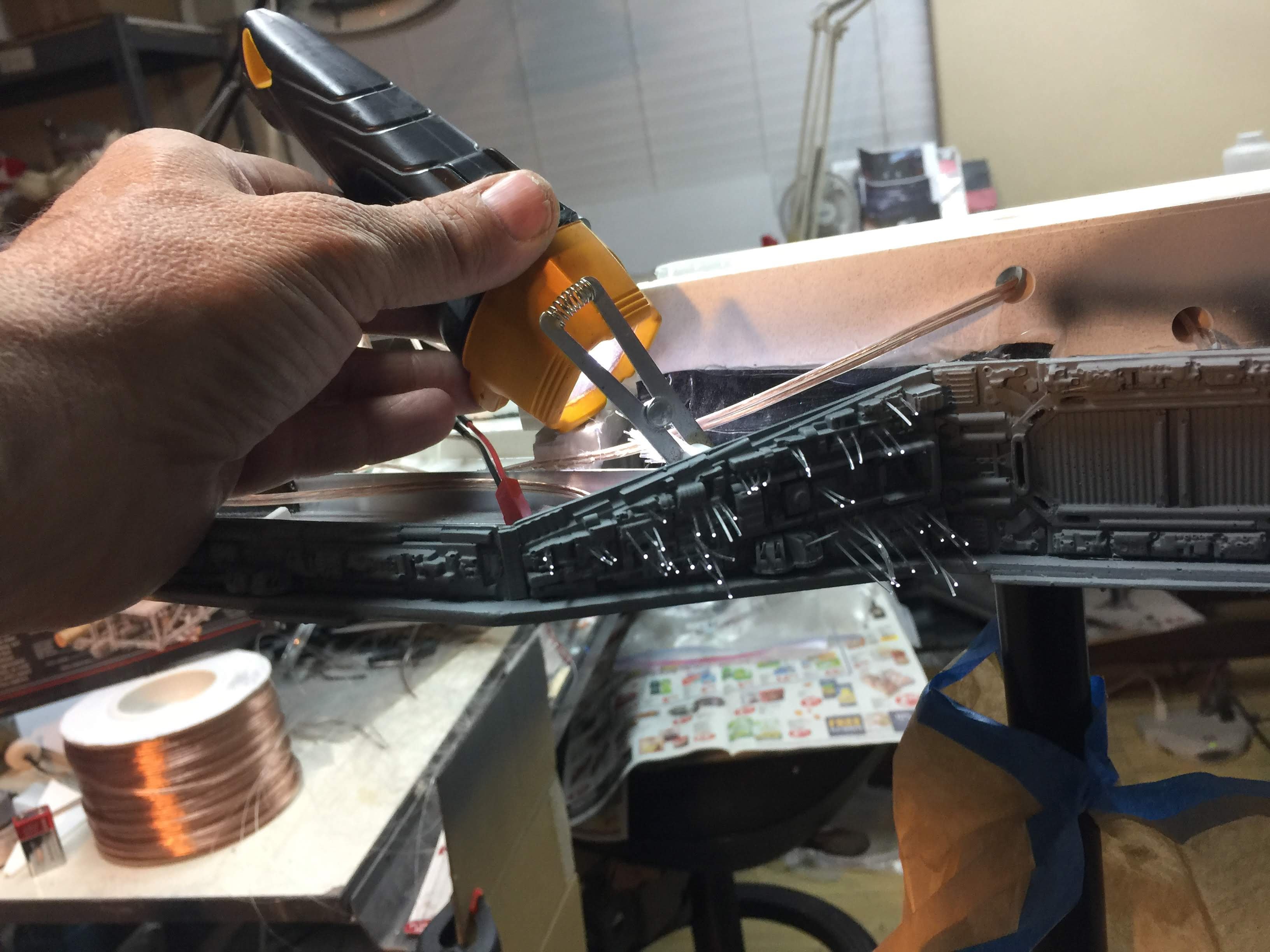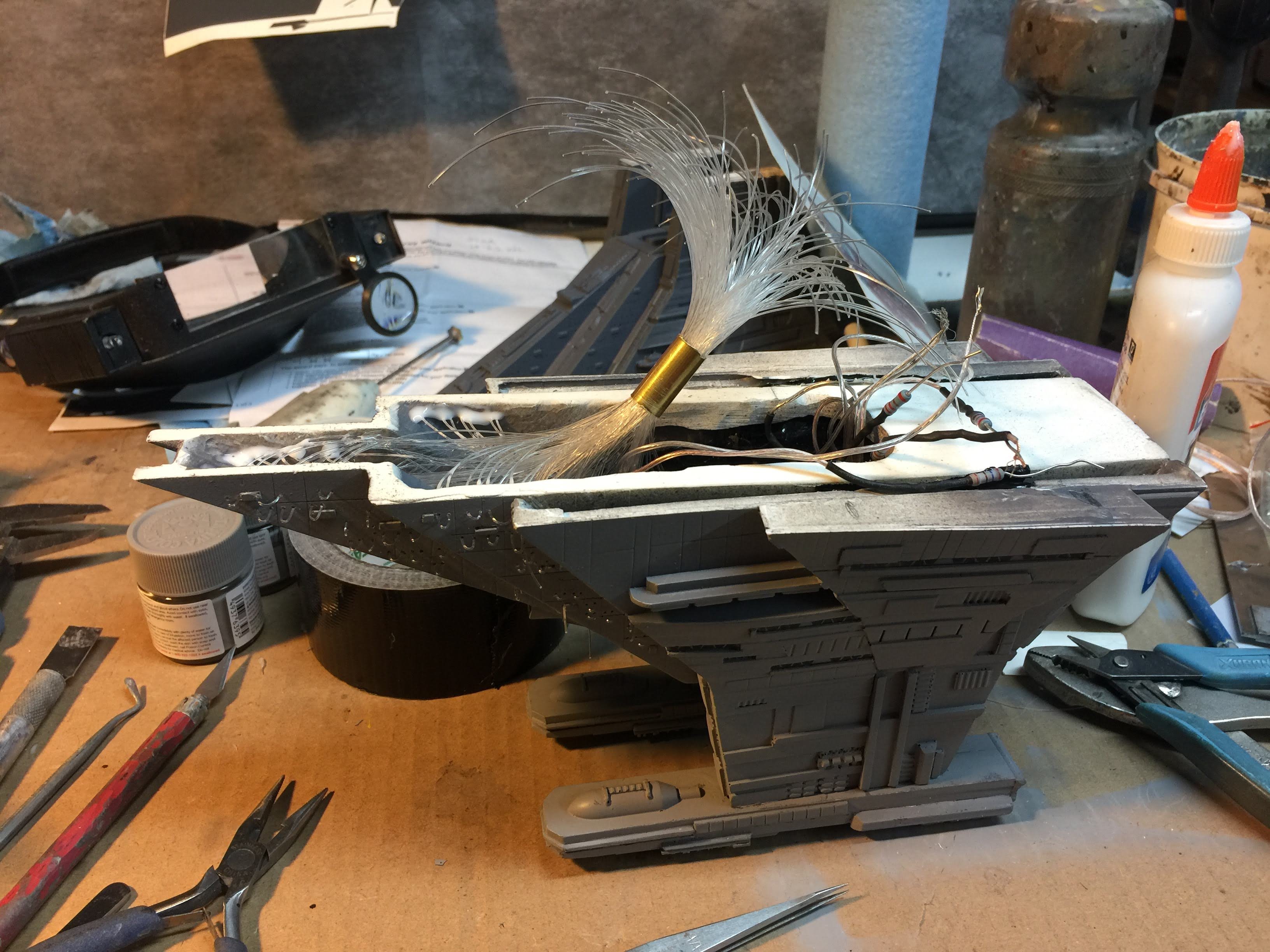 There were many things done to these two kits to make them look like they do. Many modifications to make then each look like what we viewed in the Revenge of the Sith. The kit was patterned after the Revell model, which has been stated as having been created with the digital files. Artist Alfred Wong did a magnificent job making these patterns a much larger version of that kit. That stated, I wanted these to be as movie accurate (from what I viewed) as we could make them at this size (Which when finished measured 40.5 inches… ~1/1000). I state that because we also have a 6 foot Venator in the wings just waiting to be pushed to the bench.