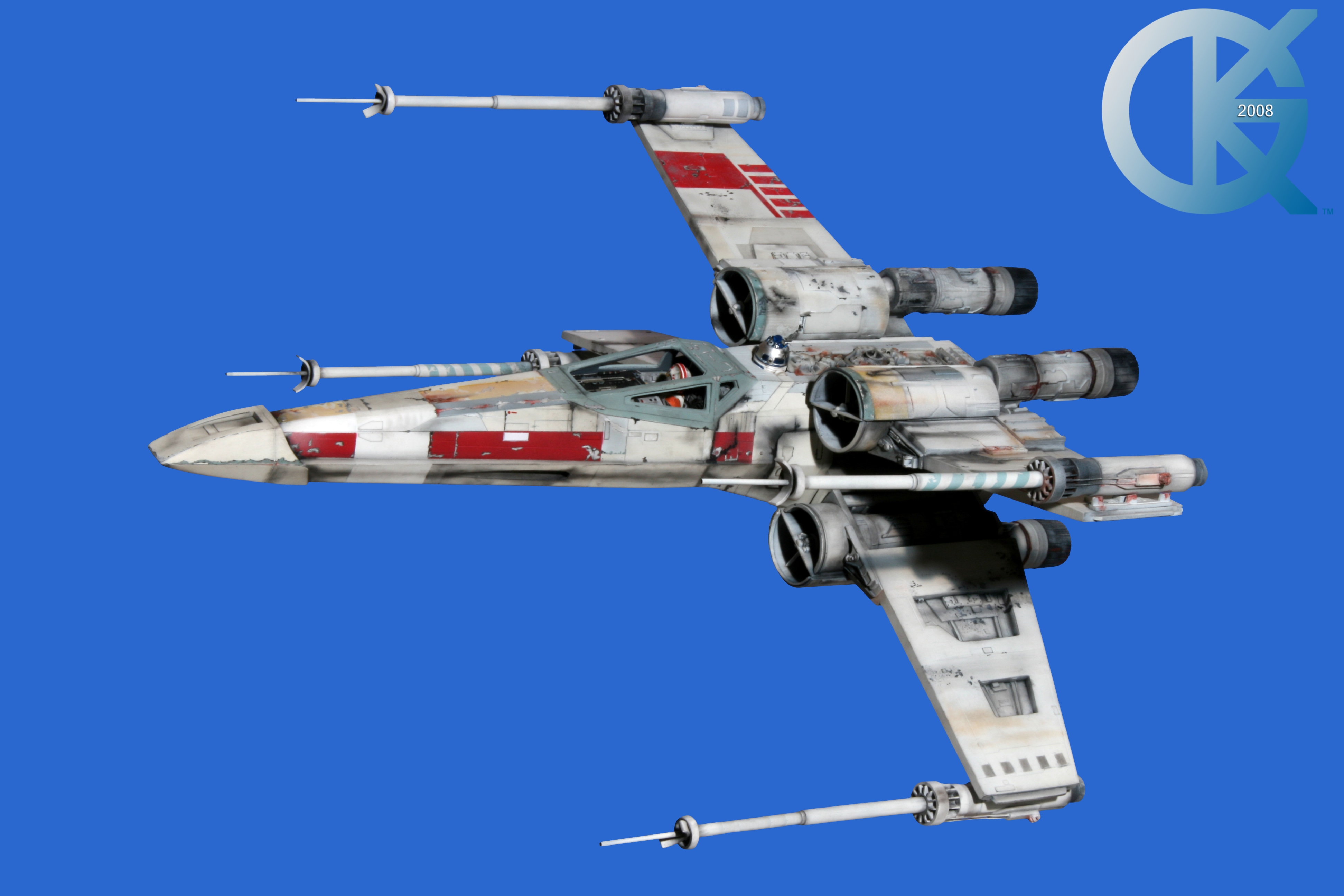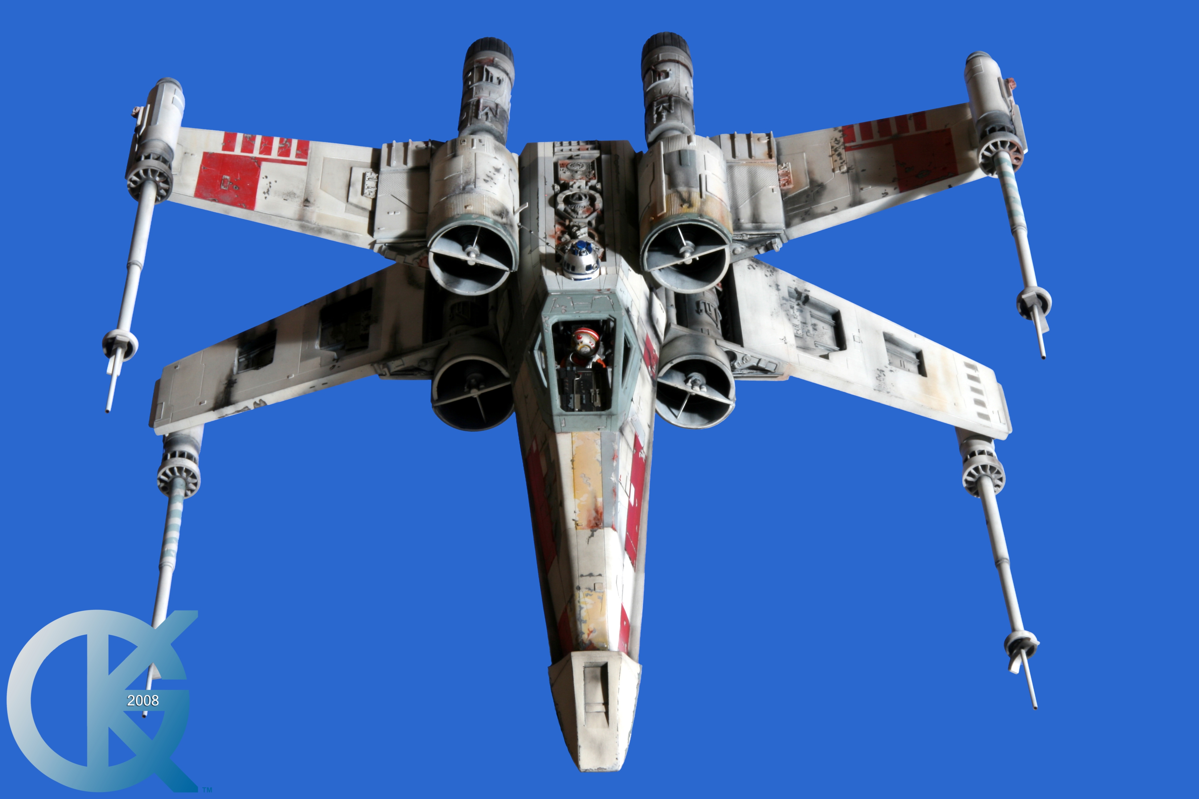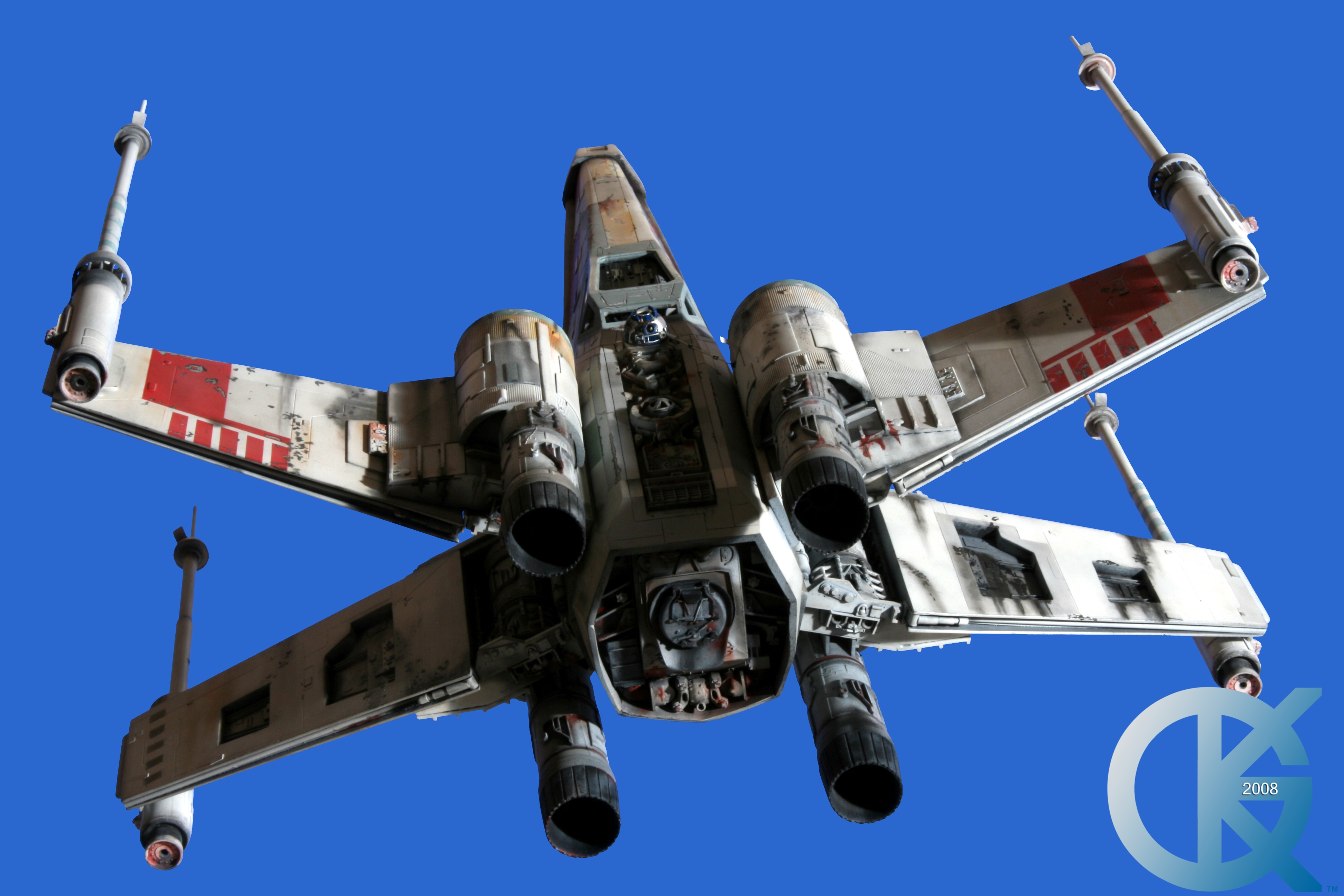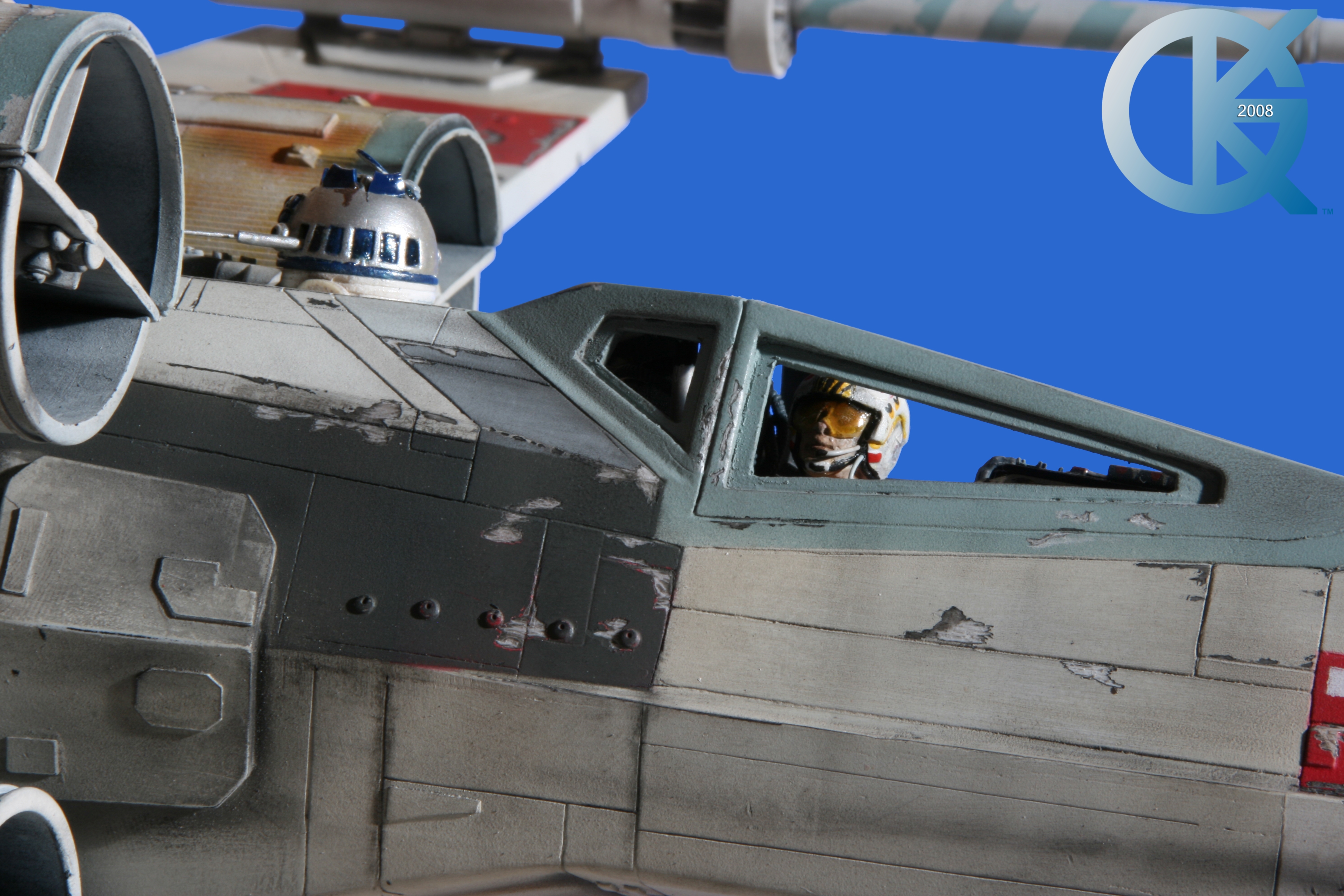 This piece was originally shown here on Modelers Miniatures & Magic back on January 19, 2009 and now updated to today’s showing standard! After purchasing the latest studio scale Hero X-Wing (the V3) from Mike Salzo back in 2008, I brought it to MTM Studio in order to replicate the filming miniature of Luke Skywalker’s RED 5 X-Wing (as seen in the original Star Wars in 1977). In the final piece you see in these photos today, we show Luke looking over his shoulder just after Darth Vader takes out R2-D2 (while R2 is fixing the top starboard engine stabilizer). Of course R2-D2’s panels are all extended with the shock of the hit he just received from Vader. Other than those two changes, this is very close to being a replica of the highest standard. I was thrilled when Mike Salzo purchased the original Captain Cardboard studio scale X-Wing Patterns (which then came to be known as the Salzo V1) well over a decade ago now. Let me see if my memory will serve us here today. Soon after Mike Salzo began selling the V1, he took the Captain Cardboard pattern masters and thickened the hull of the studio scale X-Wing. He added a bit more detail, and that became the V2 release. Soon after that, using the RED 3 photos taken in the Lucasfilm Archives, Mike scratch built an entirely new hero studio scale X-Wing in 2007. What was made of that kit is what you see before you today with these Blue Screen photos taken by me (Kurt Kuhn) in 2008. Since that time, Mike made even more refinements to match the different studio models used in the filming of Star Wars in 1976. He made several versions after this V3. There were versions 3.1 .. all the way up to version 5.1 I believe. Mike did such an amazing job making this X-Wing with the help of some very noted artists of this art form. That stated, it is a shame that these are no longer available to the public, yet understandable that it was time to move forward with other items Mike had going on. I can tell you this X-Wing still adorns the Collection here today, and is valued quite high being one of the 6 replicas of the 1977 original film on display here. Worthy of note is that of all the X-Wings on display here, they were all photographed just as they were filmed back in 1977… without canopy glass. Since the photos were taken, and to be displayed here in the way I wish to show them, they all have their canopy glass installed now. They are all remarkable, and I shall always keep a place in my heart for RED 5. It was a pleasure to photograph it back in 2008, and continues to shine with everyone who views it.