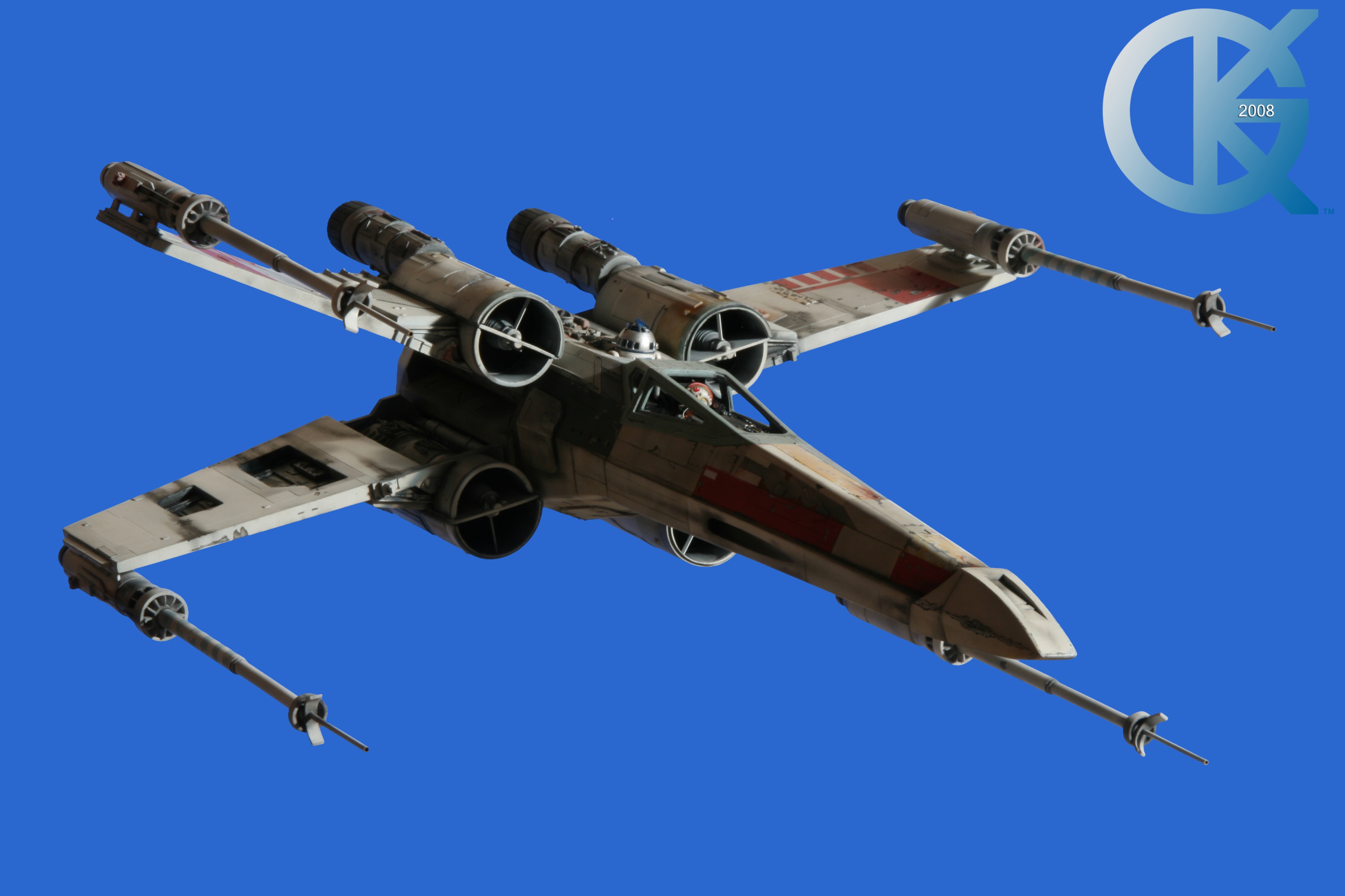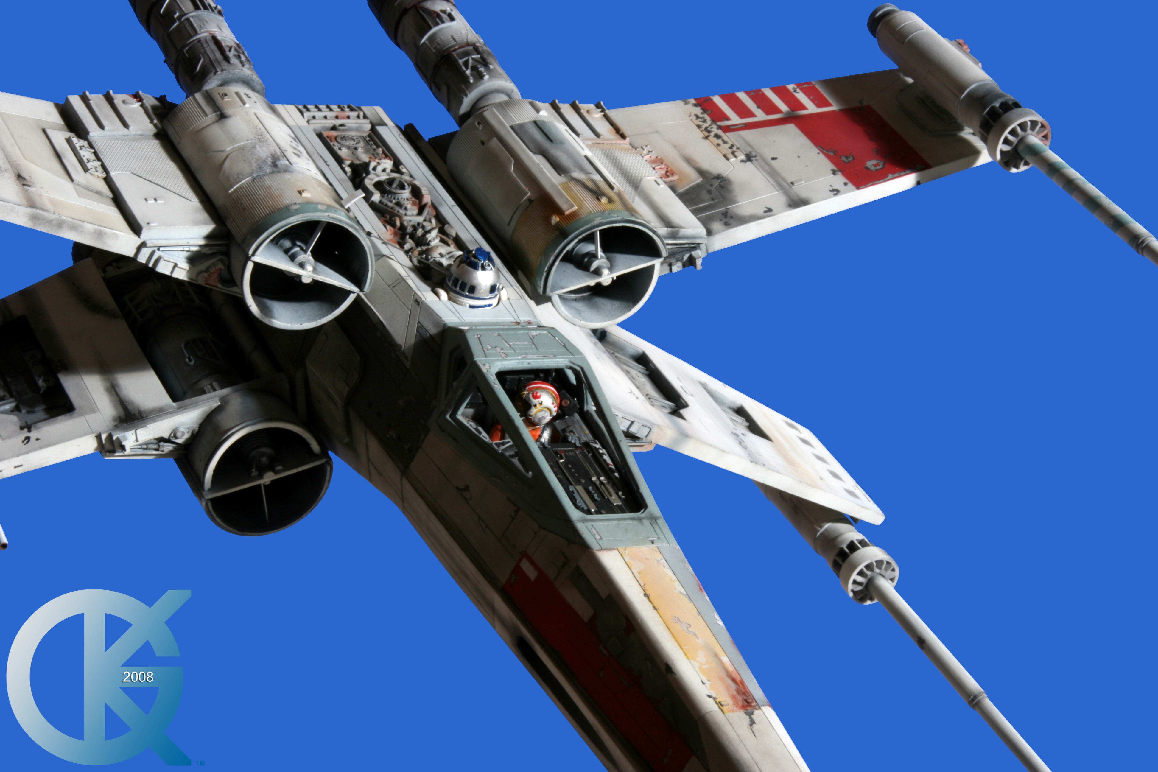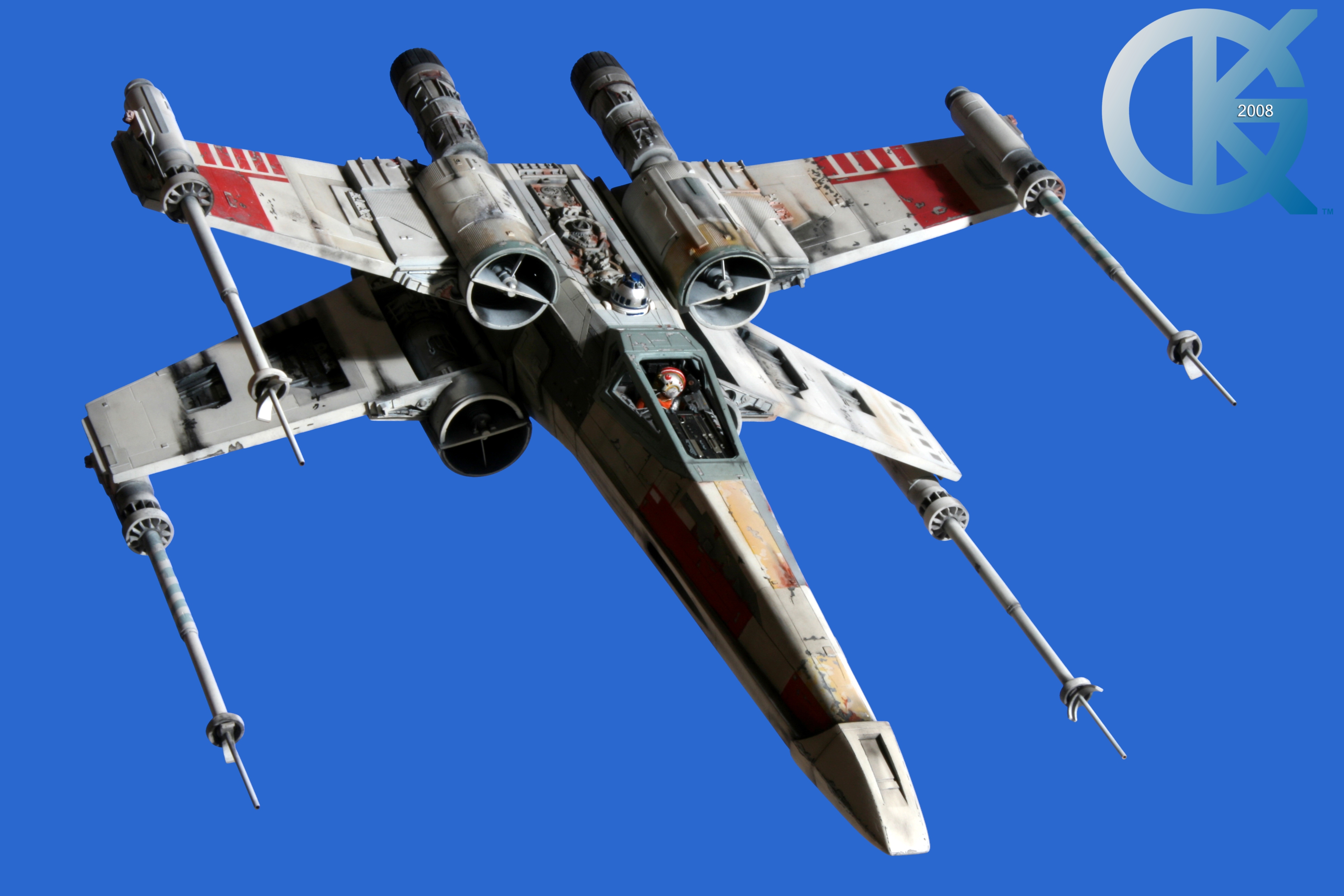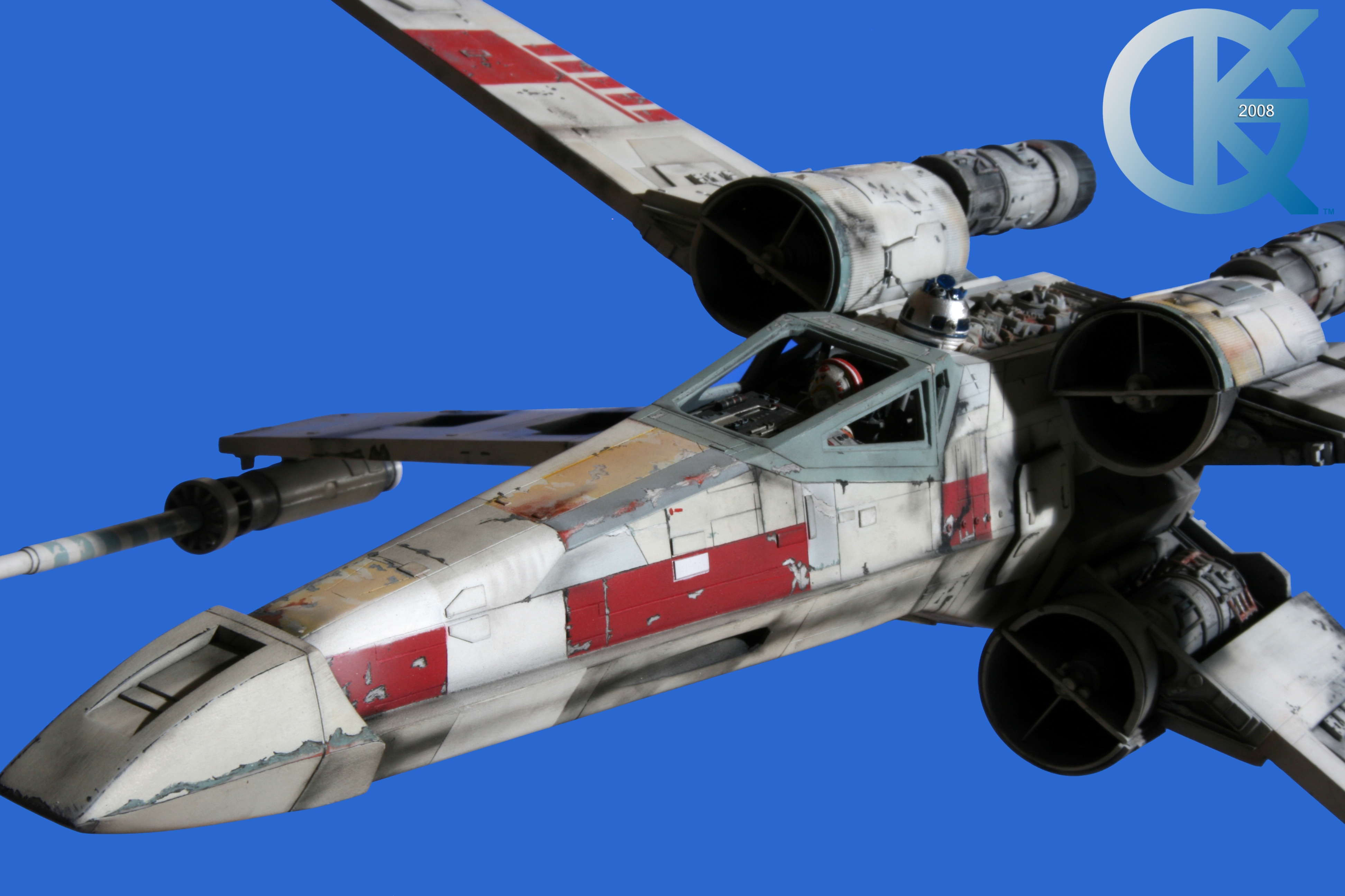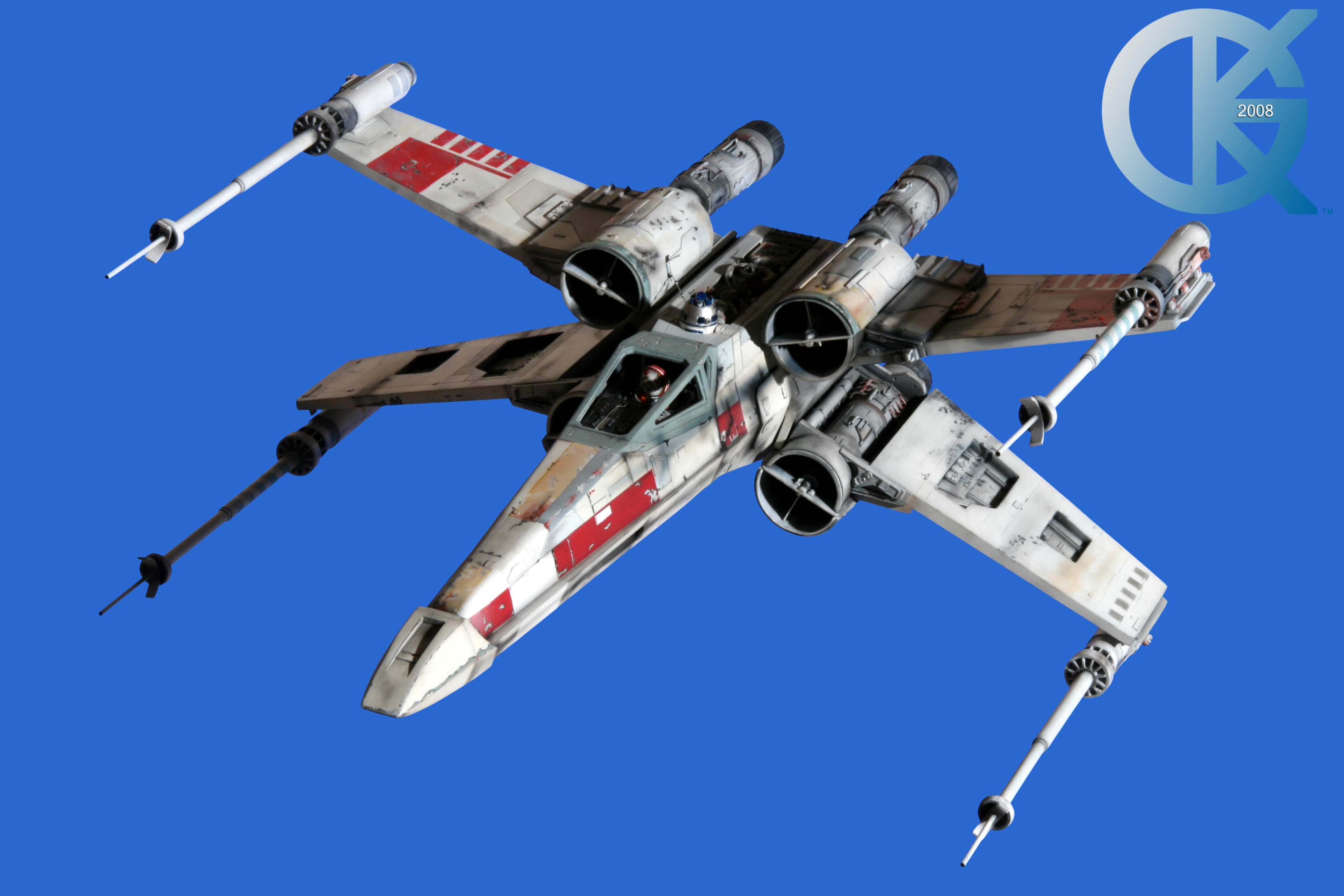 This piece was originally shown here on Modelers Miniatures & Magic back on January 19, 2009 and now updated to today’s showing standard! After purchasing the latest studio scale Hero X-Wing (the V3) from Mike Salzo back in 2008, I brought it to MTM Studio in order to replicate the filming miniature of Luke Skywalker’s RED 5 X-Wing (as seen in the original Star Wars in 1977). In the final piece you see in these photos today, we show Luke looking over his shoulder just after Darth Vader takes out R2-D2 (while R2 is fixing the top starboard engine stabilizer). Of course R2-D2’s panels are all extended with the shock of the hit he just received from Vader. Other than those two changes, this is very close to being a replica of the highest standard. I was thrilled when Mike Salzo purchased the original Captain Cardboard studio scale X-Wing Patterns (which then came to be known as the Salzo V1) well over a decade ago now. Let me see if my memory will serve us here today. Soon after Mike Salzo began selling the V1, he took the Captain Cardboard pattern masters and thickened the hull of the studio scale X-Wing. He added a bit more detail, and that became the V2 release. Soon after that, using the RED 3 photos taken in the Lucasfilm Archives, Mike scratch built an entirely new hero studio scale X-Wing in 2007. What was made of that kit is what you see before you today with these Blue Screen photos taken by me (Kurt Kuhn) in 2008. Since that time, Mike made even more refinements to match the different studio models used in the filming of Star Wars in 1976. He made several versions after this V3. There were versions 3.1 .. all the way up to version 5.1 I believe. Mike did such an amazing job making this X-Wing with the help of some very noted artists of this art form. That stated, it is a shame that these are no longer available to the public, yet understandable that it was time to move forward with other items Mike had going on. I can tell you this X-Wing still adorns the Collection here today, and is valued quite high being one of the 6 replicas of the 1977 original film on display here. Worthy of note is that of all the X-Wings on display here, they were all photographed just as they were filmed back in 1977… without canopy glass. Since the photos were taken, and to be displayed here in the way I wish to show them, they all have their canopy glass installed now. They are all remarkable, and I shall always keep a place in my heart for RED 5. It was a pleasure to photograph it back in 2008, and continues to shine with everyone who views it.
