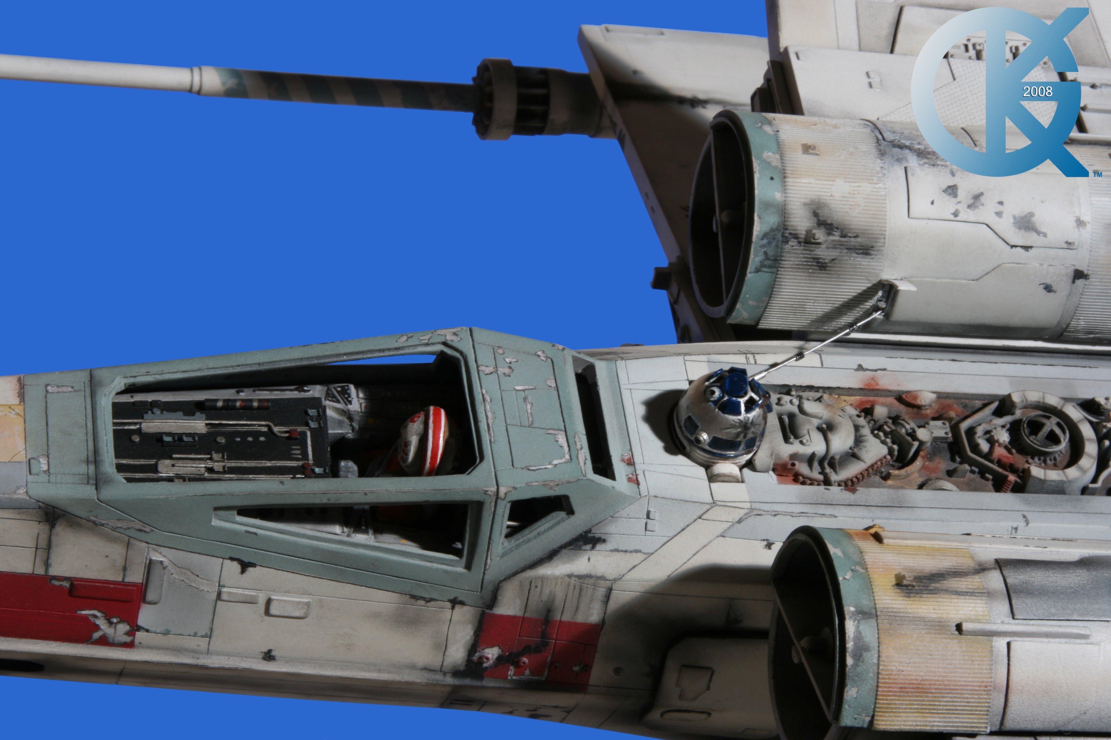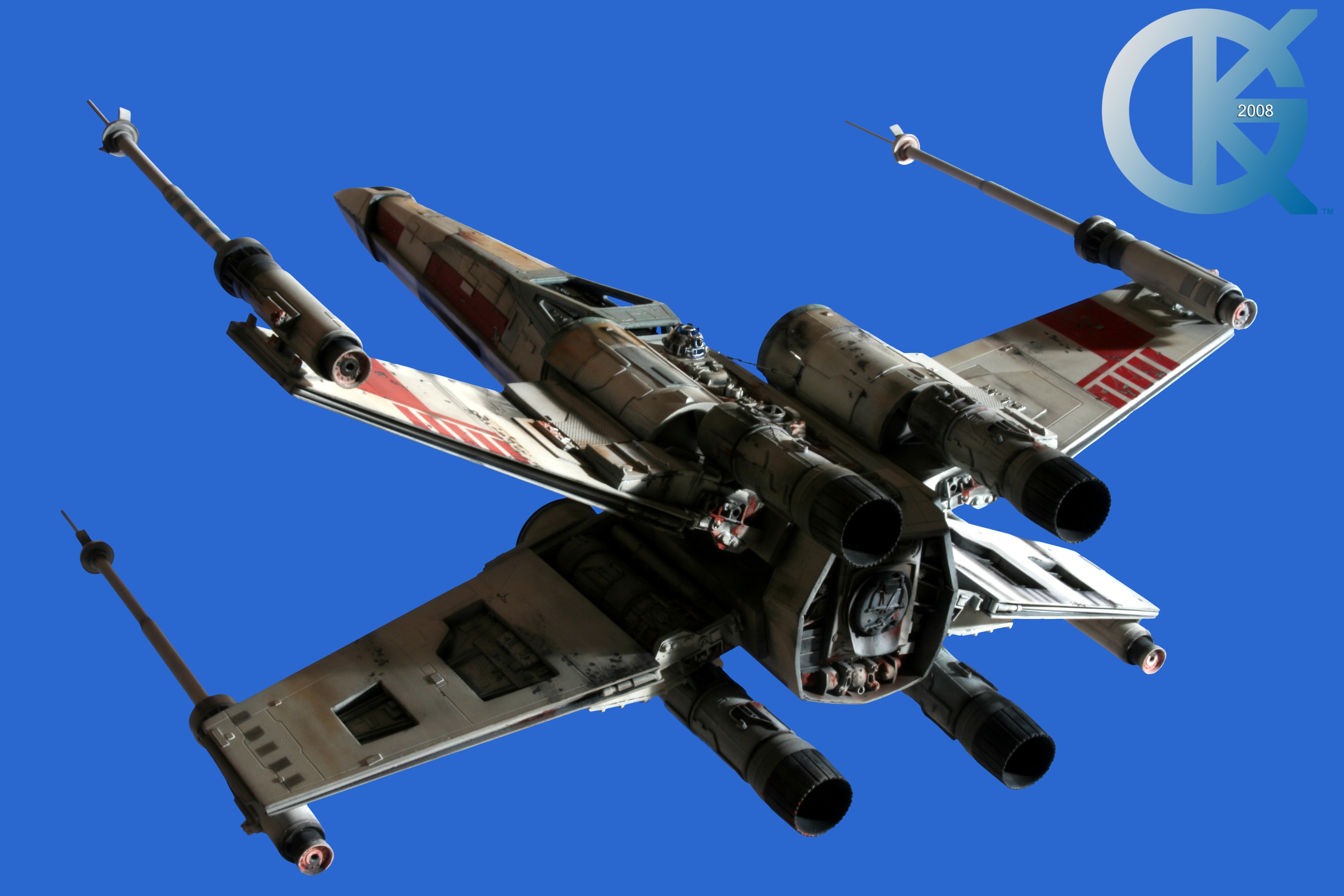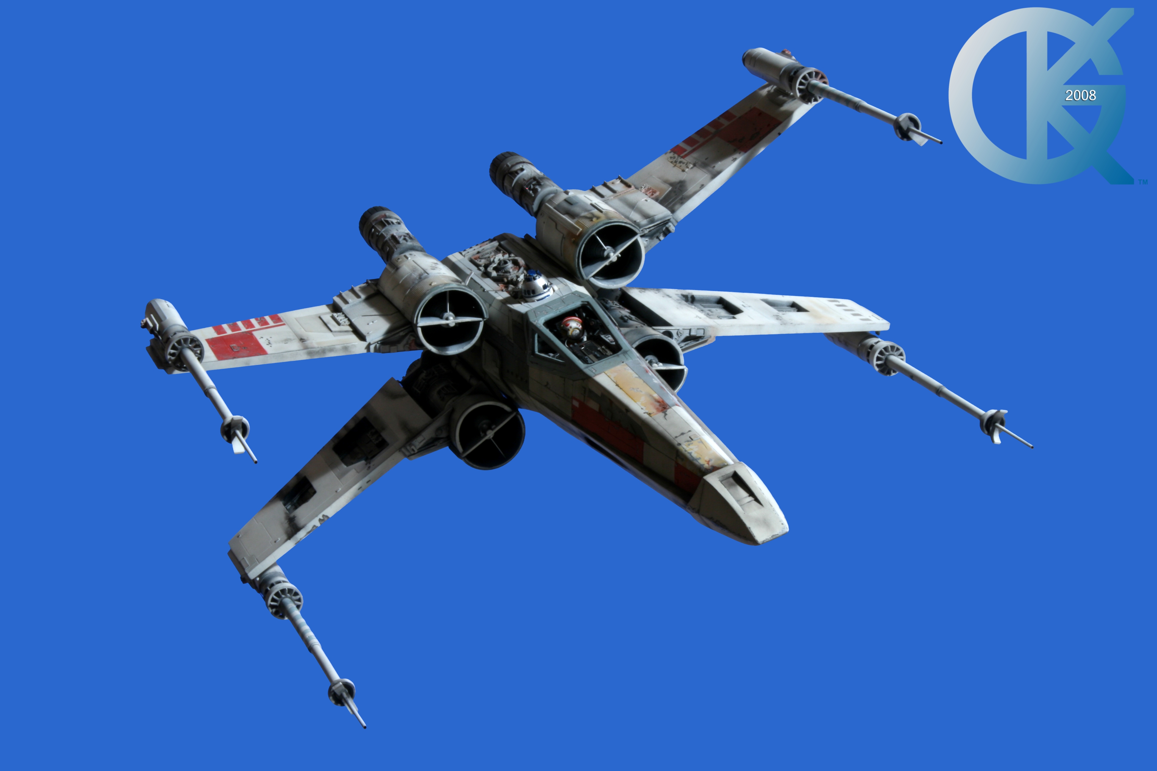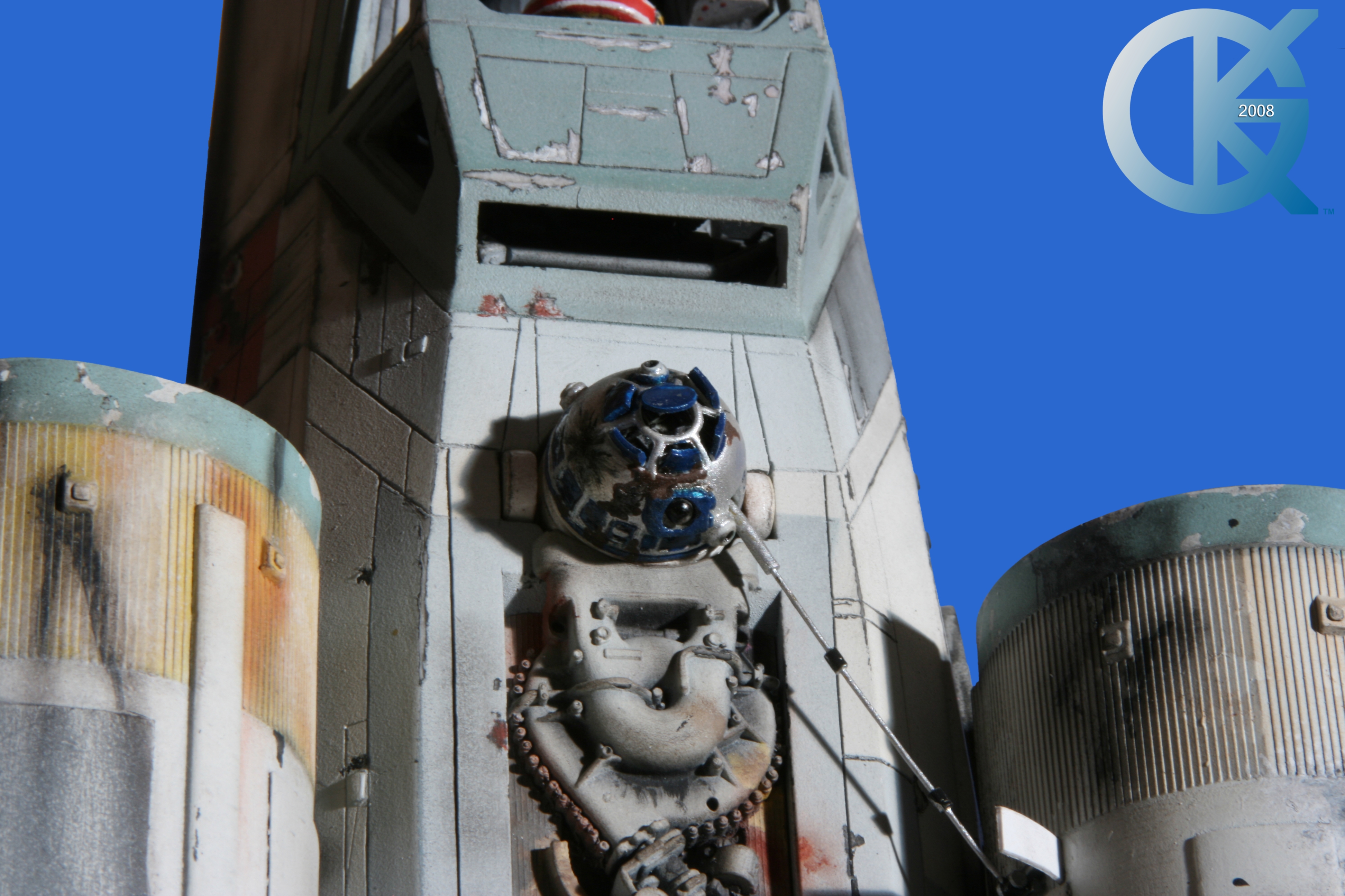 This piece was originally shown here on Modelers Miniatures & Magic back on January 19, 2009 and now updated to today’s showing standard! After purchasing the latest studio scale Hero X-Wing (the V3) from Mike Salzo back in 2008, I brought it to MTM Studio in order to replicate the filming miniature of Luke Skywalker’s RED 5 X-Wing (as seen in the original Star Wars in 1977). In the final piece you see in these photos today, we show Luke looking over his shoulder just after Darth Vader takes out R2-D2 (while R2 is fixing the top starboard engine stabilizer). Of course R2-D2’s panels are all extended with the shock of the hit he just received from Vader. Other than those two changes, this is very close to being a replica of the highest standard. I was thrilled when Mike Salzo purchased the original Captain Cardboard studio scale X-Wing Patterns (which then came to be known as the Salzo V1) well over a decade ago now. Let me see if my memory will serve us here today. Soon after Mike Salzo began selling the V1, he took the Captain Cardboard pattern masters and thickened the hull of the studio scale X-Wing. He added a bit more detail, and that became the V2 release. Soon after that, using the RED 3 photos taken in the Lucasfilm Archives, Mike scratch built an entirely new hero studio scale X-Wing in 2007. What was made of that kit is what you see before you today with these Blue Screen photos taken by me (Kurt Kuhn) in 2008. Since that time, Mike made even more refinements to match the different studio models used in the filming of Star Wars in 1976. He made several versions after this V3. There were versions 3.1 .. all the way up to version 5.1 I believe. Mike did such an amazing job making this X-Wing with the help of some very noted artists of this art form. That stated, it is a shame that these are no longer available to the public, yet understandable that it was time to move forward with other items Mike had going on. I can tell you this X-Wing still adorns the Collection here today, and is valued quite high being one of the 6 replicas of the 1977 original film on display here. Worthy of note is that of all the X-Wings on display here, they were all photographed just as they were filmed back in 1977… without canopy glass. Since the photos were taken, and to be displayed here in the way I wish to show them, they all have their canopy glass installed now. They are all remarkable, and I shall always keep a place in my heart for RED 5. It was a pleasure to photograph it back in 2008, and continues to shine with everyone who views it.