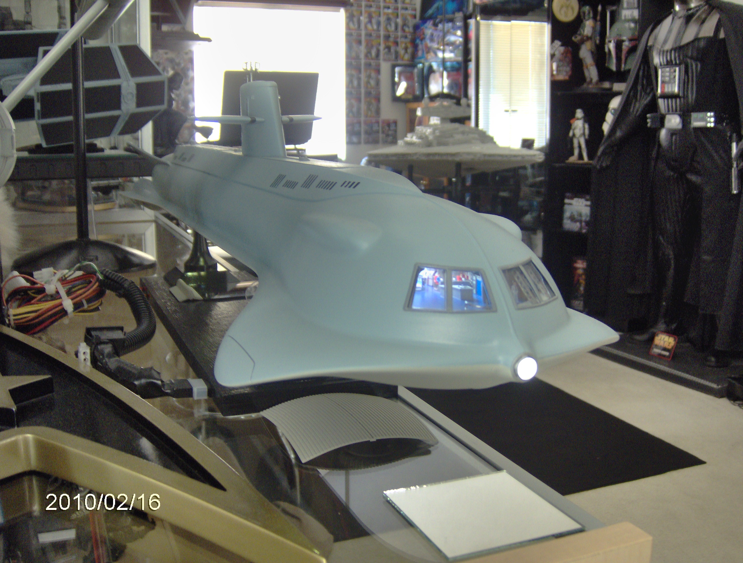 This is the large Moebius model that I modified of which not many other modelers have opened up the Mini-Sub Bay like this. The model comes with those doors molded in so I cut them away and made the doors capable of reattaching with small earth magnets hidden on both ends of the doors and within the hull. I then scratched the bay interior with lighting, also customized the forward Flying Sub Bay by adding against the back wall a control room with windows viewing into the bay area with a crewman looking out into the bay. You can see him somewhat in the photos below, but my camera isn’t that great on Depth and Macro-Focus. However… it looks great in person! I got the idea for the control room from the TOS Starship Enterprise! I designed the entire top of the model to come off to allow easy access to the lighting and electronics. Fiber optics run thru both rear sails for the rear lights. I even back lit the television in the main observation deck with a man on its screen, for a freakin’ killer look! I hope you enjoy the photos of my build.