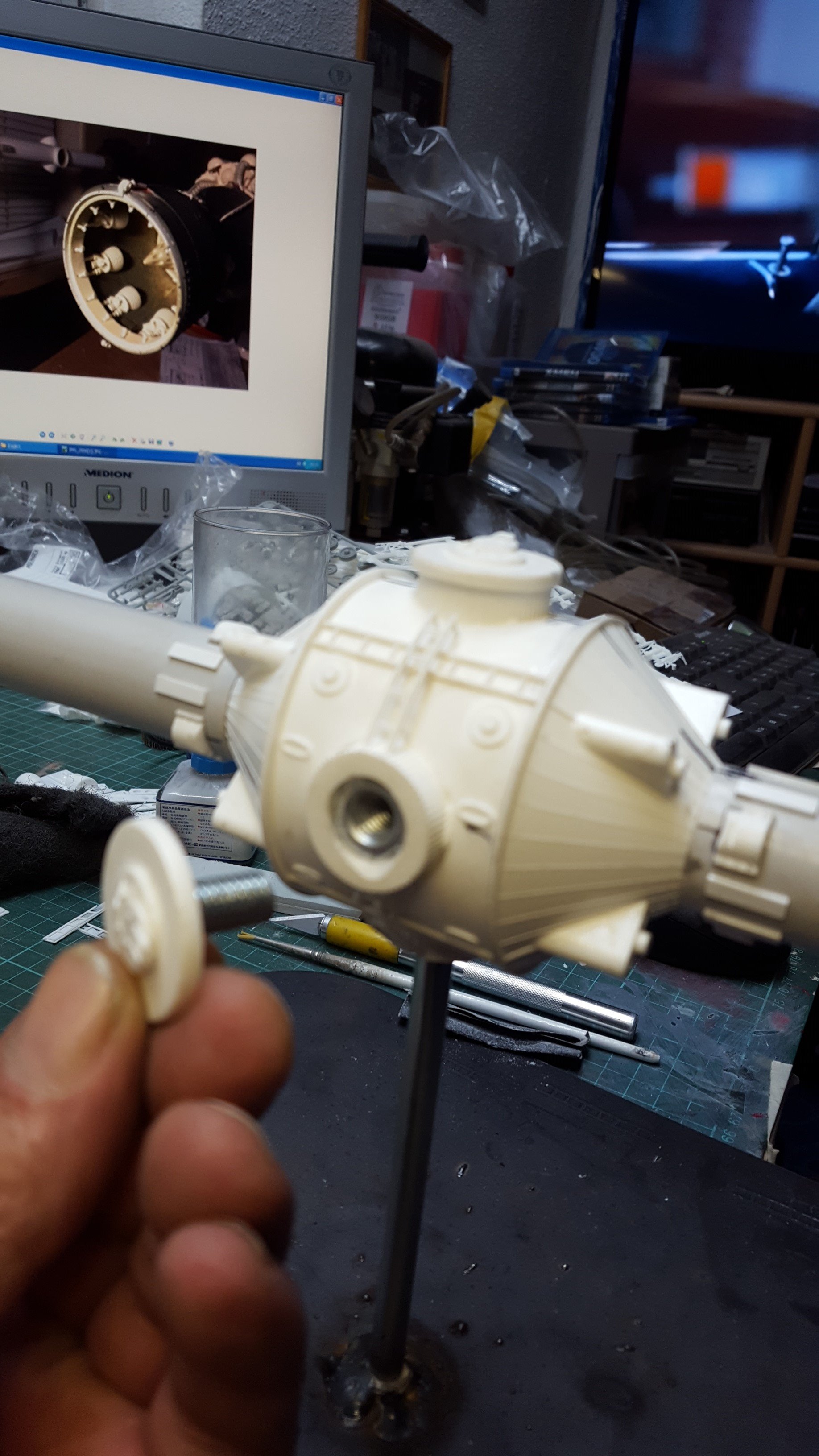 Only few spaceships from the series “Battlestar Galactica” are so well known as the “Colonial Movers” spaceship. Since my childhood the TV-series and especially their spaceships are fascinating me. For the TV- series real models were built out of thousands of pieces of model kits from tanks, ships, planes etc. Maybe due to this familiar parts the spaceships from “Battlestar Galactica” seemed to be more real than the spaceships from other movies or series of that time.