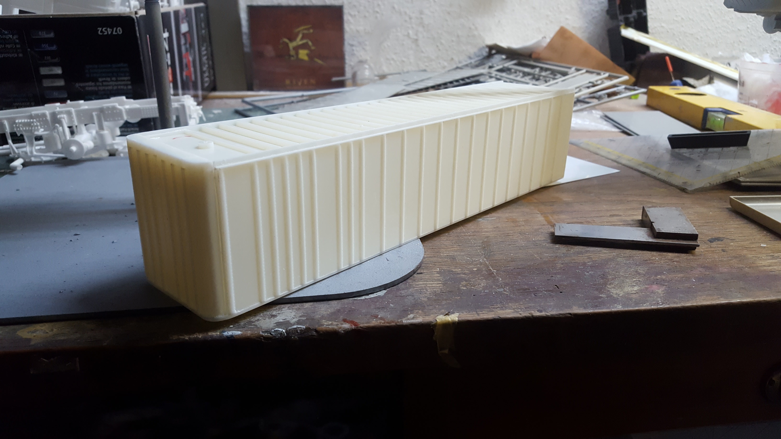 One of the key issue was the building of the significant six containers. For the movie model two different truck models were used in the scale of 1:43 (Matchbox/ AMT) from the beginning of the 1970’s). Those antique building sets are very rare now and very expensive but I found some in Greece. I copied the parts out of Resin with own made molds and placed the containers with own built suspensions along the longitudinal axis. I also built several add-on parts like ladders, pipes etc. on my own. The artificial aging of the model was done by using oil-colors like the original movie models were aged at that time.