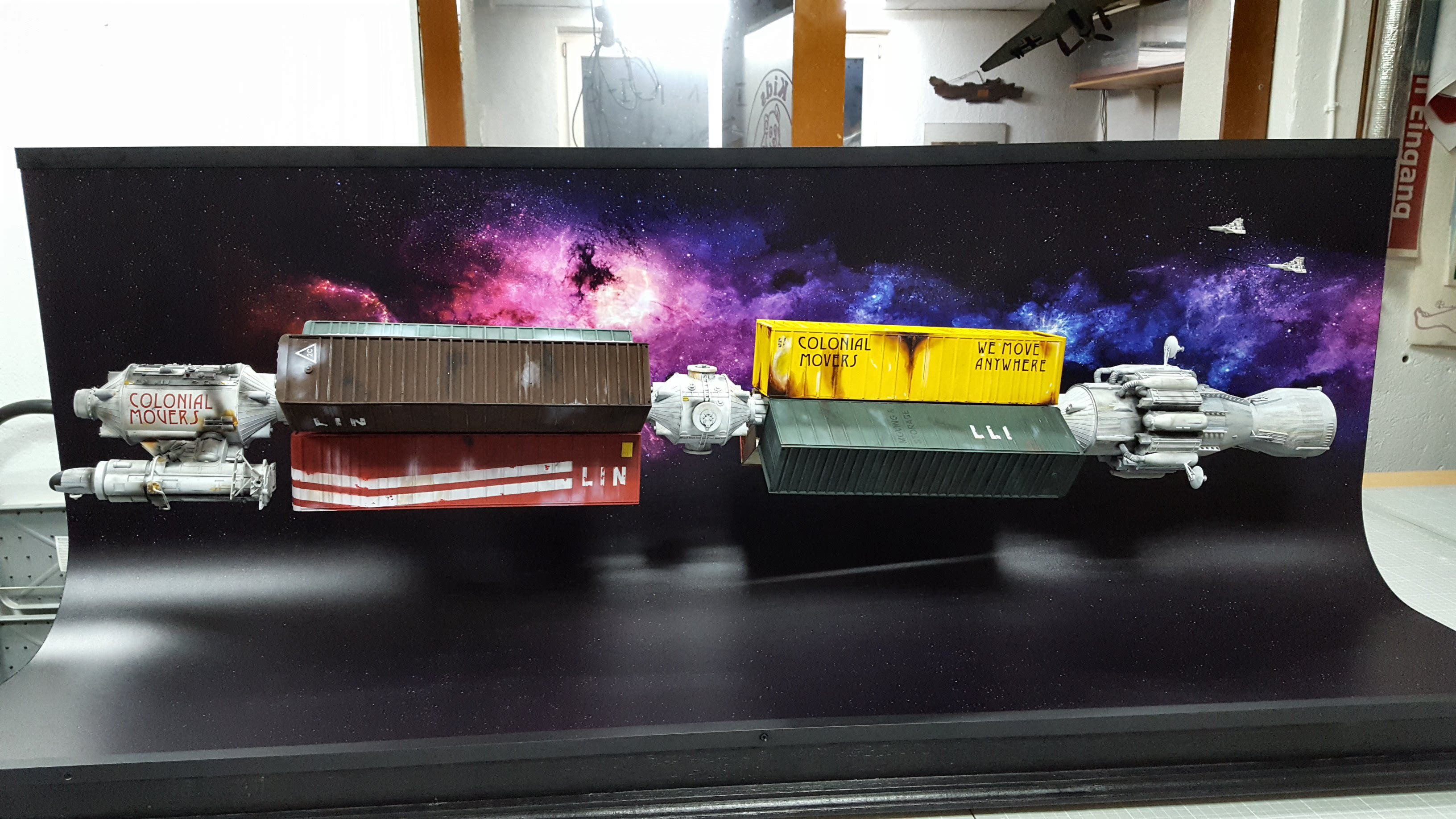 But there was something missing to show the proportions of “Colonial Movers”. So I bought two Mk.1 Vipers in the scale of 1:270 which fits more or less to show the size ratio between the spaceship and the Vipers. I fixed both in the background and now the dimensions of the transporter are revealed.