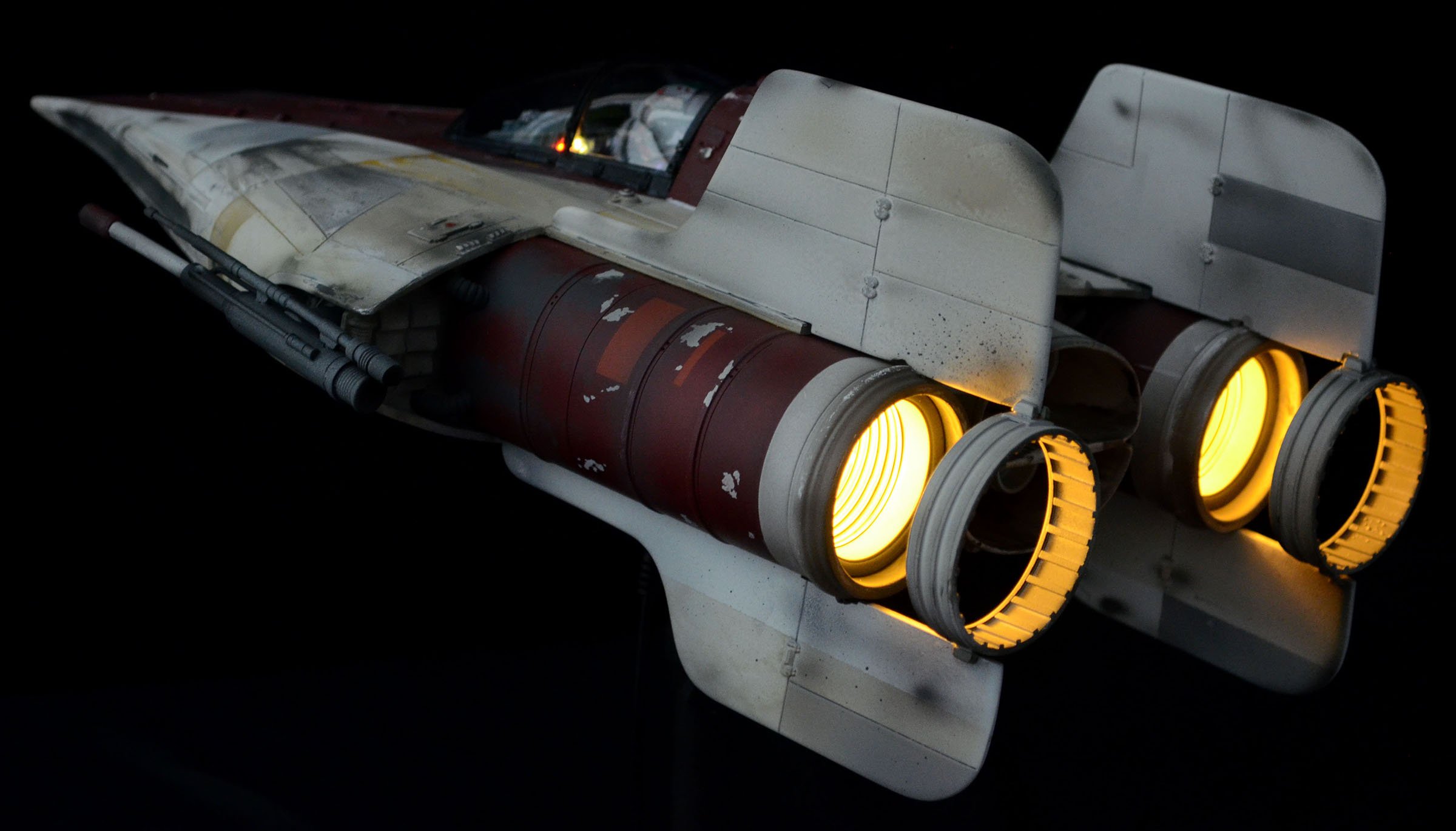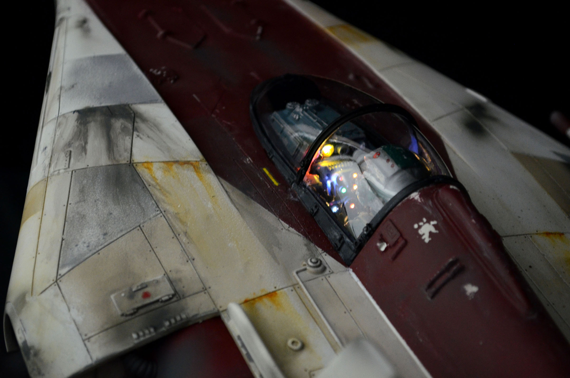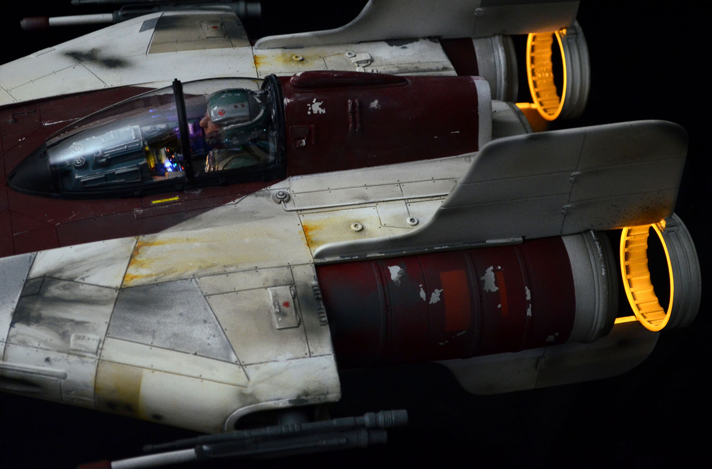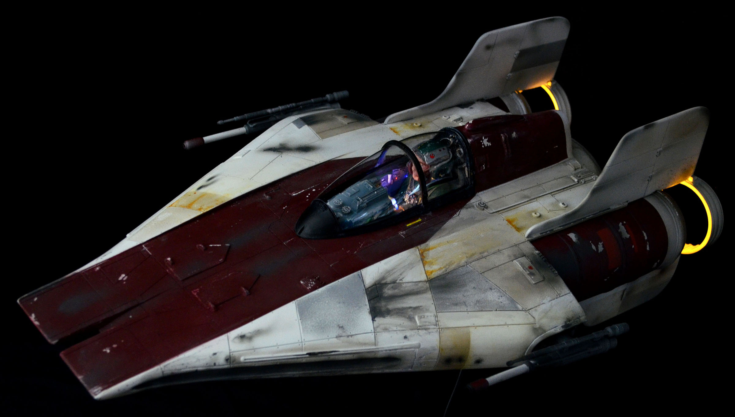This is a Lasse Henning A-Wing resin kit that I recently completed. I’m not 100% sure if this is studio-scale, but the model measures 19” long, 13” wide, and about 8” high. All of the paint I used was Archive-X acrylics. All lighting is custom.